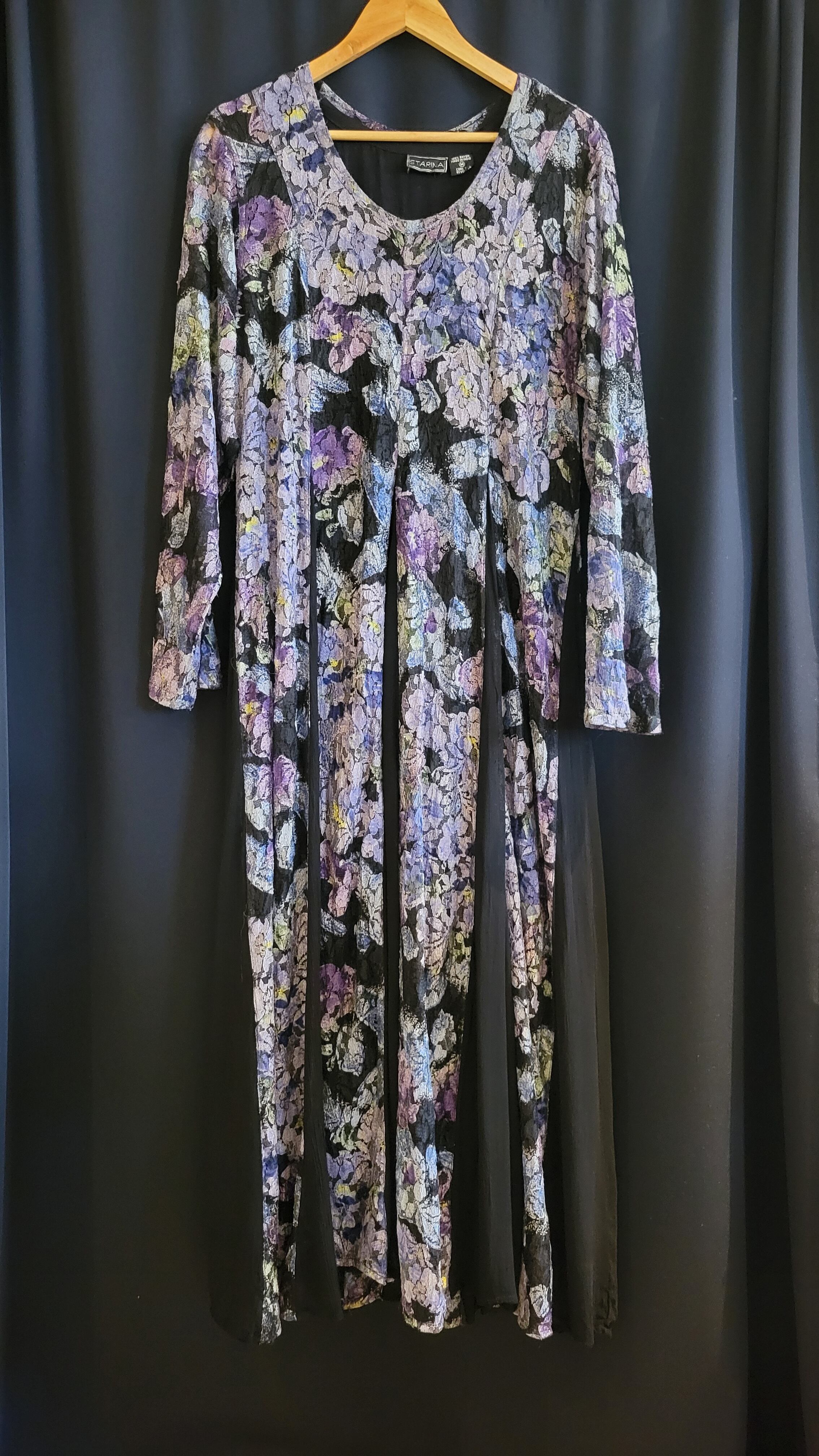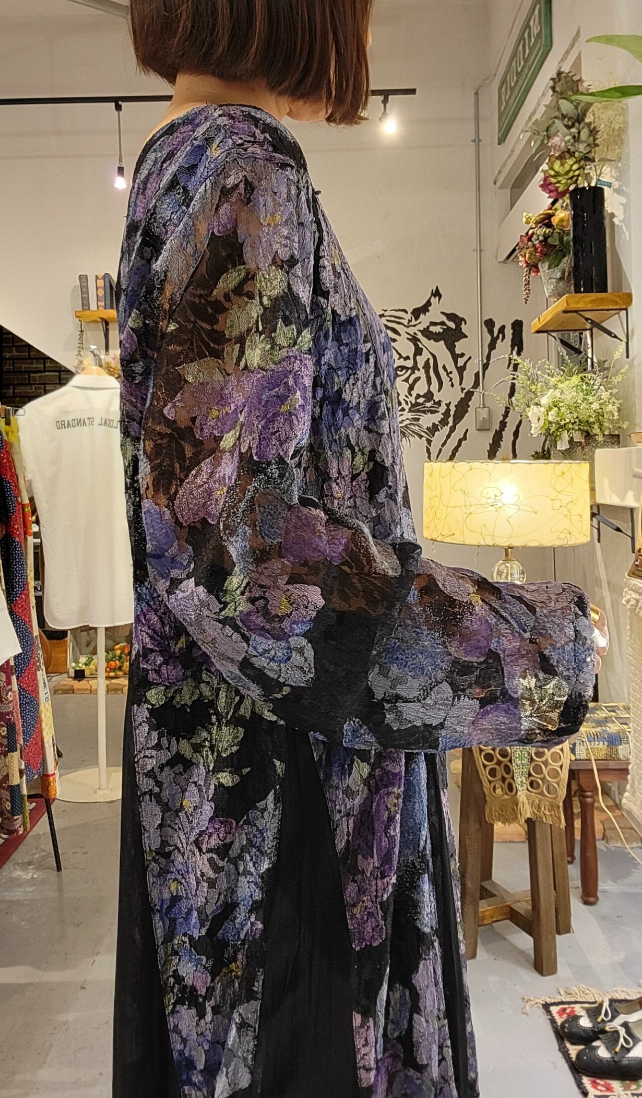総レースのヴィンテージマキシドレス。素材はレーヨン100%です。美しい紫のグラデーションとシアーなブラックの生地の組み合わせが大人っぽい雰囲気。袖以外には裏地が付いているため1枚でも着られます。締め付け感のないゆったりしたシルエットながらも品良く優雅に着られるワンピースです。
