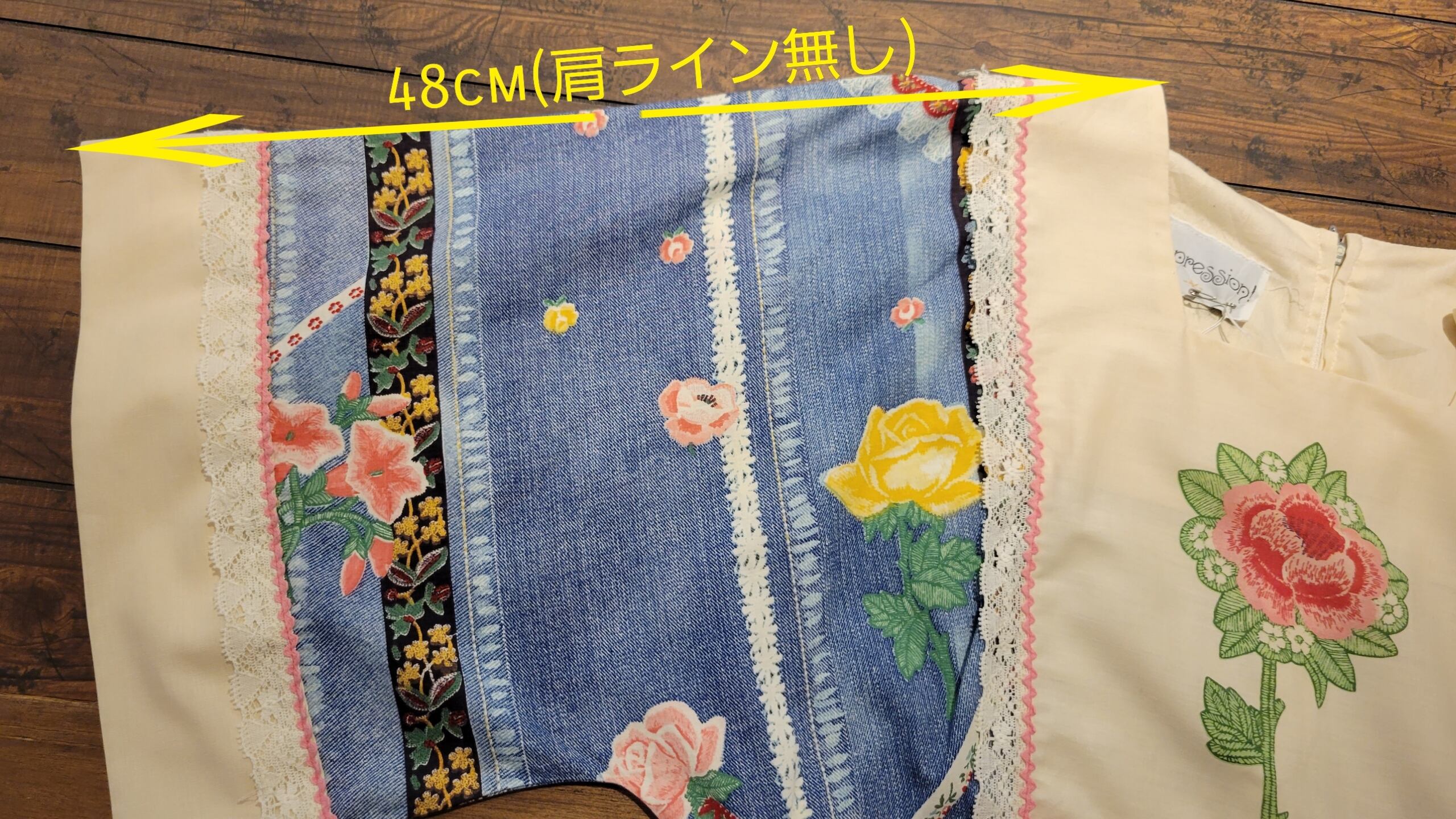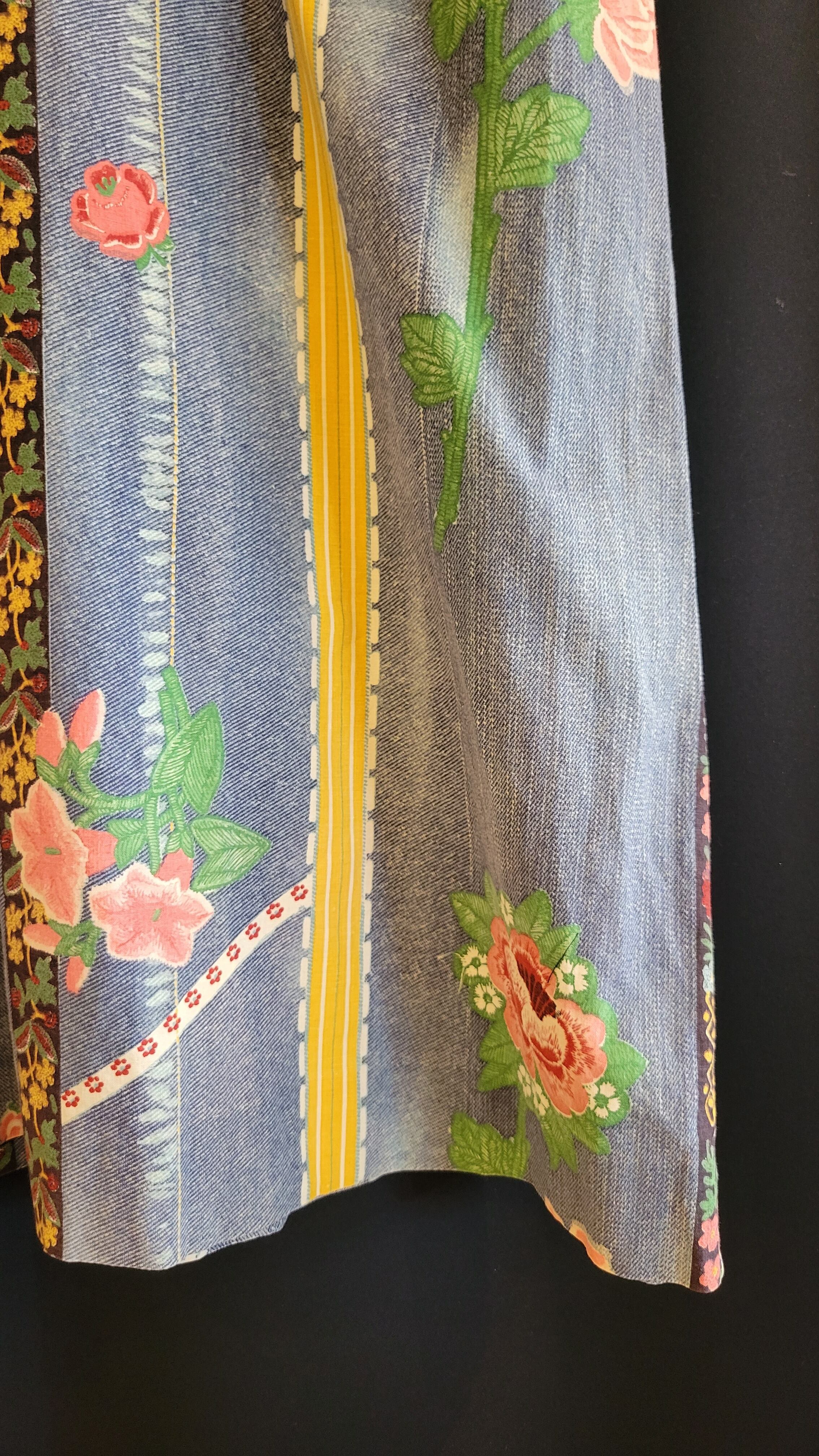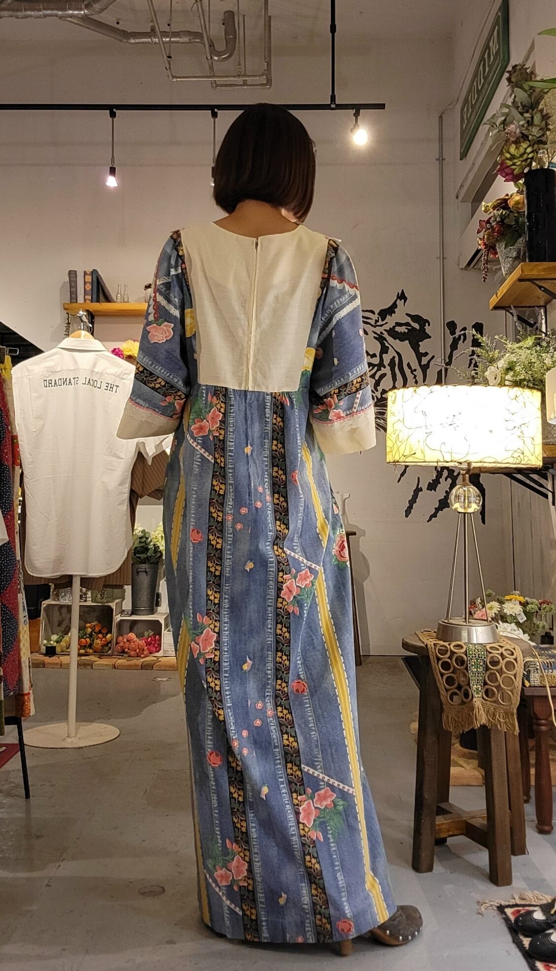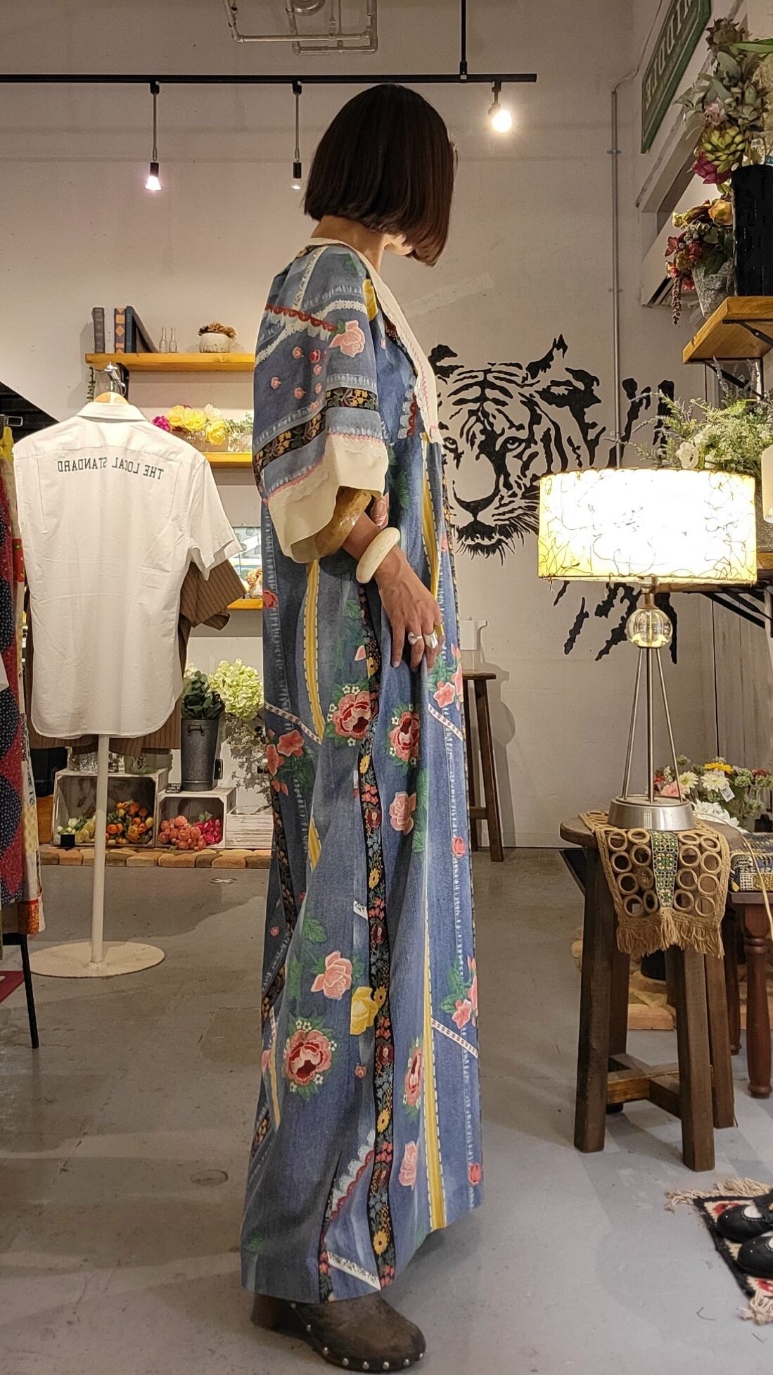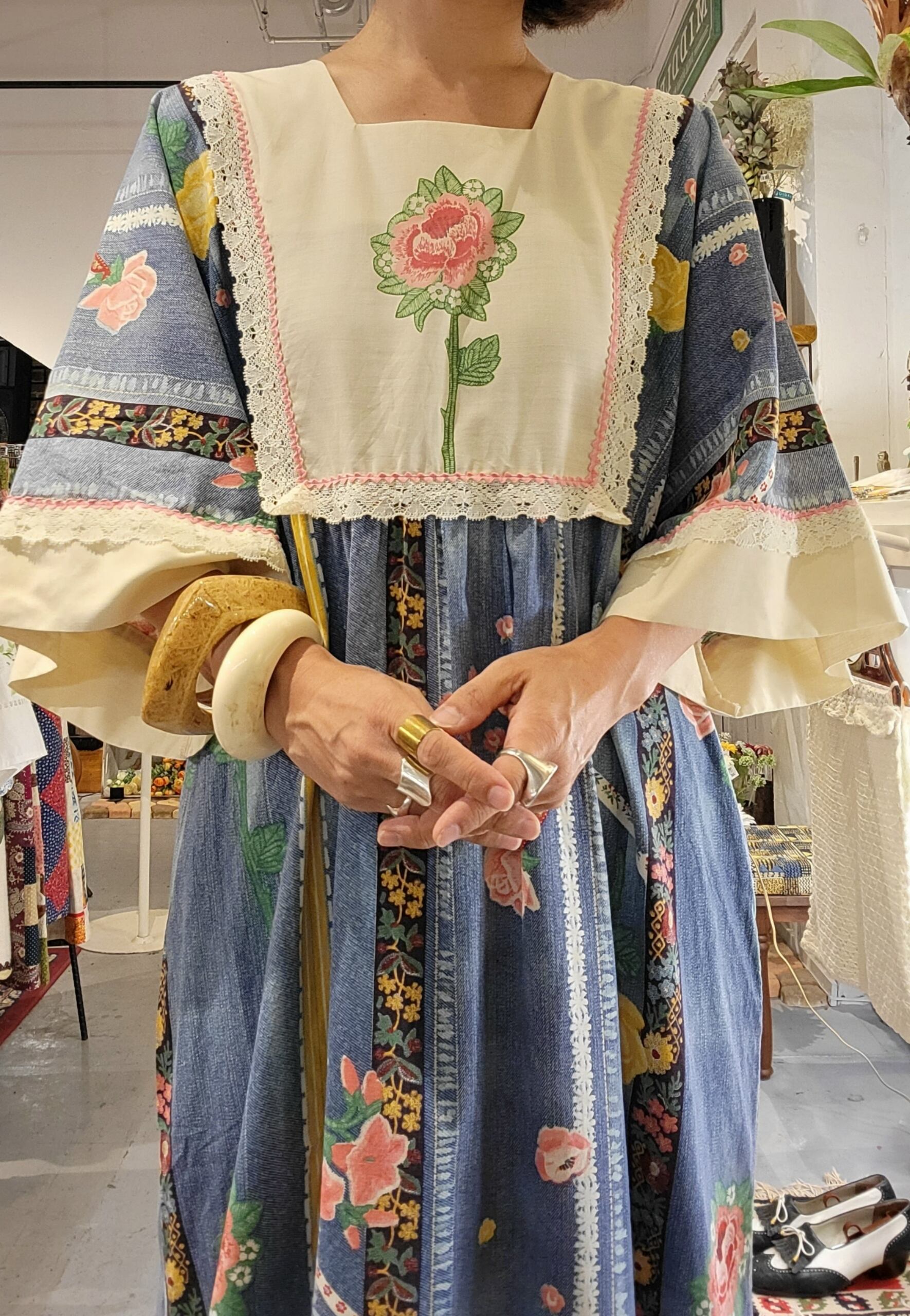 70sムードたっぷりのヴィンテージマキシドレス。素材表記はありませんが薄手のコットンのようです。透け感・伸縮性は無くさらりとした肌触りです。生地はデニムではなくデニムプリント、胸元のお花も刺繍ではなくプリントです。体のラインを拾わないゆったりとしたデザインとサイズ感のため秋冬シーズンにはインナーにニットを着用しても素敵です。