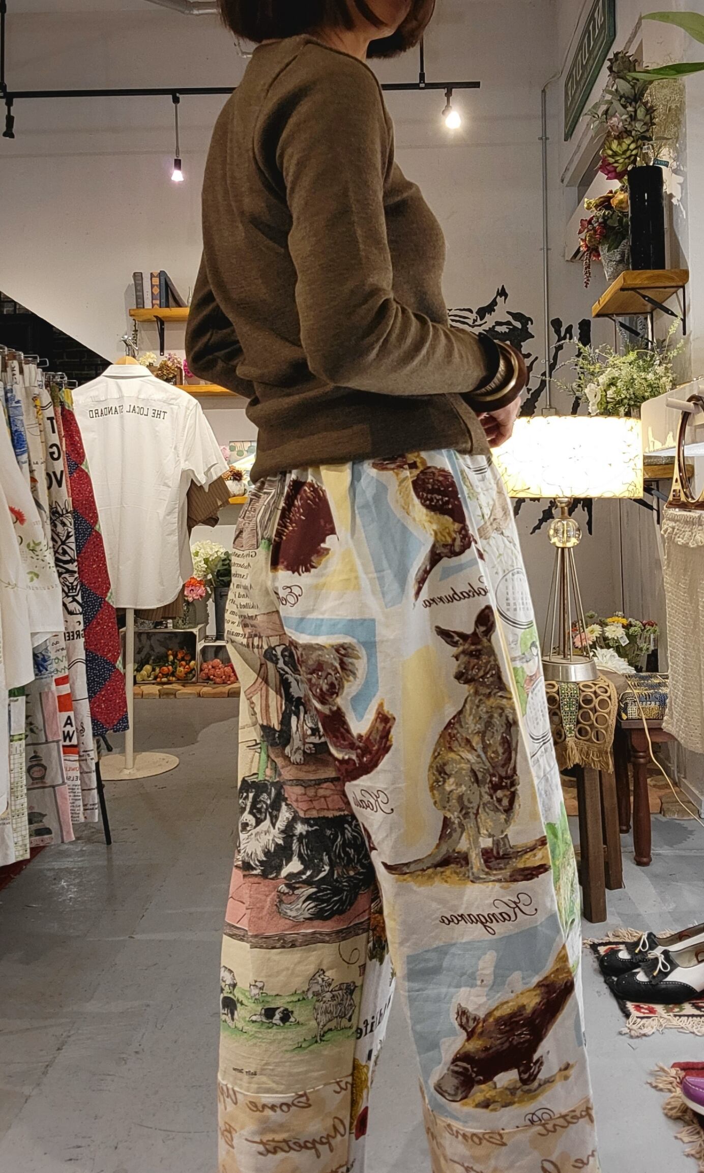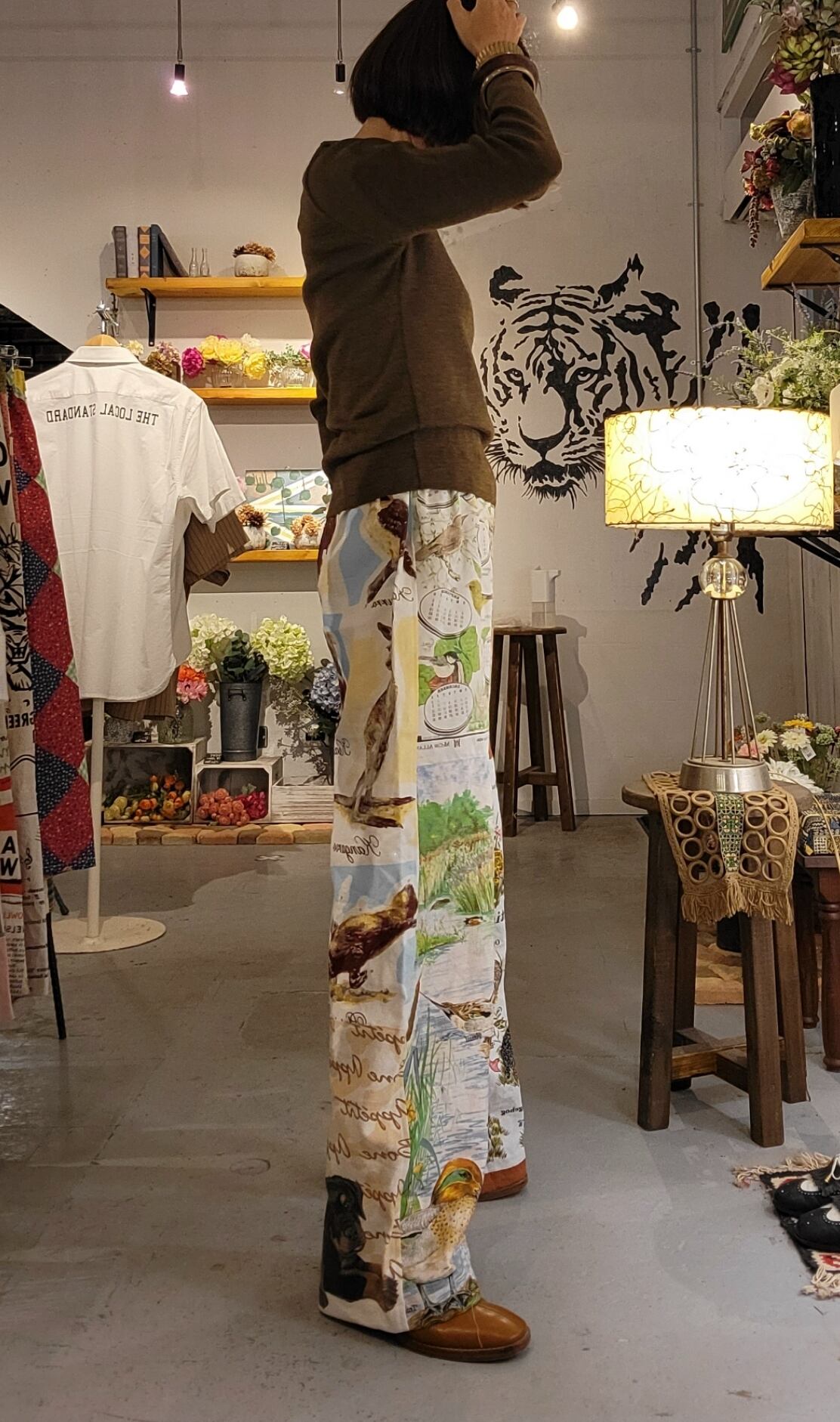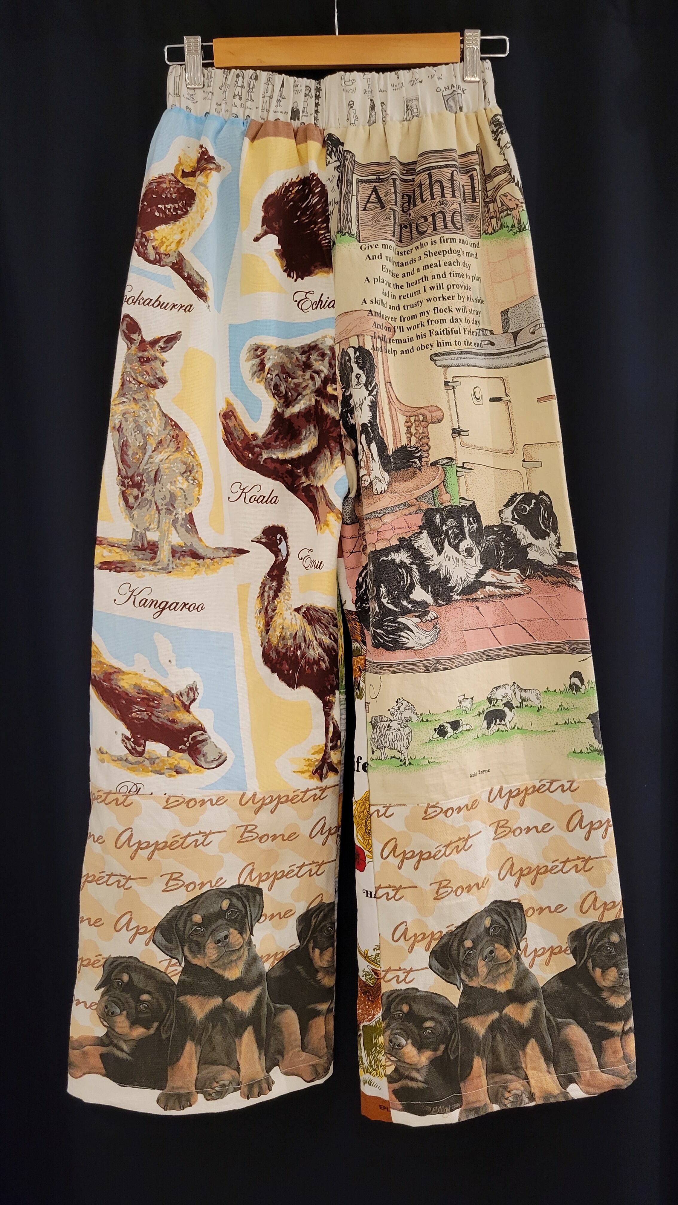 ヴィンテージクロスをリメイクしたイージーパンツ。ウエストゴム、ハイライズ・ワイドシルエット。前後で表情が異なり、全て一点ものになります。ヴィンテージクロスの洗いざらしの風合いをお楽しみいただけます。