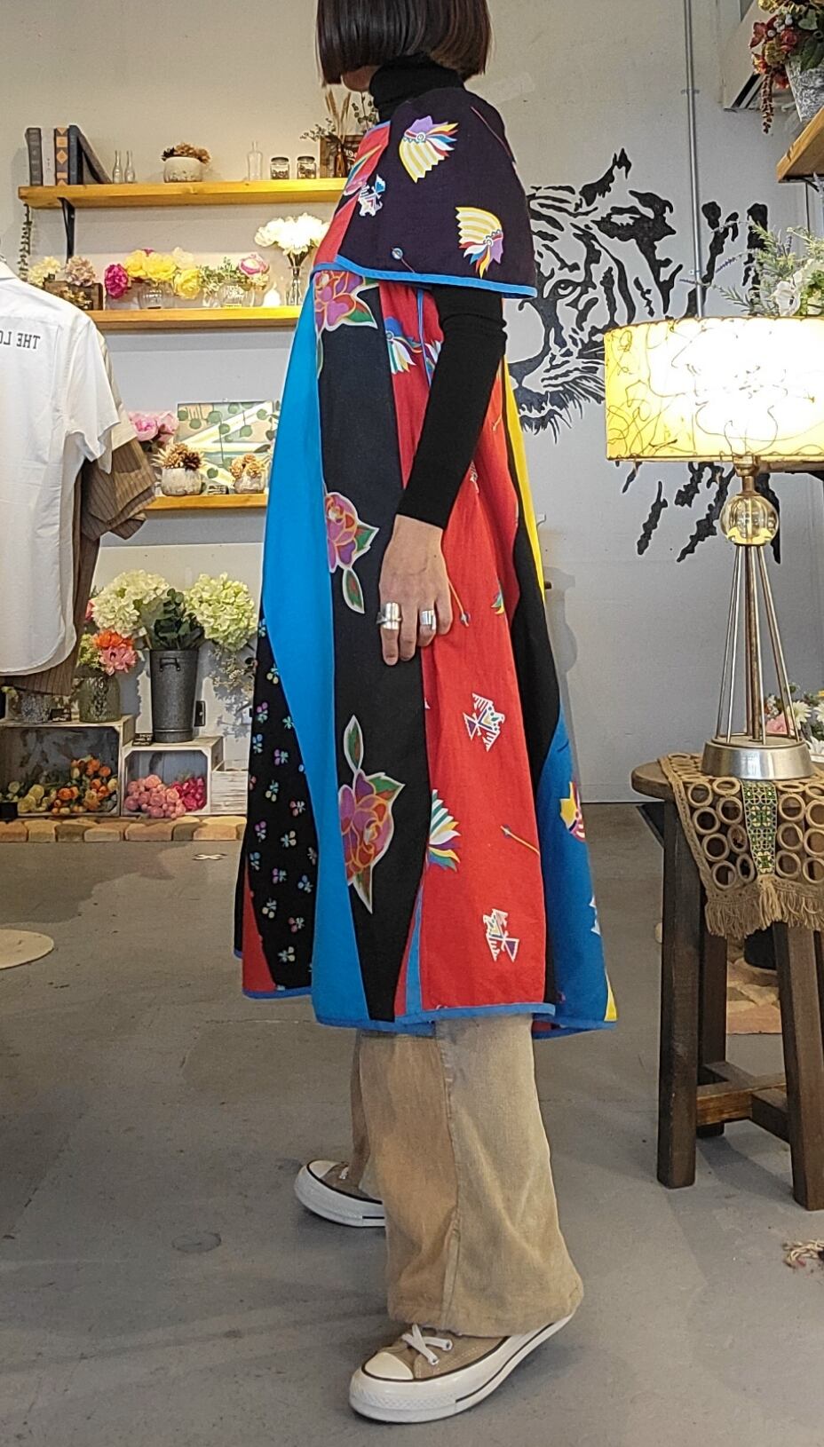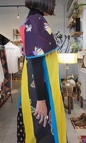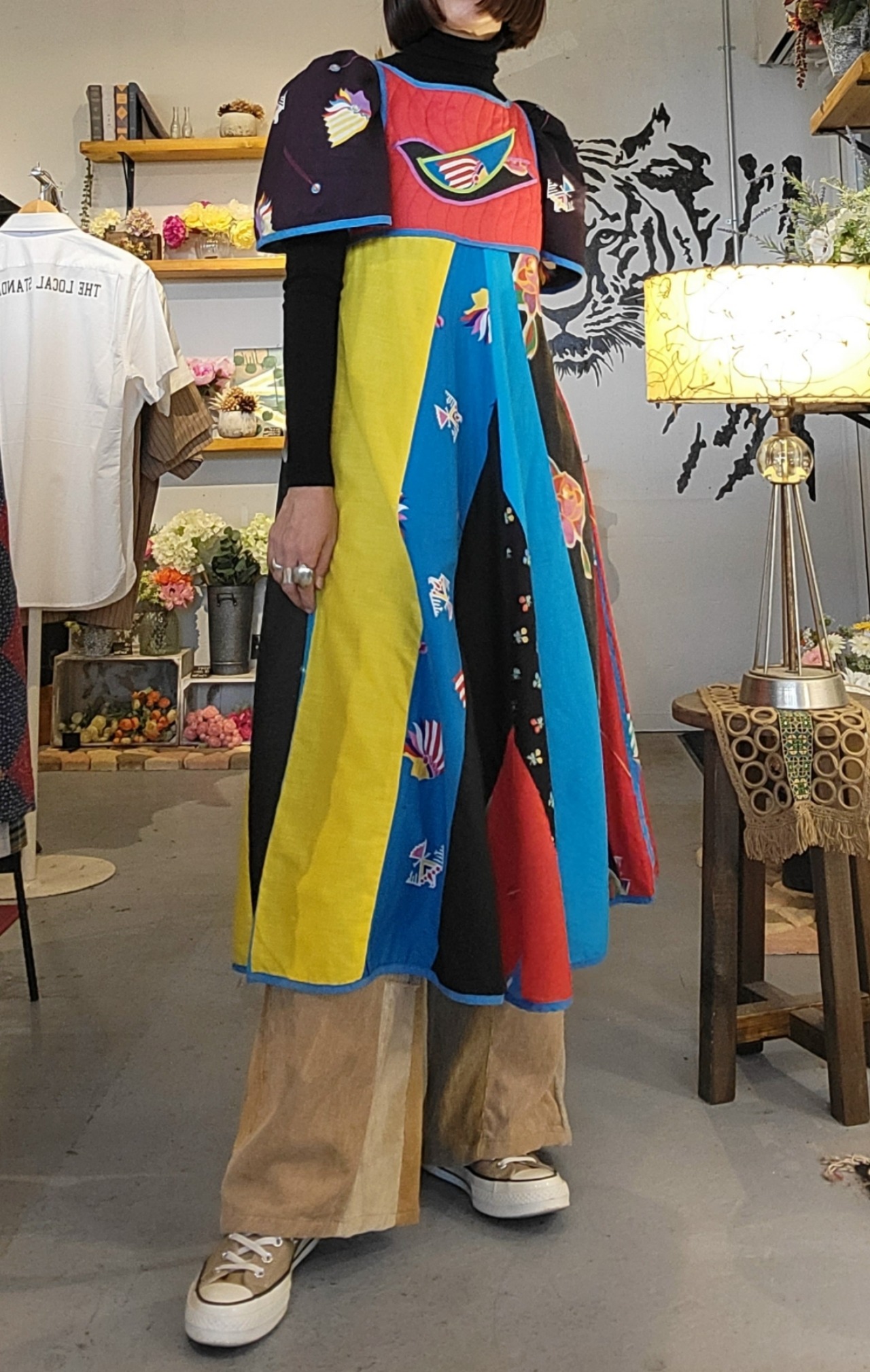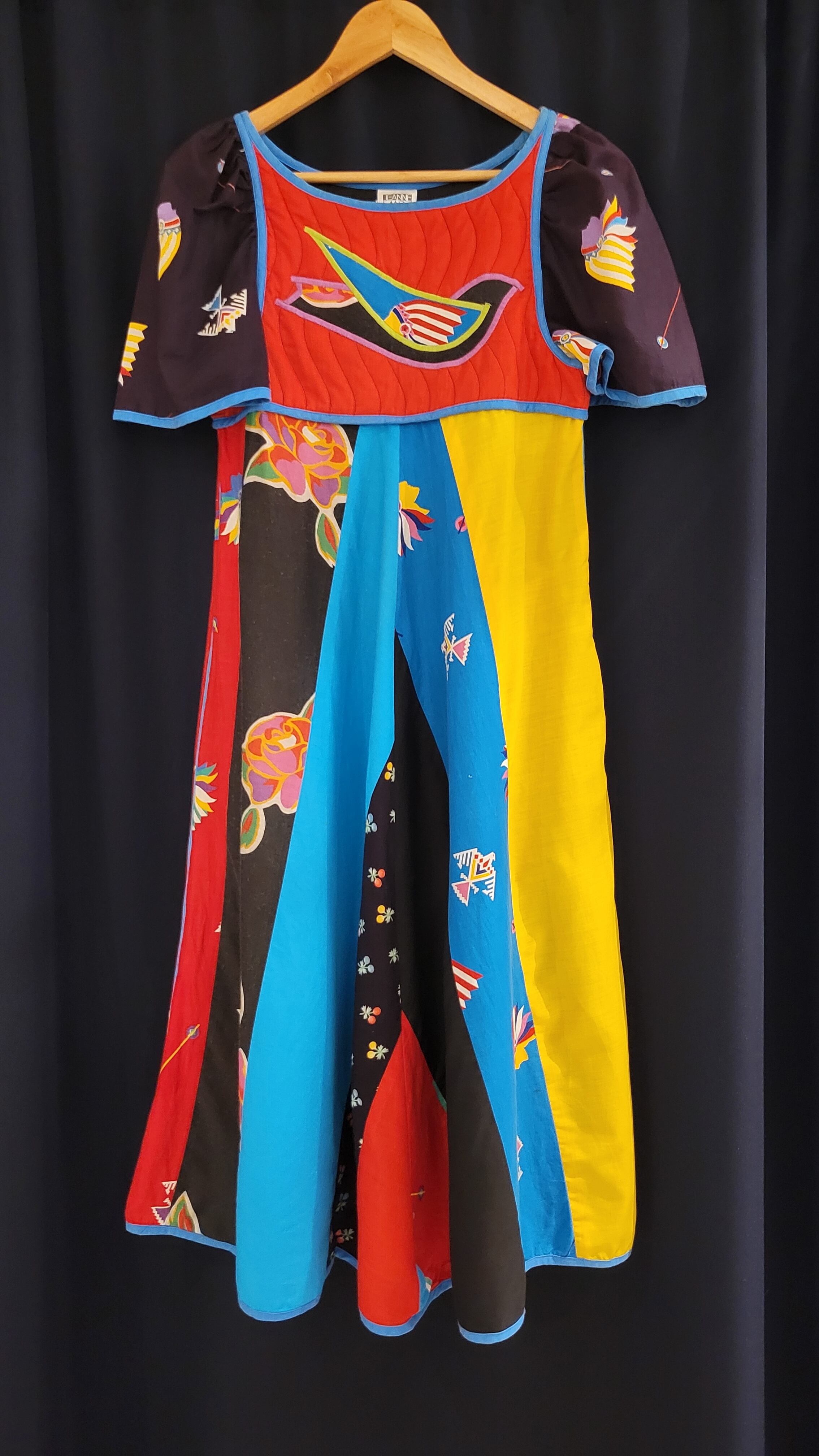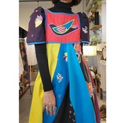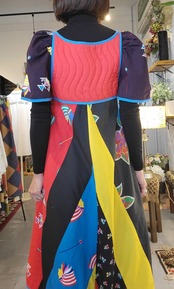 鮮やかな配色が目を引く70sペザントドレスタイプのミディ丈ヴィンテージワンピース。素材表記はありませんがコットンのようです。胸元はキルティング、スカート部分は異なる布を縫い合わせたパッチワークです。