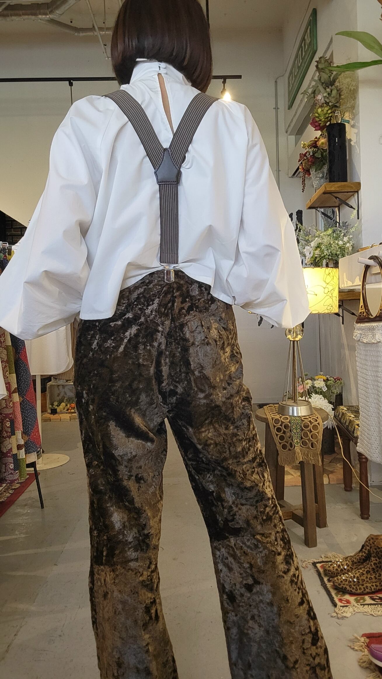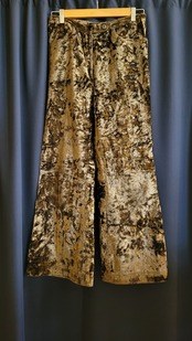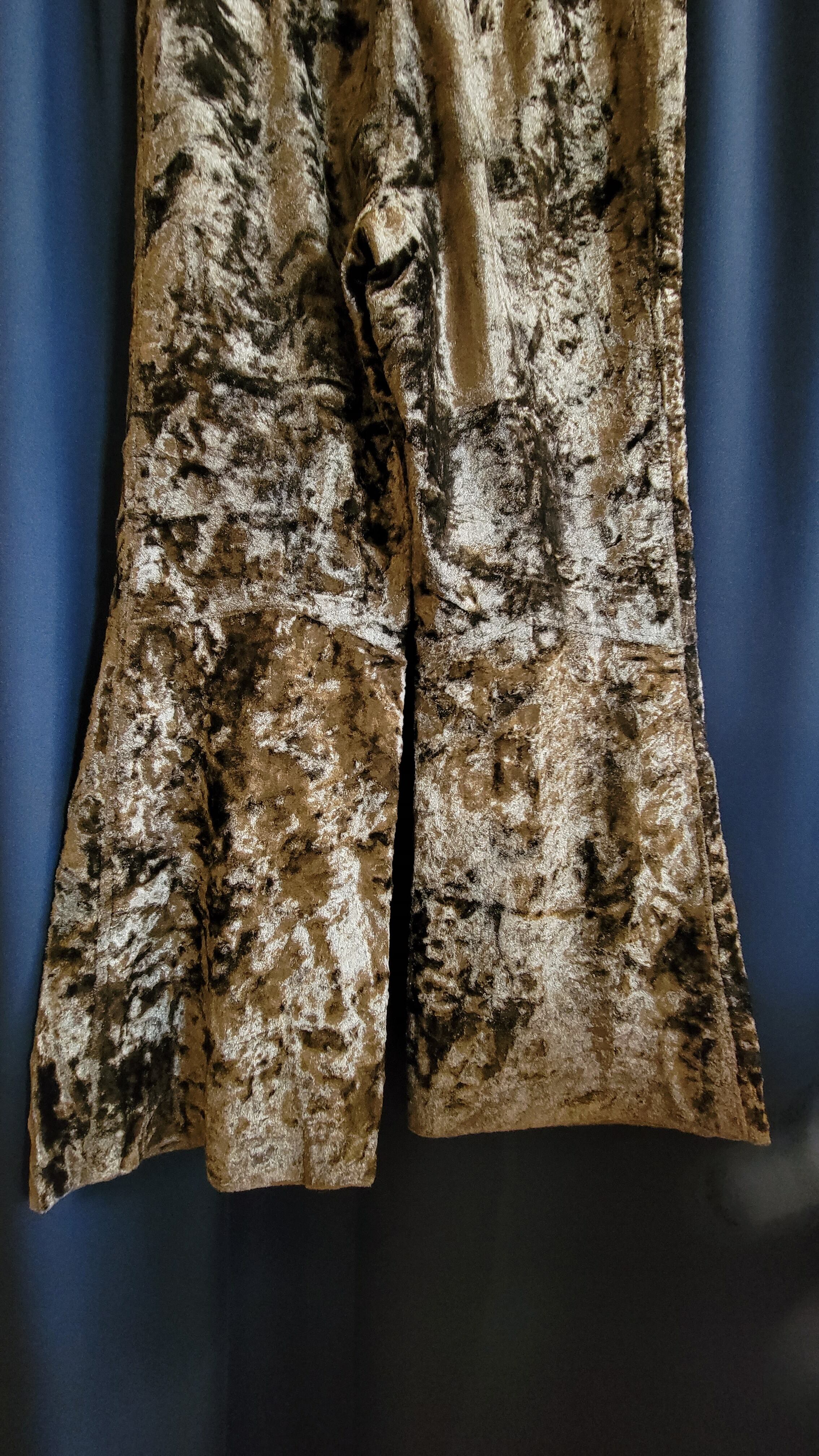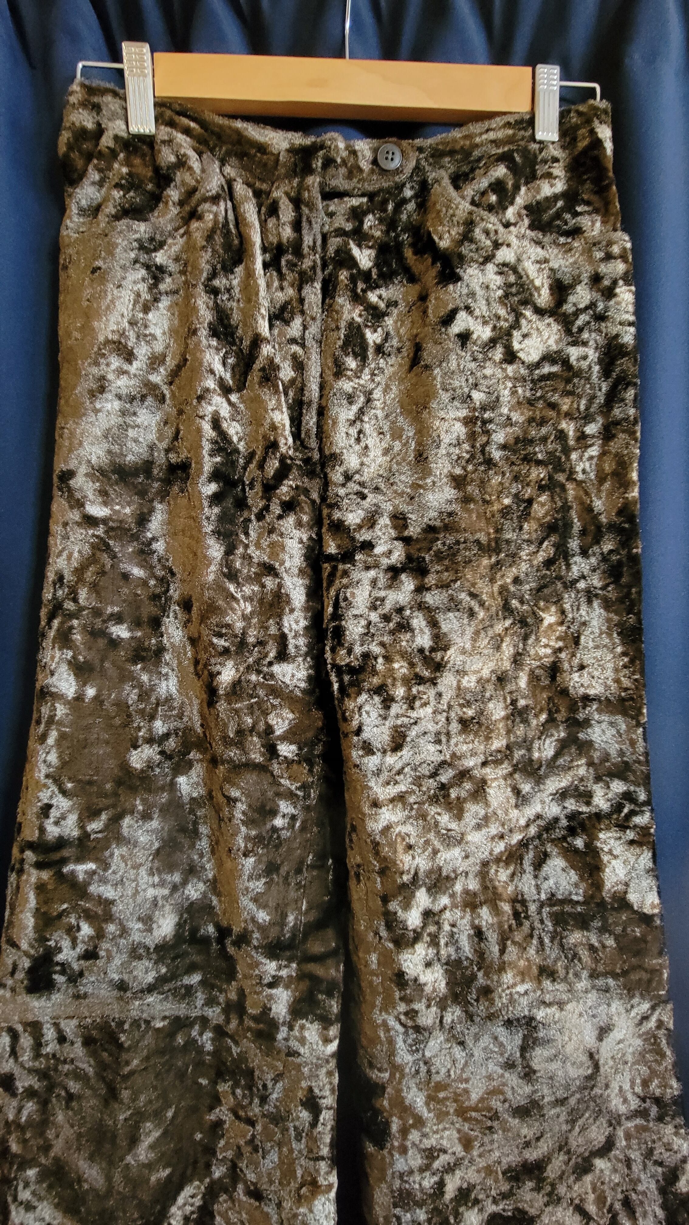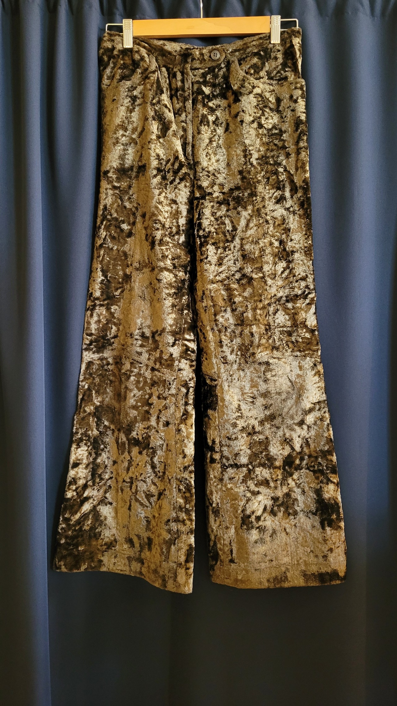 ベロア素材のヴィンテージパンツ。素材表記はありませんが厚すぎず薄すぎない柔らかい素材です。膝下の切り替えから裾にかけてブーツカットになっています。毛足の流れがランダムで光の当たり方により光沢の出方が変わります。