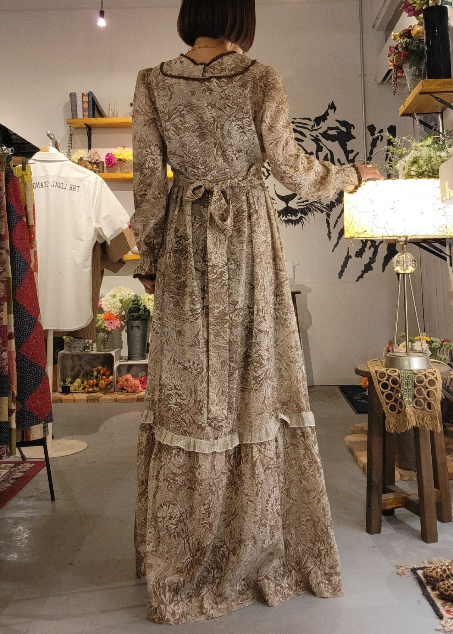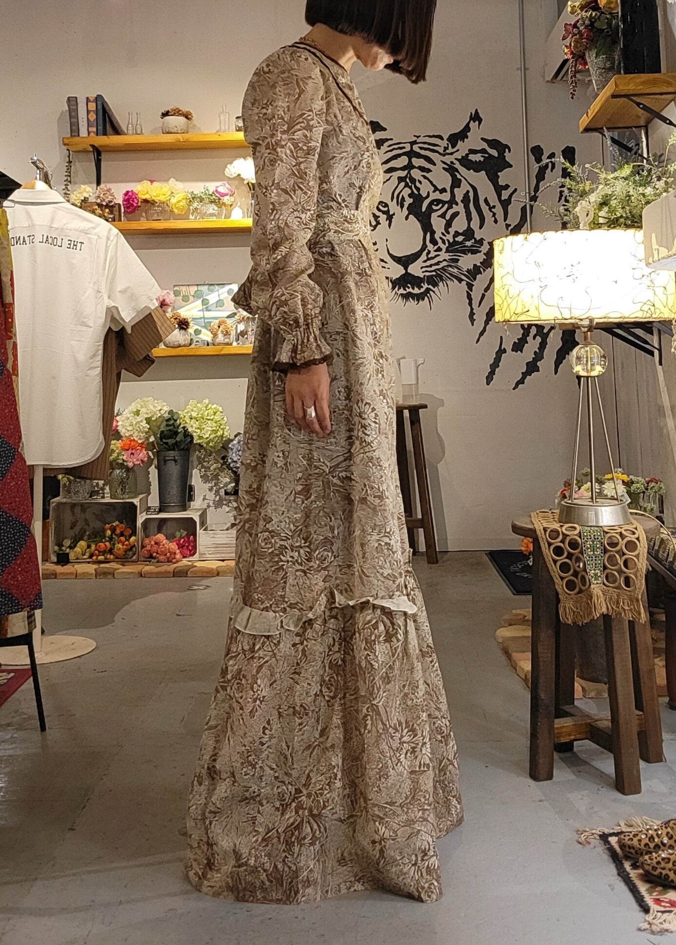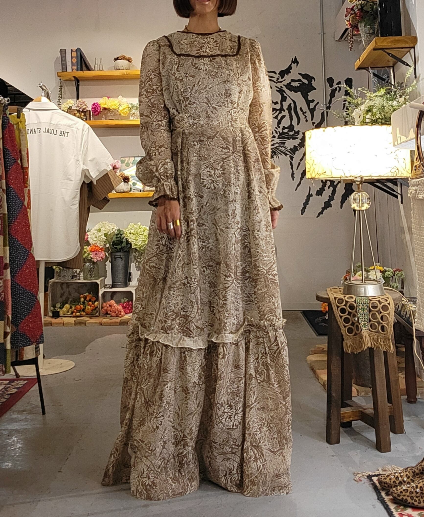 70sのヴィンテージマキシドレス。素材表記はありませんが薄手のコットンのようです。柔らかな素材感と繊細に描かれた花柄がノスタルジックな雰囲気。首後ろ中心にスナップボタンが付いておりファスナーはありません。