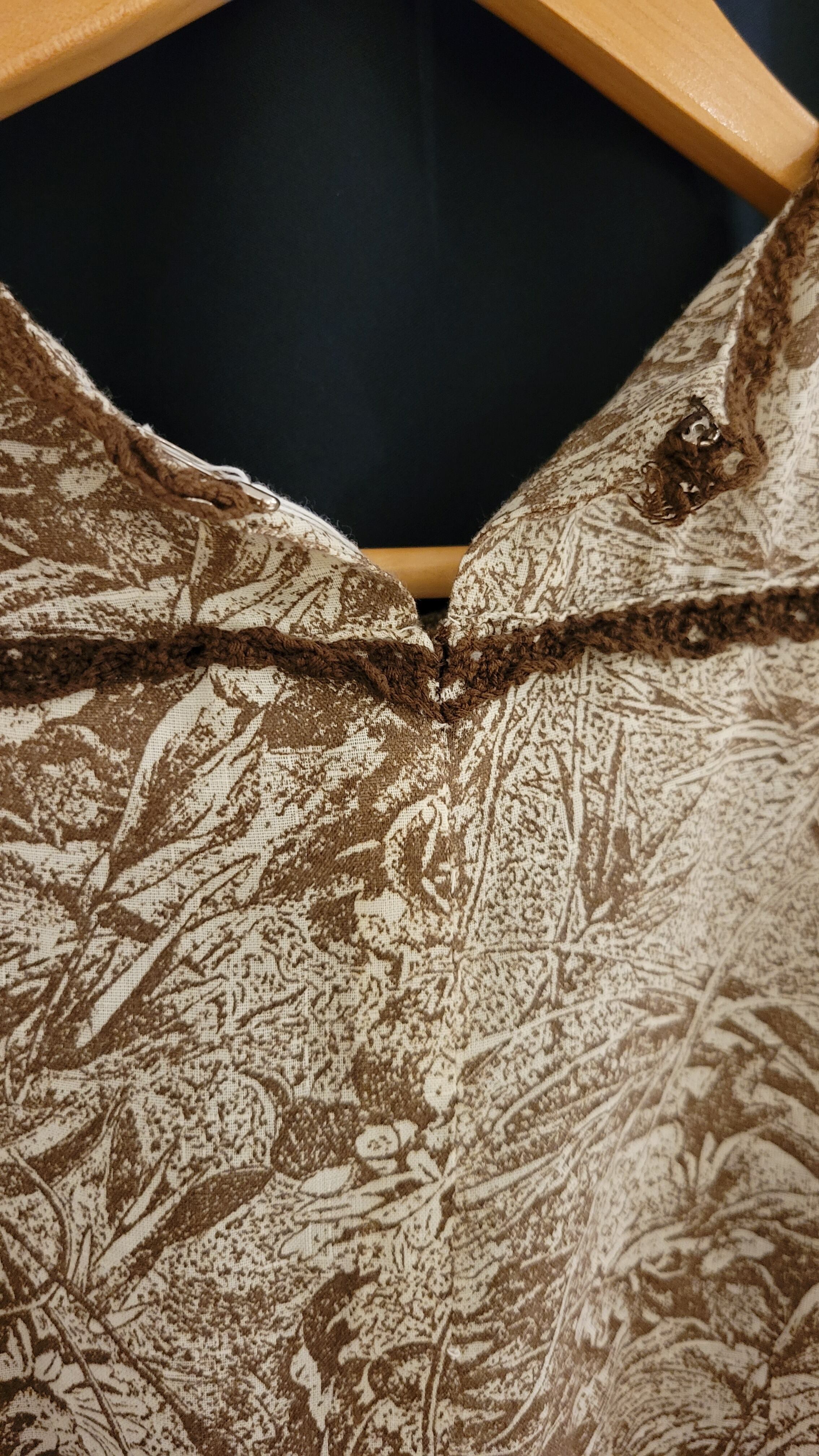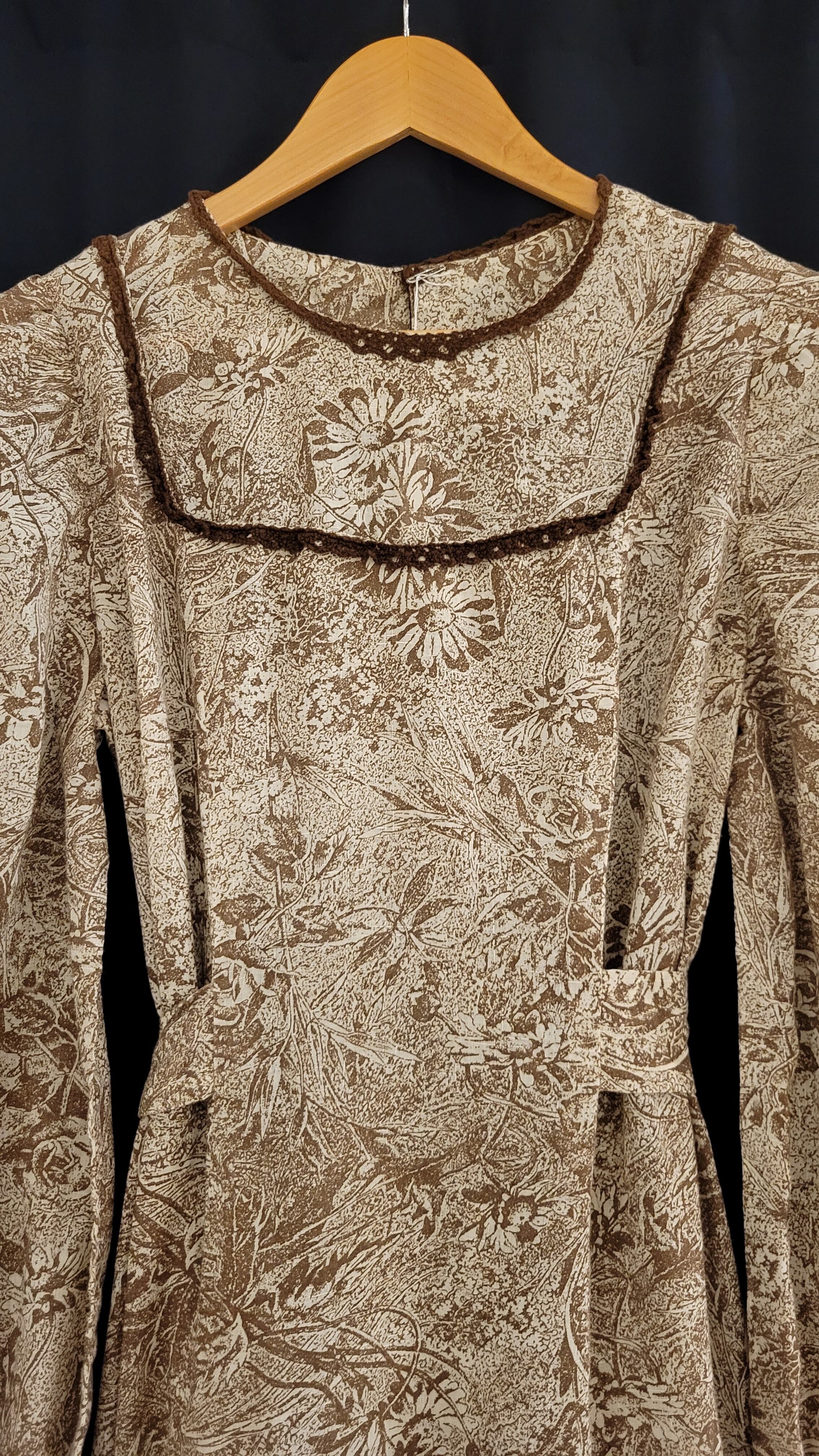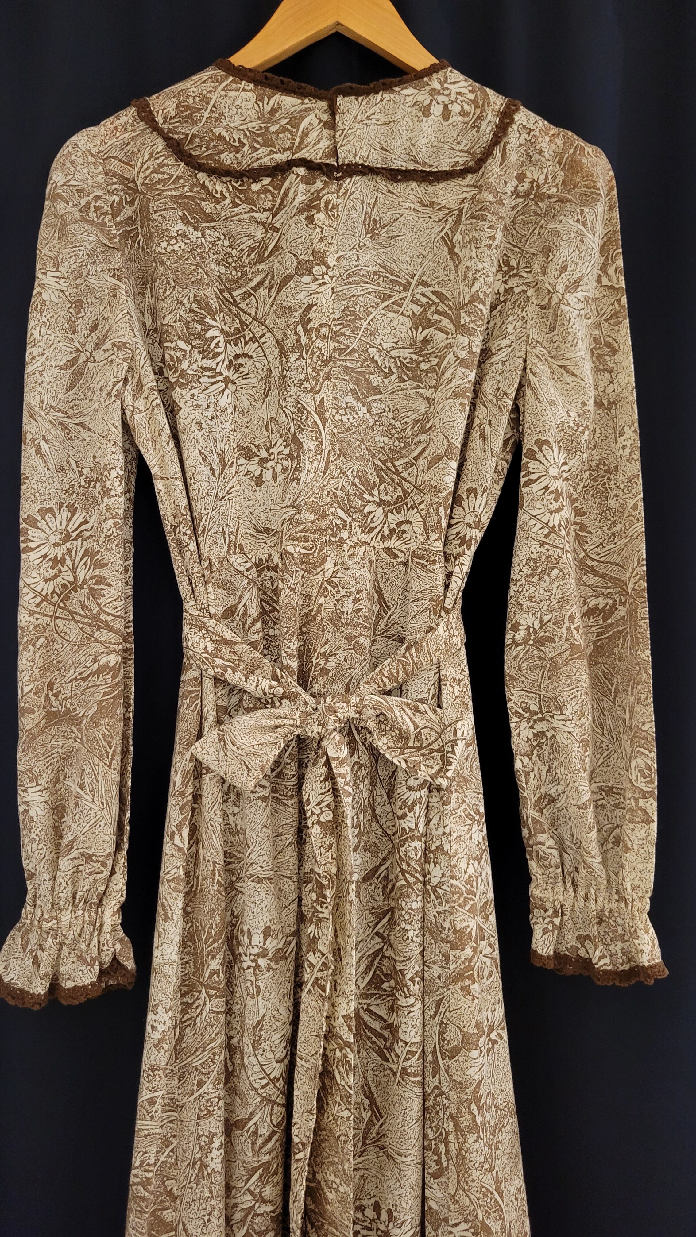 70sのヴィンテージマキシドレス。素材表記はありませんが薄手のコットンのようです。柔らかな素材感と繊細に描かれた花柄がノスタルジックな雰囲気。首後ろ中心にスナップボタンが付いておりファスナーはありません。
