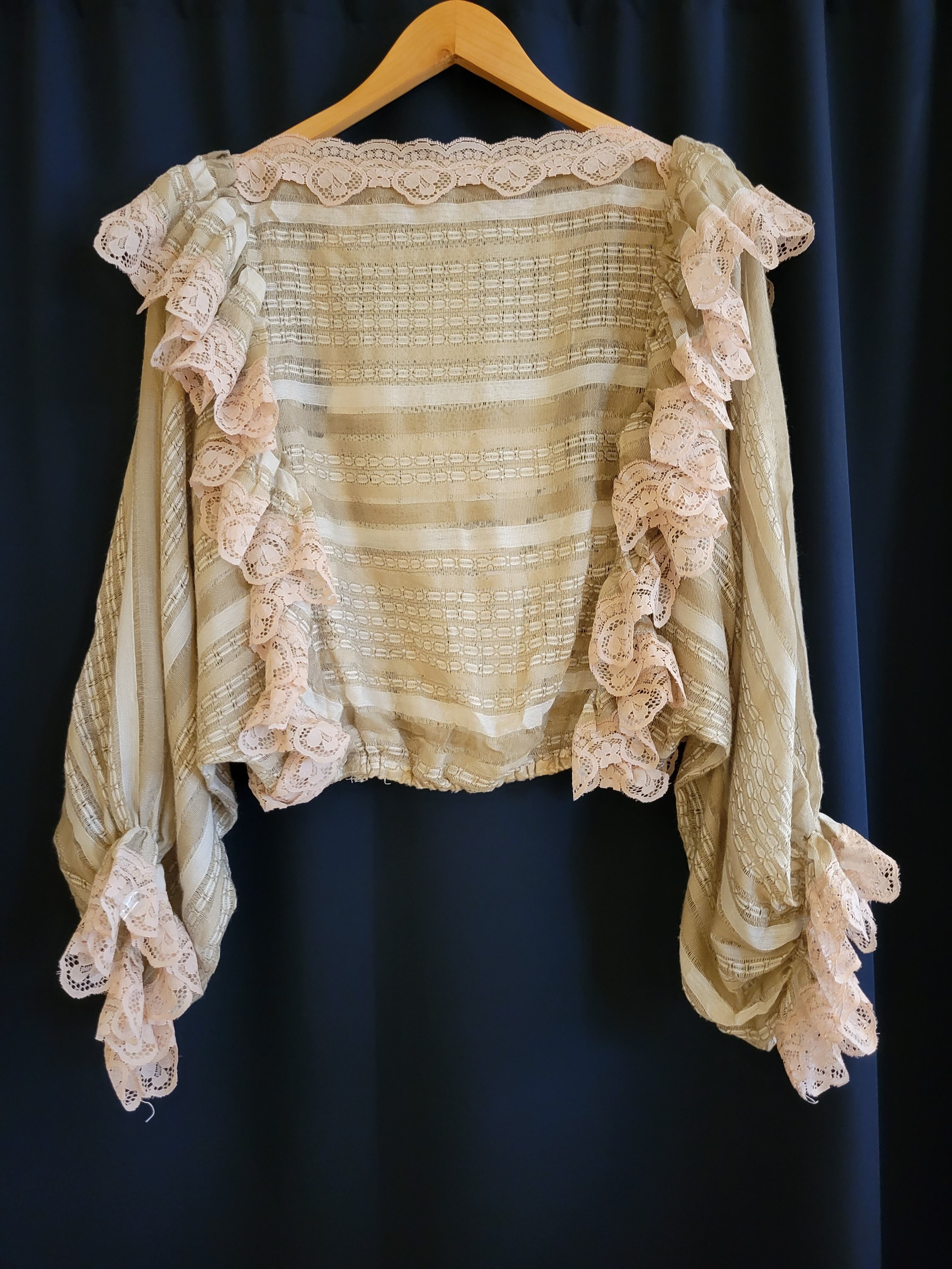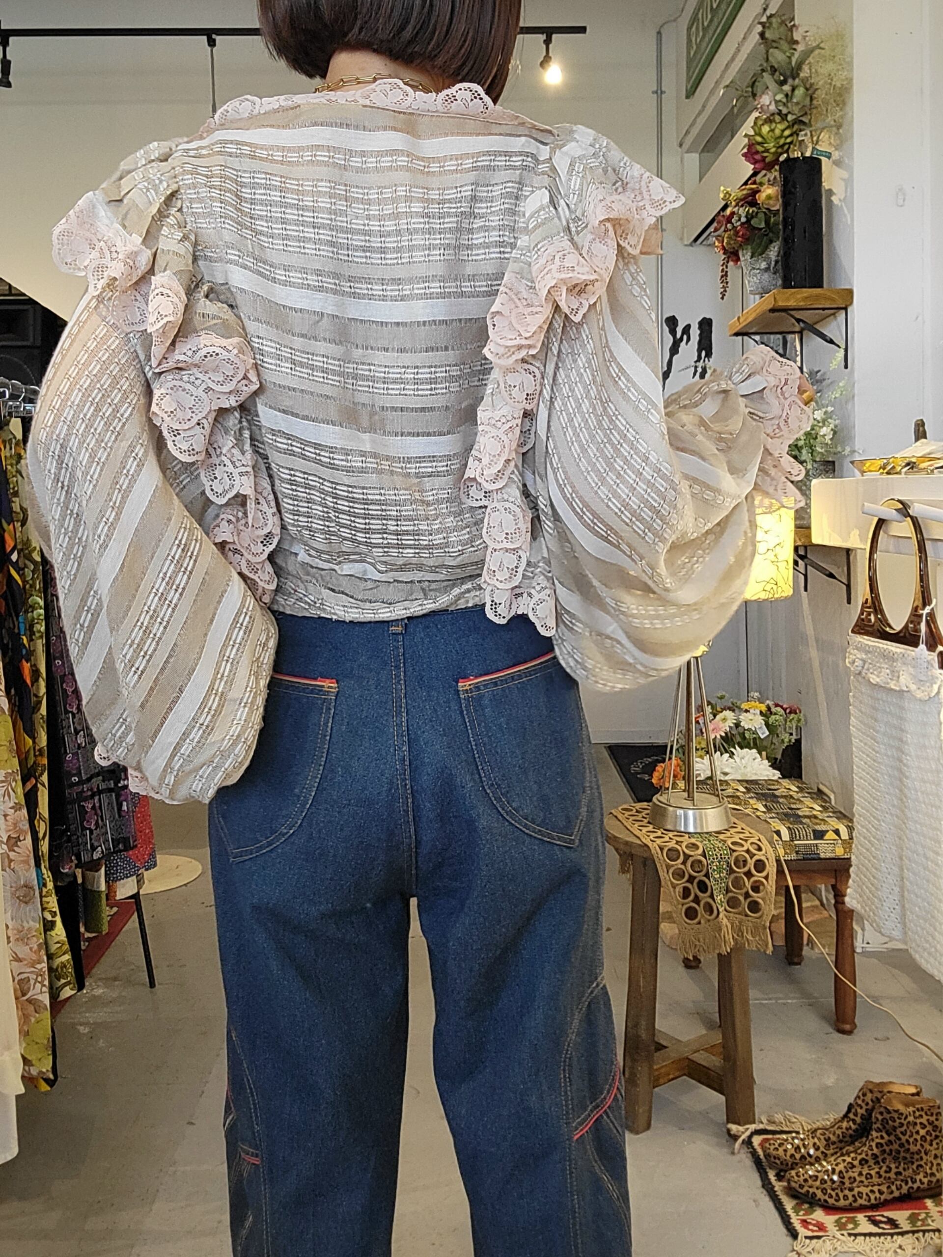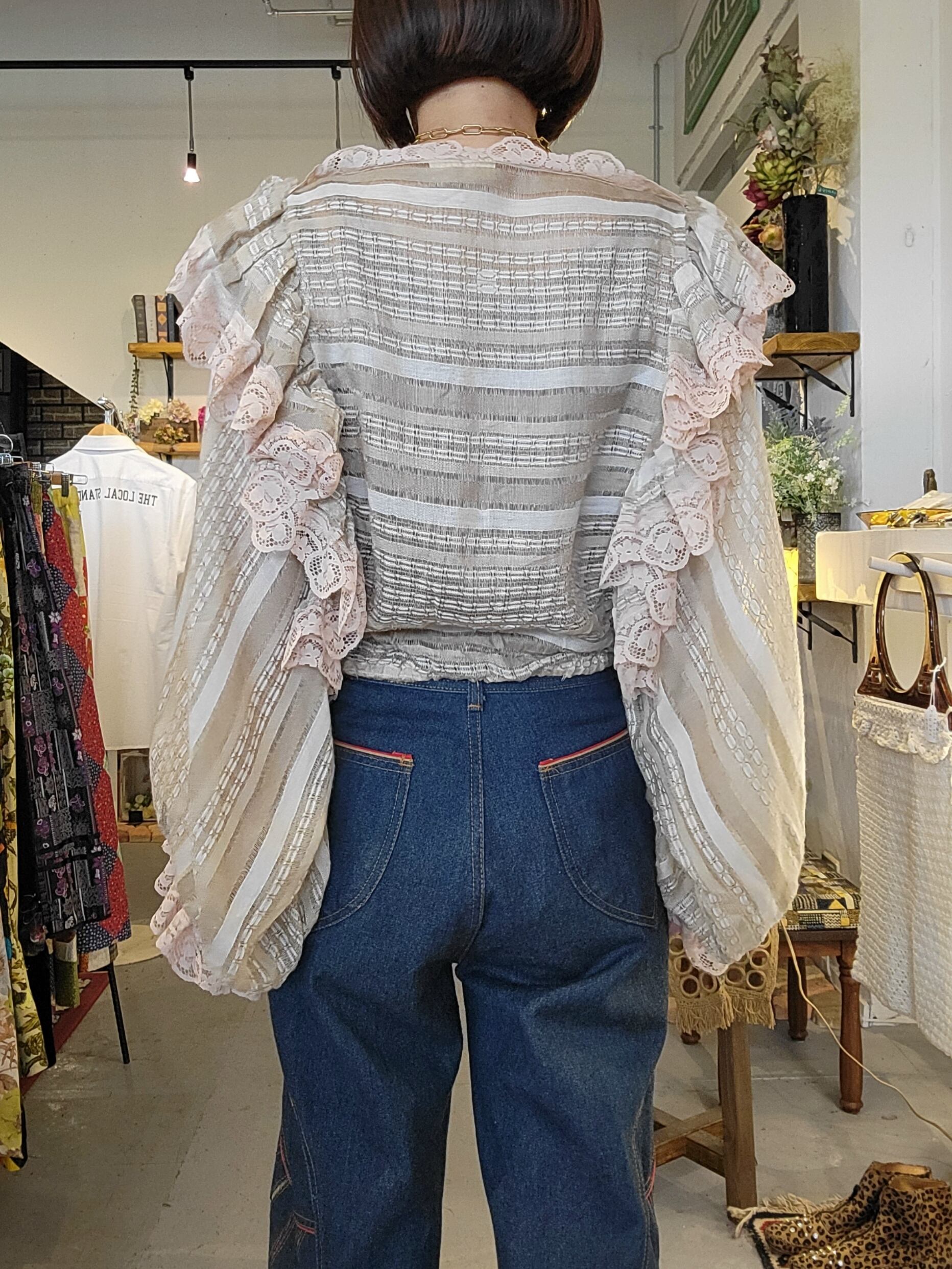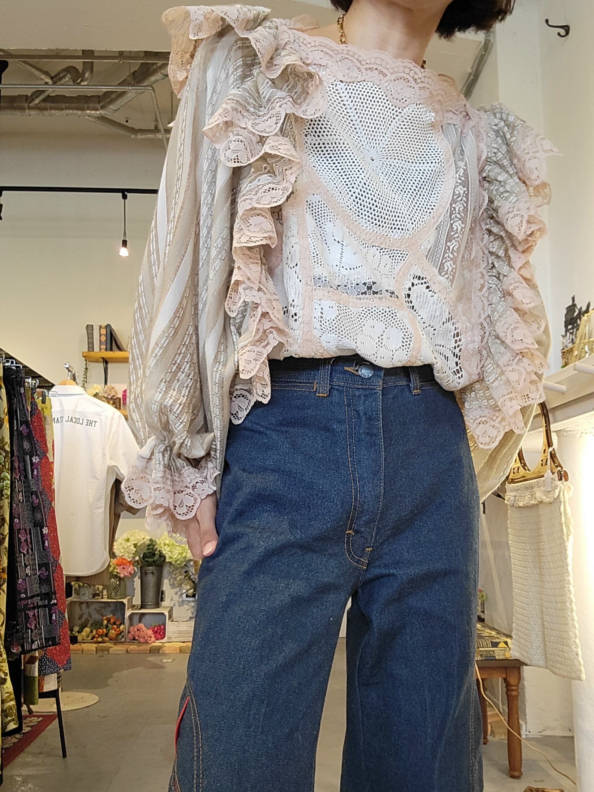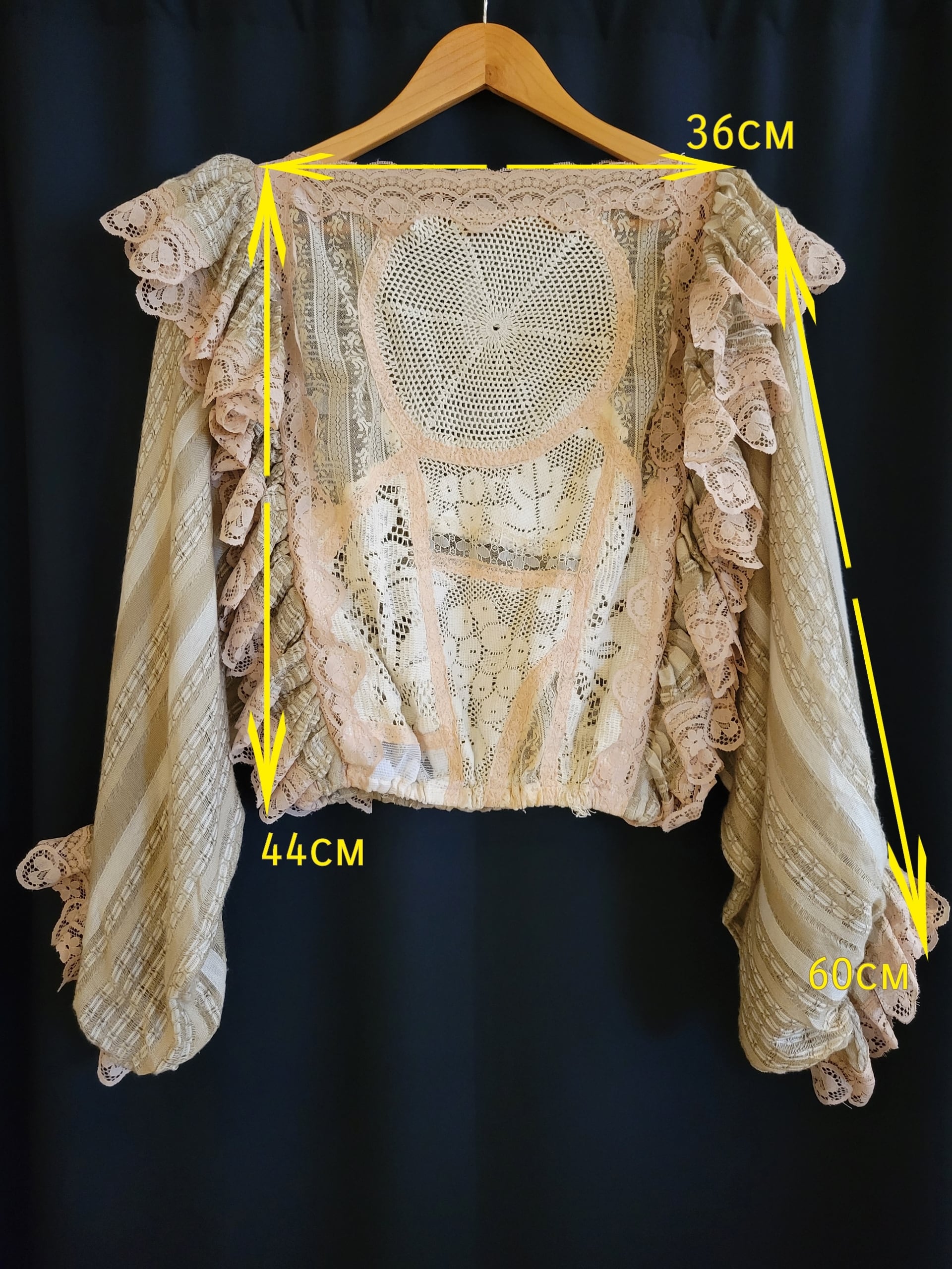 華やかな総レースのヴィンテージフリルトップス。素材表記は合成繊維と表記されています。異なる模様のヴィンテージレースをたっぷり使用した贅沢な一枚。胸元のクロシェ編みも素敵です。袖口と裾はゴム仕様ですがやや伸びているためキュッとするフィット感はありません。