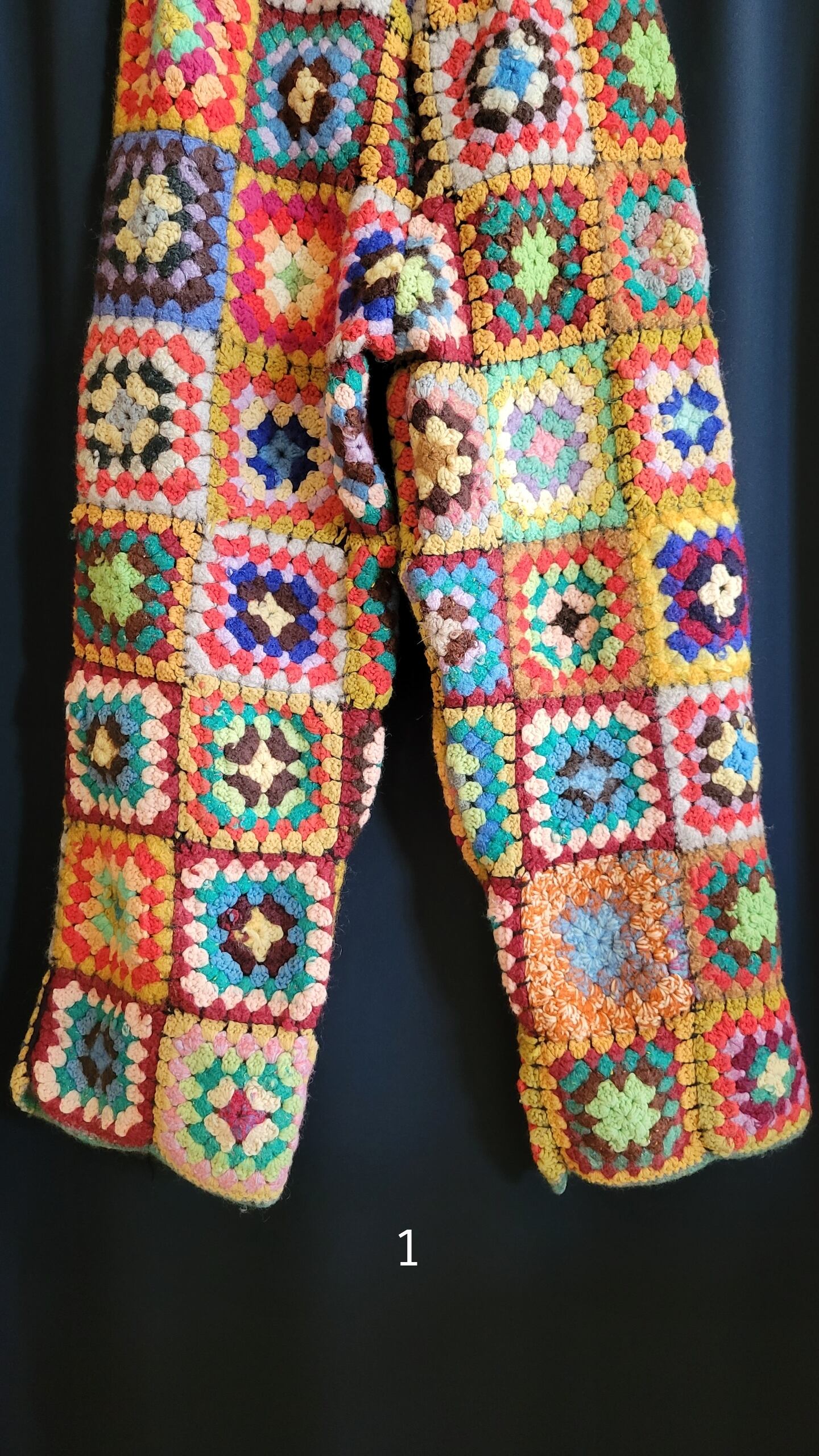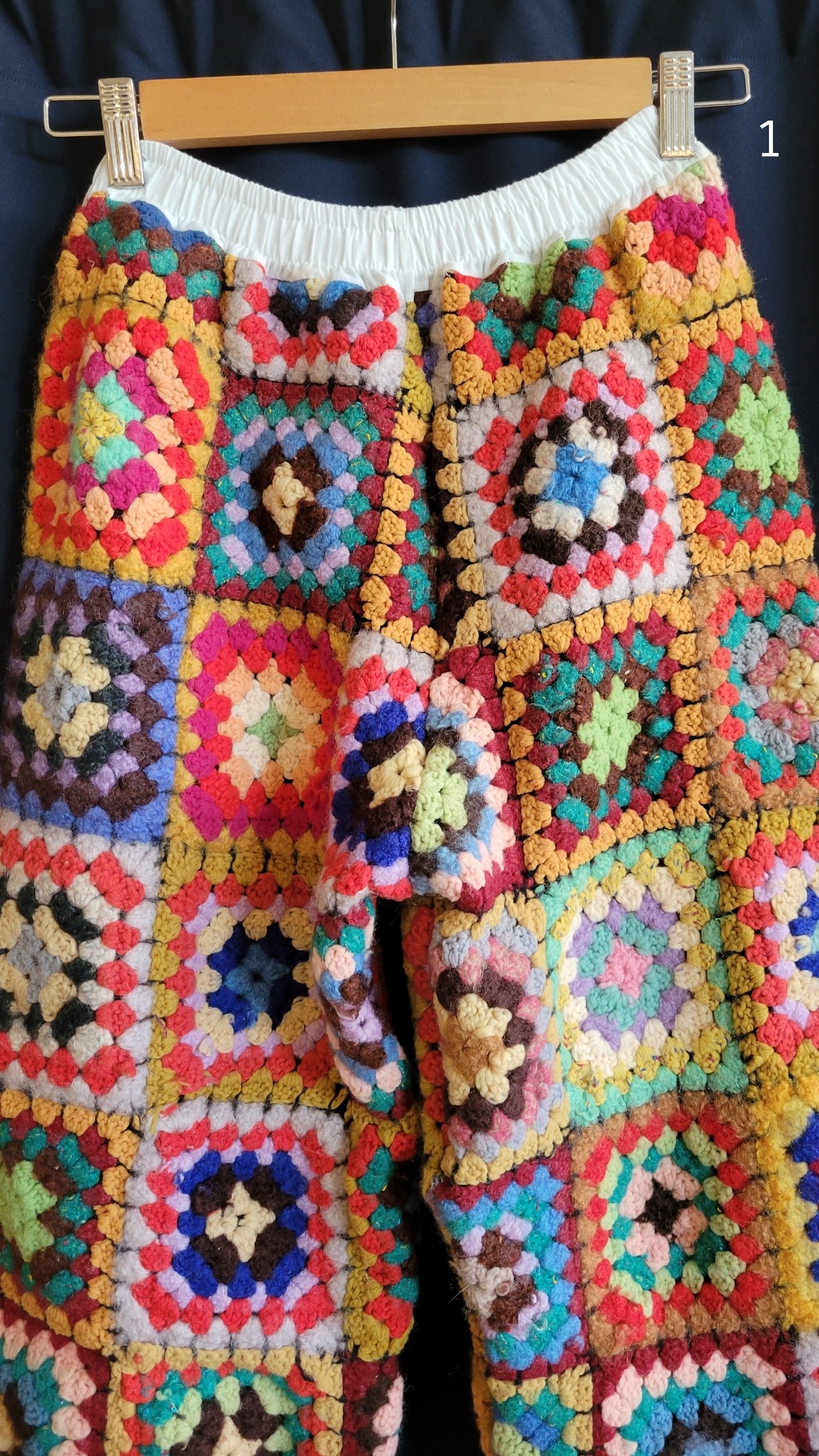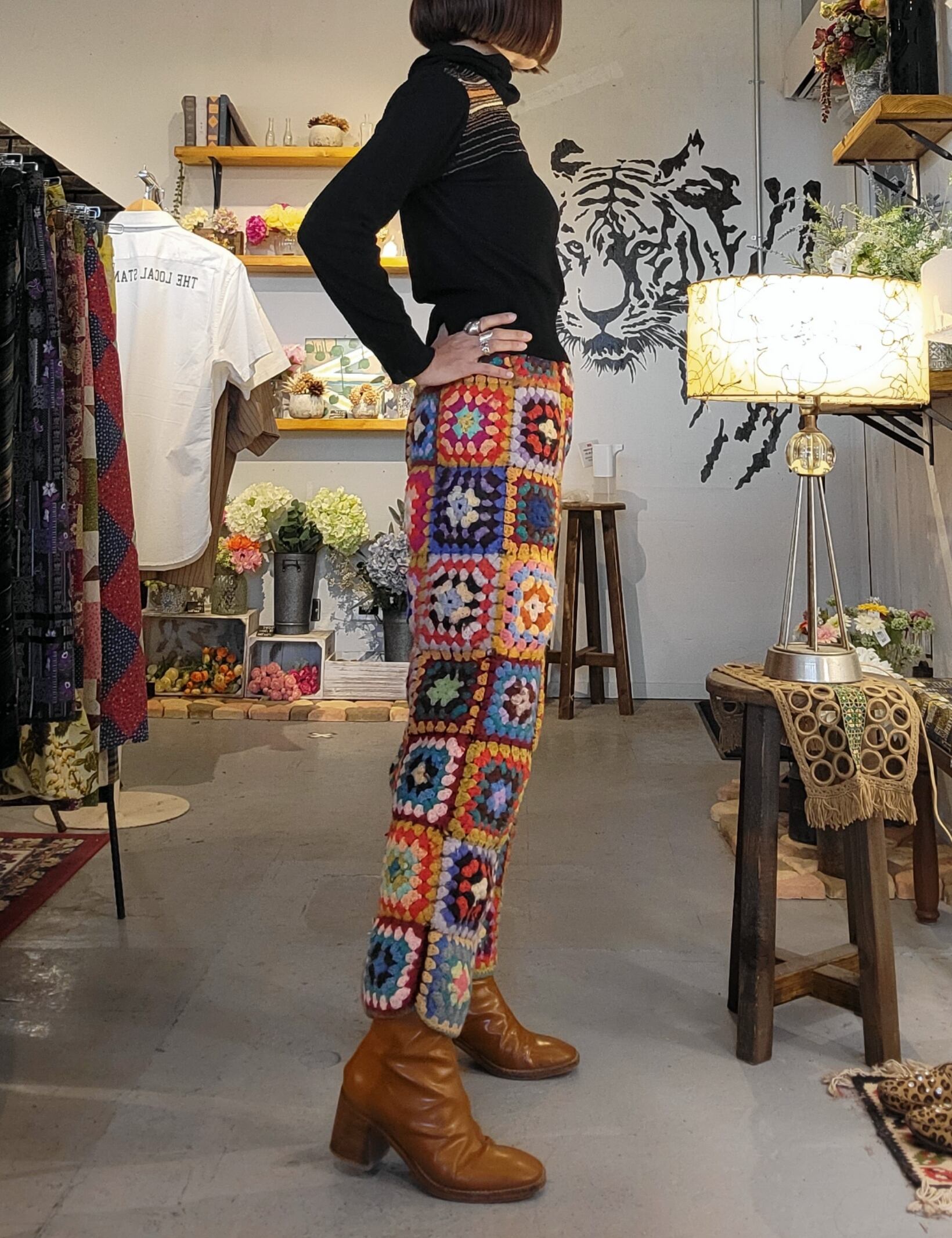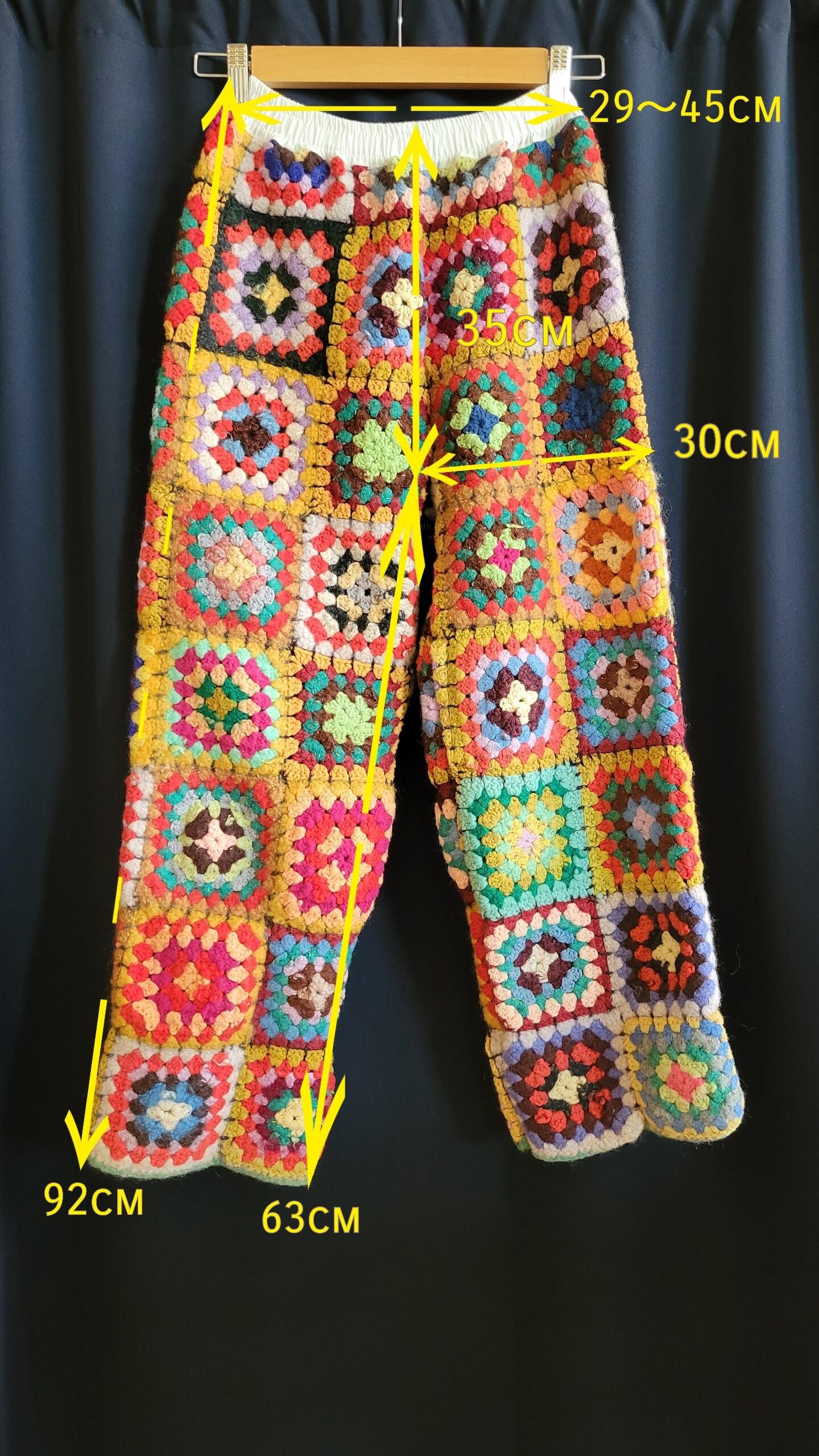 ヴィンテージのグラニーニットのブランケットをリメイクしたウエストゴムのイージーパンツです。肉厚で暖かいハンドニットはヴィンテージならではの味わい。生地自体は当時もののため、毛玉等の使用感があります(できるかぎりこちらで取り除くメンテナンスはしております)。着用に支障のある程度ではありませんが、ヴィンテージ品にご理解のある方へおすすめいたします。