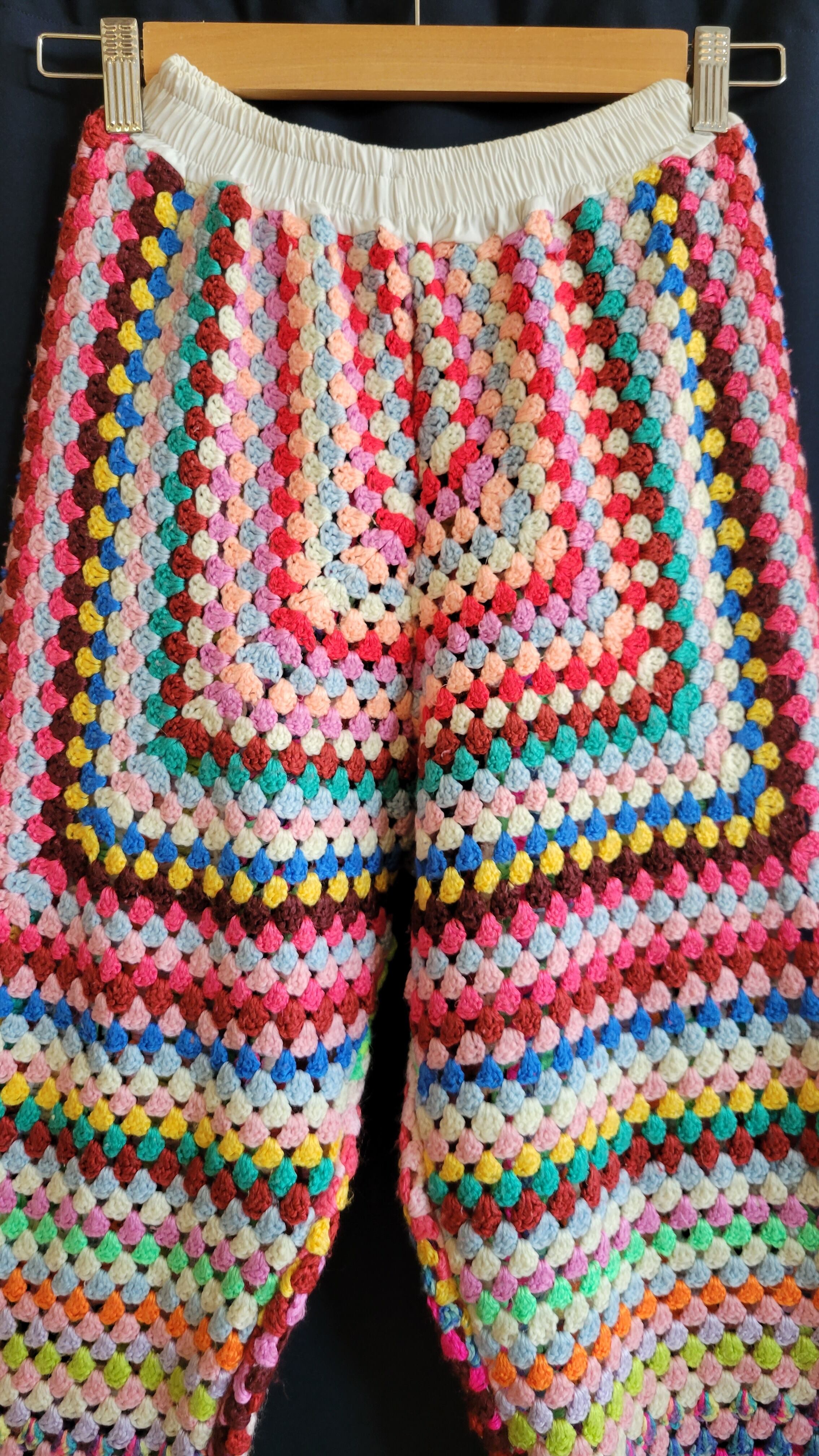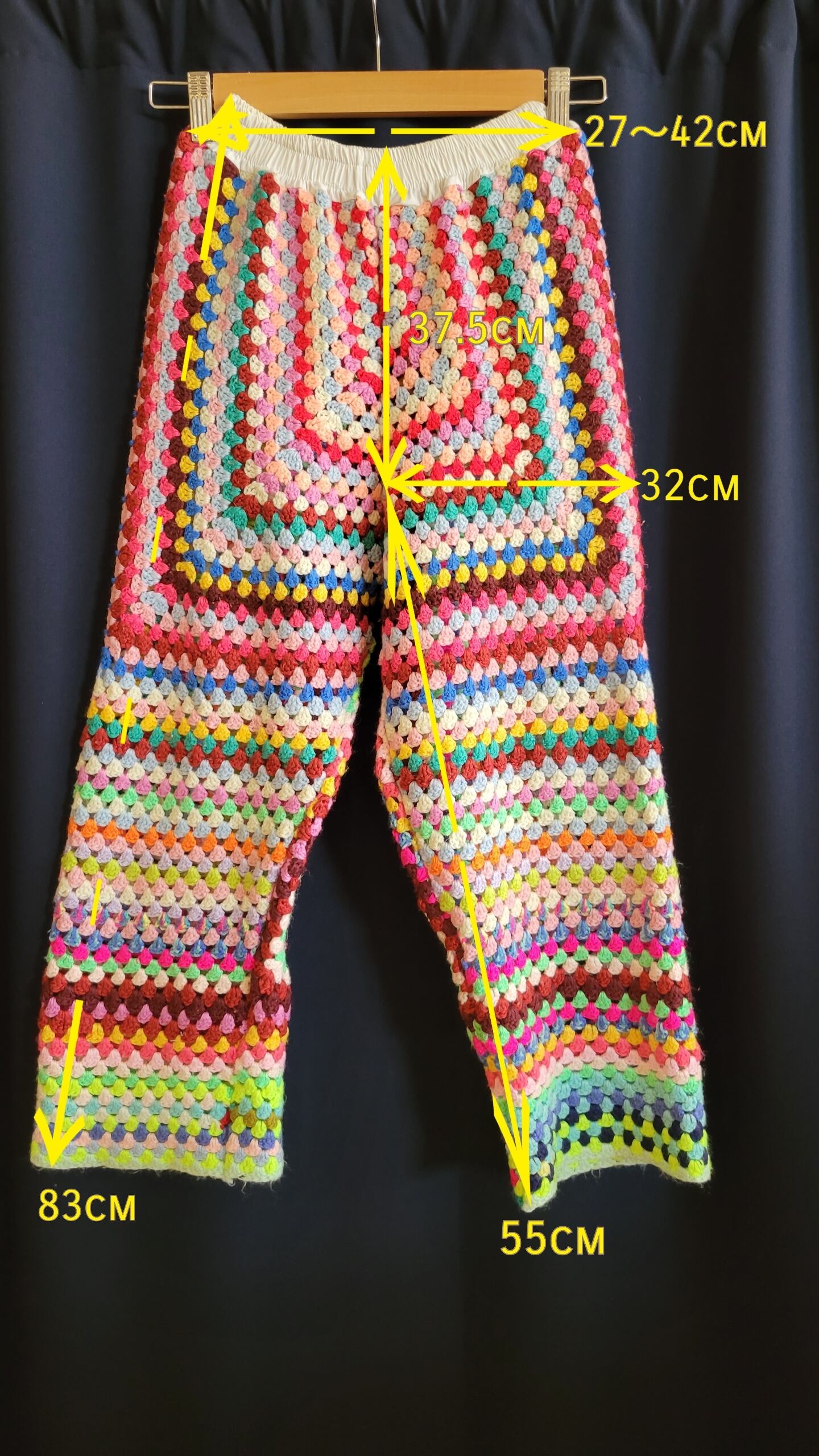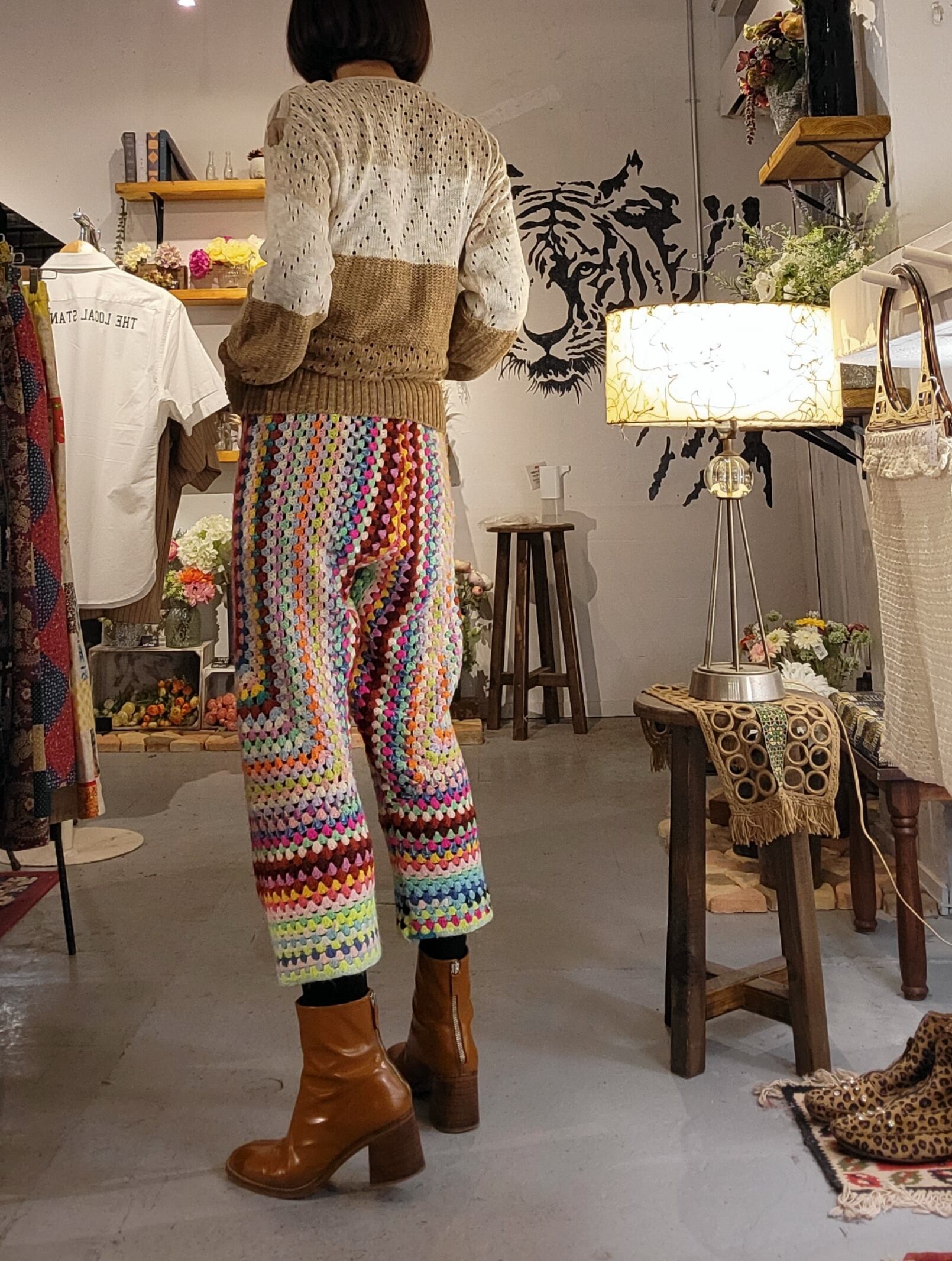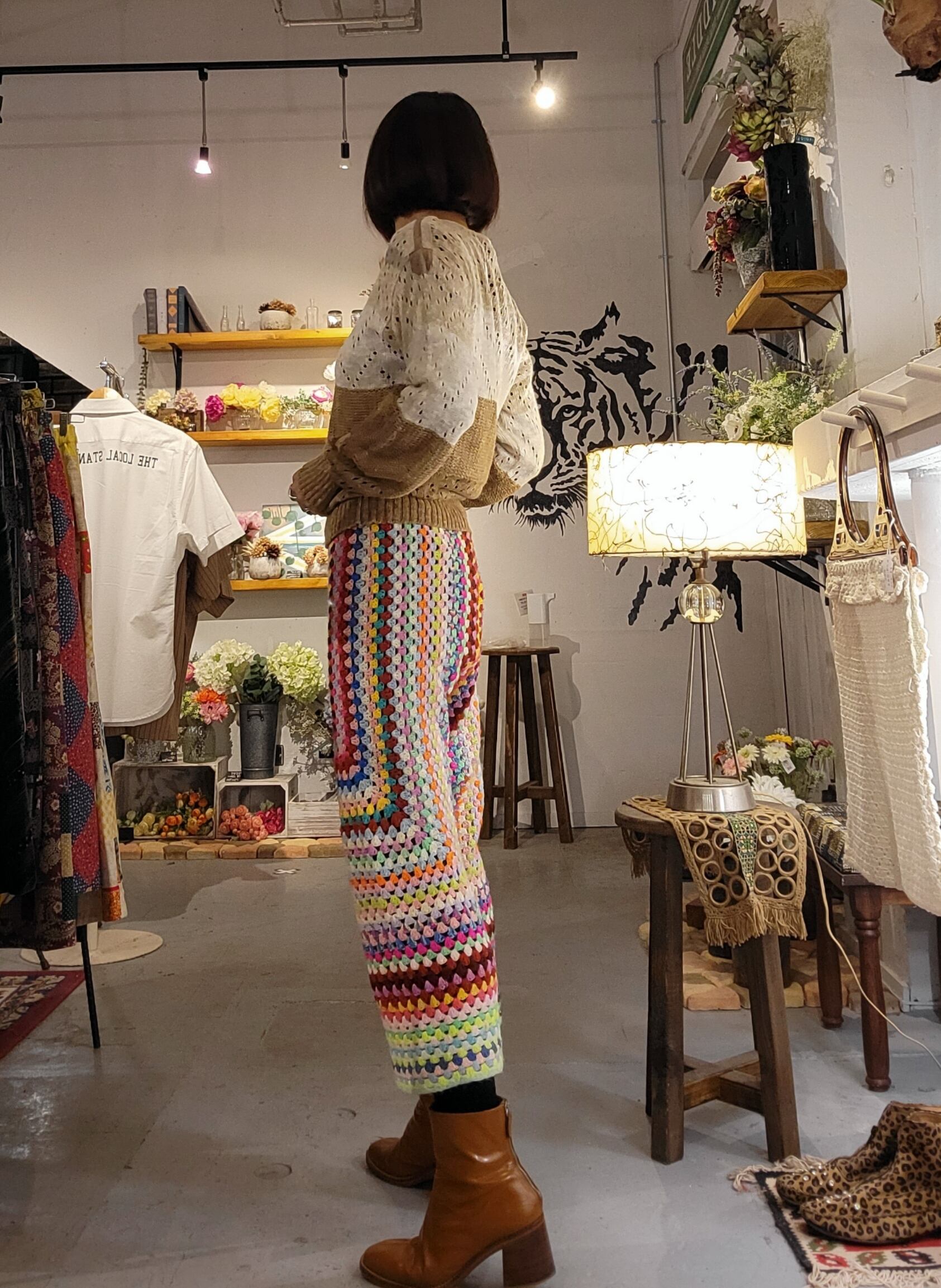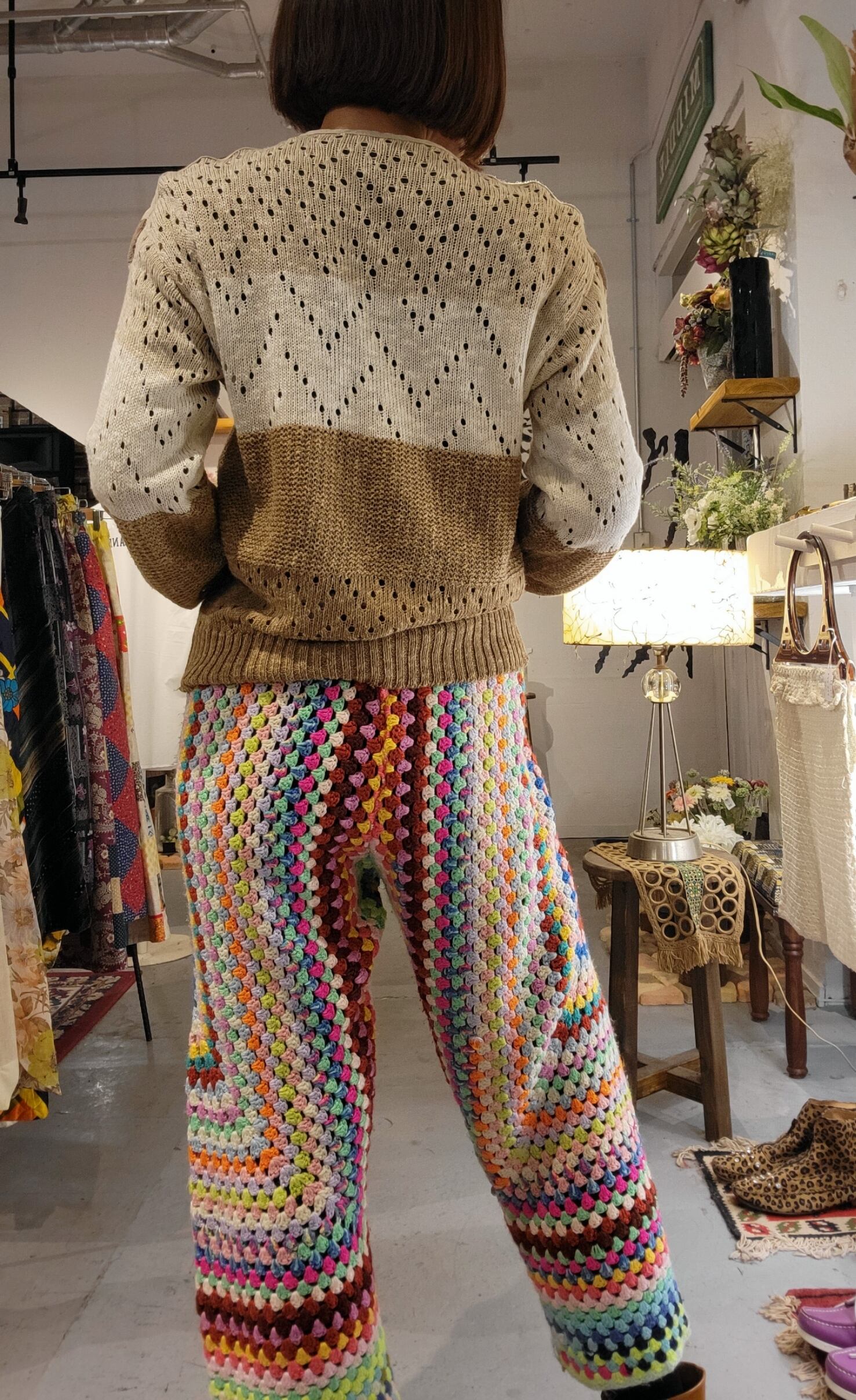 ヴィンテージのグラニーニットのブランケットをリメイクしたウエストゴムのイージーパンツです。肉厚で暖かいハンドニットはヴィンテージならでは。生地自体は当時もののため、毛玉等の使用感があります(できるかぎりこちらで取り除くメンテナンスをしております)。着用に支障のある程度ではありませんが、ヴィンテージ品にご理解のある方へおすすめいたします。