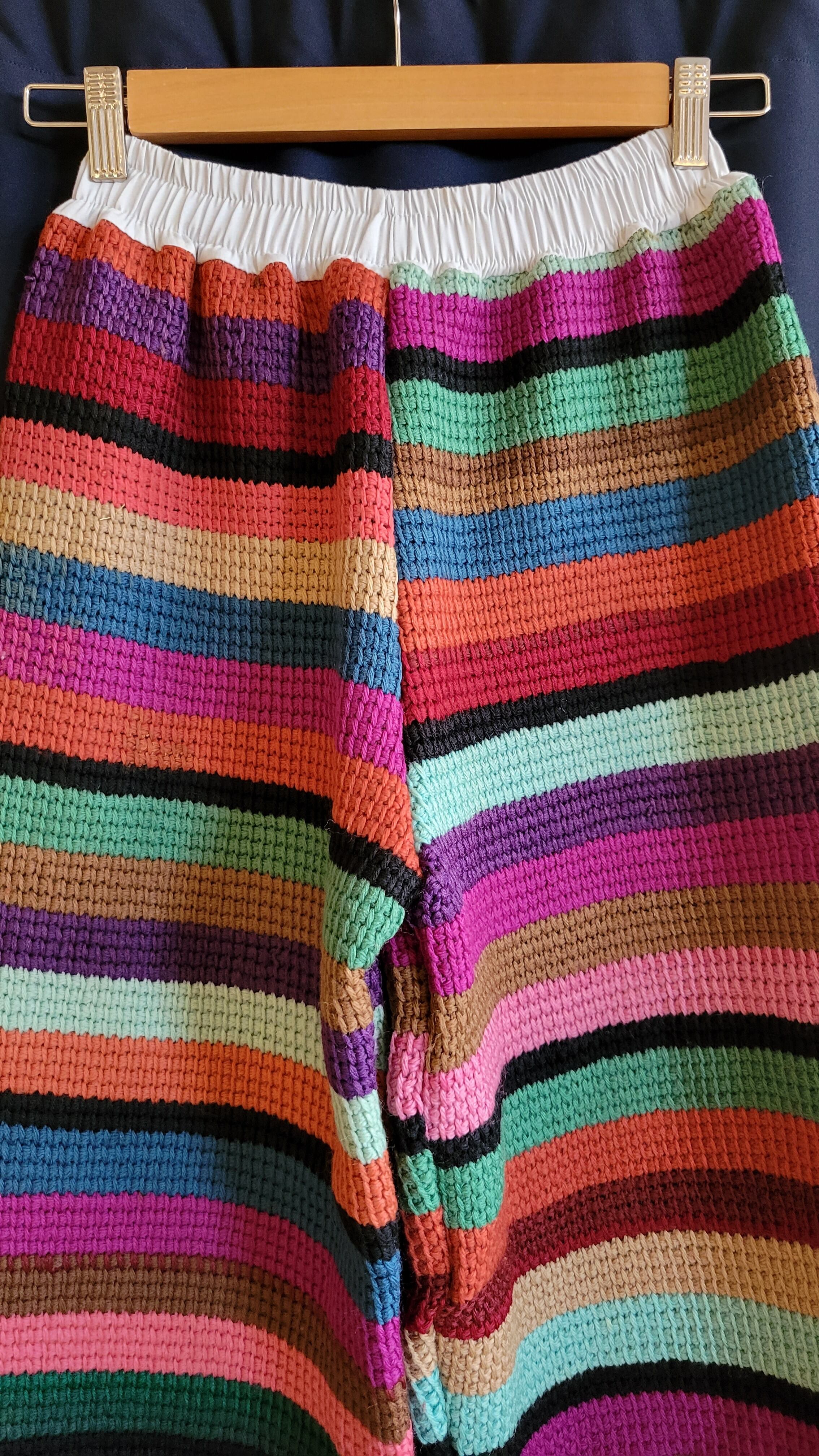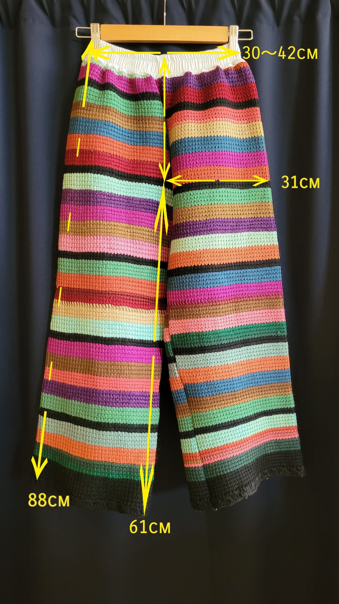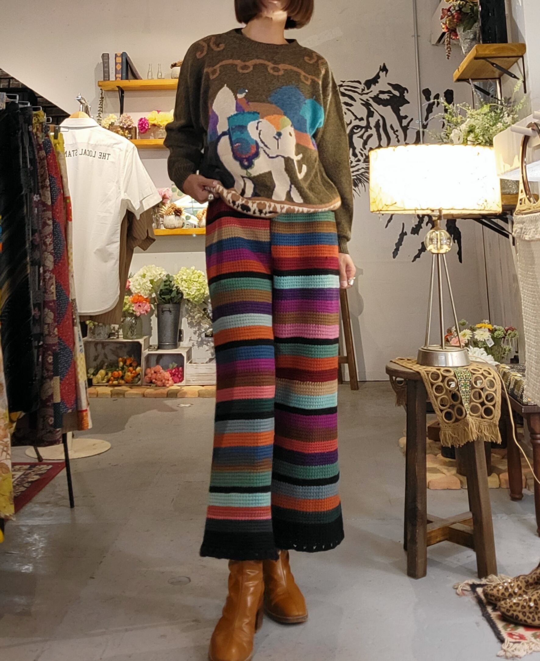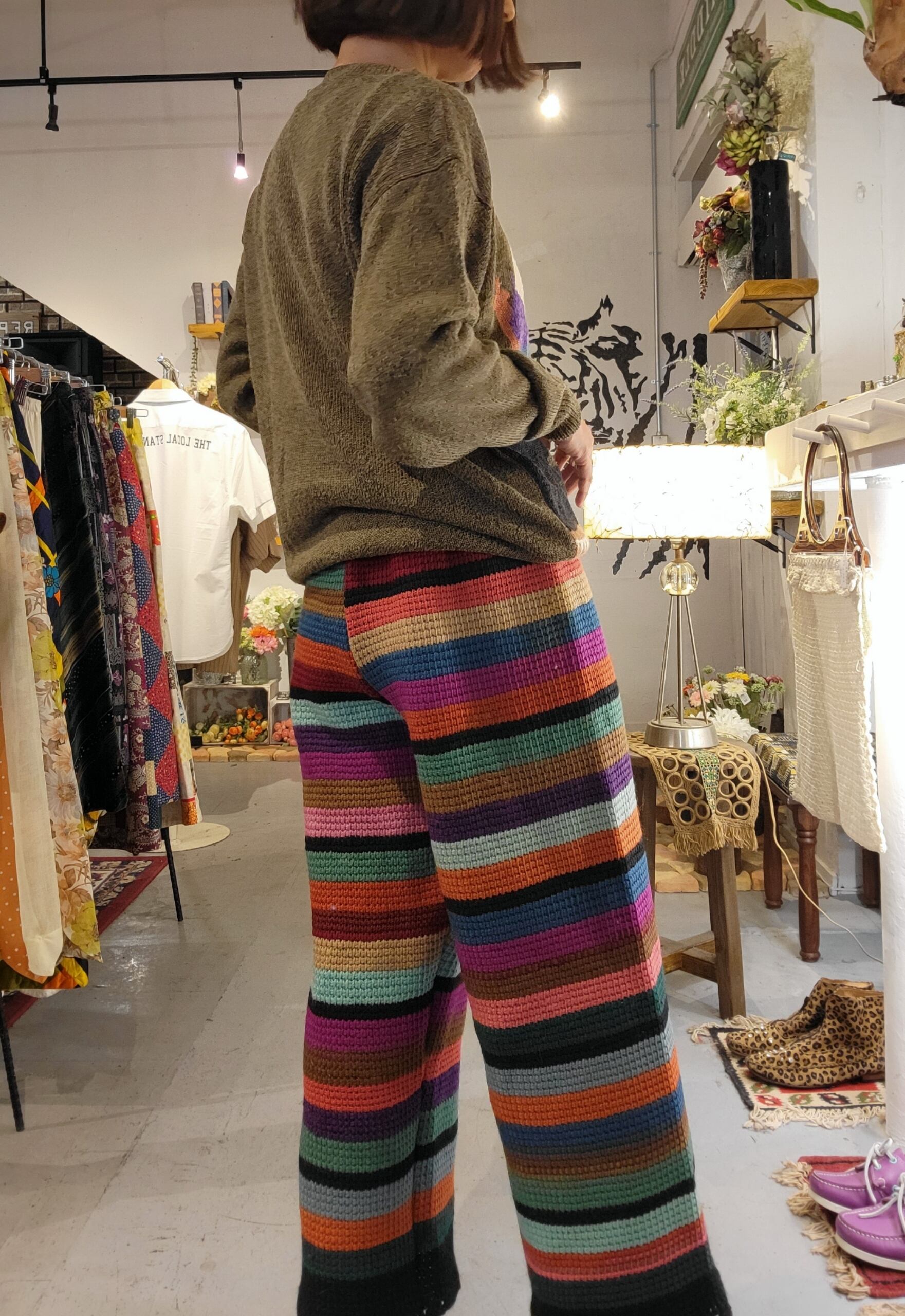 ヴィンテージのグラニーニットのブランケットをリメイクしたウエストゴムのイージーパンツです。肉厚で暖かいハンドニットはヴィンテージならでは。生地自体は当時もののため、毛玉等の使用感があります(できるかぎりこちらで取り除くメンテナンスをしております)。着用に支障のある程度ではありませんが、ヴィンテージ品にご理解のある方へおすすめいたします。