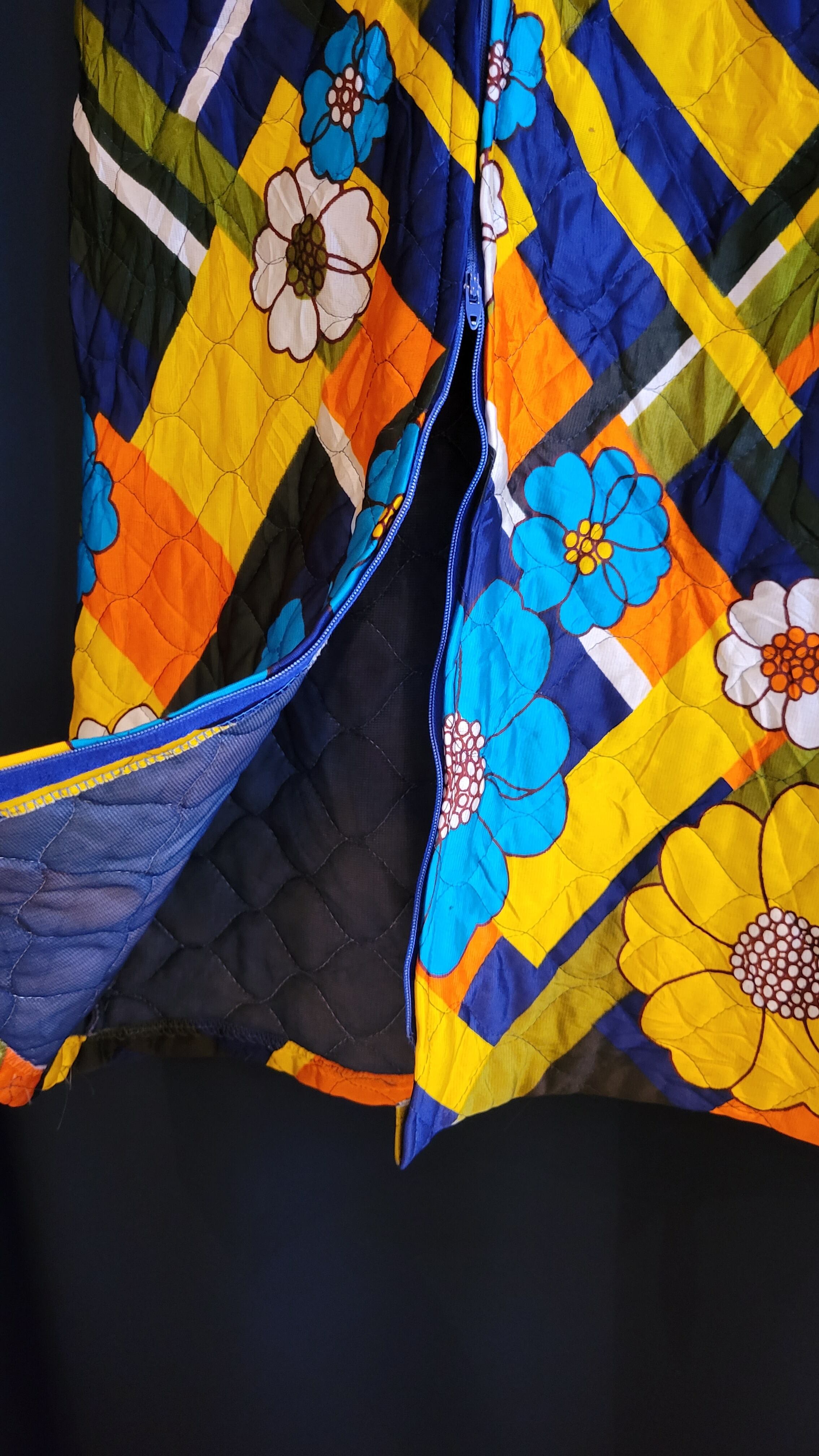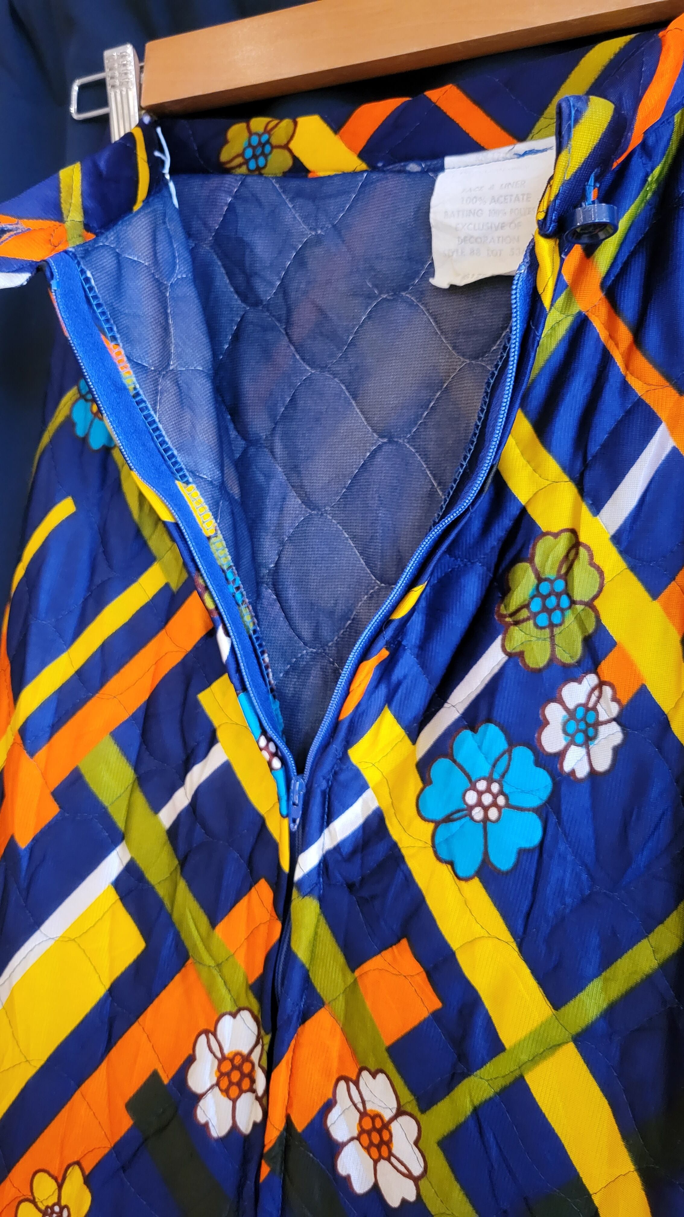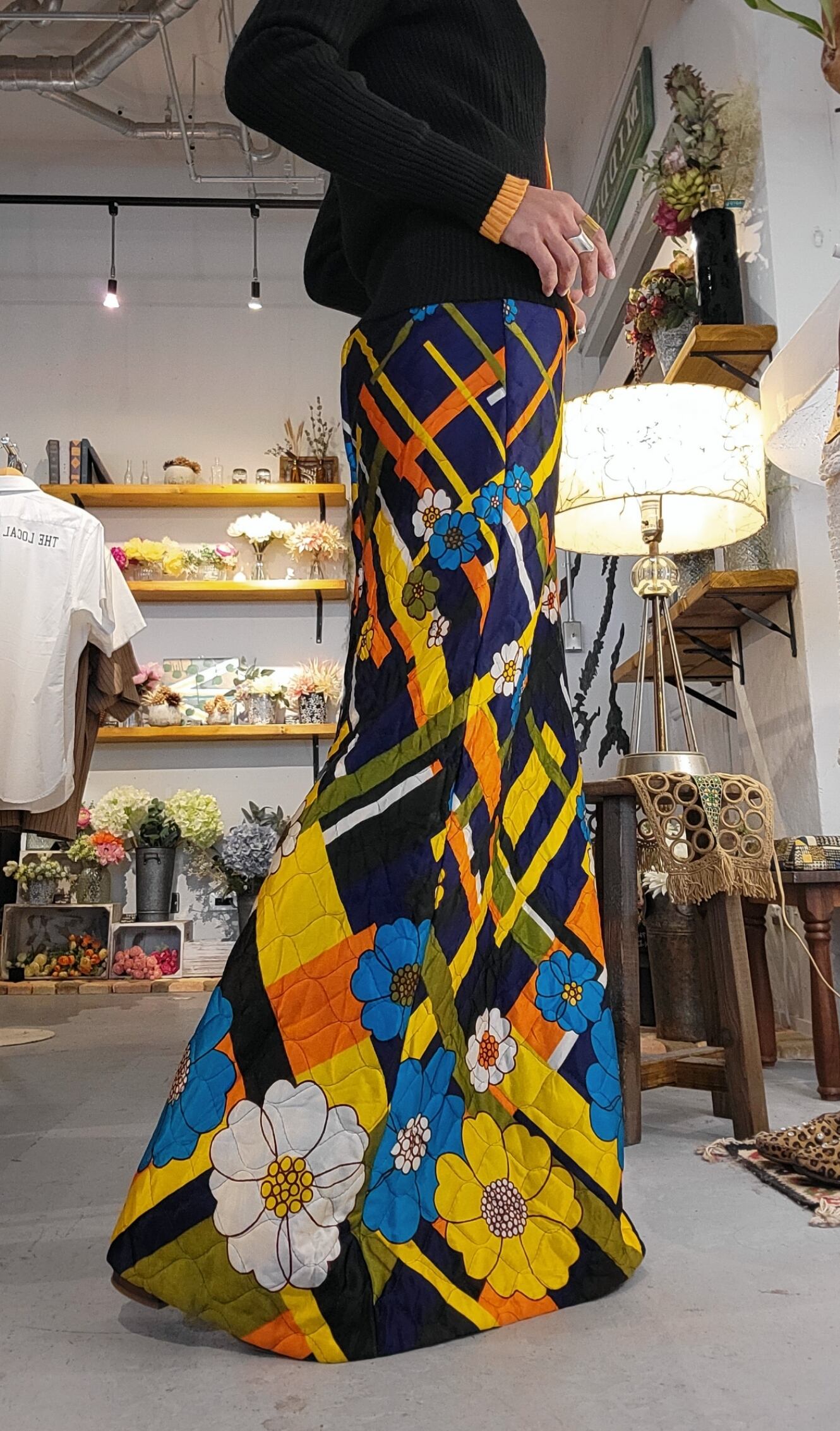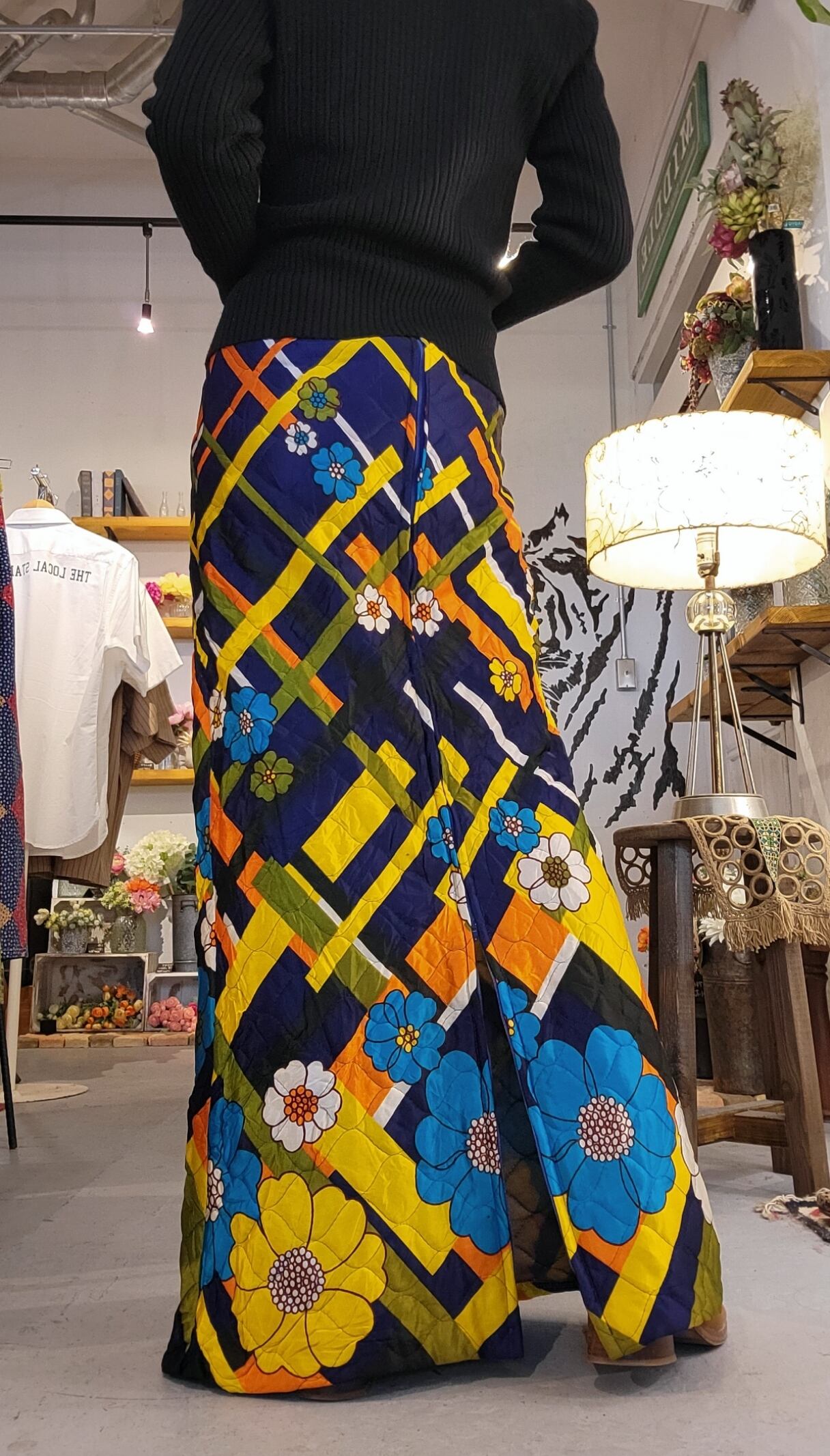 ヴィンテージのキルティングマキシスカート。素材表記はアセテート100%、中綿はポリエステル100%とあります。光沢のあるネイビーの地に鮮やかなプリントが映えます。バックにボタンが1つ、ファスナーは上下どちらからも開閉できる仕様です。