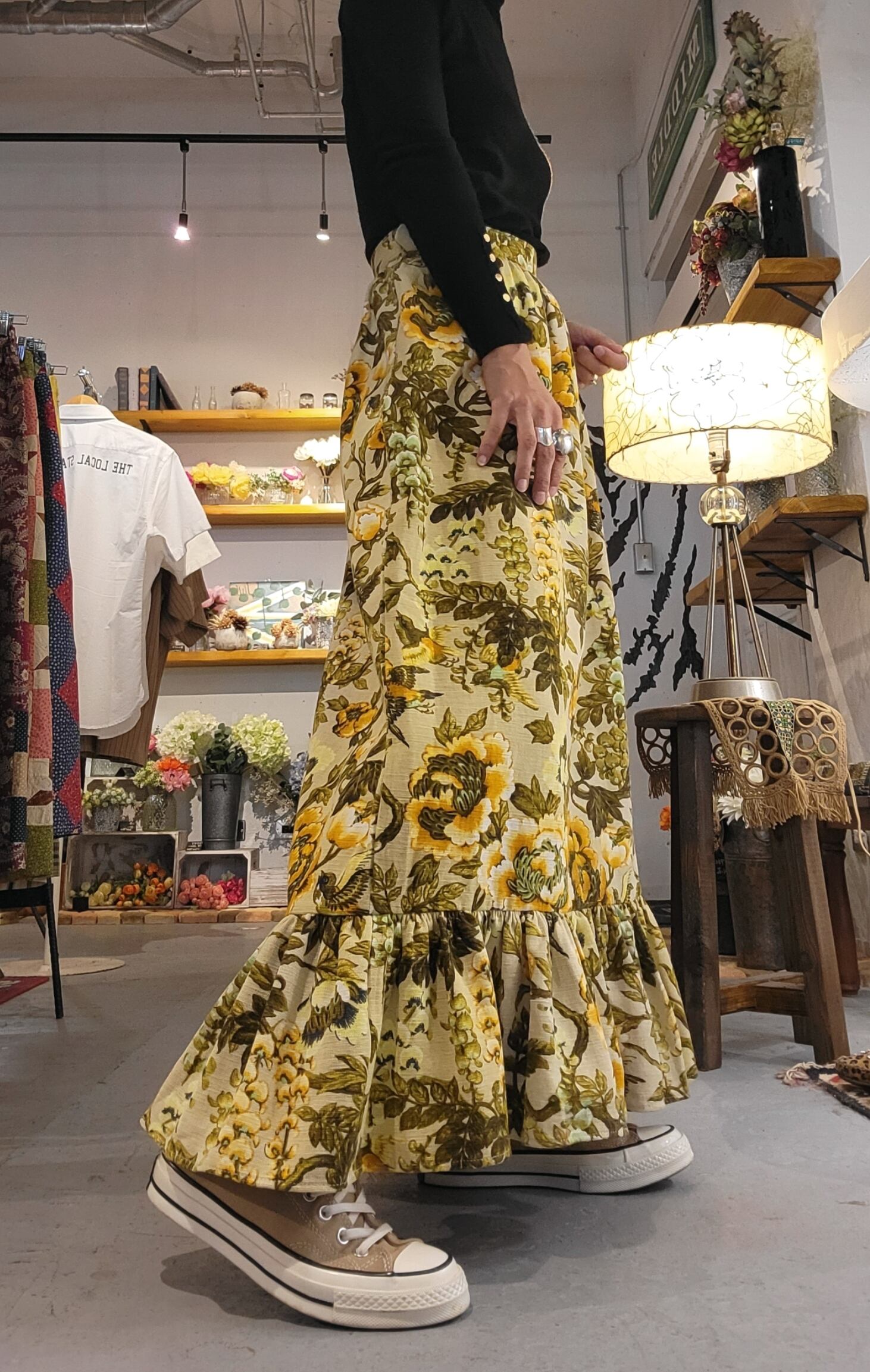 美しいプリントが魅力のヴィンテージマキシスカート。素材表記はありませんがコットンです。伸縮性はありません。ウエスト左サイドにホックとファスナー付き。子供っぽくならない色合いと柄でシンプルなトップスに良く映えます。