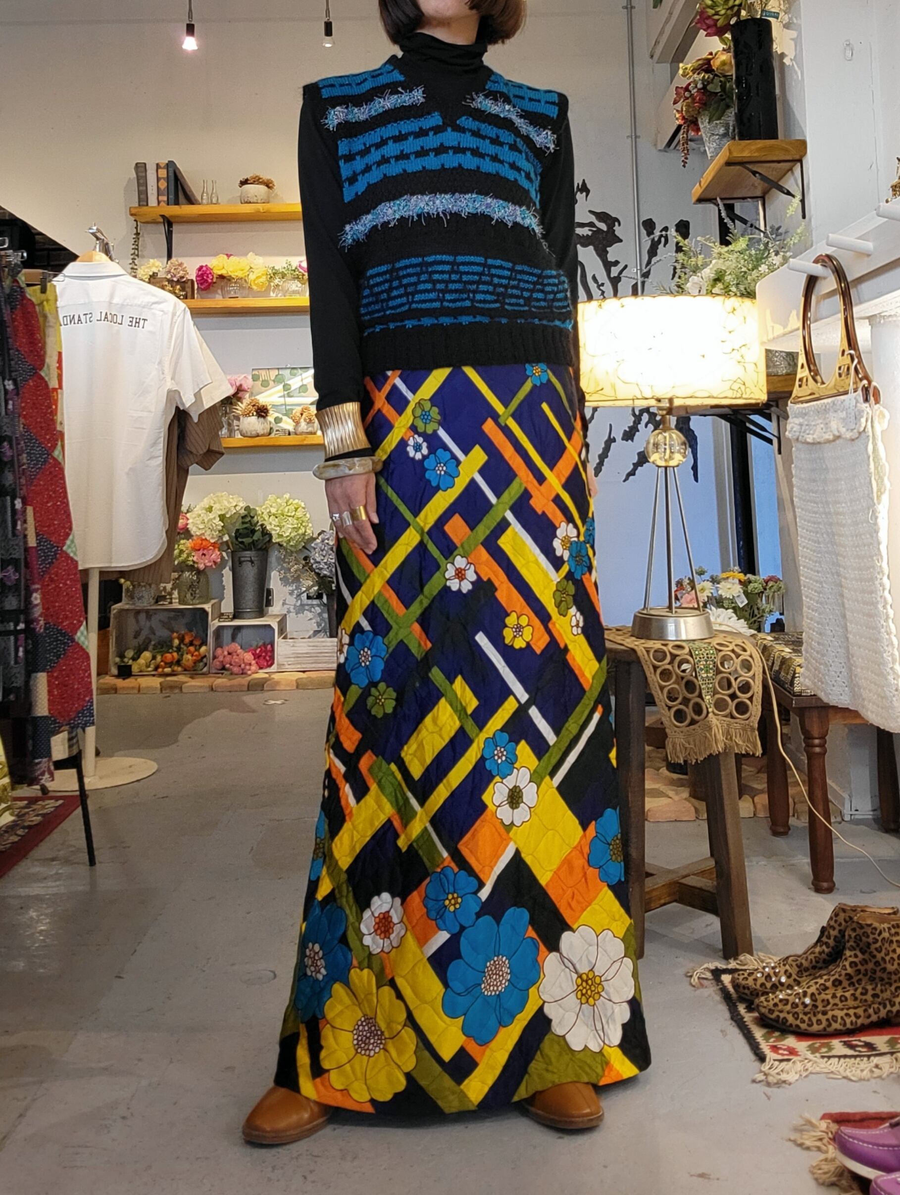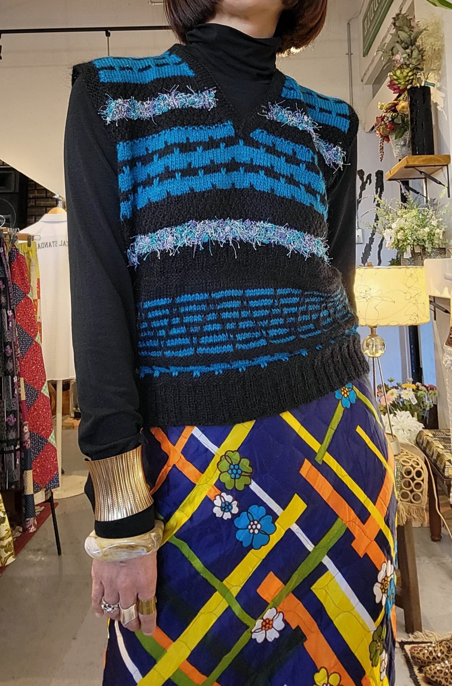 イタリア製のヴィンテージニットベスト。ハンドメイドのようです。素材表記はありませんが肌触り柔らかなニットです。異なる素材のミックスニットのボーダーが個性的。鮮やかなブルーが冬の装いの差し色にぴったりです。
