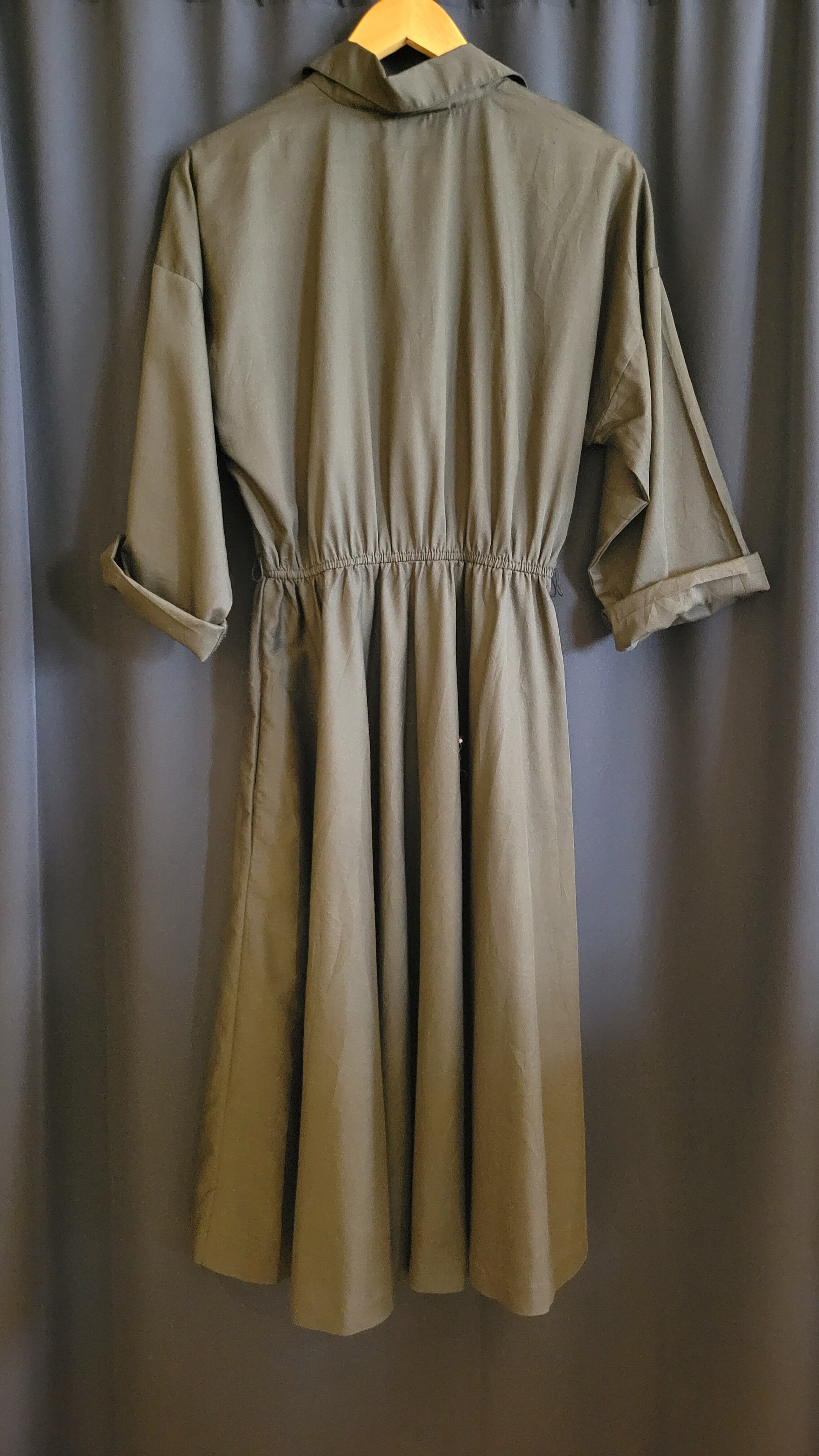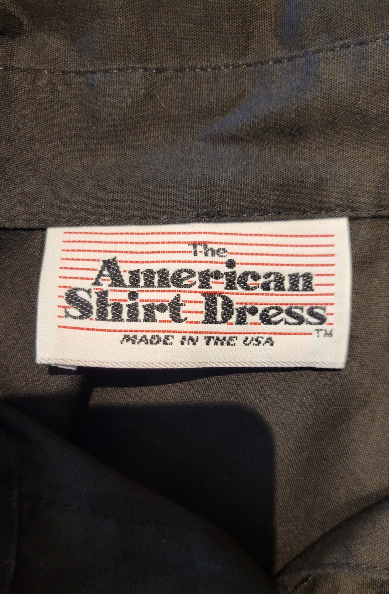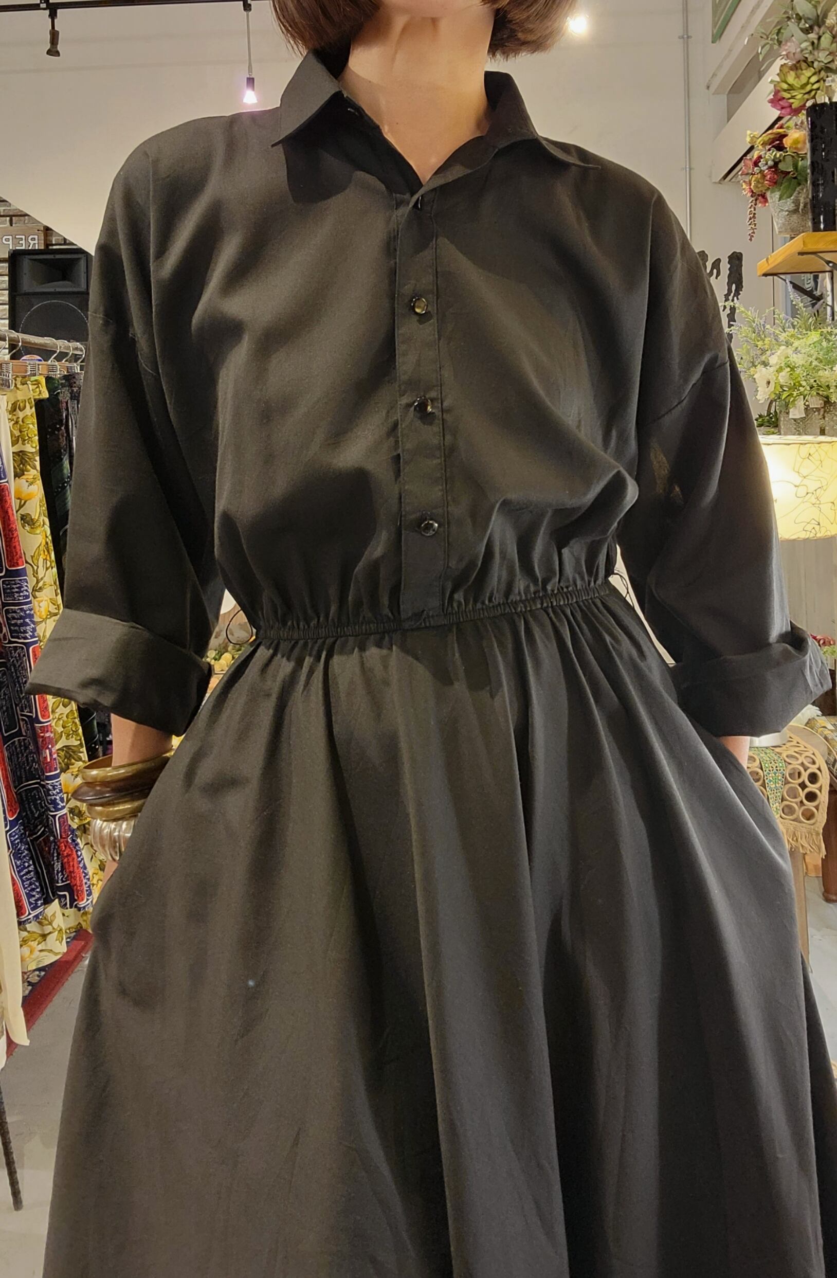 Made in USAのヴィンテージシャツワンピース。素材はポリエステル65% コットン35% です。シンプルながらもたっぷりの生地を使用したフレアシルエットが美しく際立ちます。ドルマンスリーブのため身幅がたっぷりあり、太目の袖とウエストゴムで窮屈さを感じないストレスフリーなワンピースです。インナーにニットを重ね袖をロールアップして手首周りのレイヤードを楽しめます。