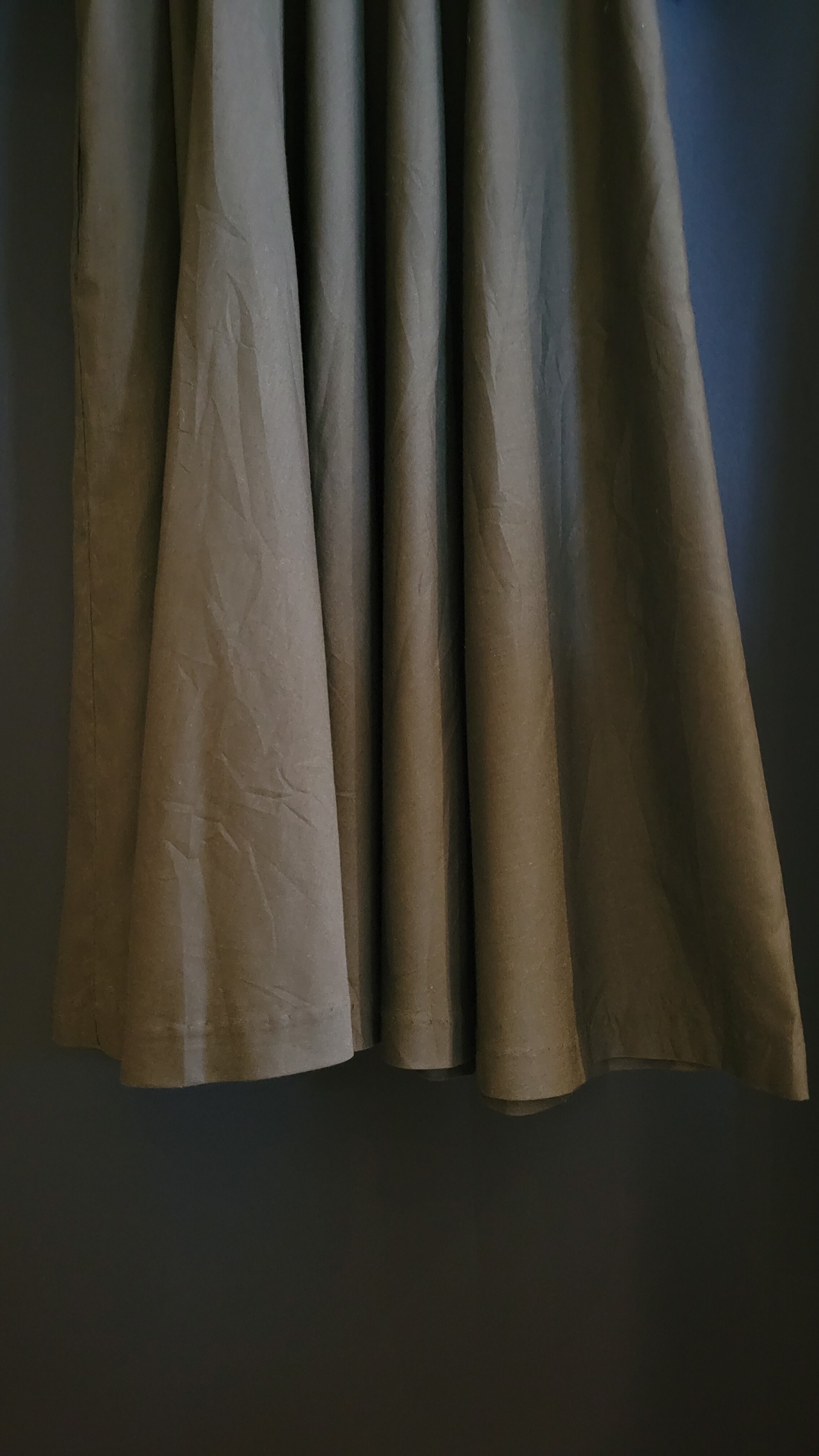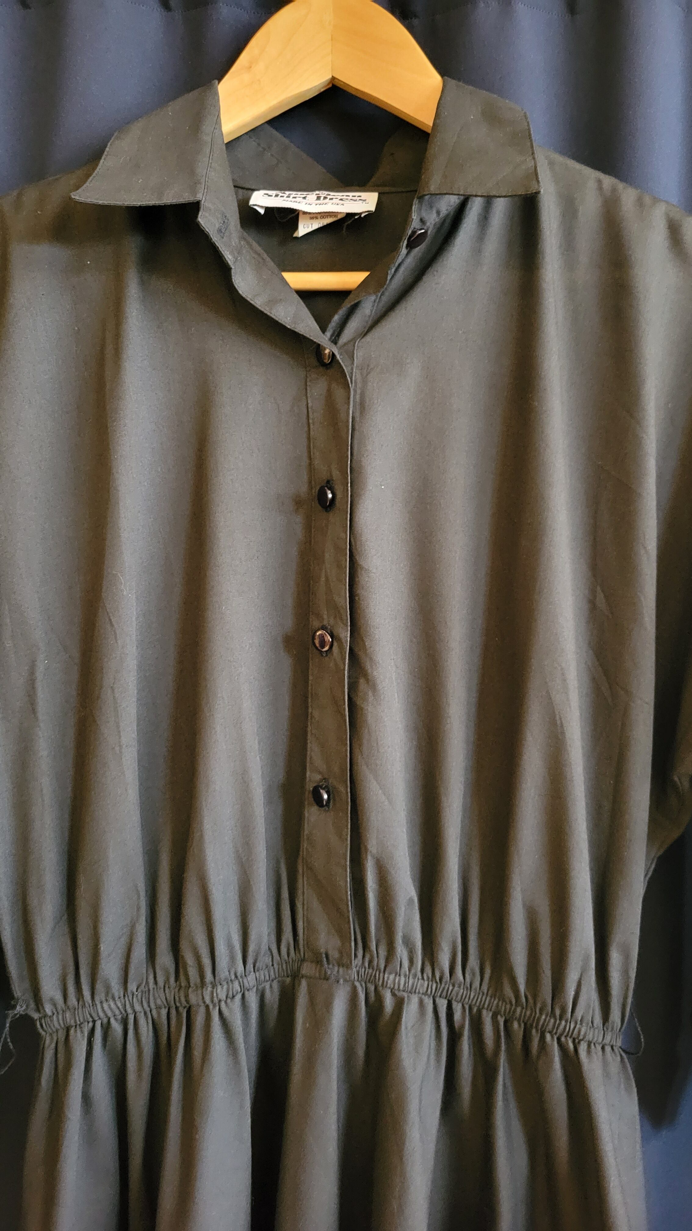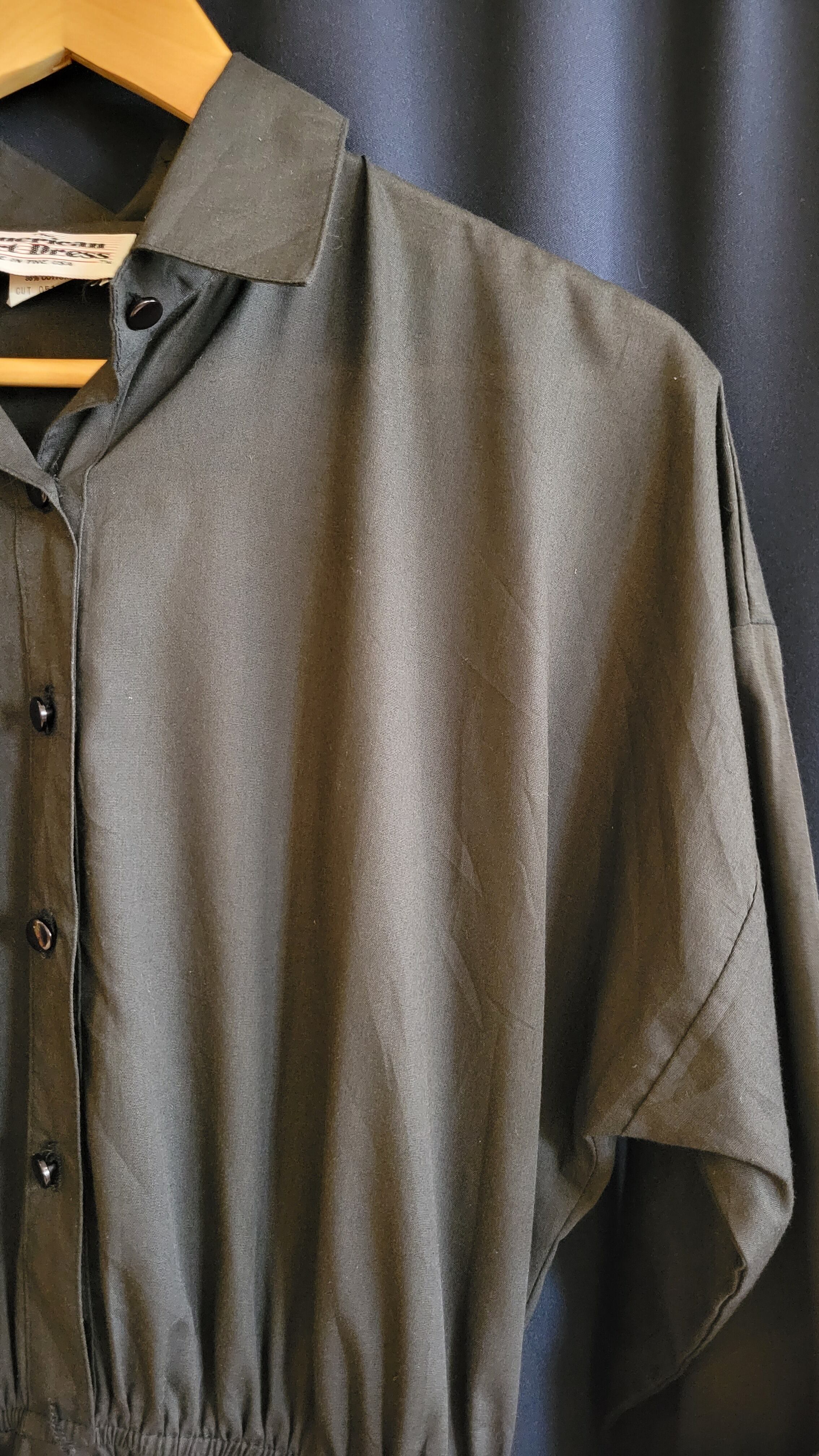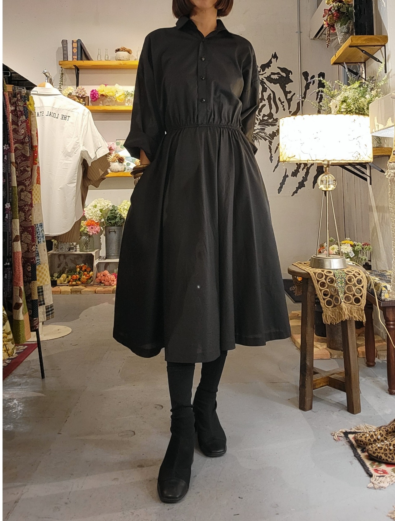 Made in USAのヴィンテージシャツワンピース。素材はポリエステル65% コットン35% です。シンプルながらもたっぷりの生地を使用したフレアシルエットが美しく際立ちます。ドルマンスリーブのため身幅がたっぷりあり、太目の袖とウエストゴムで窮屈さを感じないストレスフリーなワンピースです。インナーにニットを重ね袖をロールアップして手首周りのレイヤードを楽しめます。