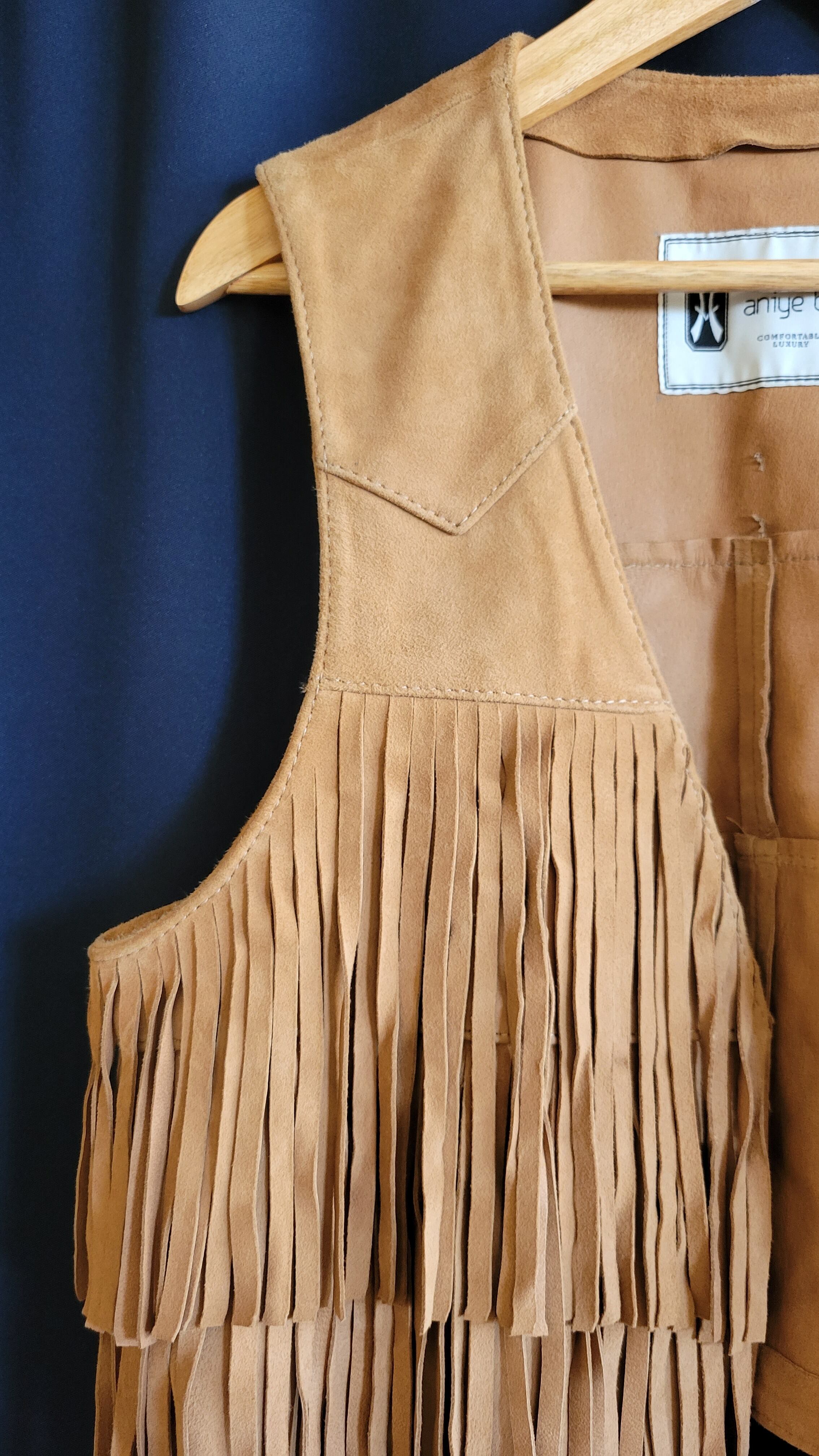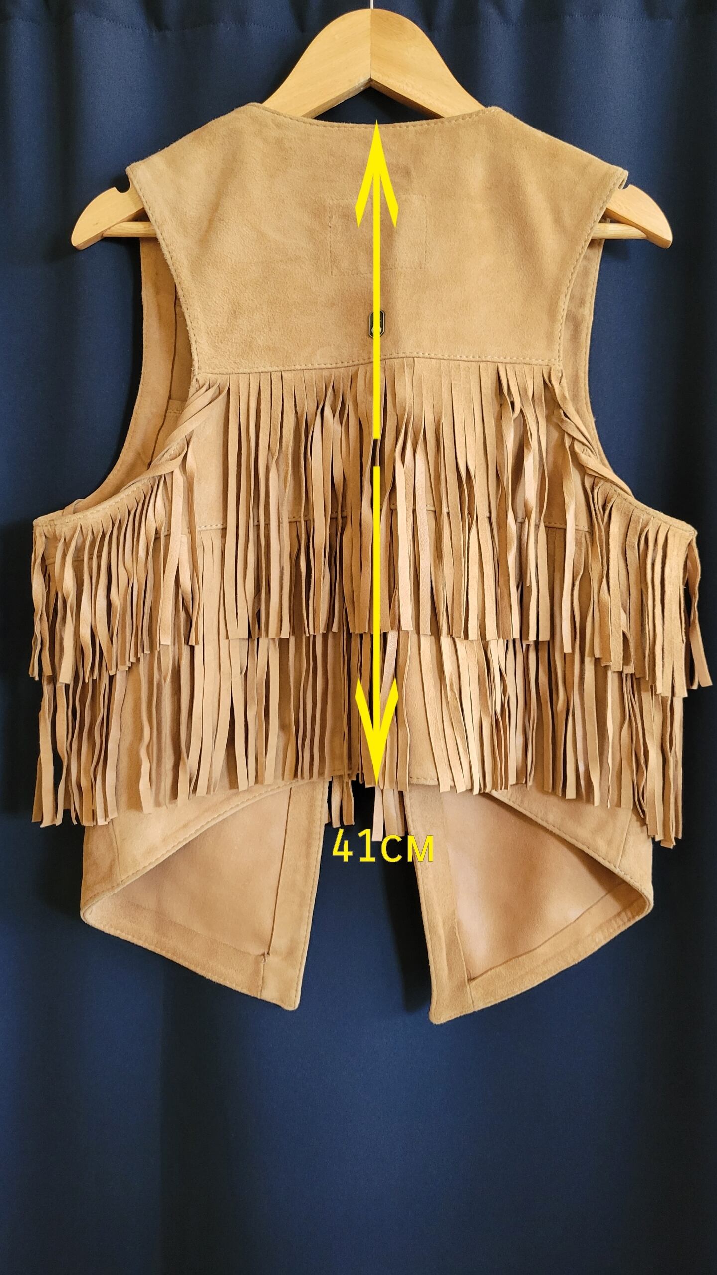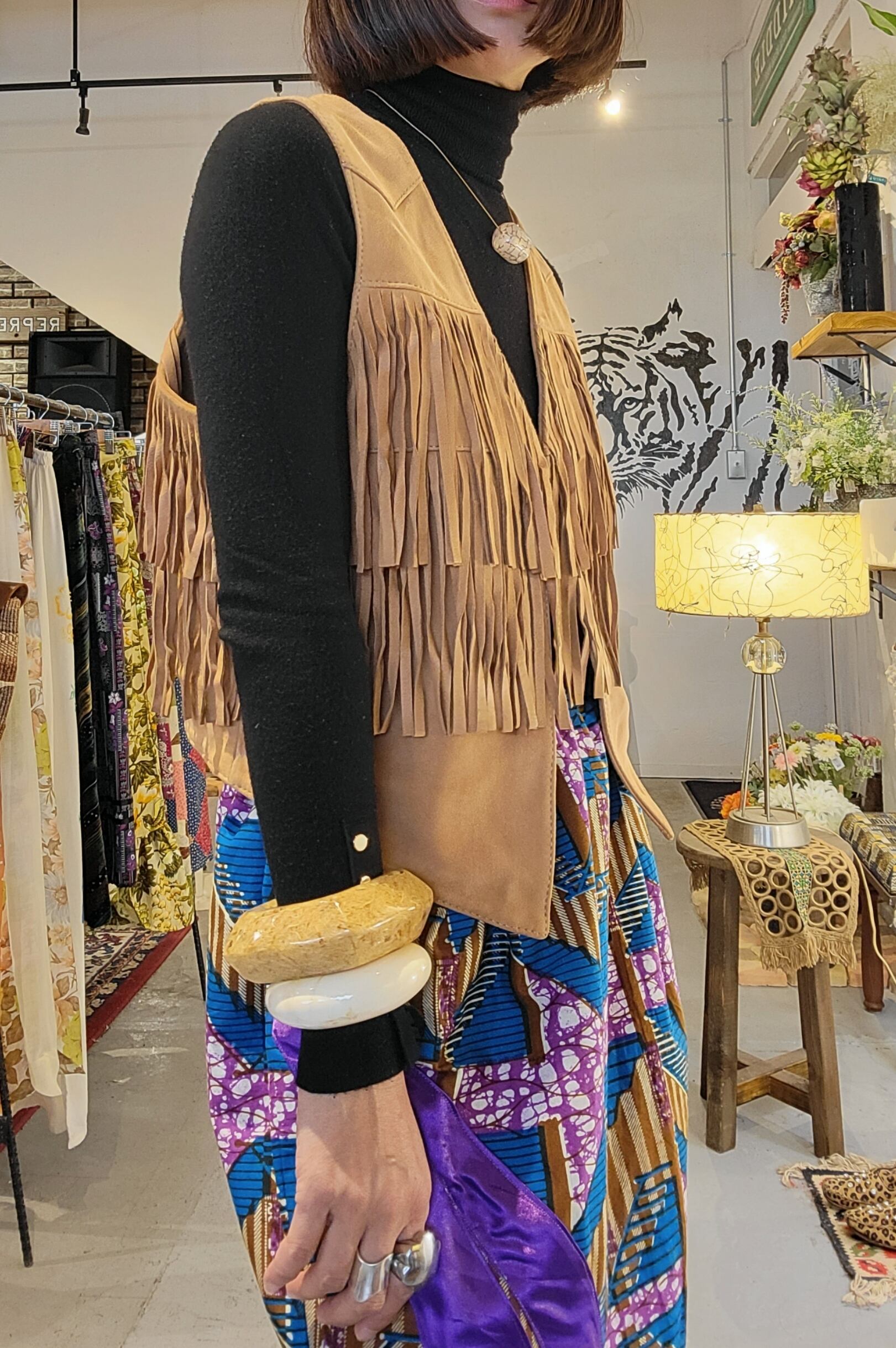 Made in Italy のヴィンテージスウェードフリンジベスト。素材表記はありませんが柔らく滑らかなスウェード素材です。シンプルなスタイリングにプラスして気軽にフォークロアな雰囲気を楽しめます。コンパクトなサイジングで無骨過ぎず、スカートやワンピースにも良く合います。