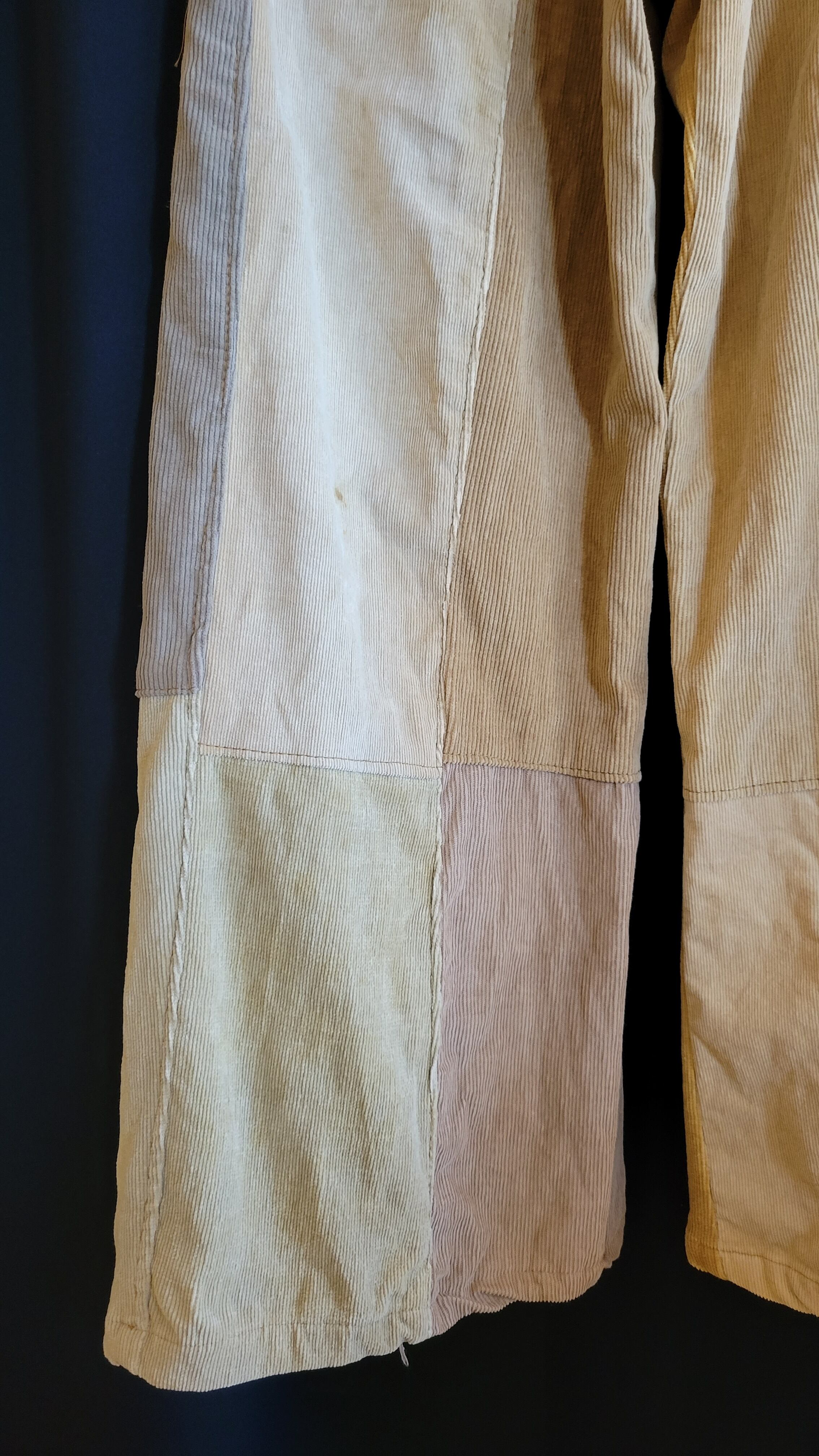 ヴィンテージのコーデュロイ生地を使用したリメイクパッチワークパンツです。フロント2タック、ハイライズ、ワイドシルエット。ひとつひとつサイズやパターン等表情の異なる一点物です。*右膝付近にシミがあります。画像でご確認ください。*着画はイメージです。実際のパンツとはパターンの出方やサイズに個体差があります。下記の実寸サイズをご参照ください。