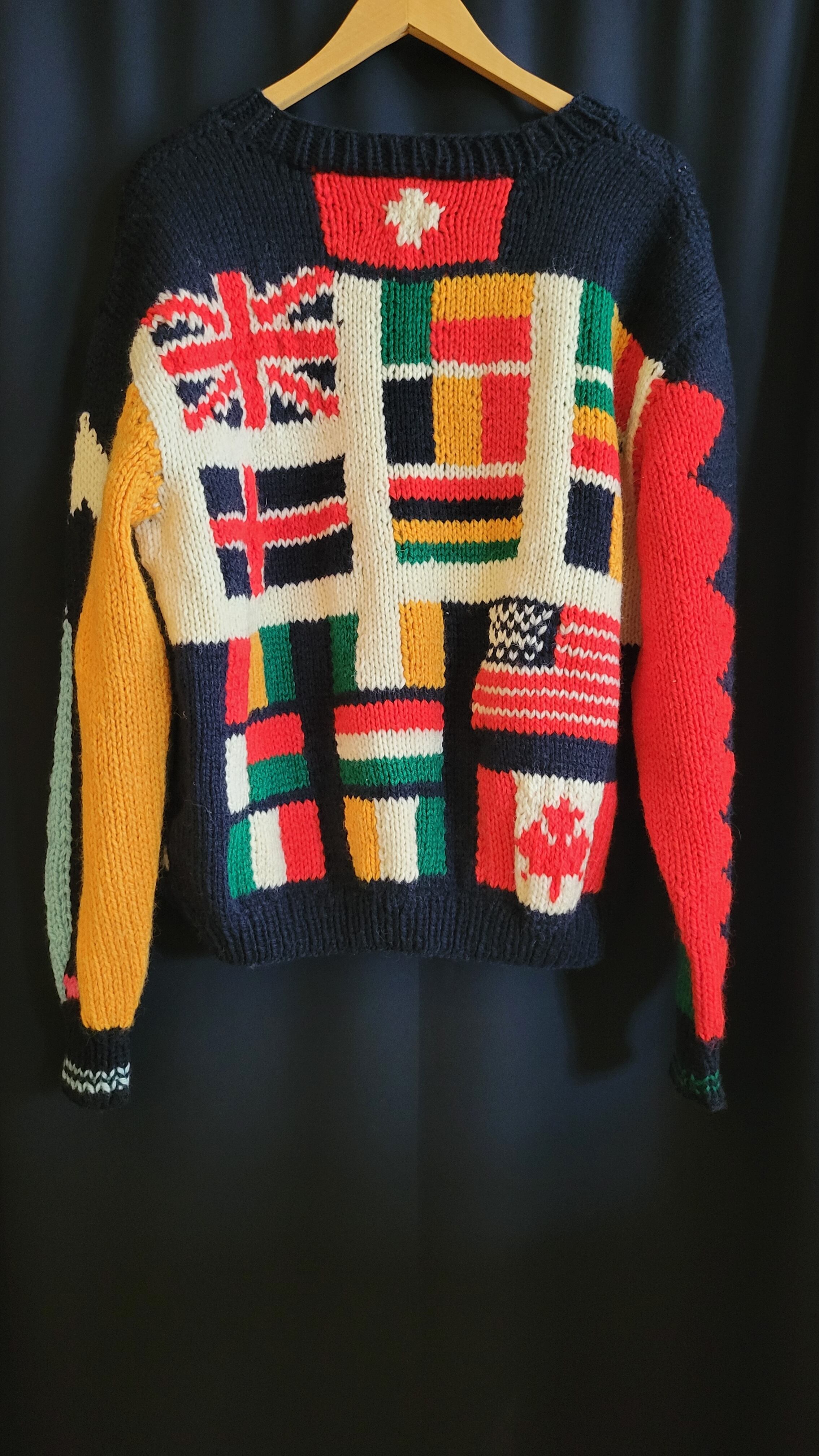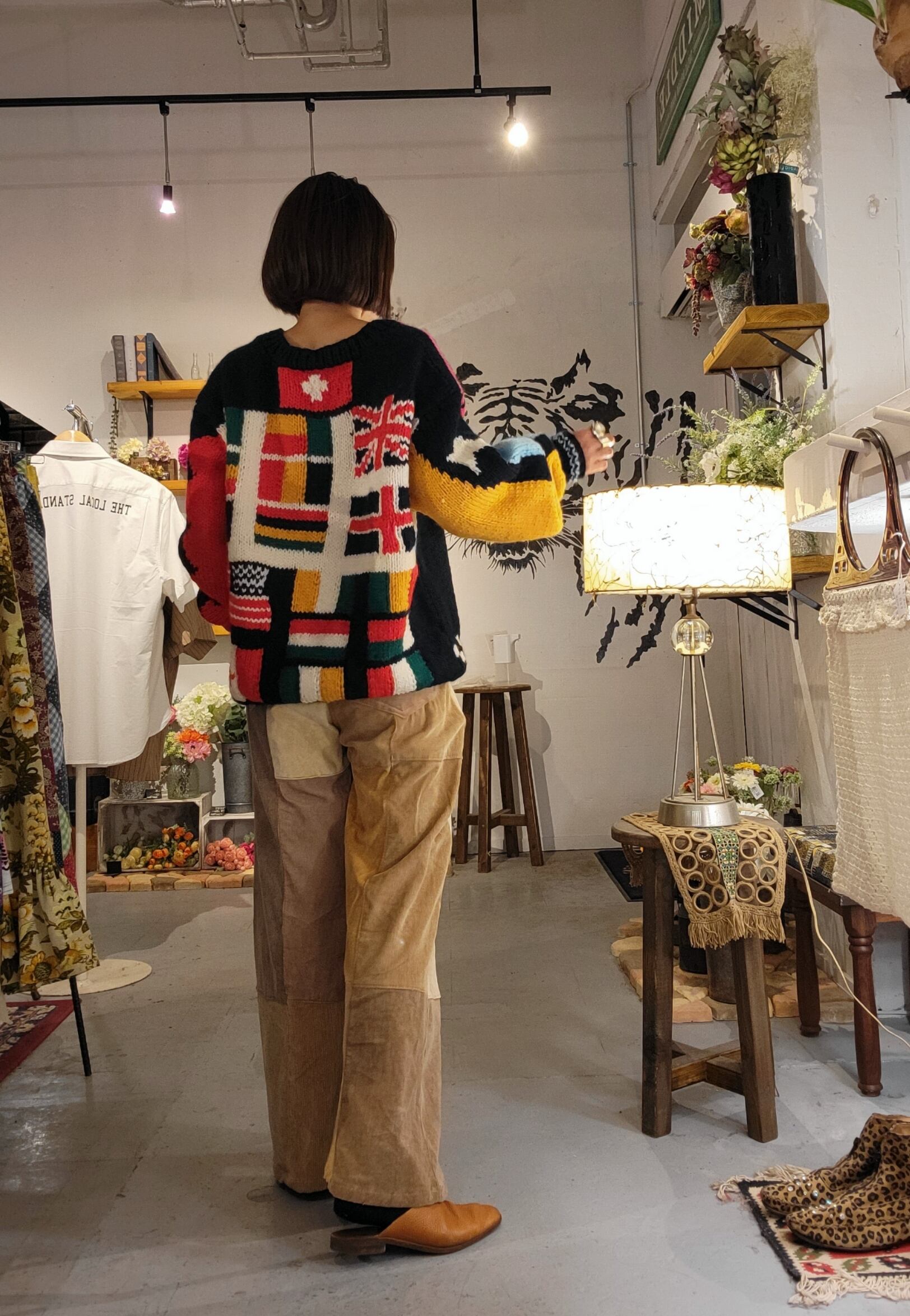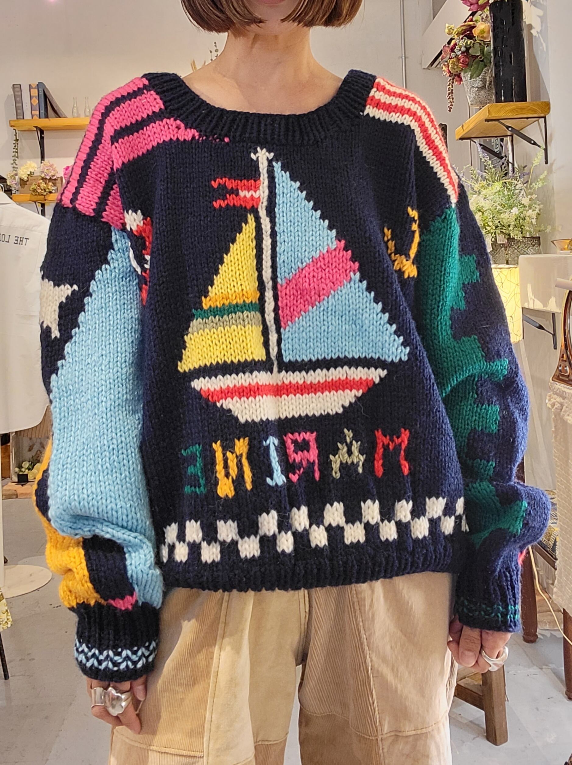 ヴィンテージの手編みのセーター。素材表記はありません。軽くふんわりとしたニットです。ネイビーのベースカラーにカラフルな配色が映え、360度どこから見ても可愛い柄がびっしり編まれています。ゆったりしたサイズ感は細身の男性にもおすすめ。