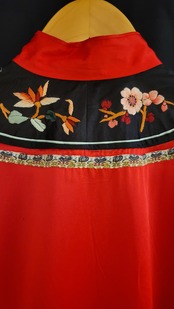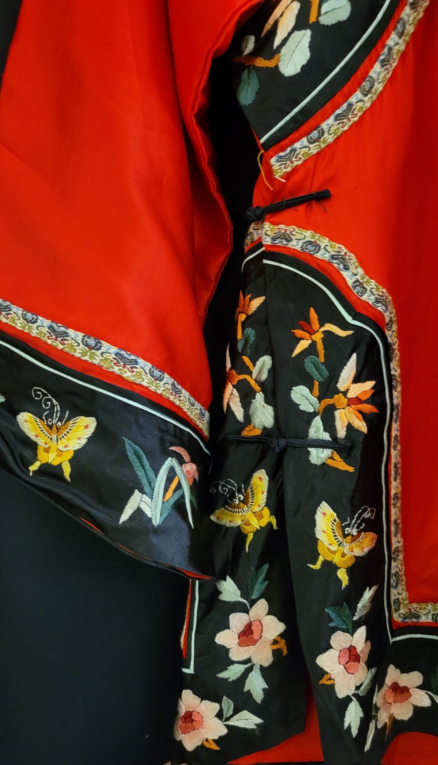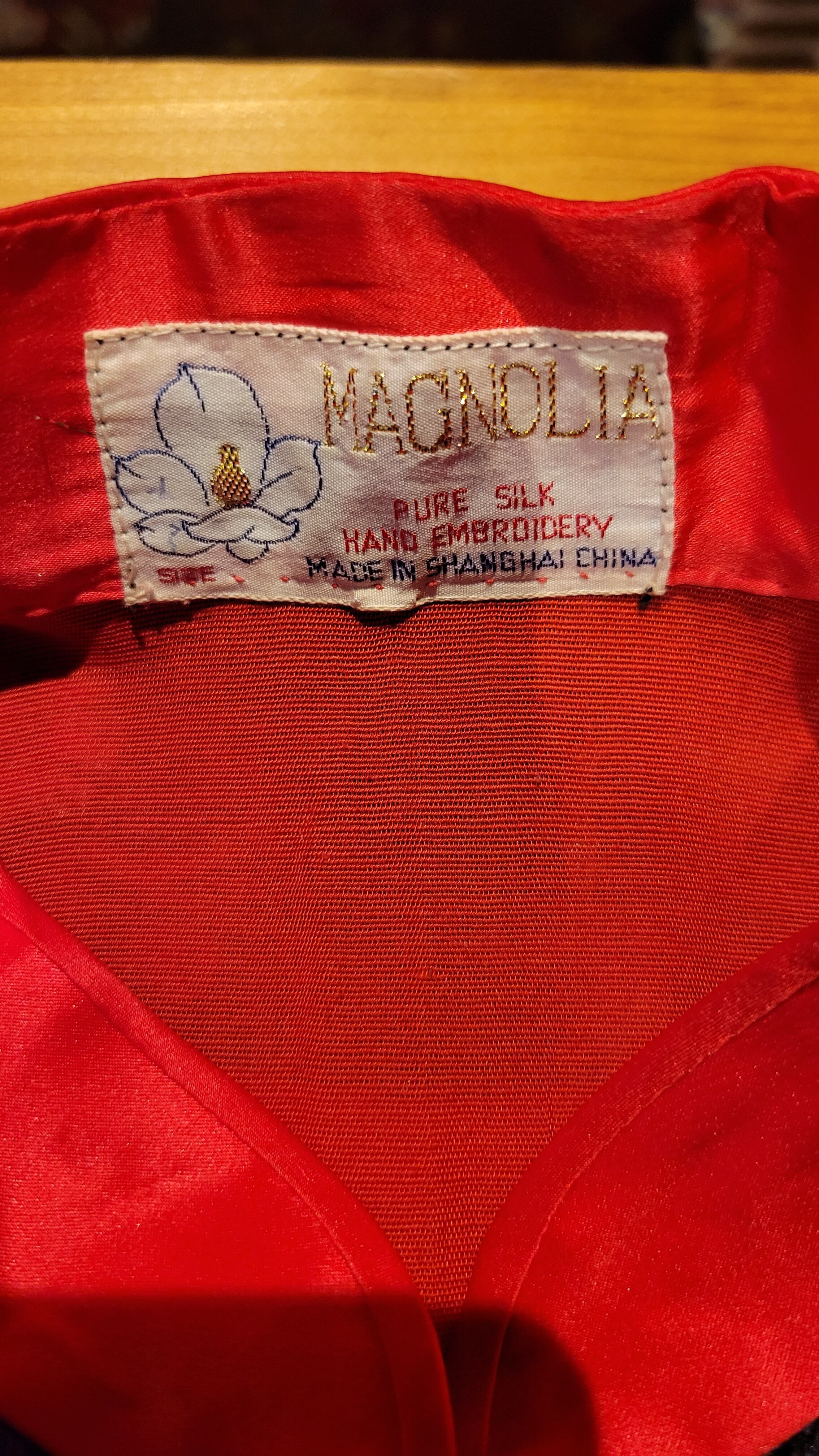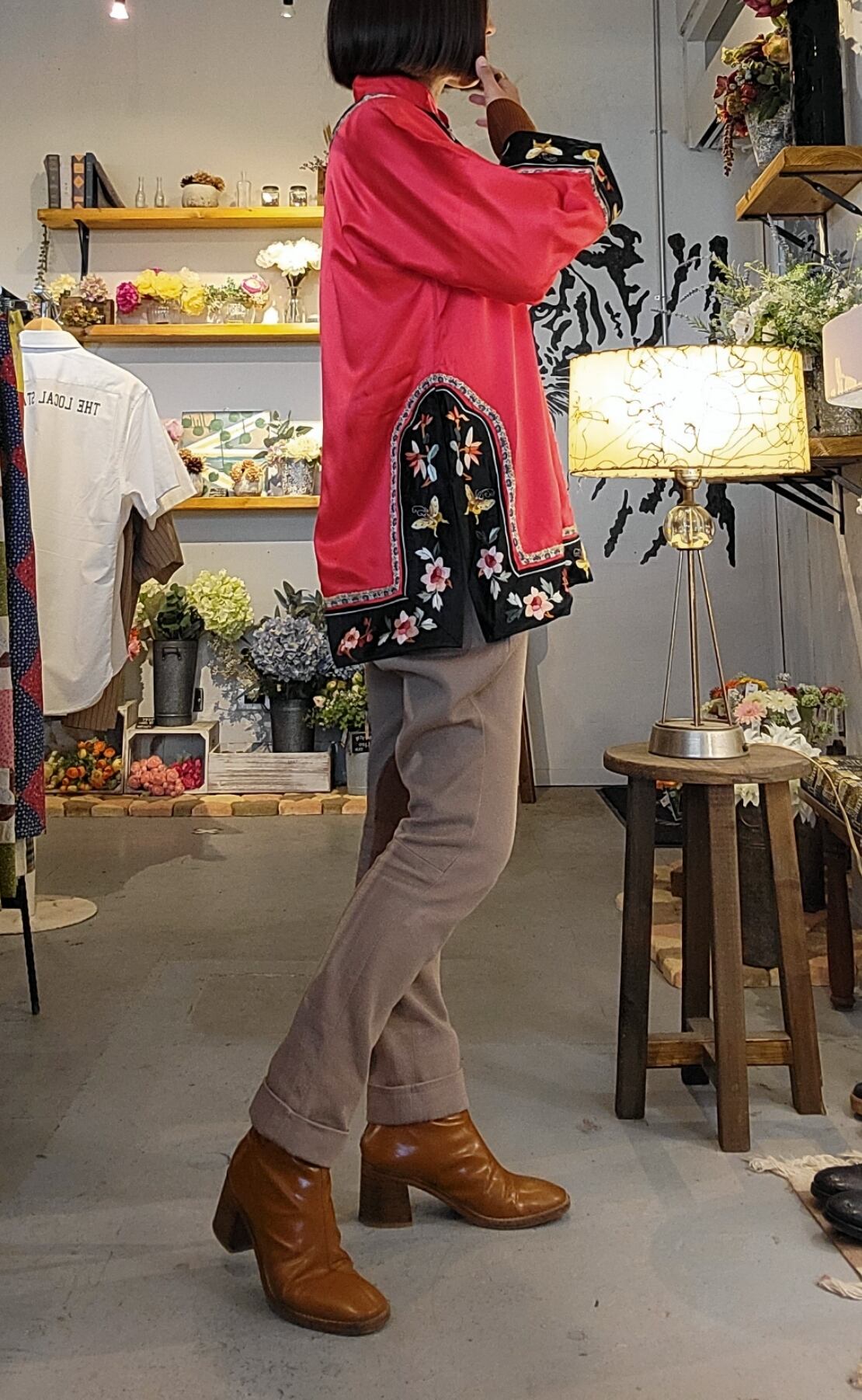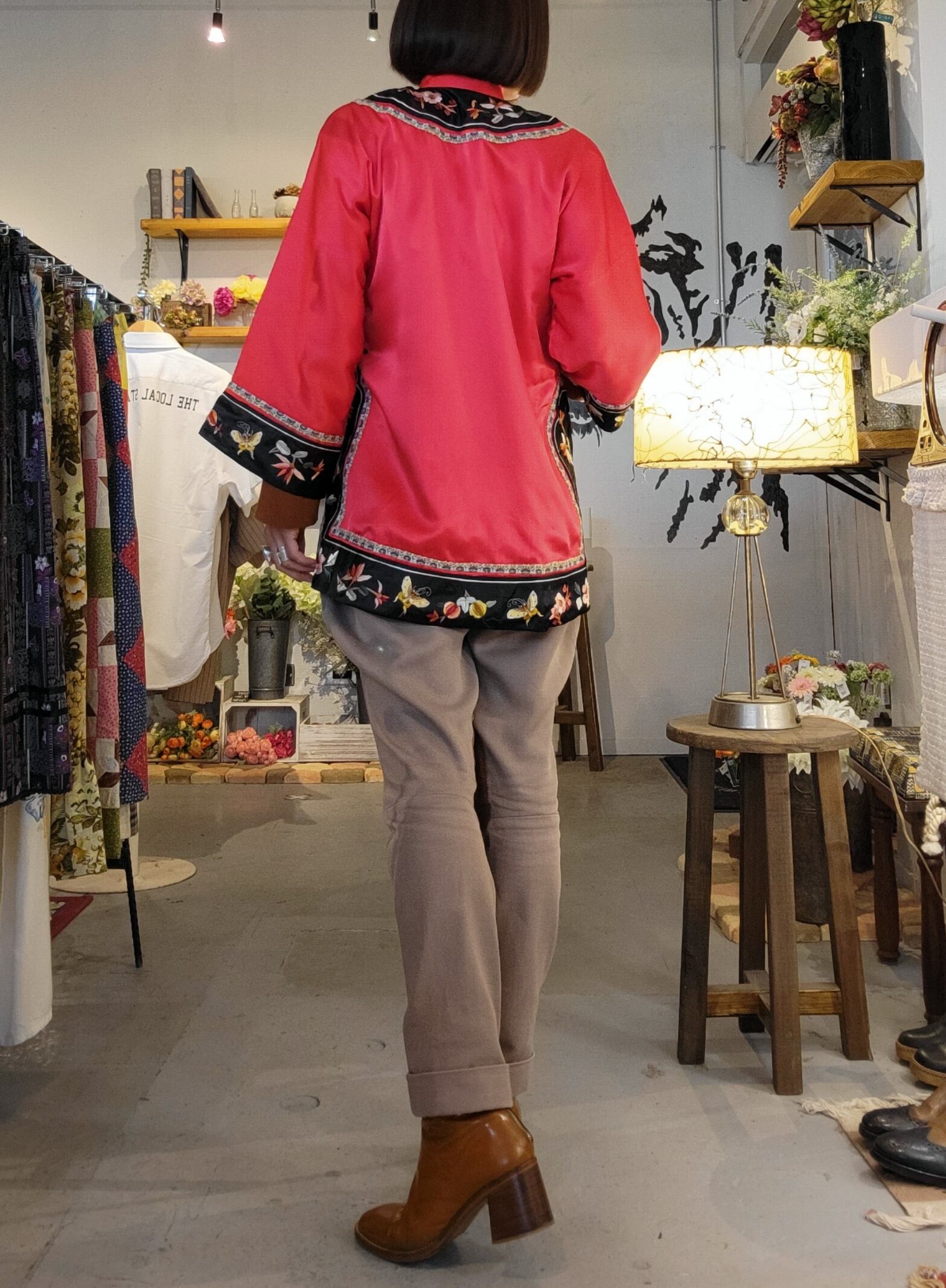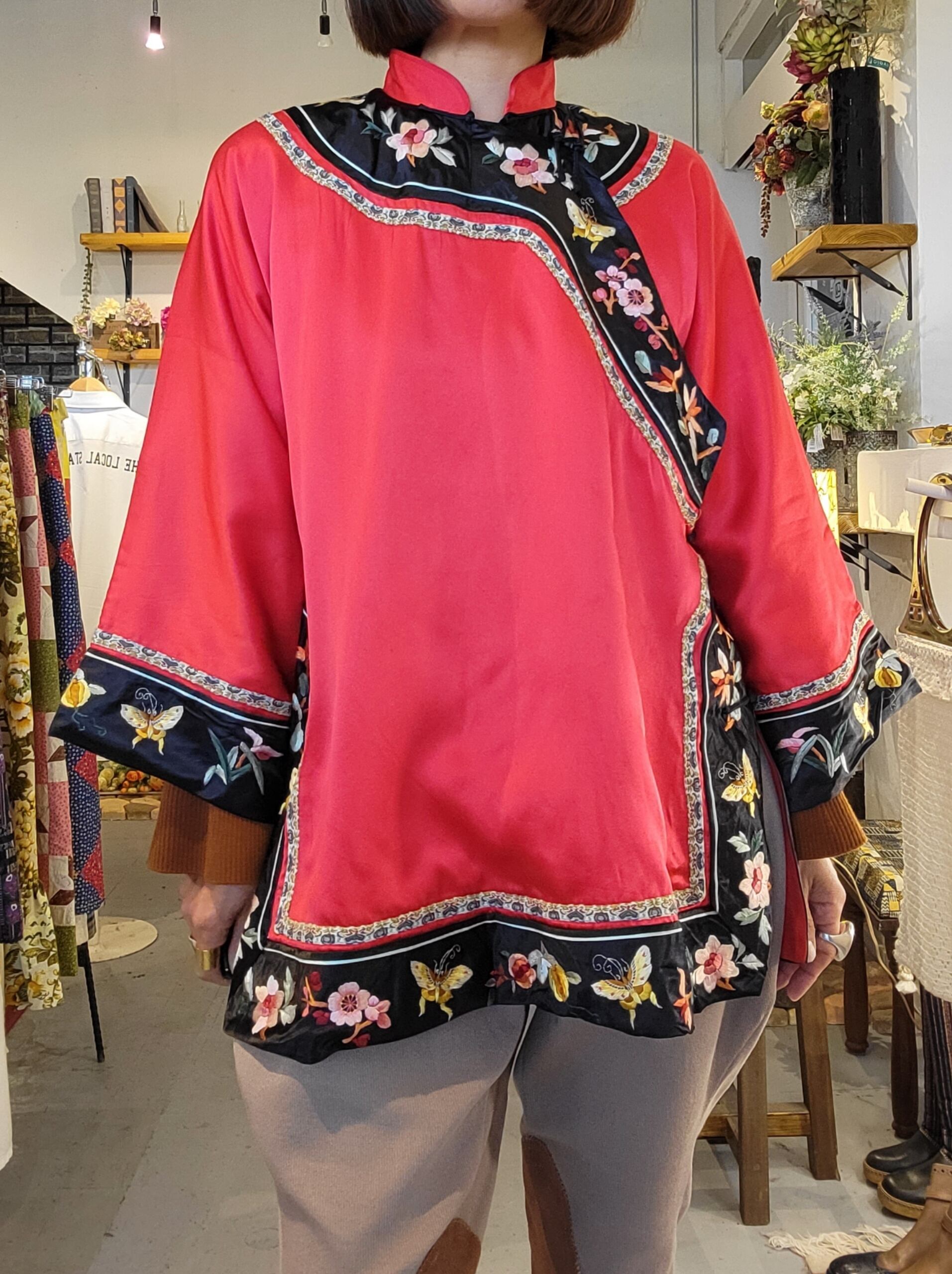 ヴィンテージのシルク刺繍チャイナトップス。素材はシルク100%、全て手刺繍です。フロントを合わせて右サイドのチャイナボタンで留めるタイプです。*右脇下のボタンがひとつ取れて無い状態です。着用に支障はありません。*後ろ身頃左裾付近に小さな黒いシミがあります。画像でご確認ください。ヴィンテージに慣れていらっしゃる方、ご理解のある方へおすすめいたします。