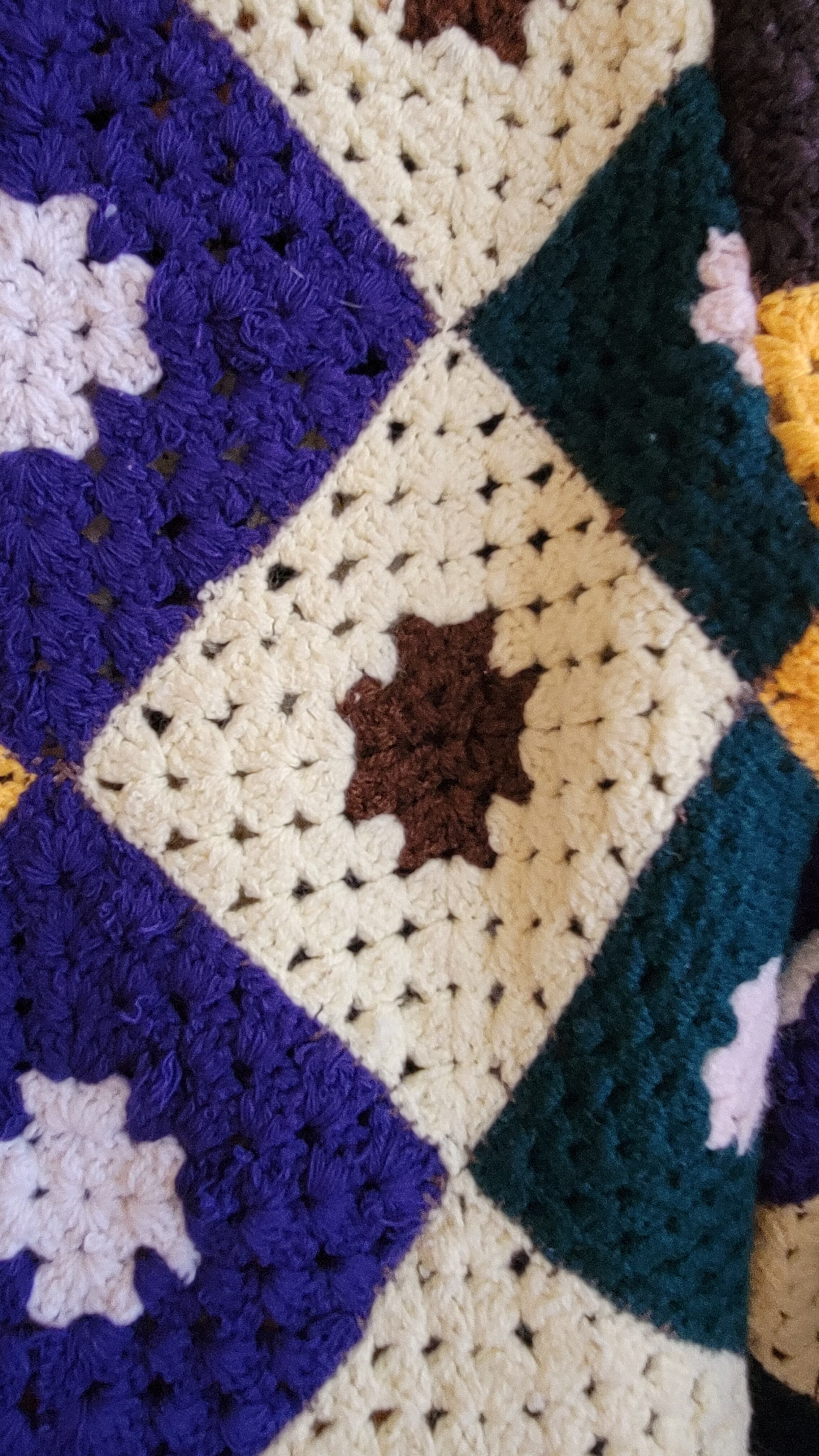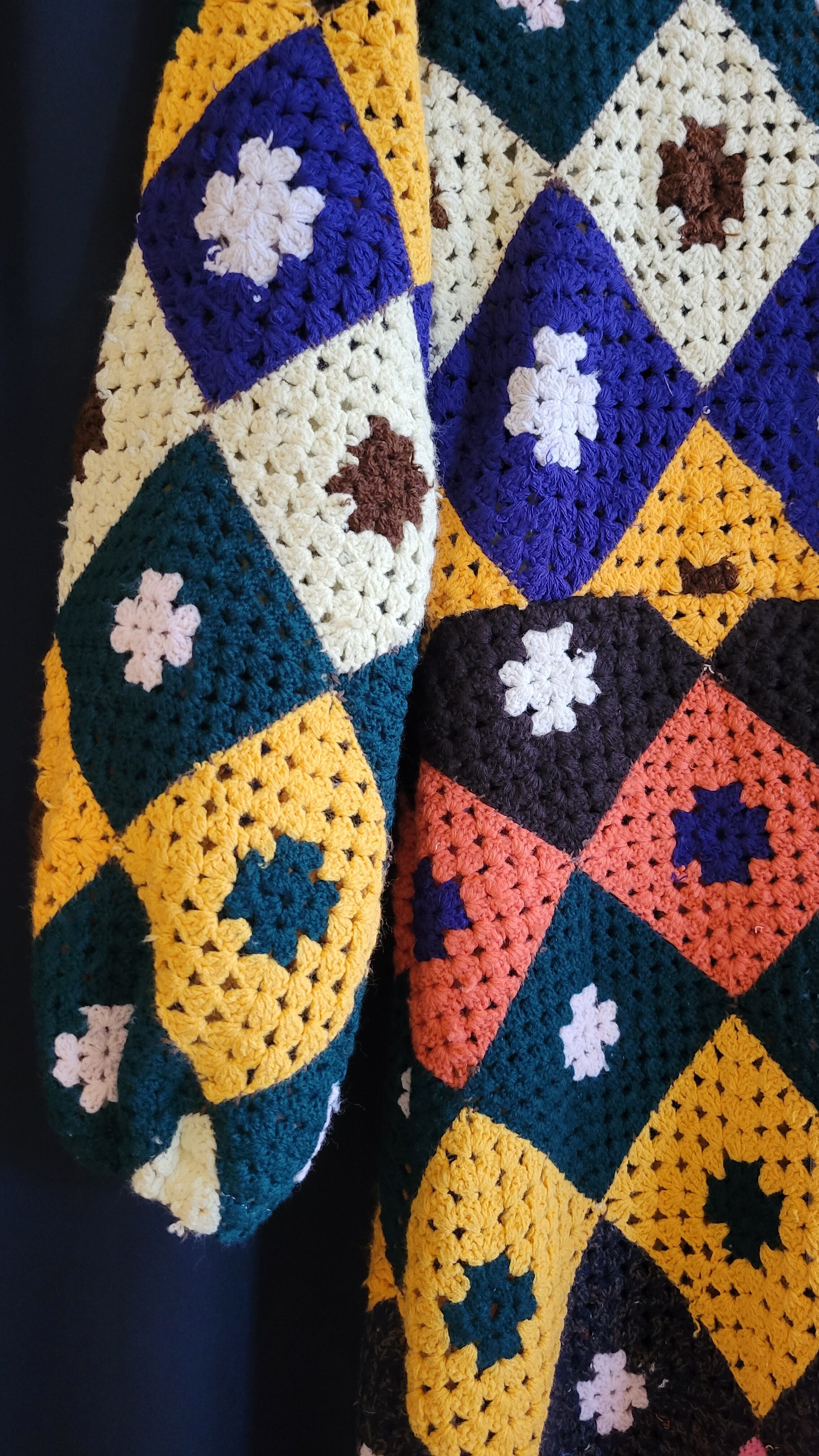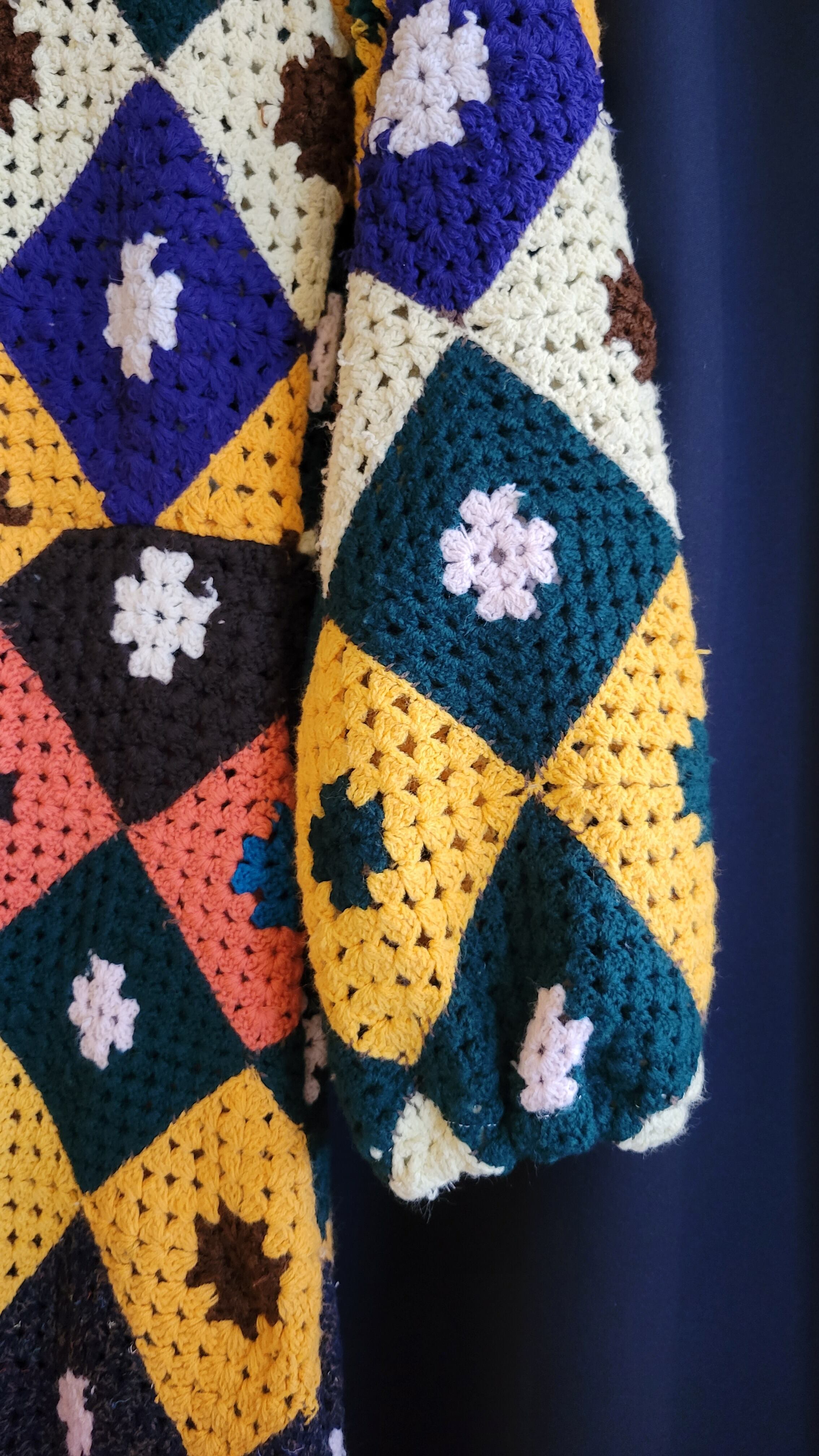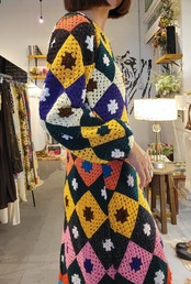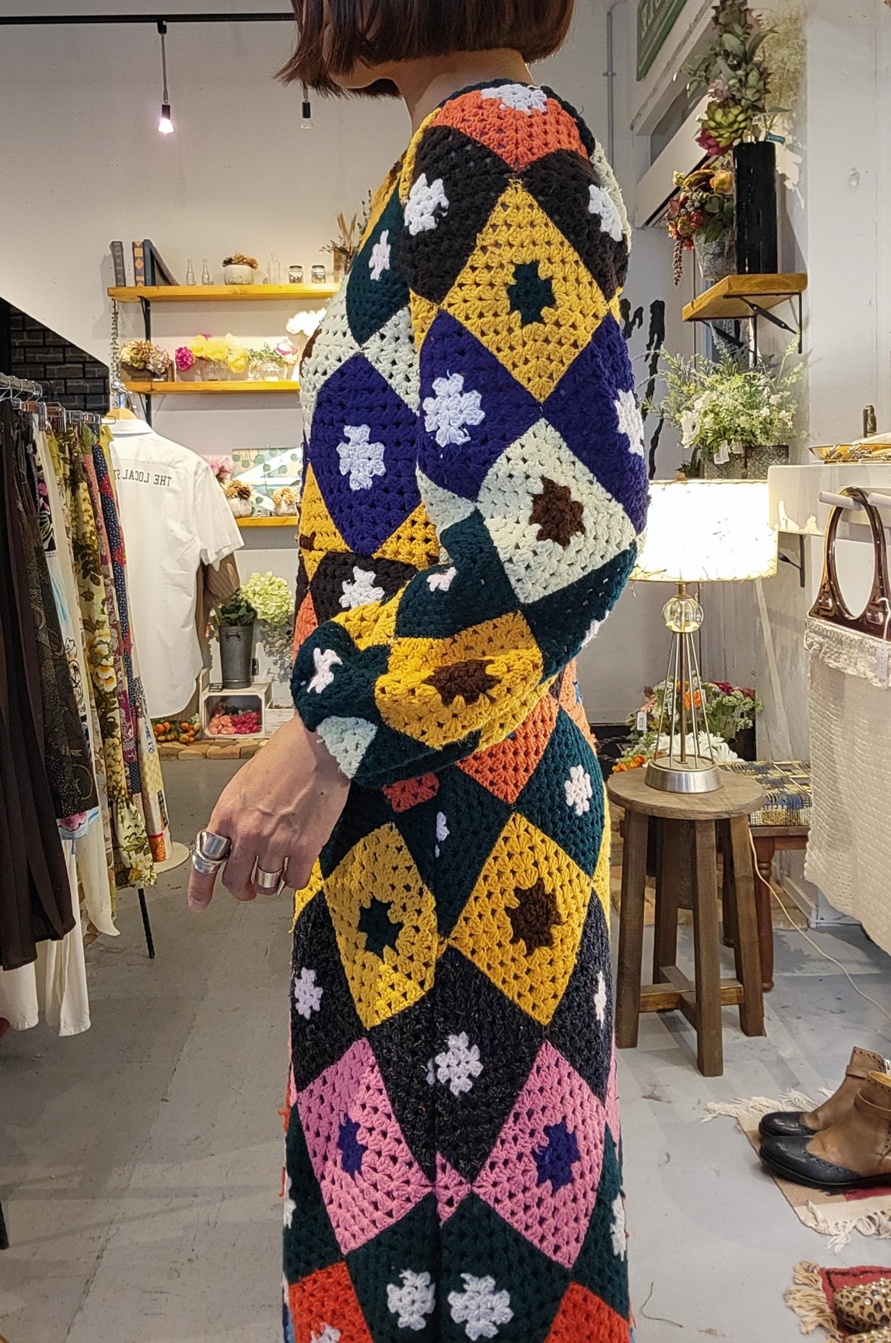 ヴィンテージの手編みのグラニーニットをリメイクしたワンピース。ハンドメイドによるリメイクで一点ものです。やや厚手のニットで伸縮性はあまり無く、バックファスナーが付き。素材自体は当時もののため毛玉や編み目のゆるみ等若干の使用感があります。着用に支障のある程度ではありませんが、ヴィンテージ品にご理解のある方へおすすめいたします。