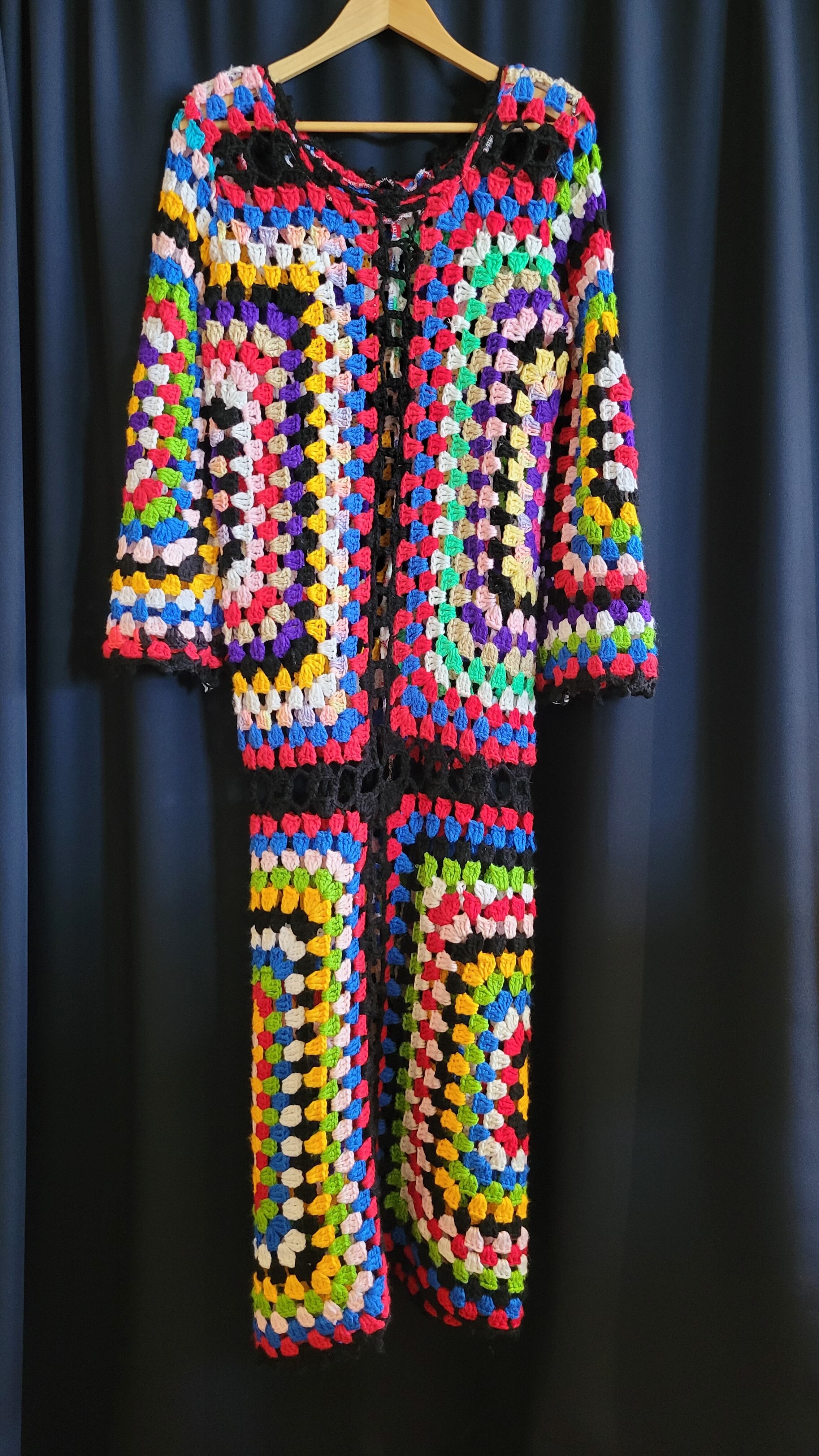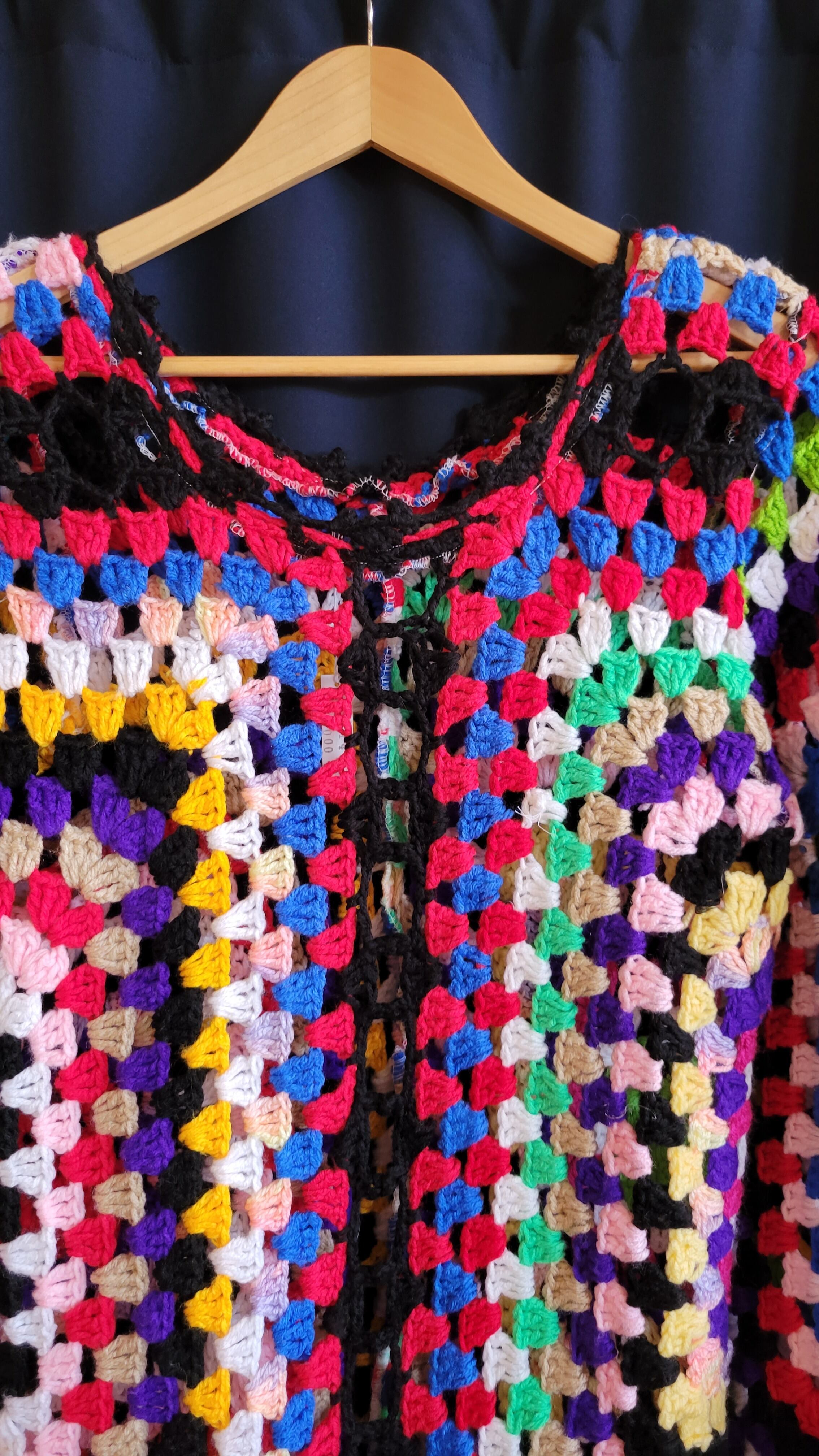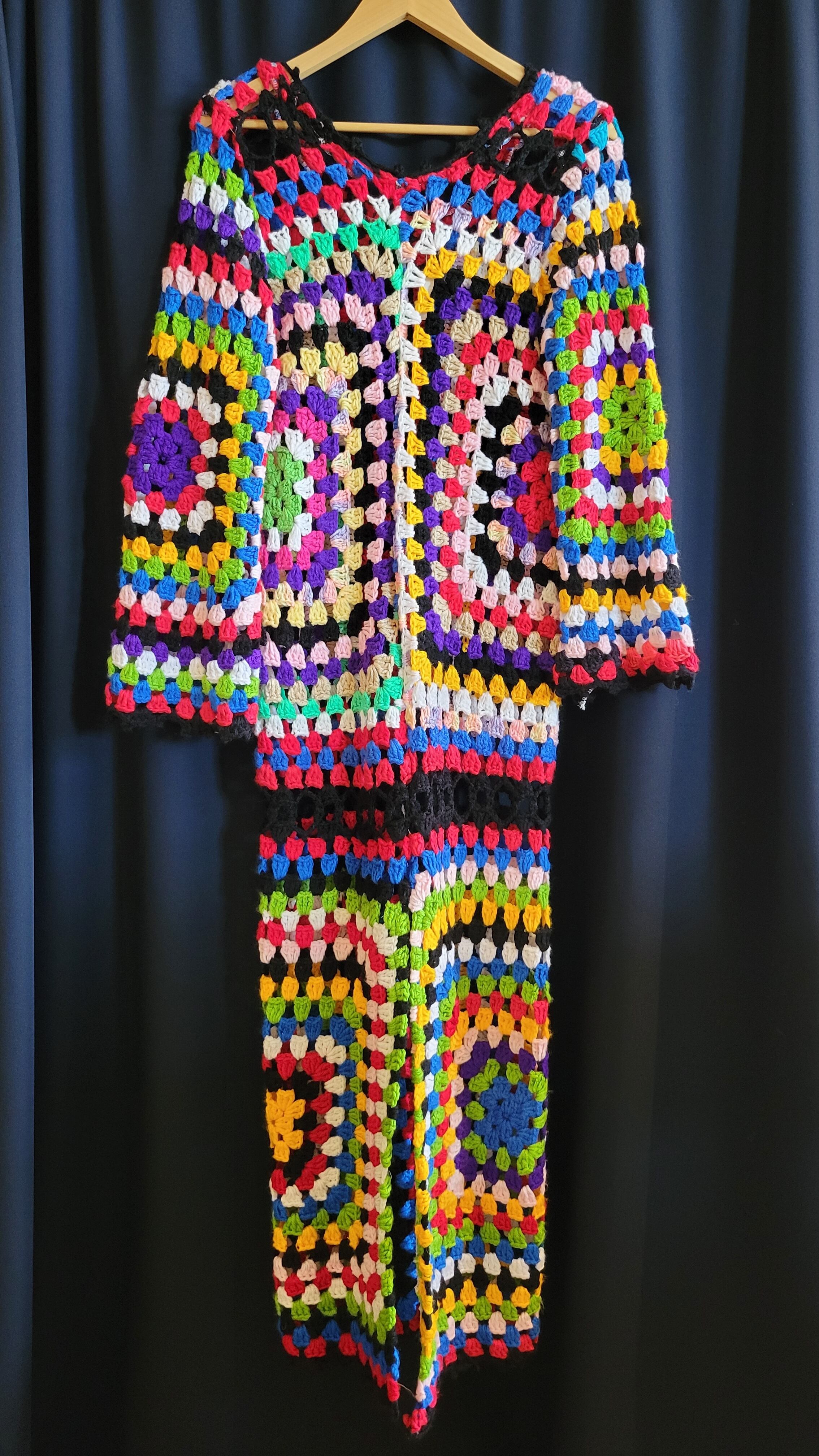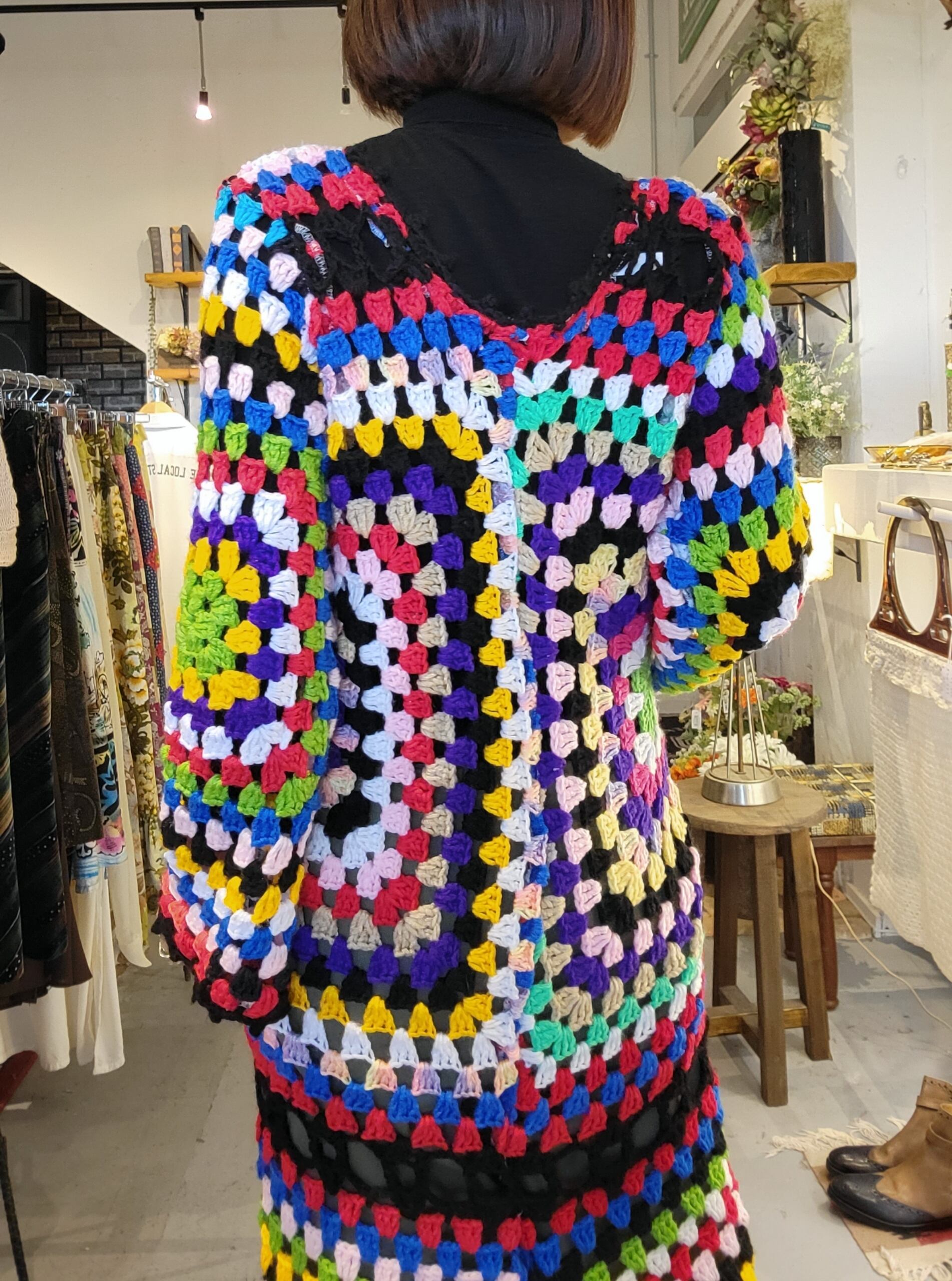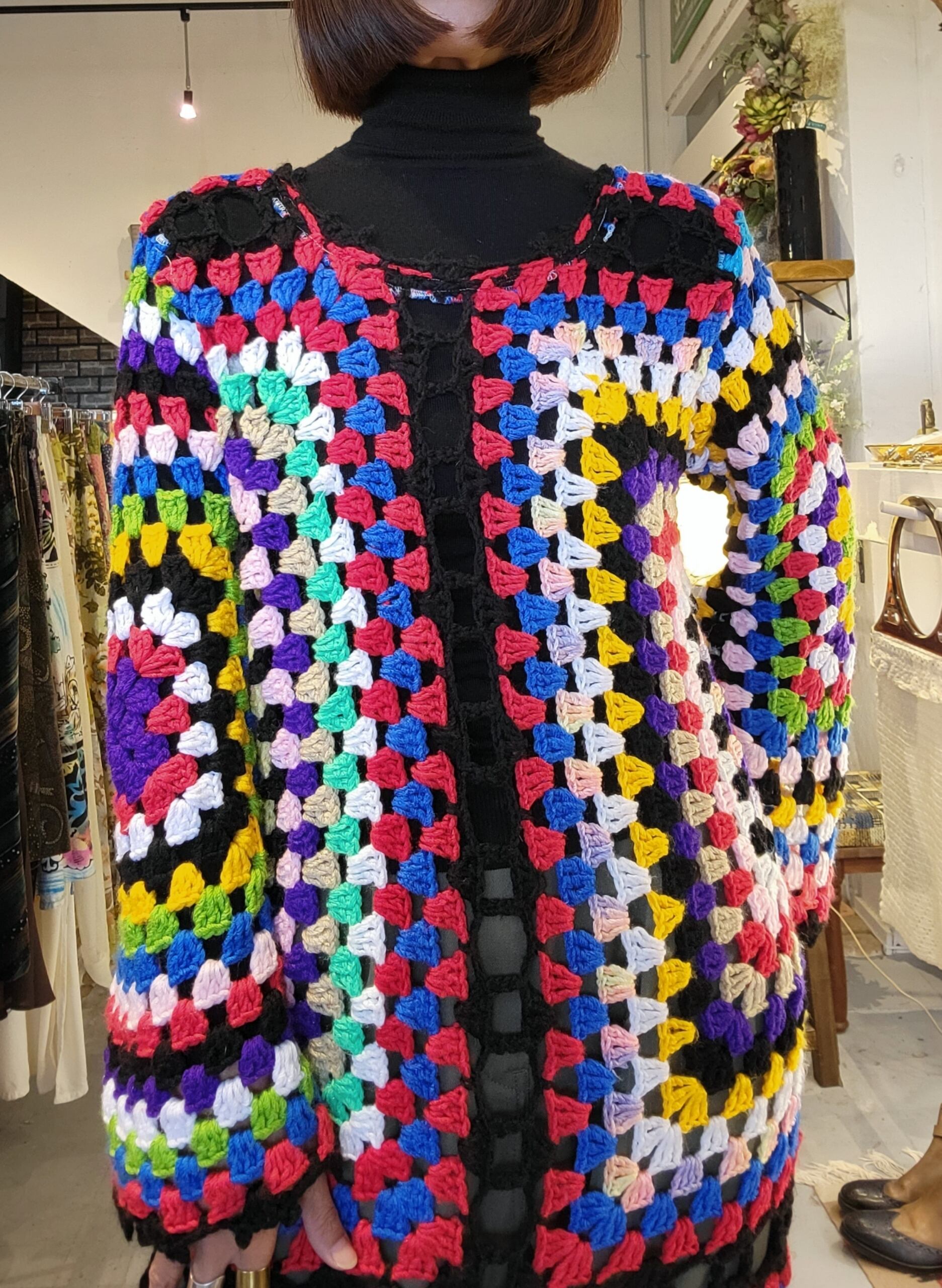 ヴィンテージの手編みのグラニーニットをリメイクしたワンピース。ハンドメイドによるリメイクで一点ものです。軽量で伸縮性があります。素材自体は当時もののため毛玉や編み目のゆるみ等若干の使用感があります。着用に支障のある程度ではありませんが、ヴィンテージ品にご理解のある方へおすすめいたします。