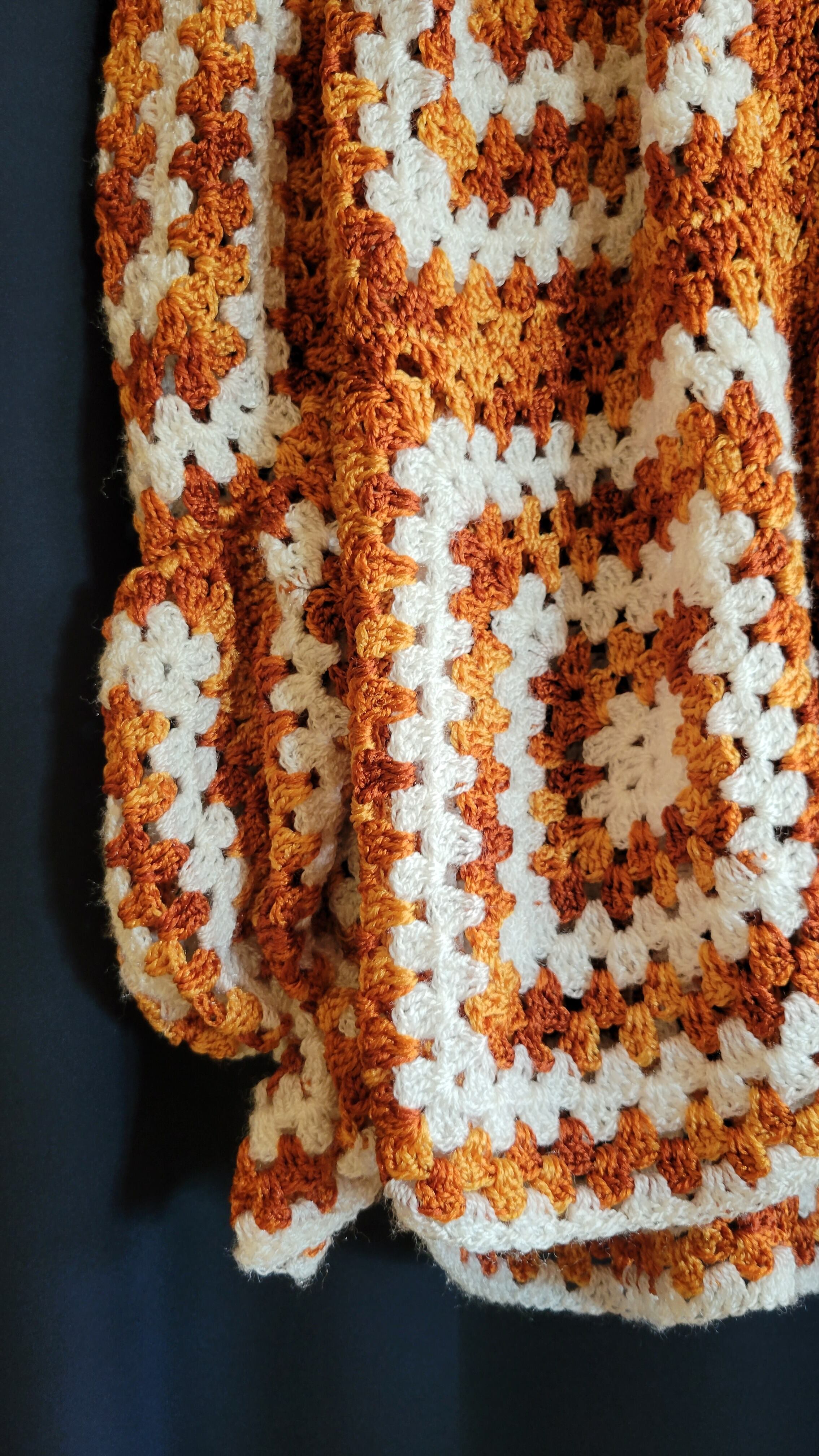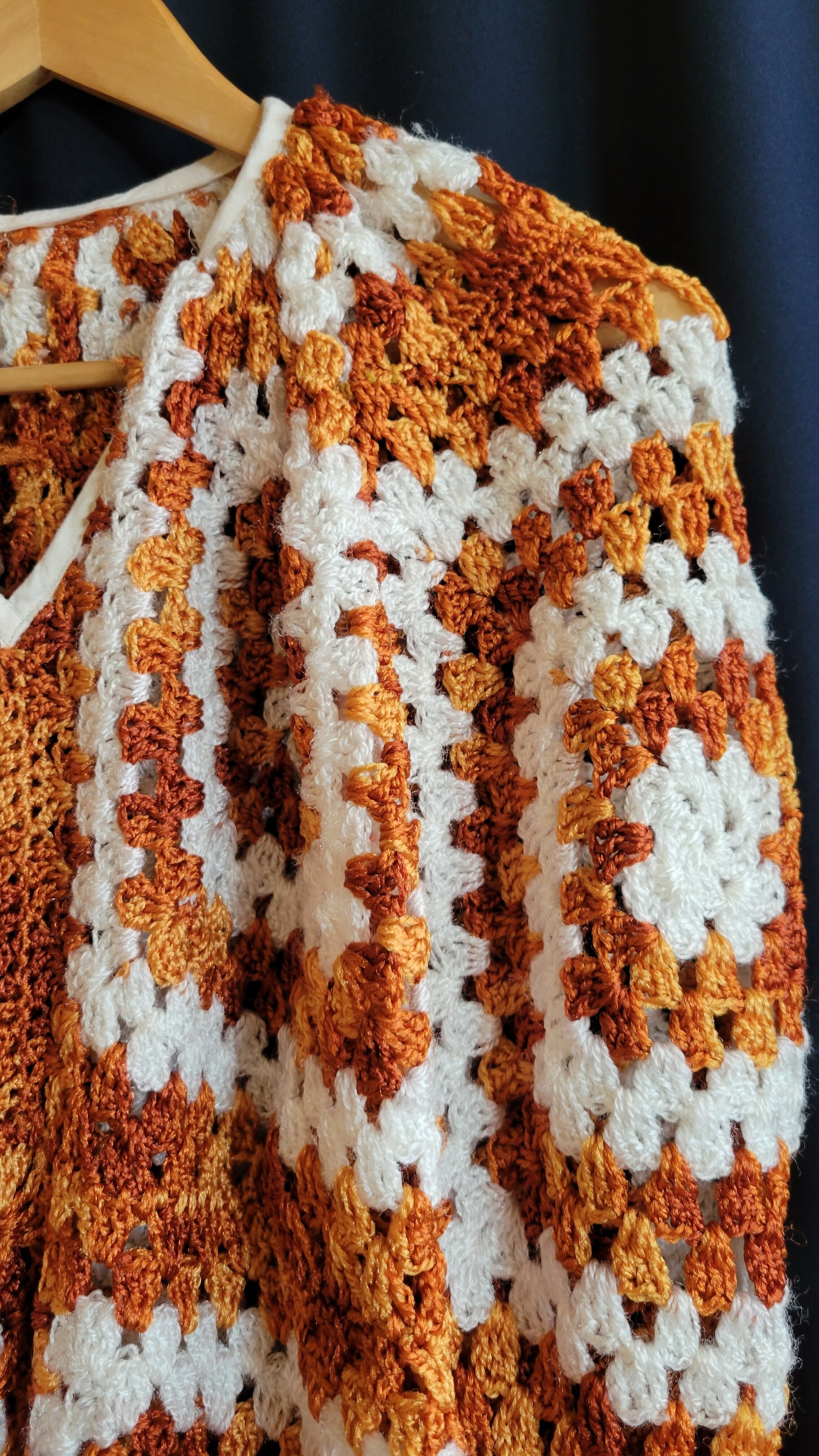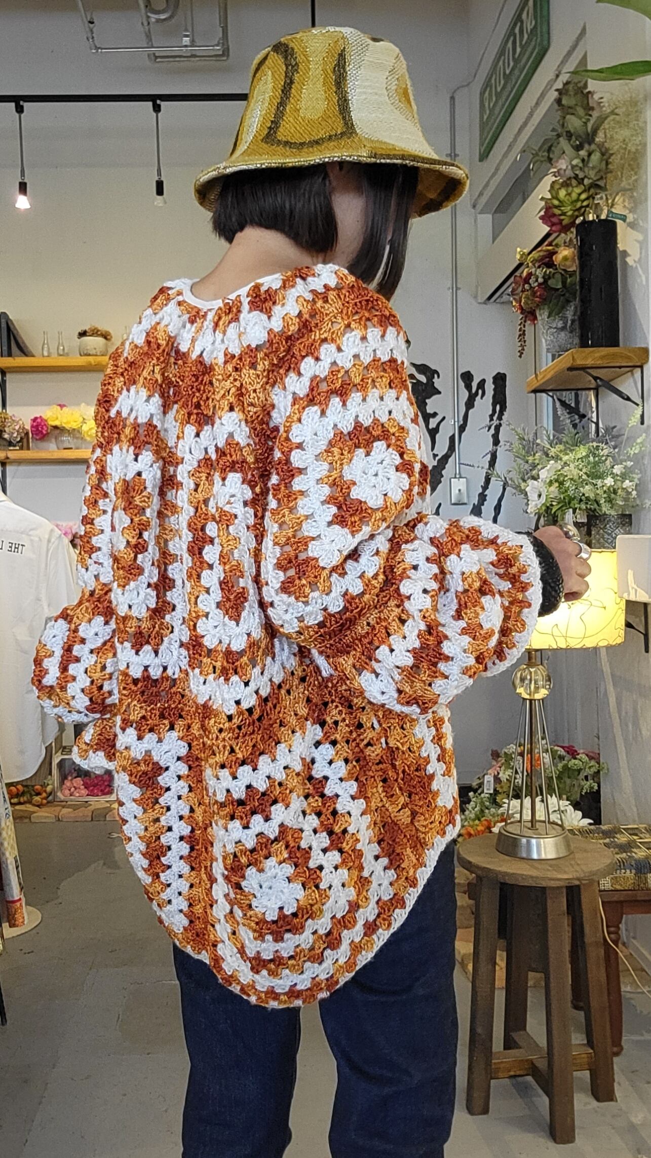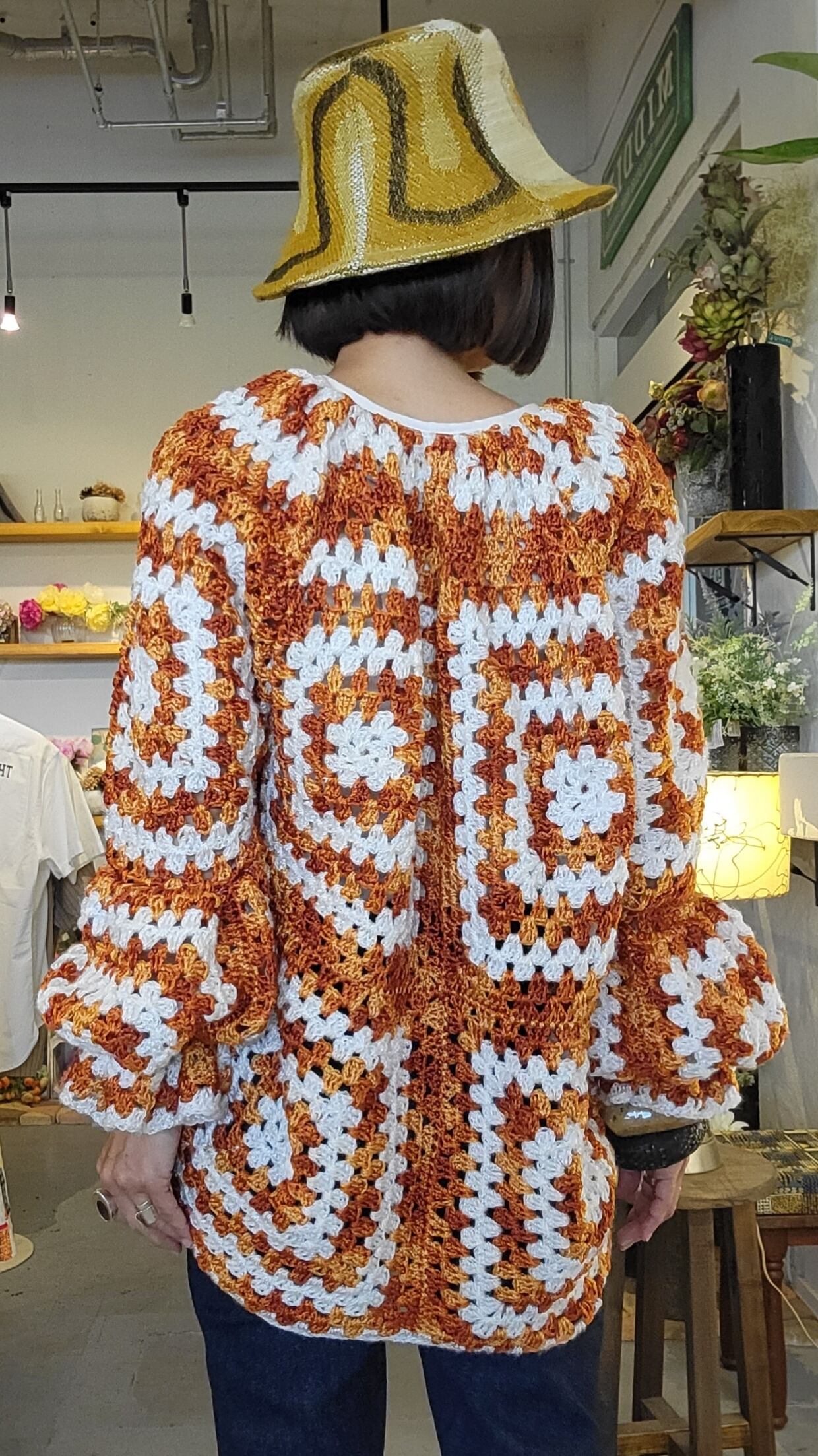 ヴィンテージの手編みのグラニーニットをリメイクしたプルオーバートップ。ハンドメイドによるリメイクで一点ものです。オーバーサイズでざっくりカジュアルに着られます。素材自体は当時もののため毛玉や編み目のゆるみ等若干の使用感があります。着用に支障のある程度ではありませんが、ヴィンテージ品にご理解のある方へおすすめいたします。