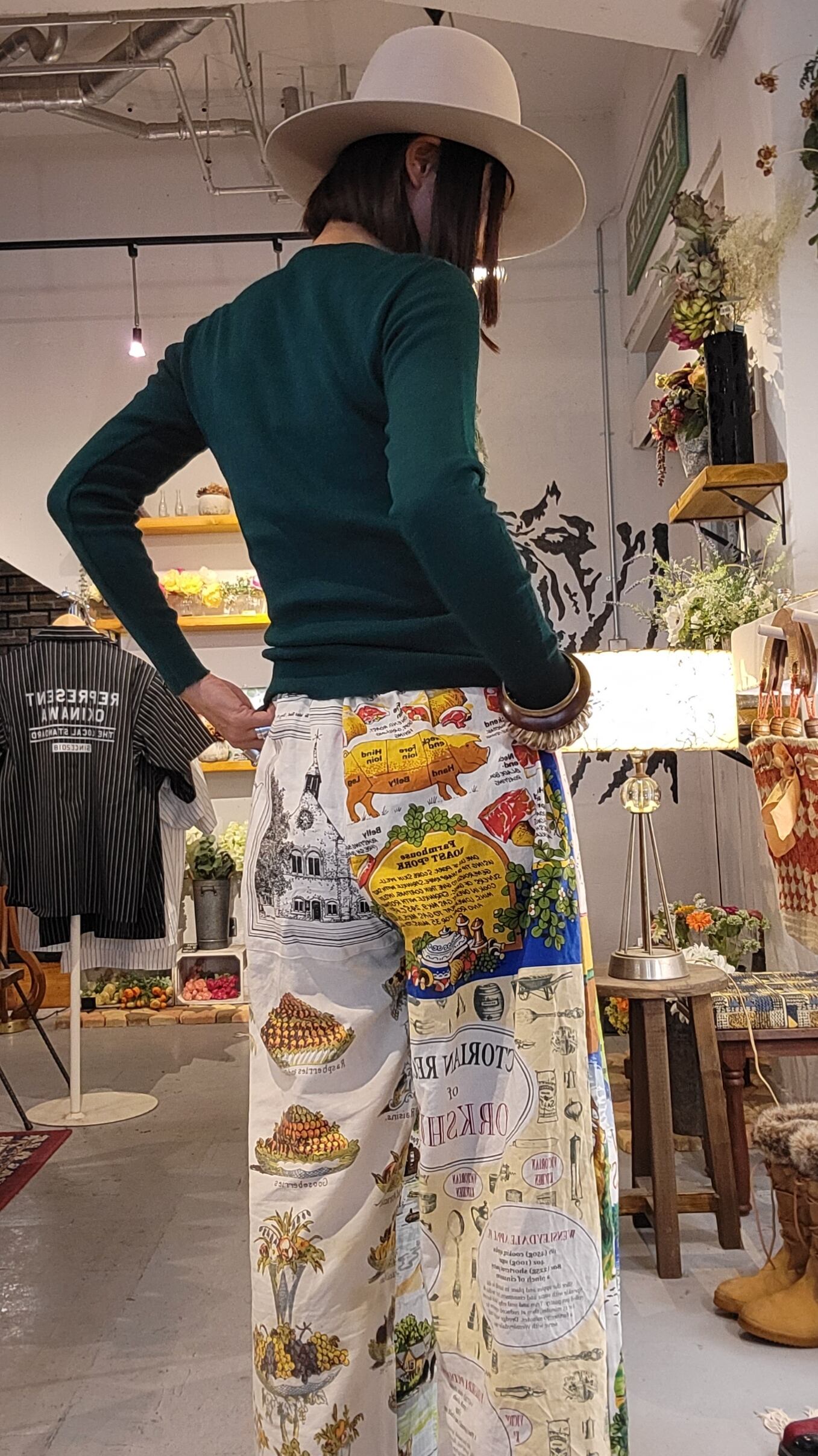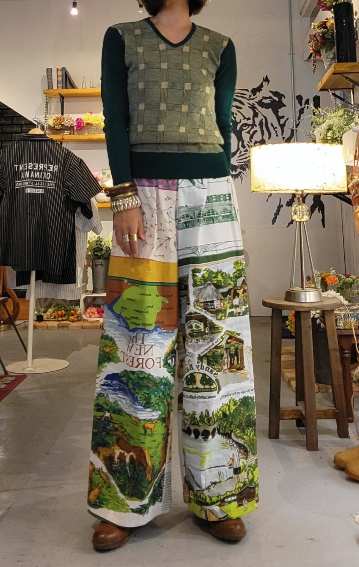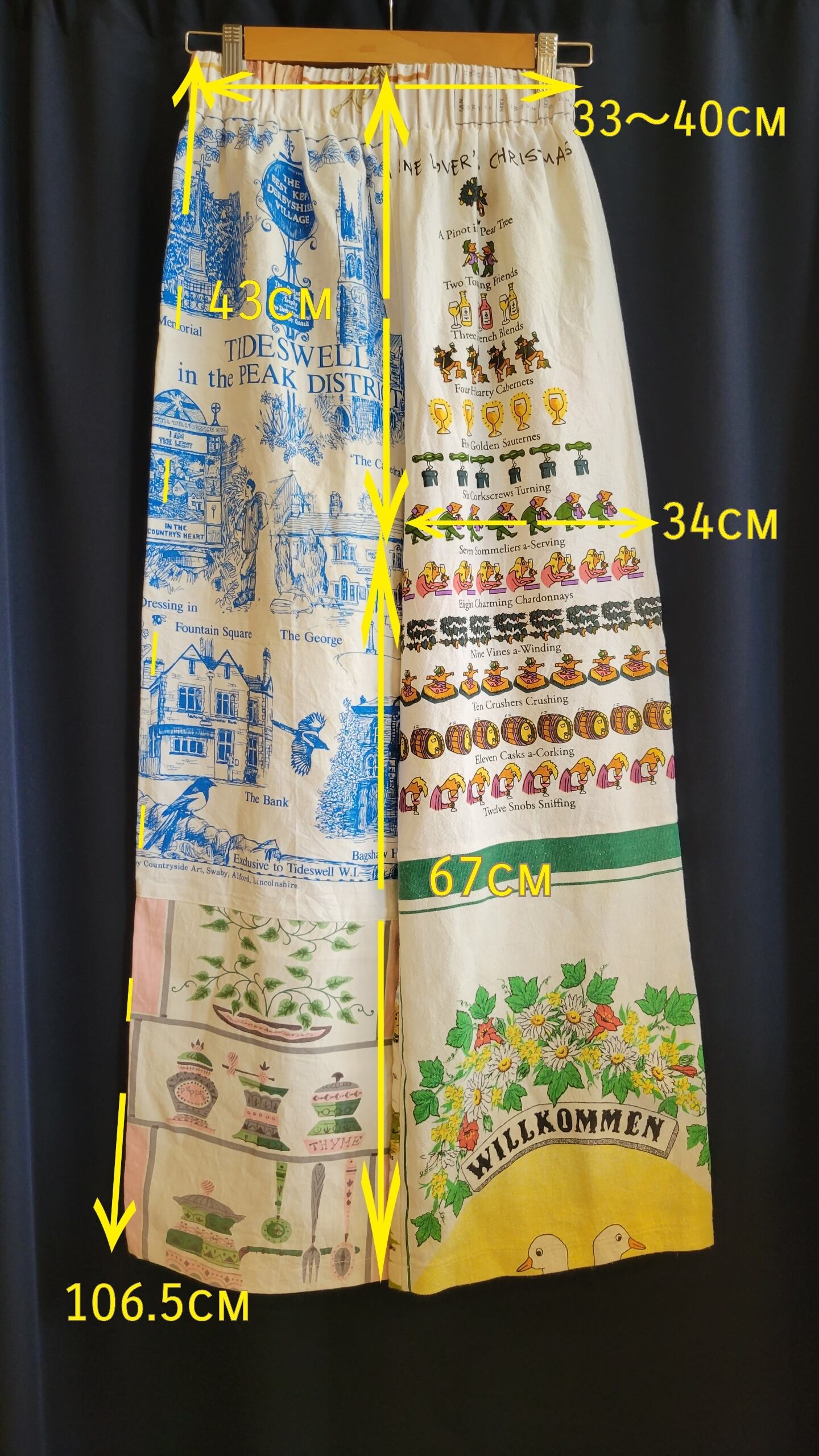 ヴィンテージクロスをリメイクしたイージーパンツ。ウエストゴム、ハイライズ・ワイドシルエット。前後で表情が異なり、全て一点ものになります。ヴィンテージクロスの洗いざらしの風合いをお楽しみいただけます。