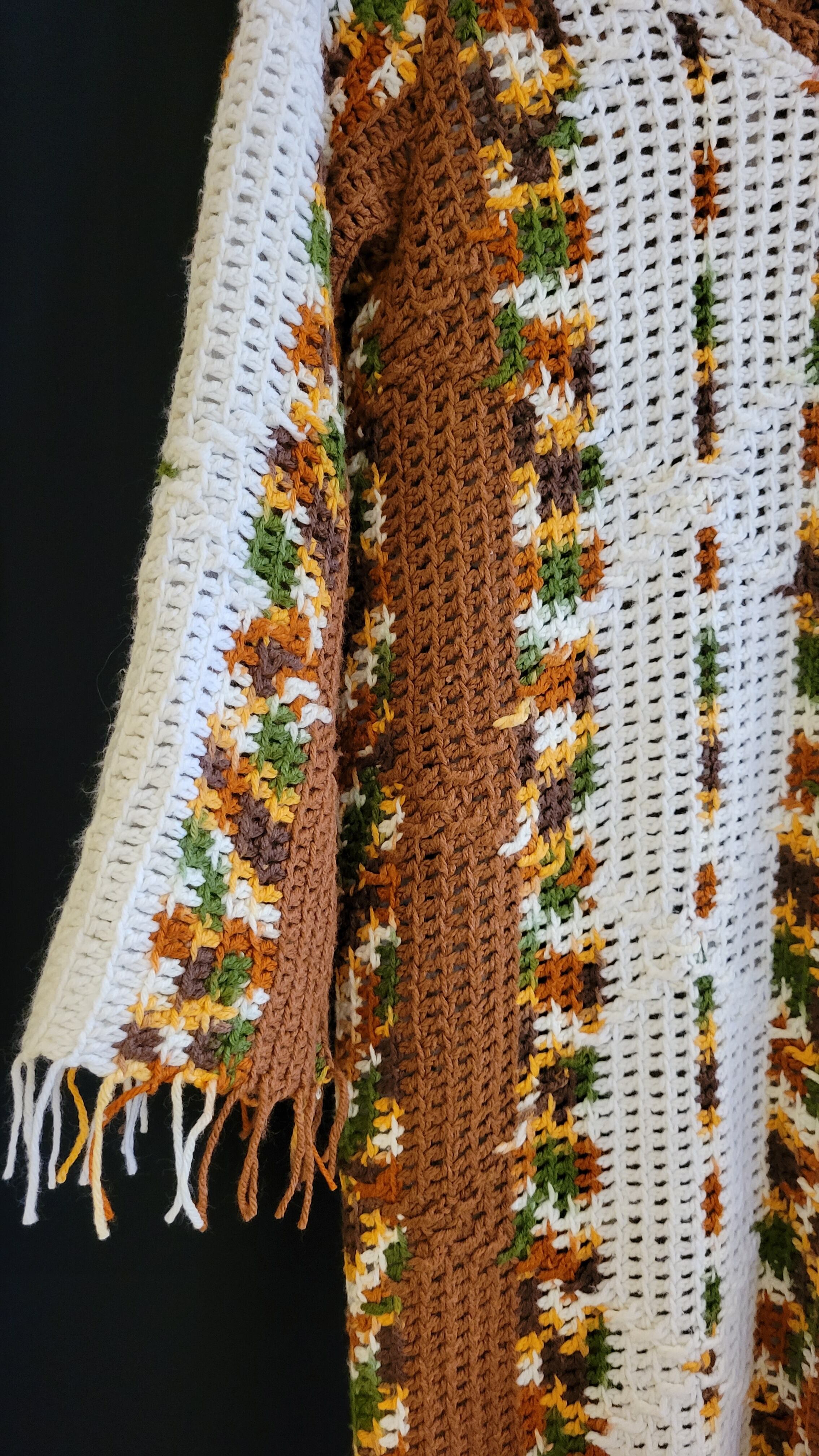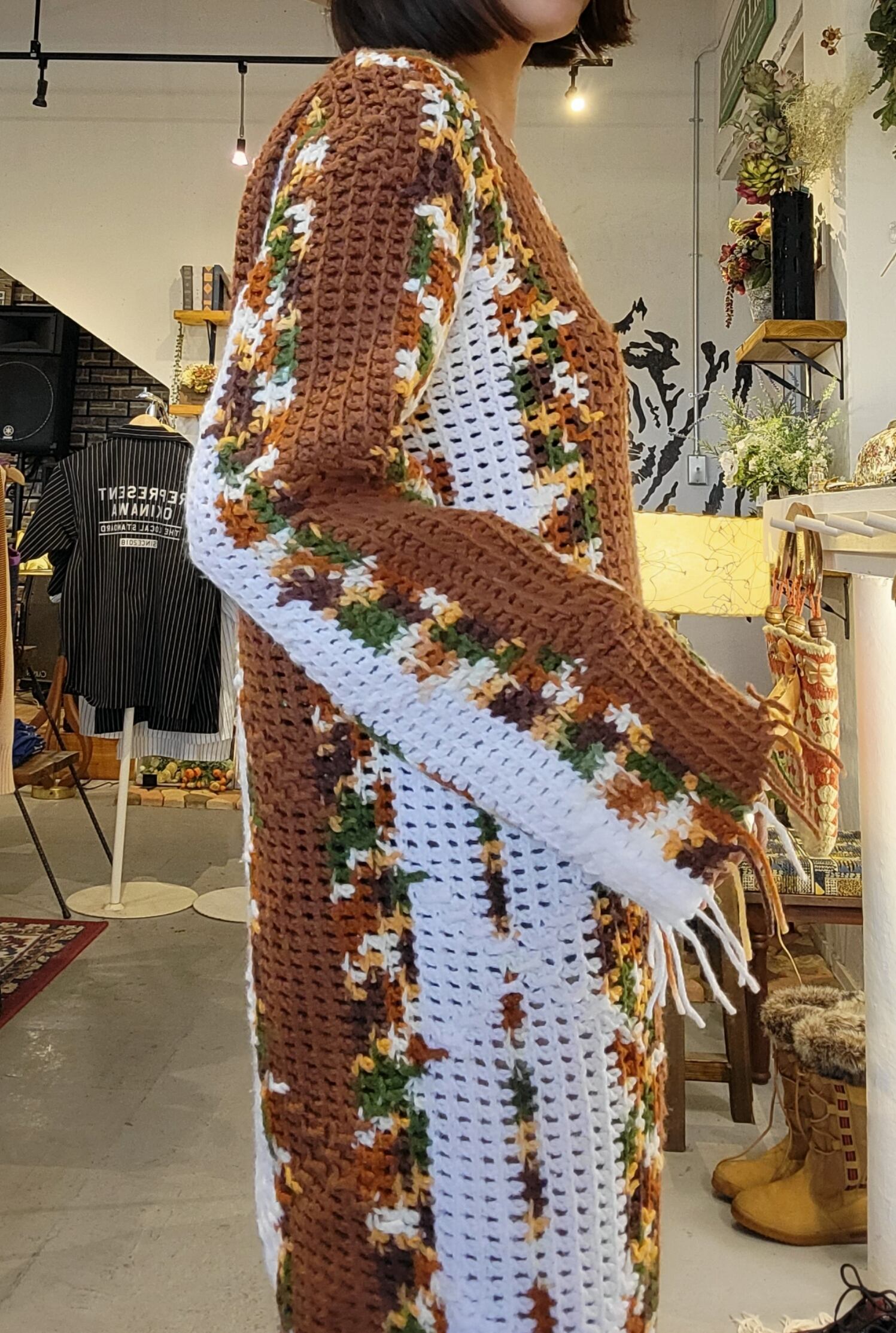 ヴィンテージのグラニーニットのブランケットをリメイクしたマキシドレスです。バックファスナー付き。すとんと落ちるすっきりシルエットで着膨れしません。肉厚で暖かいハンドニットはヴィンテージならでは。生地自体は当時もののため、毛玉等の使用感があります(できるかぎりこちらで取り除くメンテナンスをしております)。着用に支障のある程度ではありませんが、ヴィンテージ品にご理解のある方へおすすめいたします。