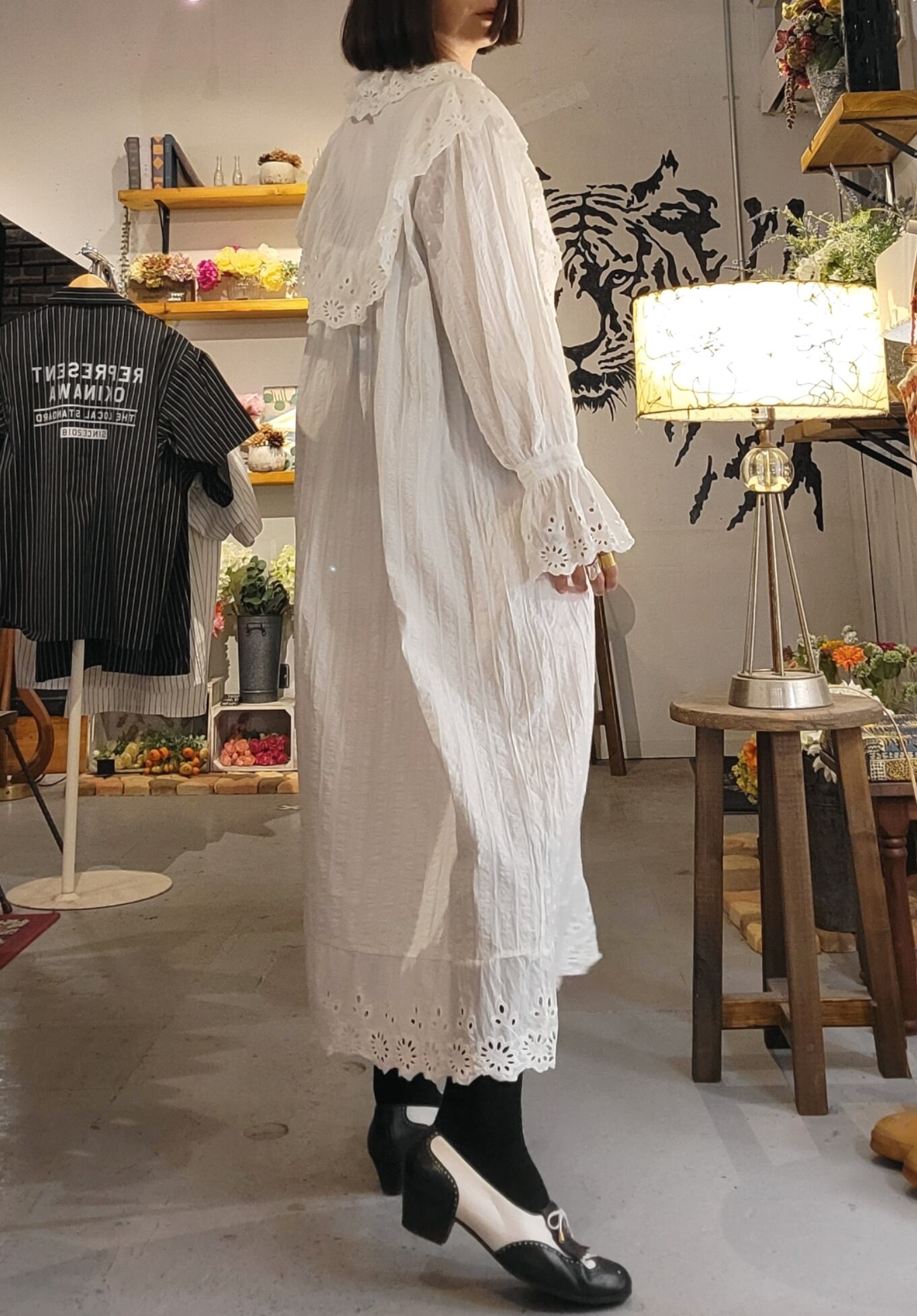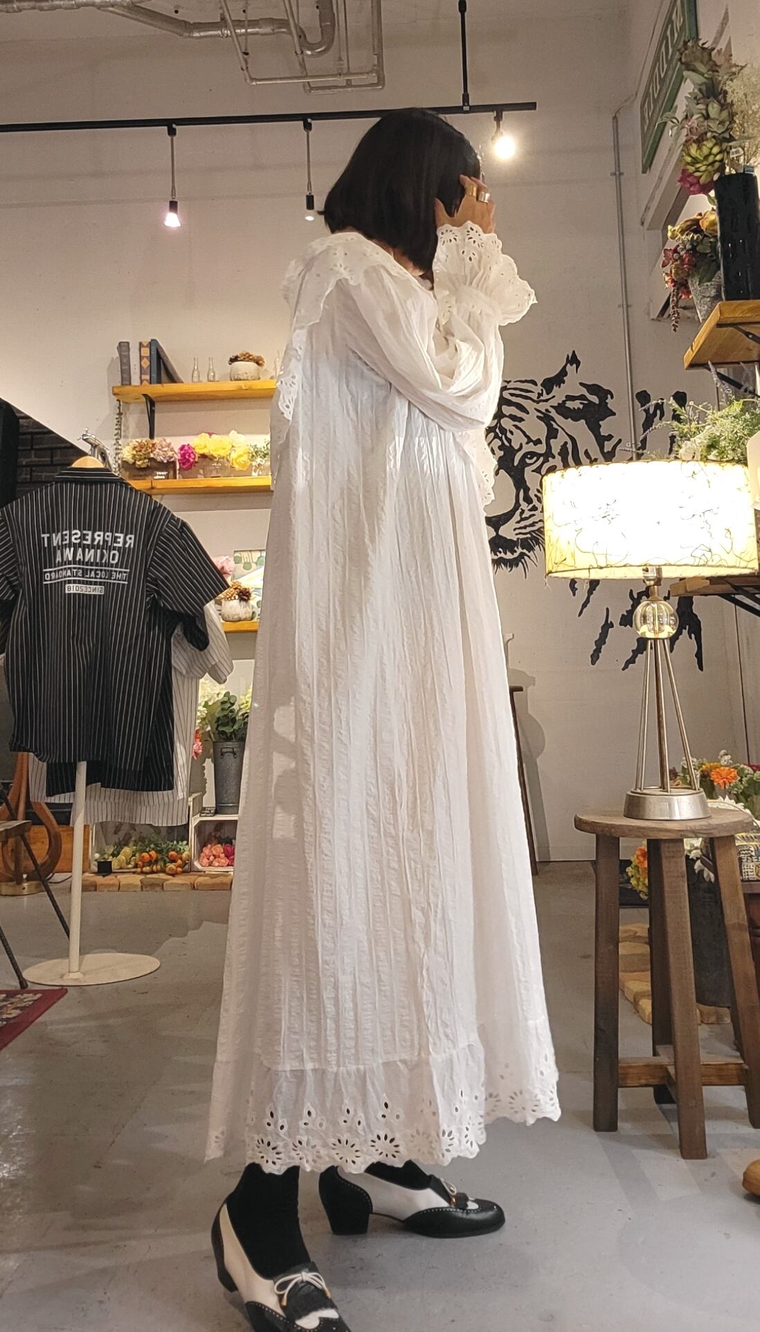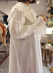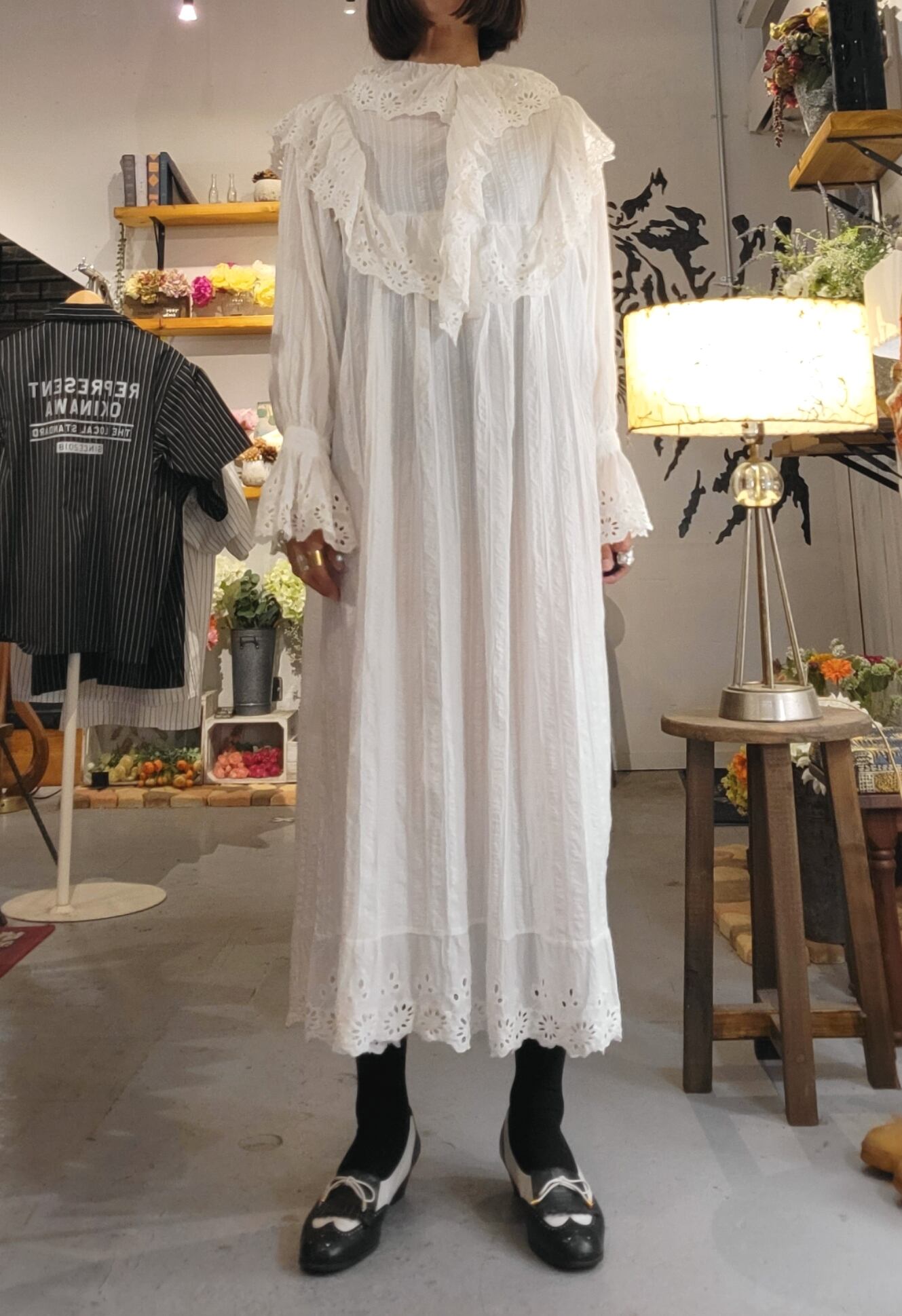 レースとフリルたっぷりのヴィンテージドレス。素材表記はありませんがコットンのようです。厚手過ぎず薄手過ぎず、若干の透け感があります。伸縮性はありません。締め付け感無くふんわり軽やかな着心地です。長過ぎない丈感でブーツとの相性も抜群です。
