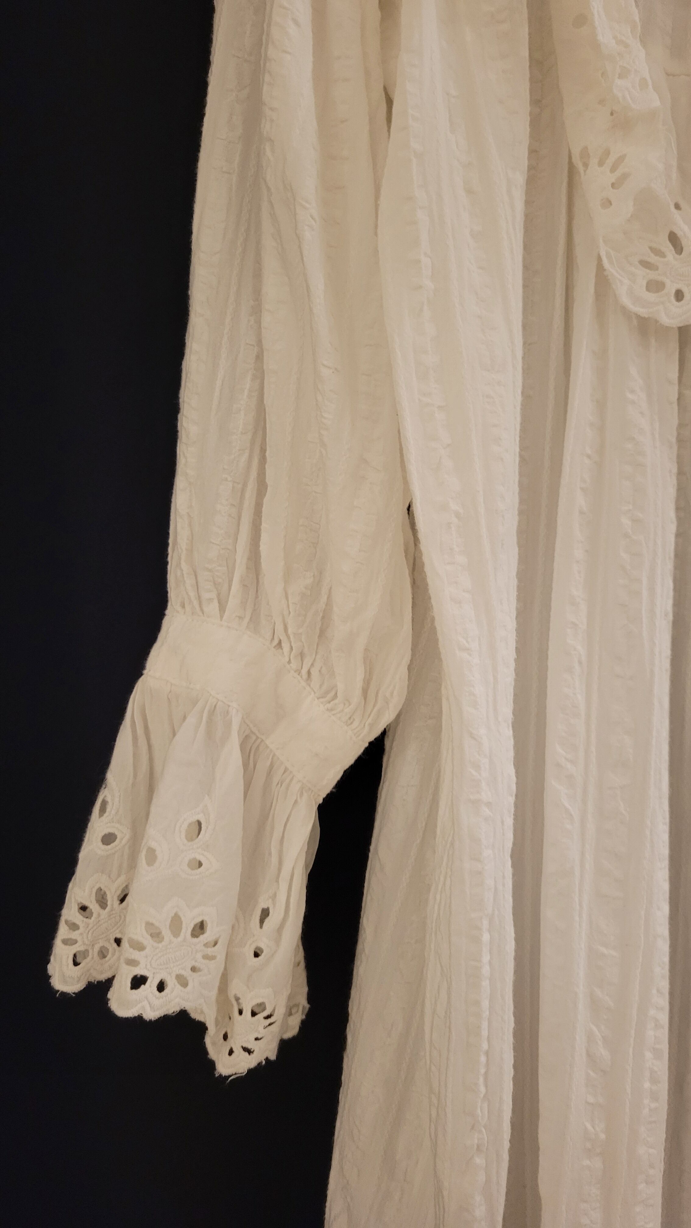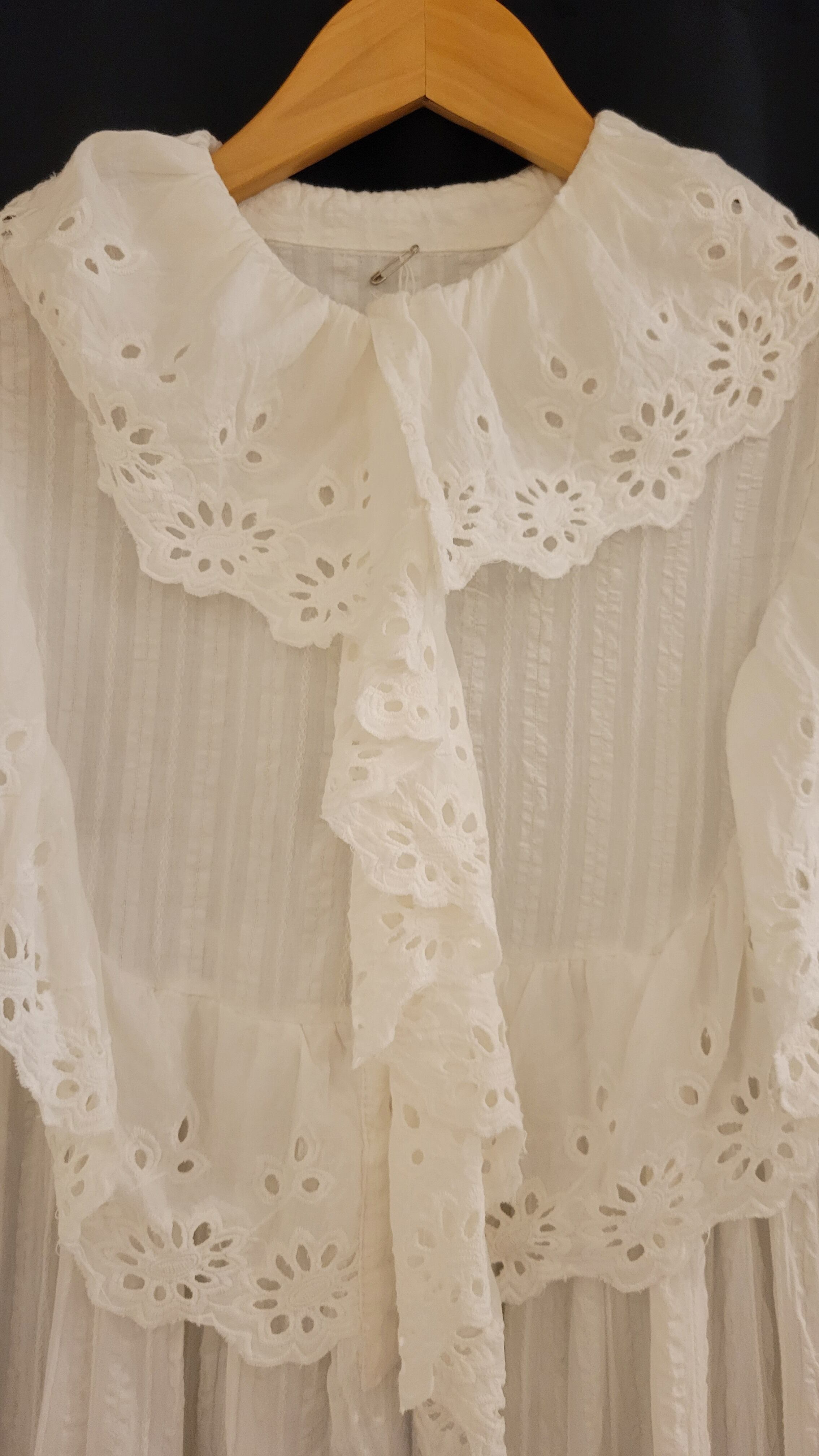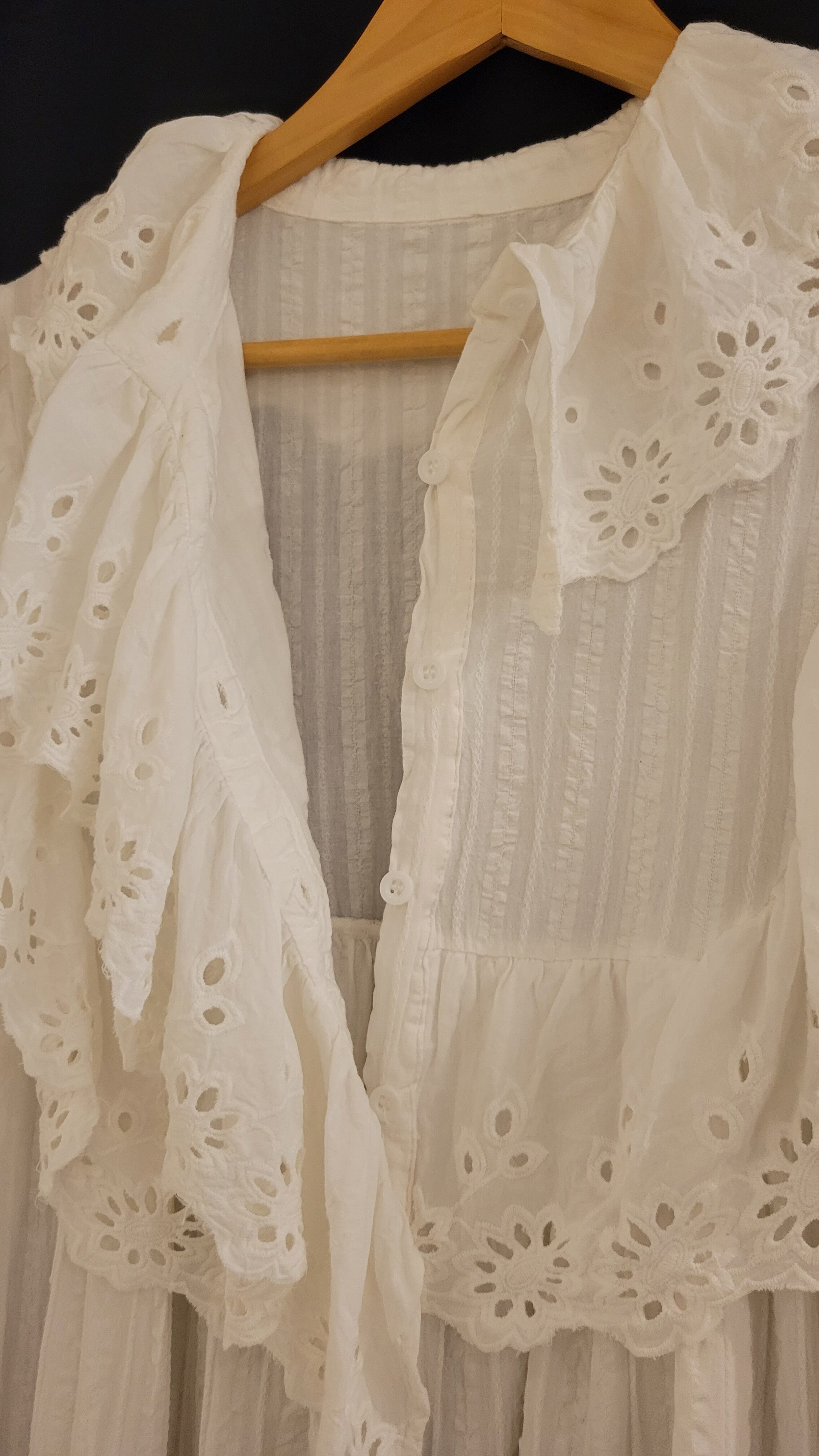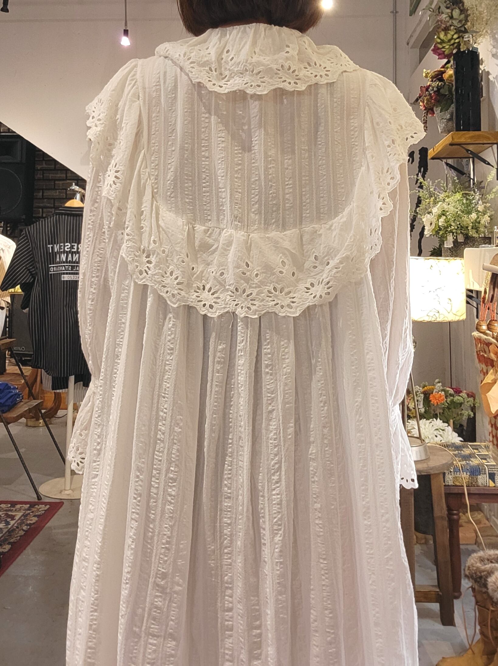レースとフリルたっぷりのヴィンテージドレス。素材表記はありませんがコットンのようです。厚手過ぎず薄手過ぎず、若干の透け感があります。伸縮性はありません。締め付け感無くふんわり軽やかな着心地です。長過ぎない丈感でブーツとの相性も抜群です。