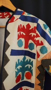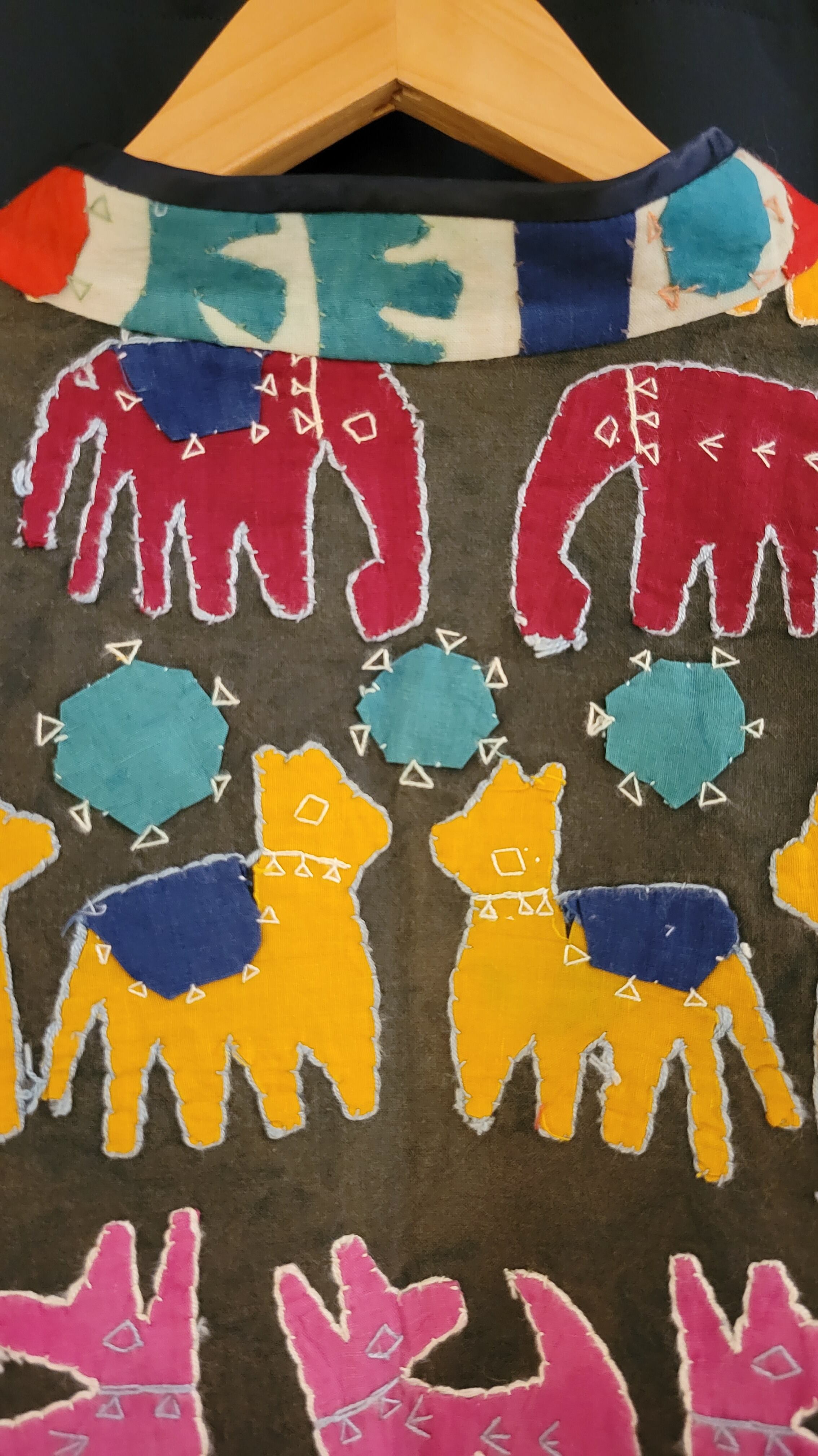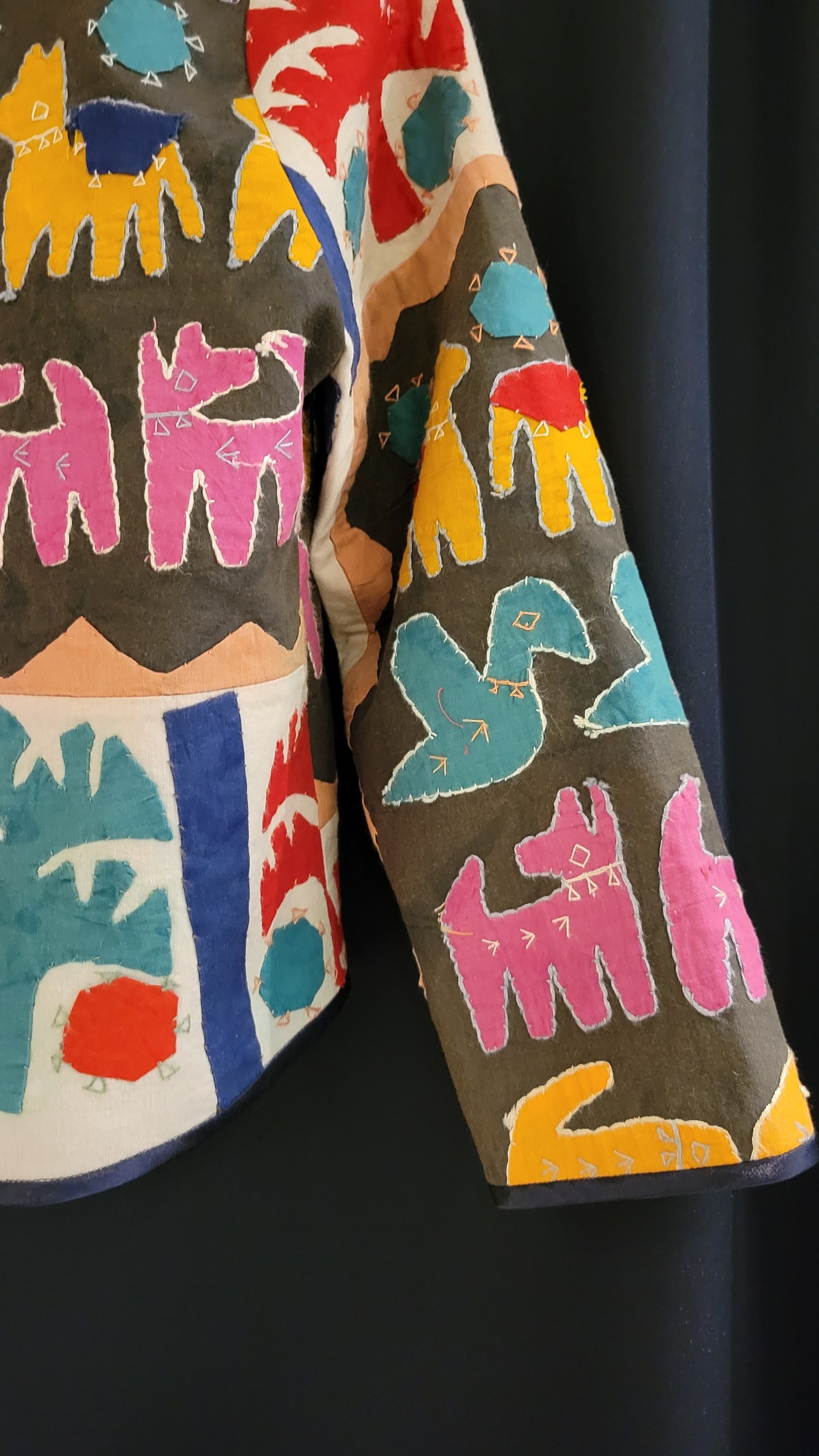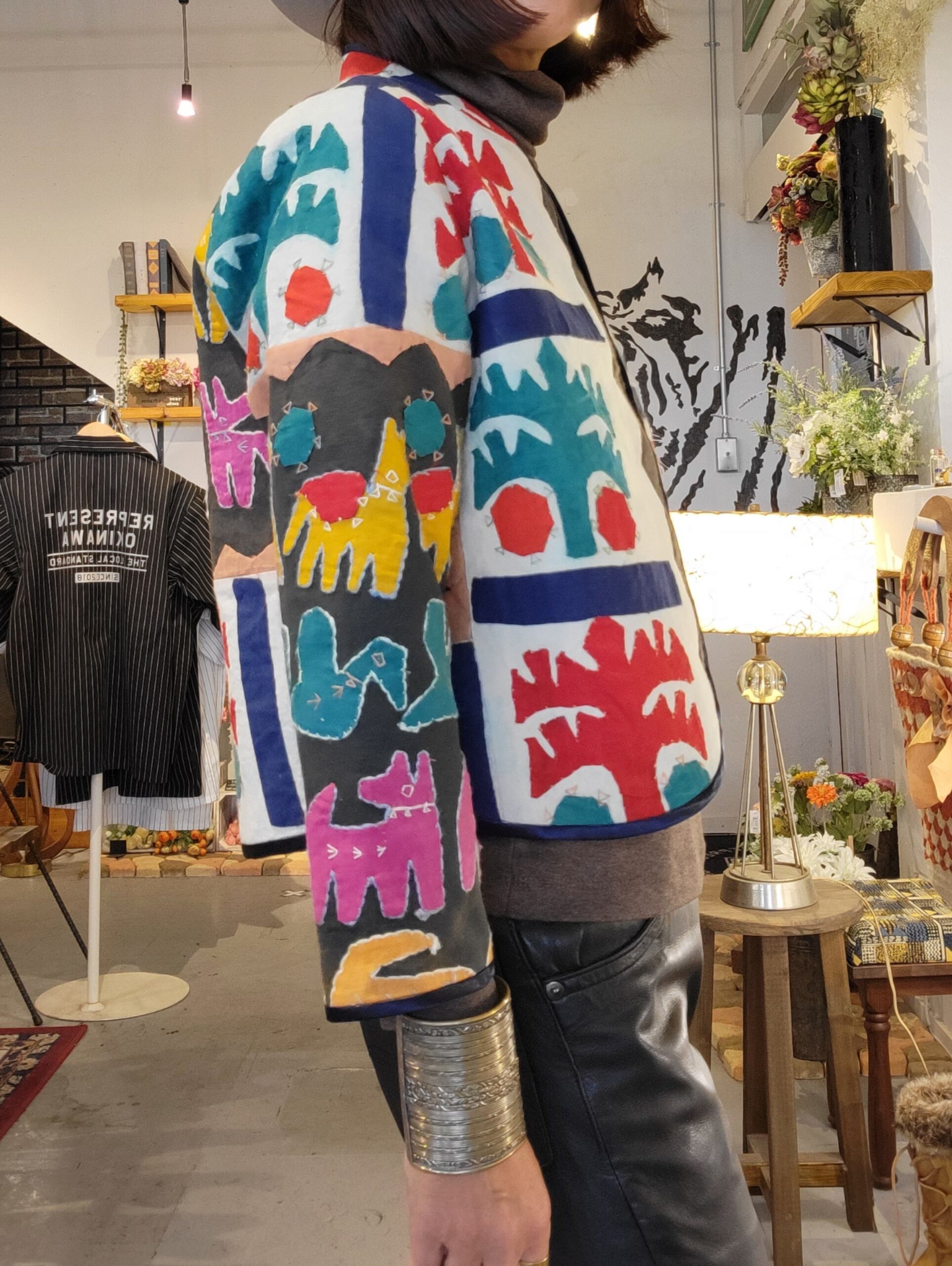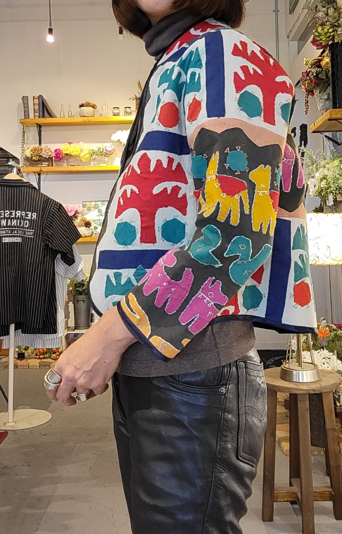 ハンドステッチによるアップリケが全面に施されたヴィンテージジャケット。素材表記はありませんがコットンのようです。動物や植物がモチーフのプリミティブなアップリケが特別な1枚。