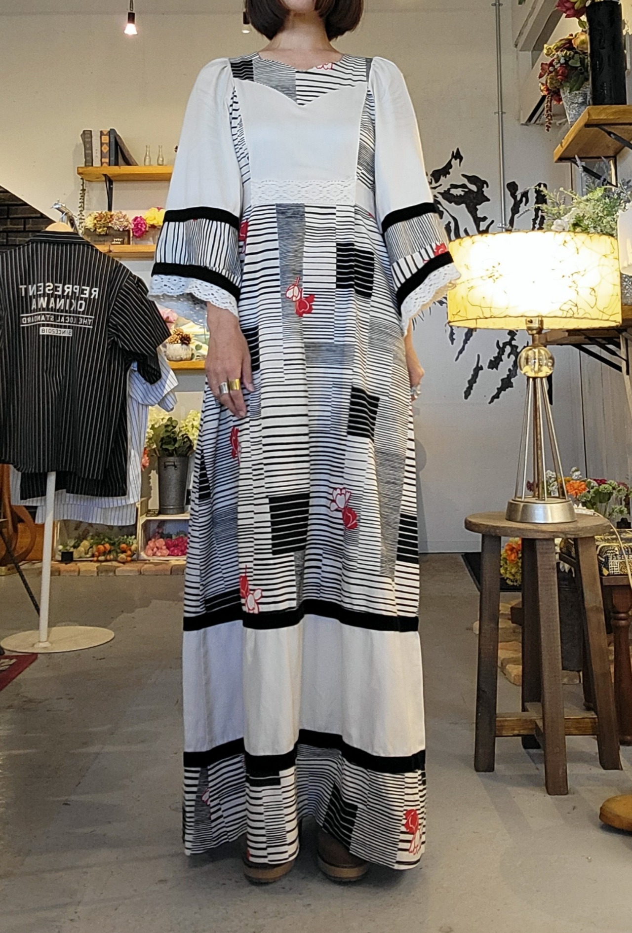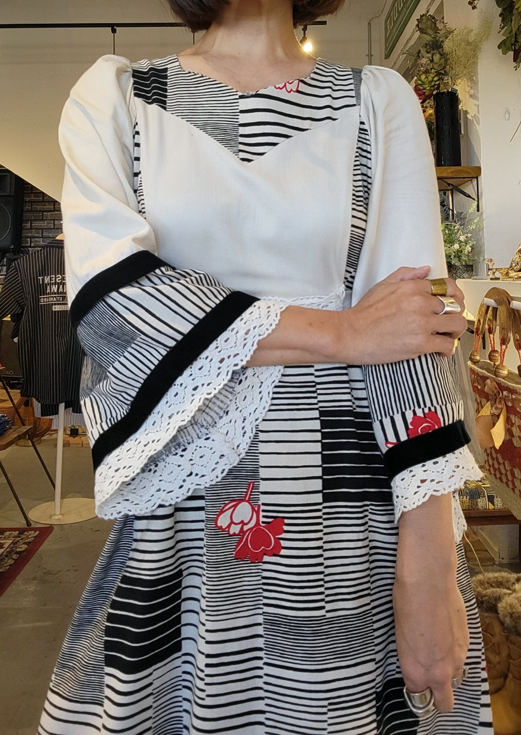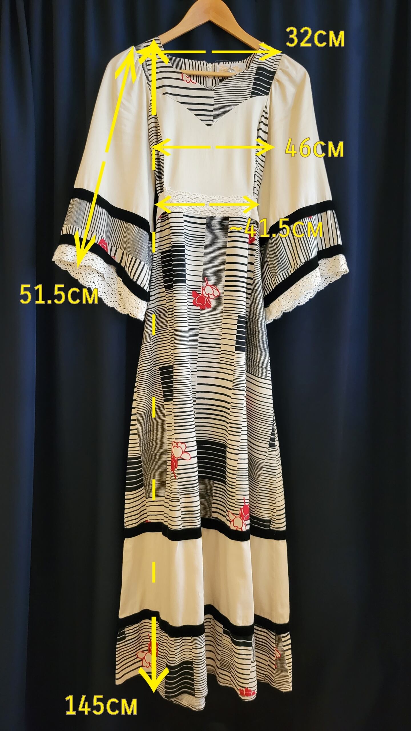 Made in Finland 北欧ヴィンテージのマキシドレス。素材はコットンです。袖に2本、裾に2本の太いブラックのラインはプリントではなくベロアテープが縫い込まれており、全体を引き締めています。バックファスナー付き。ホワイト×ブラックに赤いお花がアクセントの北欧らしいプリントが魅力の1着です。