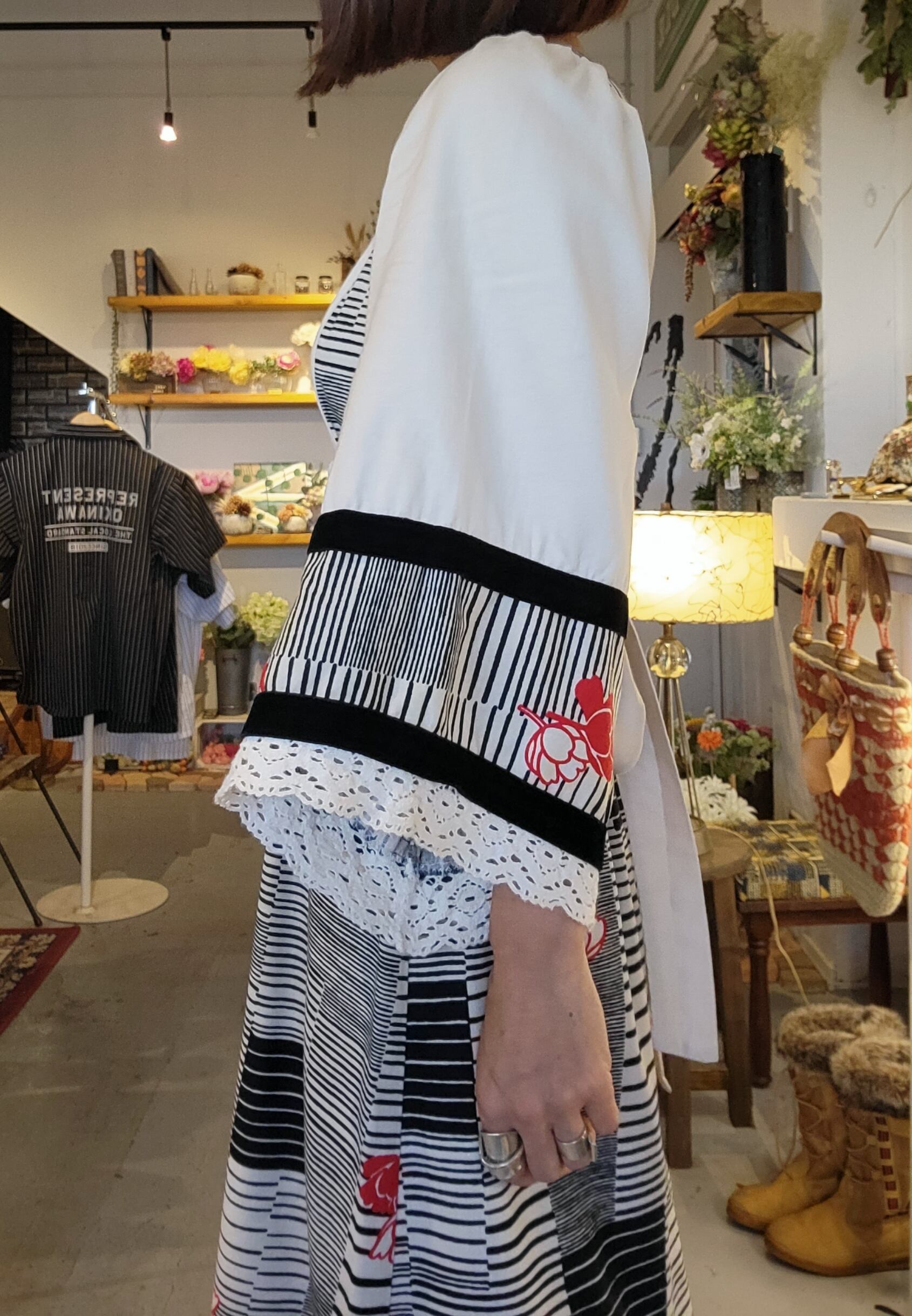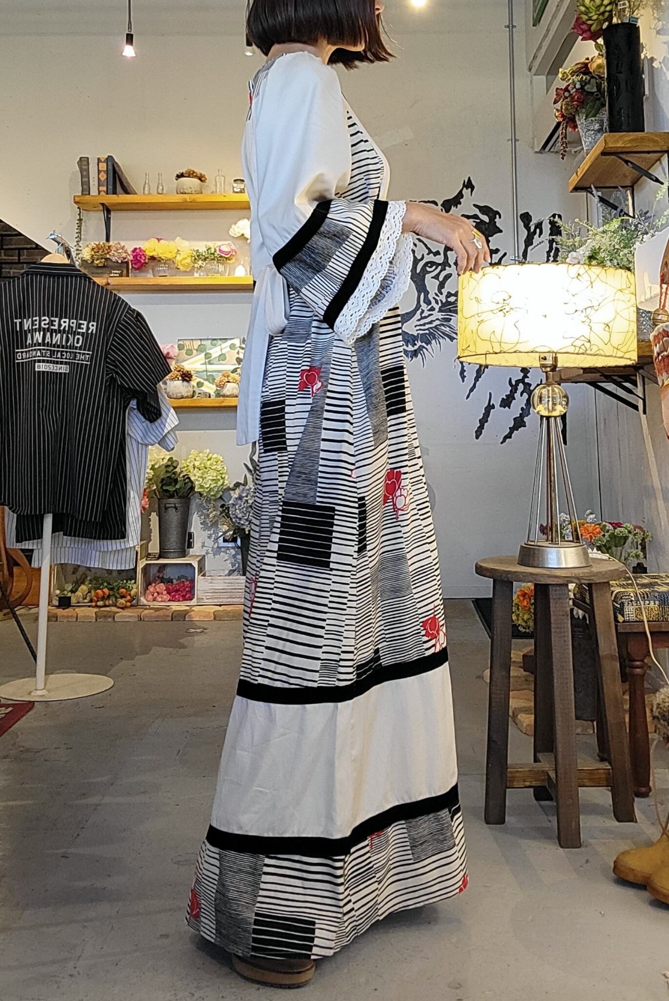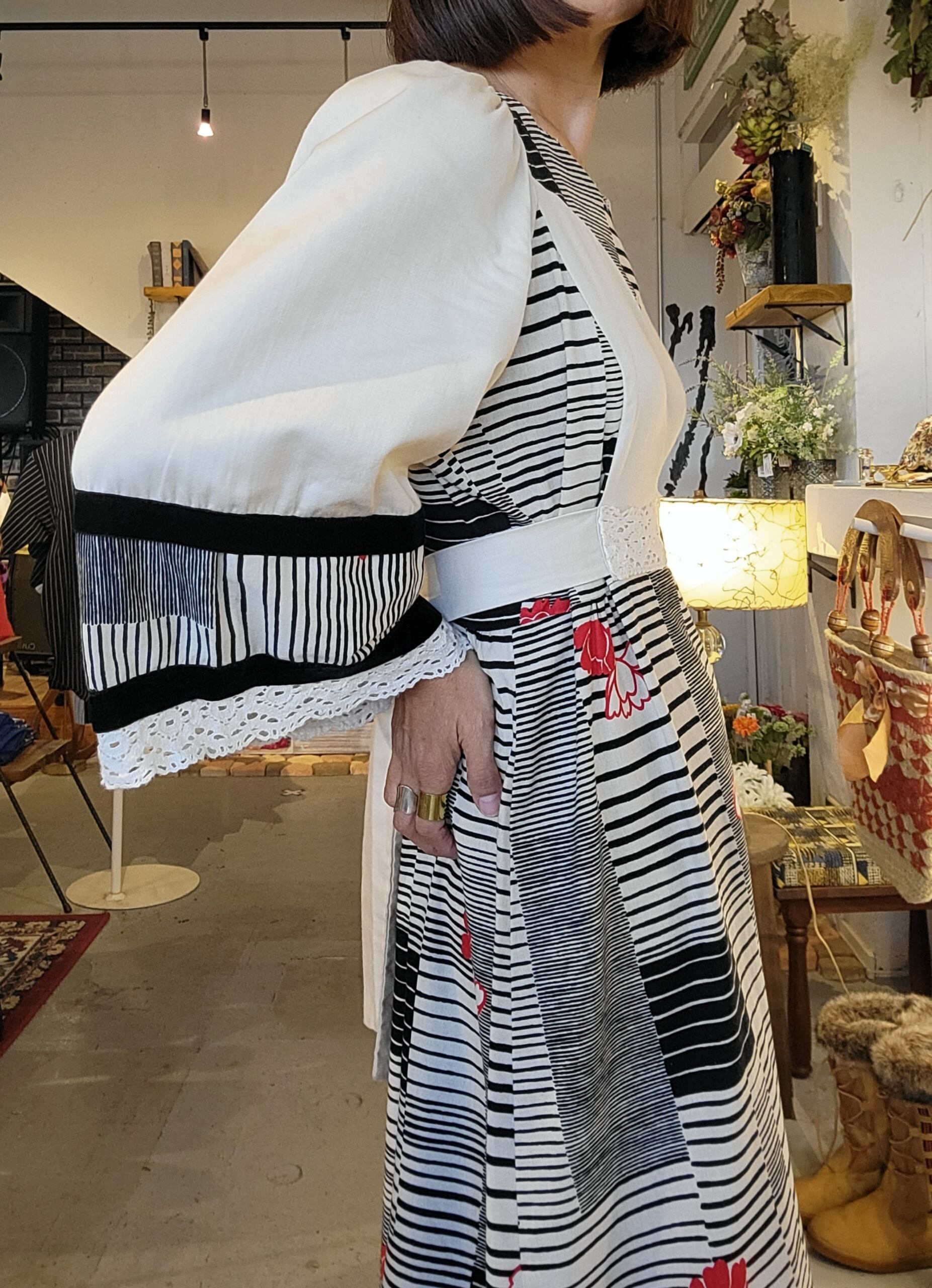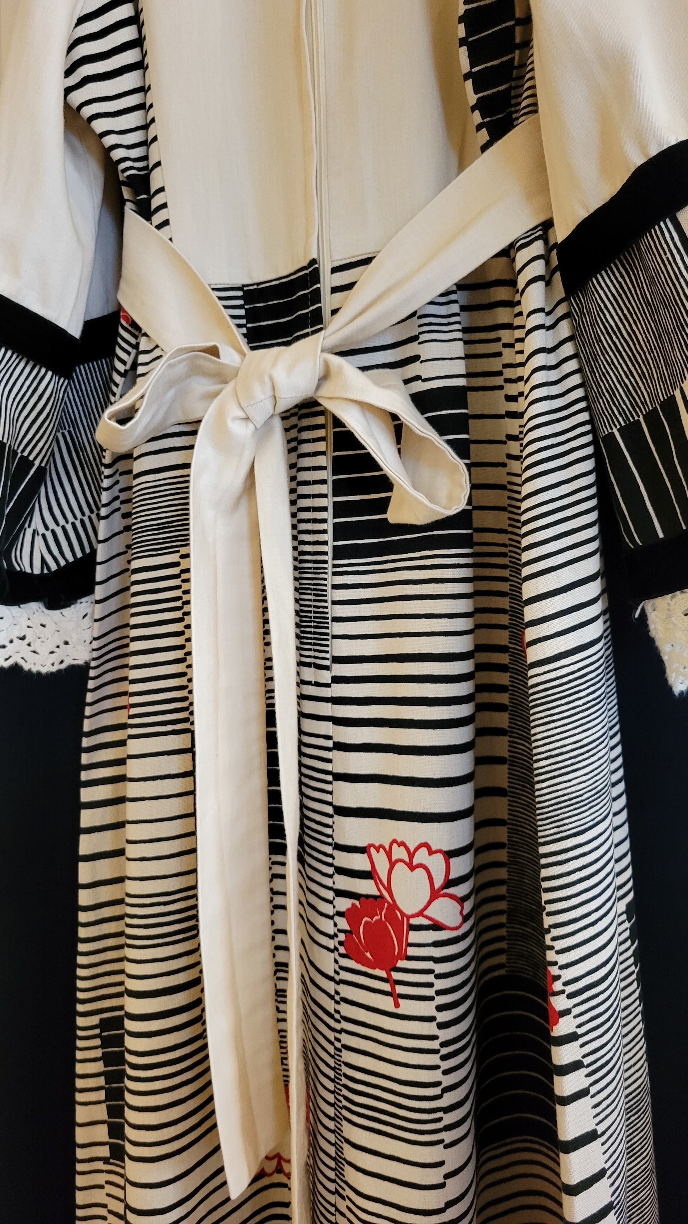 Made in Finland 北欧ヴィンテージのマキシドレス。素材はコットンです。袖に2本、裾に2本の太いブラックのラインはプリントではなくベロアテープが縫い込まれており、全体を引き締めています。バックファスナー付き。ホワイト×ブラックに赤いお花がアクセントの北欧らしいプリントが魅力の1着です。