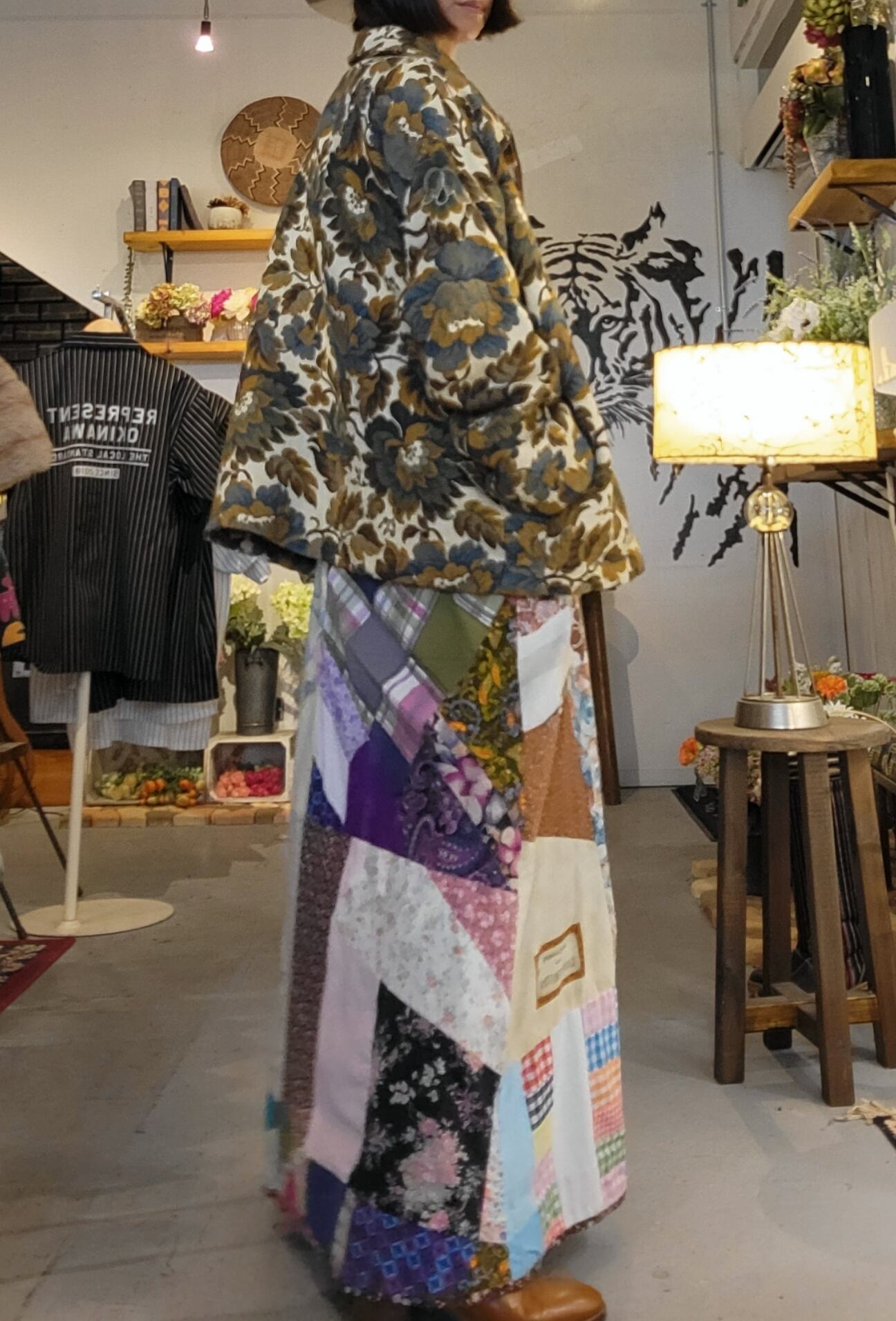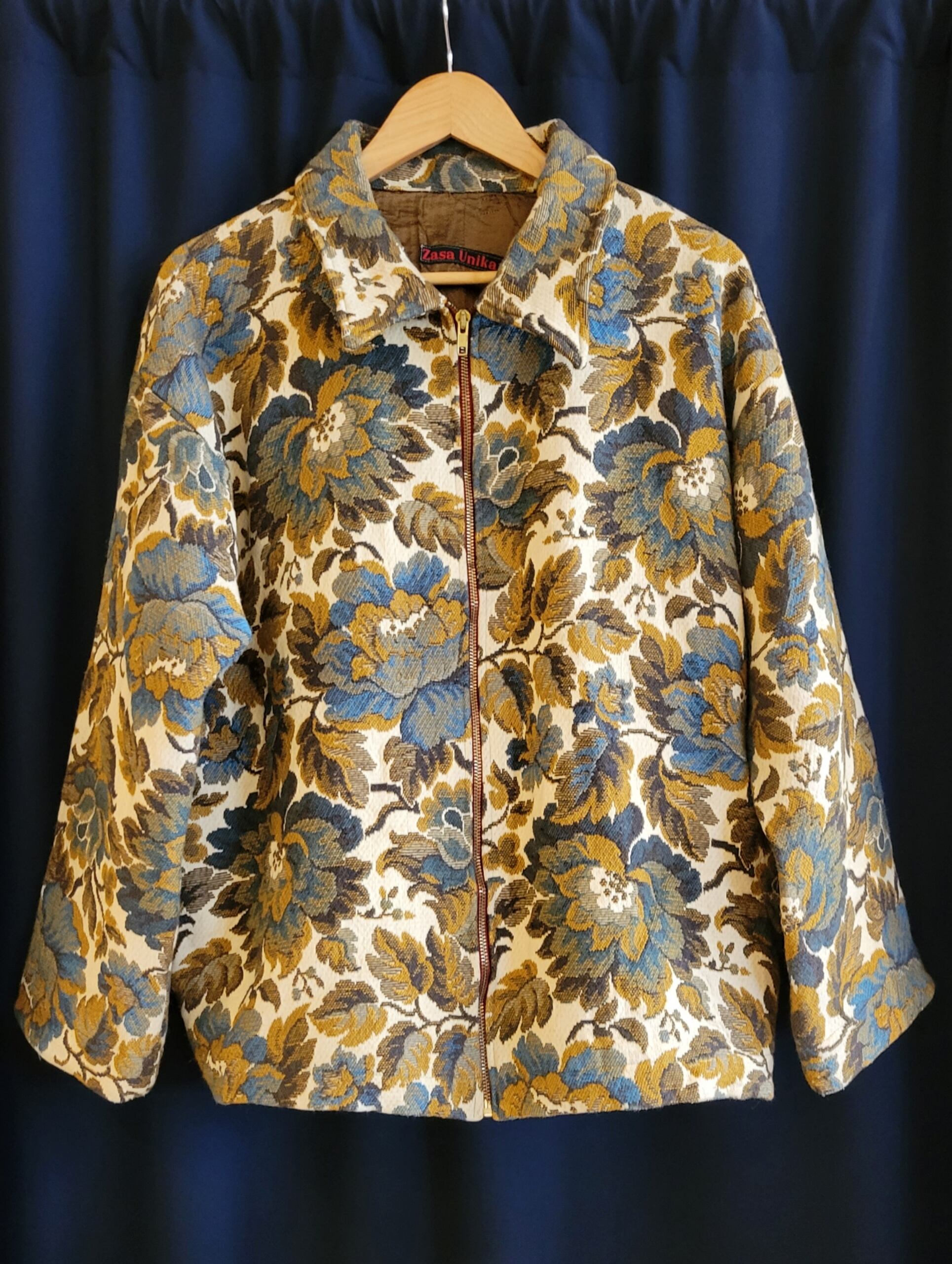 フロントジップのゴブラン織りジャケット。素材表記はありませんが表地はコットン、裏地はポリエステルのようです。ヴィンテージならではの重厚感のあるゴブラン織りですが、それほど重くなくゆったりめのサイズ感でさっと羽織れる手軽さも兼ね備えています。
