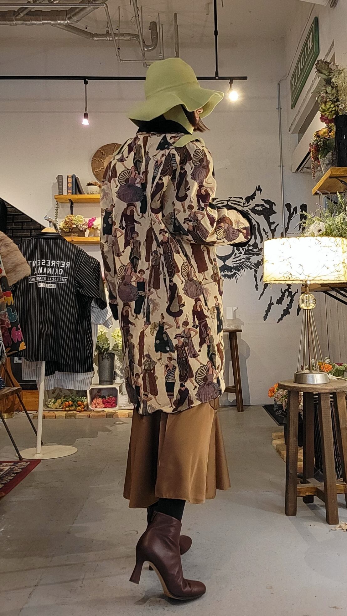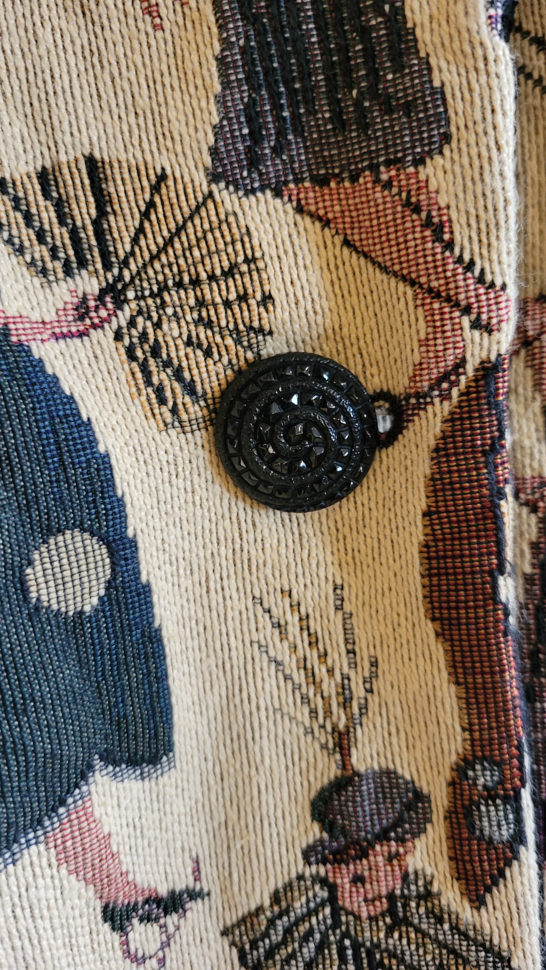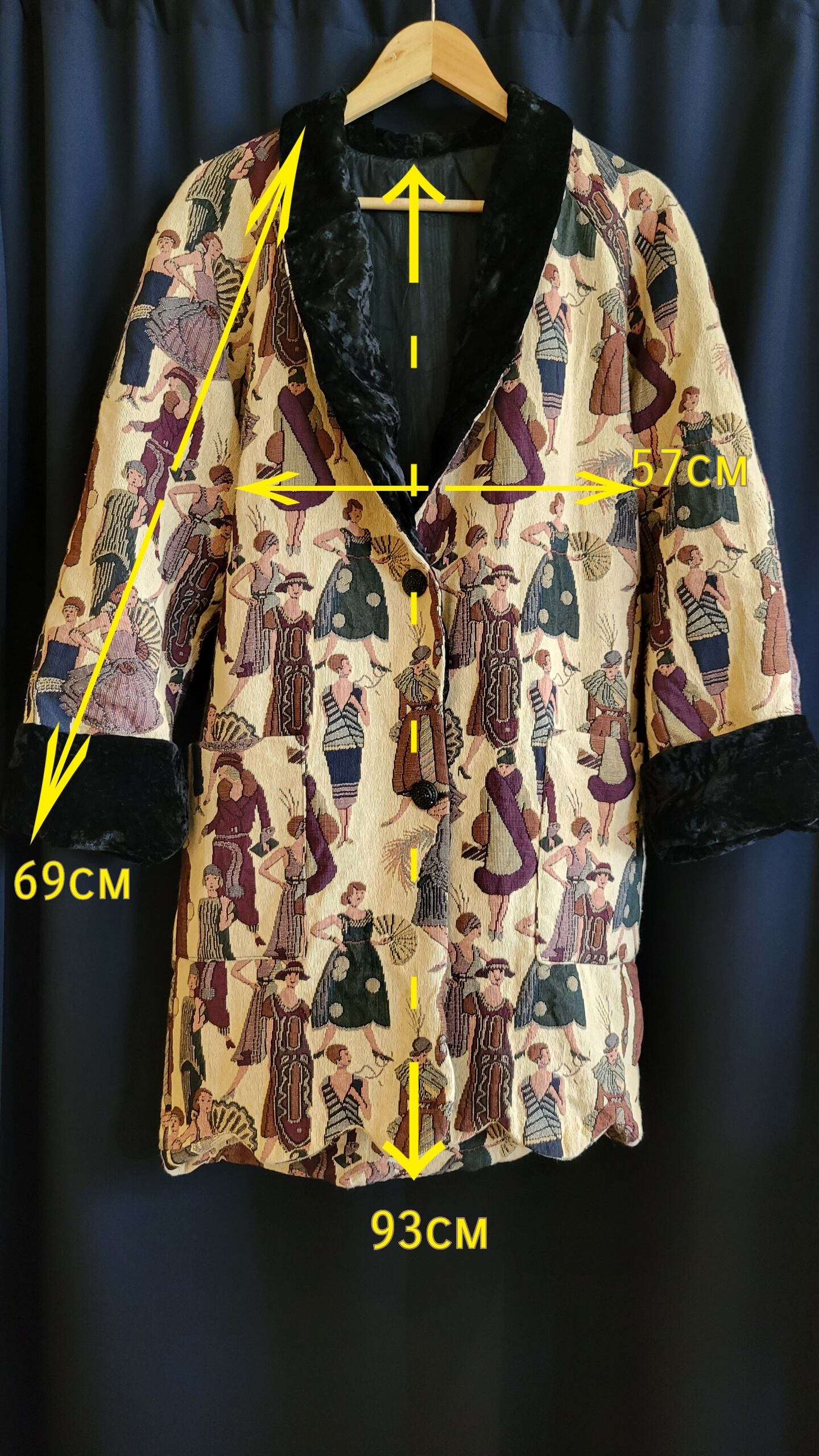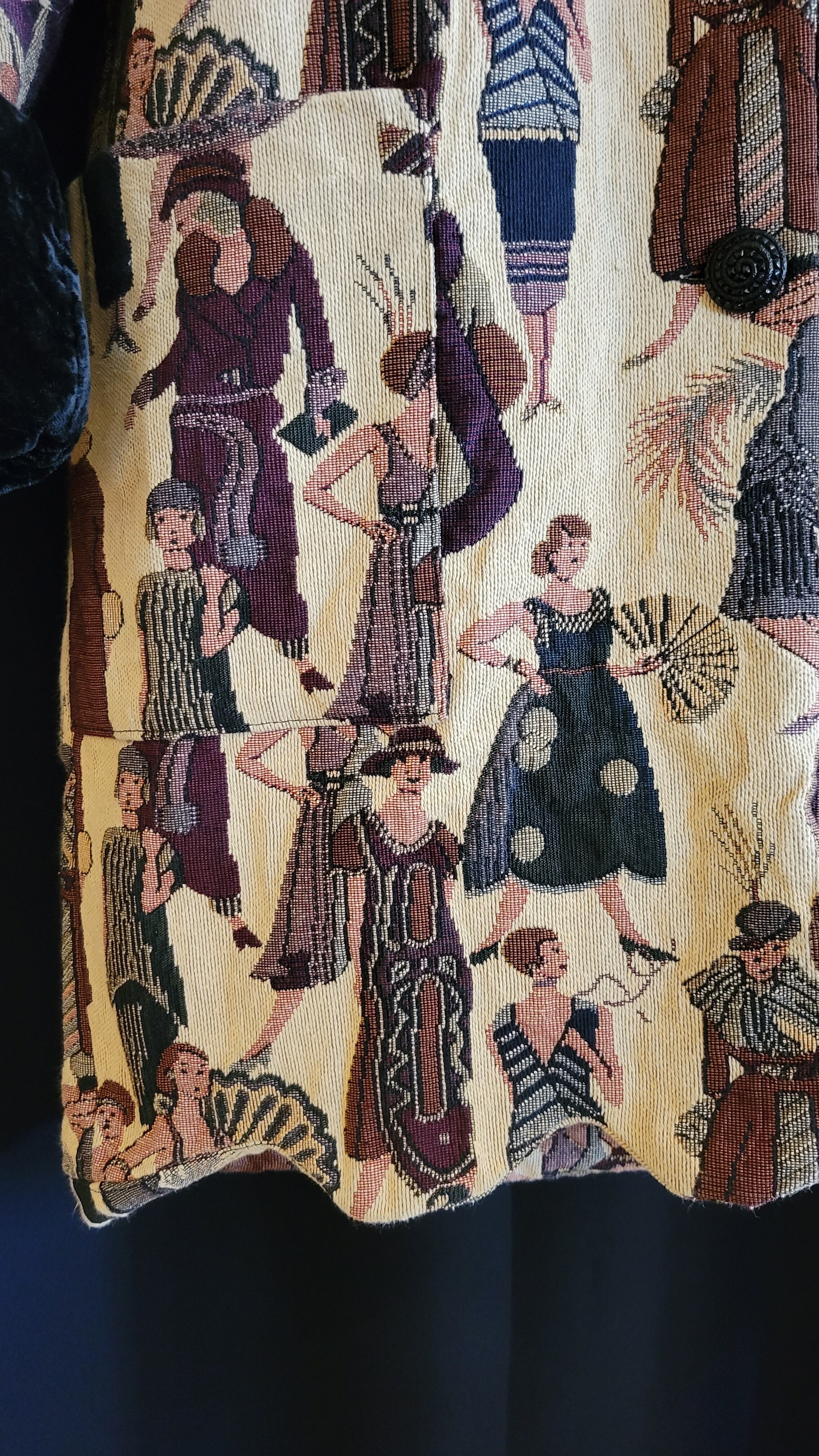 ゴブラン織りのヴィンテージハーフコート。素材表記はありませんが表地はコットン、裏地はポリエステルのようです。襟とカフスの折り返しはベロアです。厚手の割にはさほど重くはなく、気軽に羽織れます。肩幅はラグランスリーブでサイズフリー、アームホール広め、身幅はすっきり、綺麗なボックスシルエットです。裾のなみなみカットと20s fashion に身を包んだ婦人たちの柄が楽しい一着です。