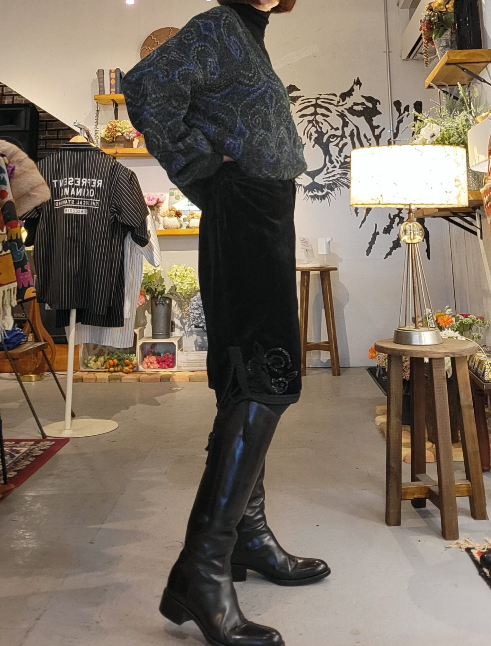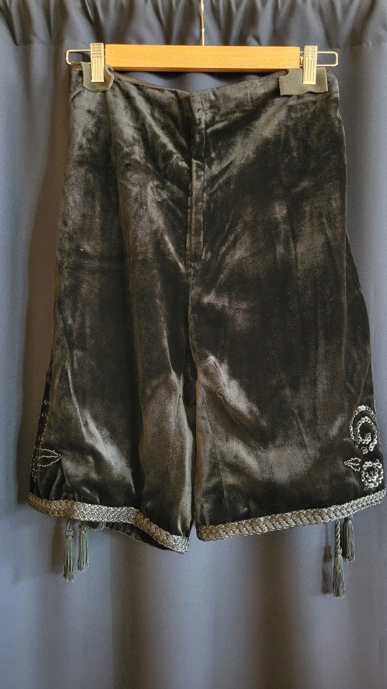ユーロヴィンテージのベルベット刺繍入りパンツ。裾に飾りテープ、スパンコール、レースアップ&タッセル付きの凝ったデザインの珍しいハーフパンツです。裏地付き。ウエストはバックのみゴム仕様、フロントはホック2つとジッパーが付いています。光沢と落ち感のある上質なベルベット素材で、秋冬に大人っぽく履ける希少なヴィンテージハーフパンツです。