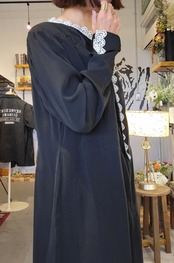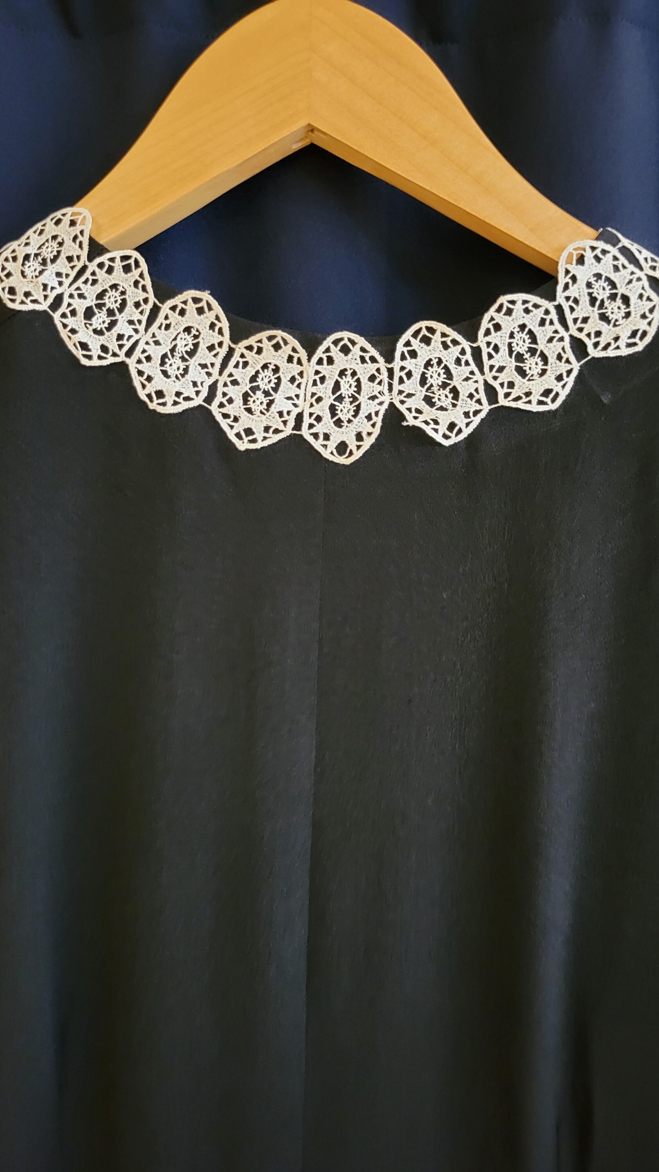 Made in Italy のハンドメイドのブラックサテンドレス。光沢のあるつるっとした素材感です。フロントのスナップボタン3つを開閉して着脱するデザインです。裏側には仕付け糸が付いたままになっていますが、ハンドメイドヴィンテージならではのため、そのままの状態でお届けいたします。繊細なヴィンテージレースが素敵な一着です。