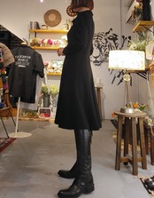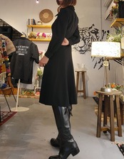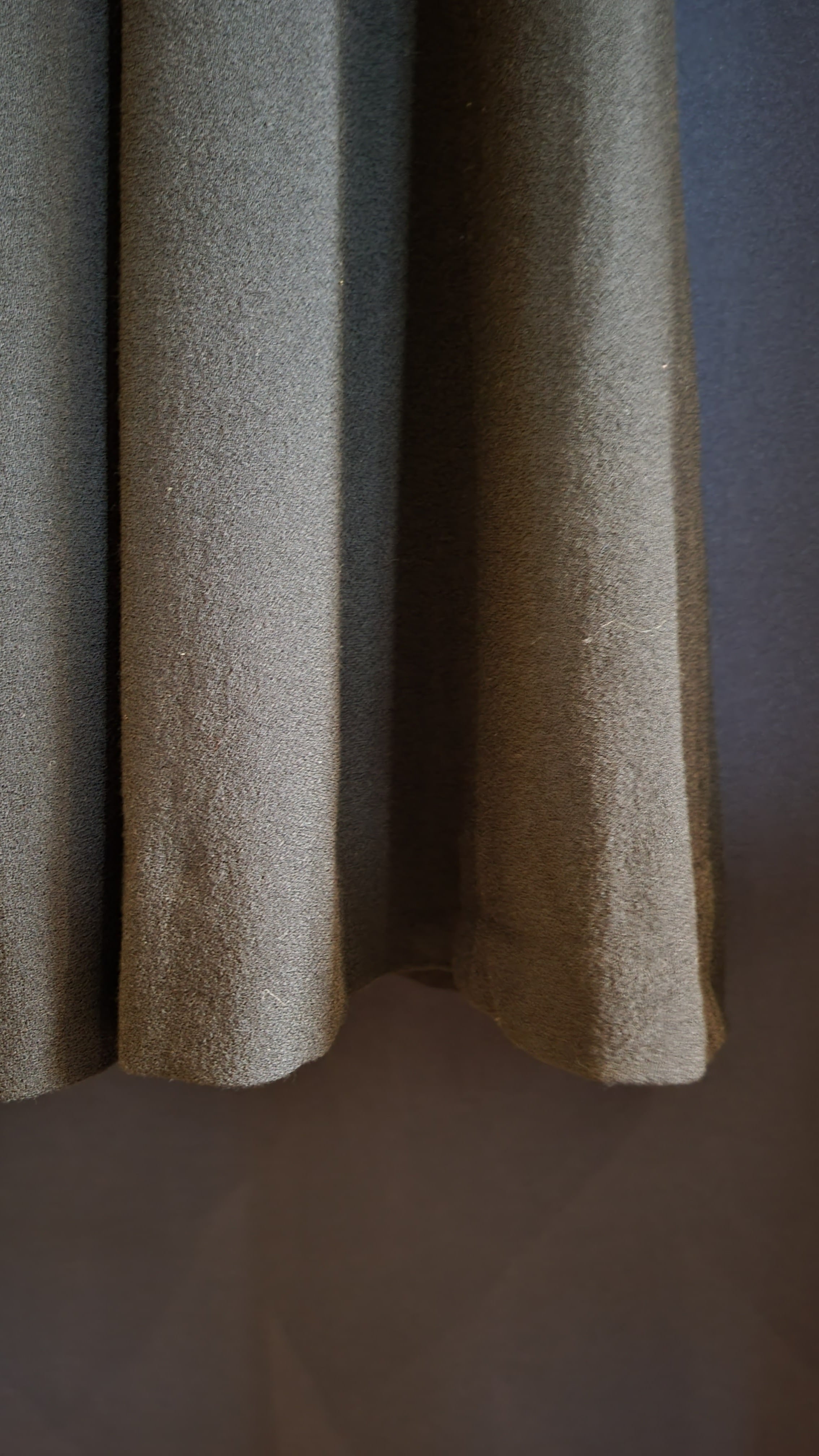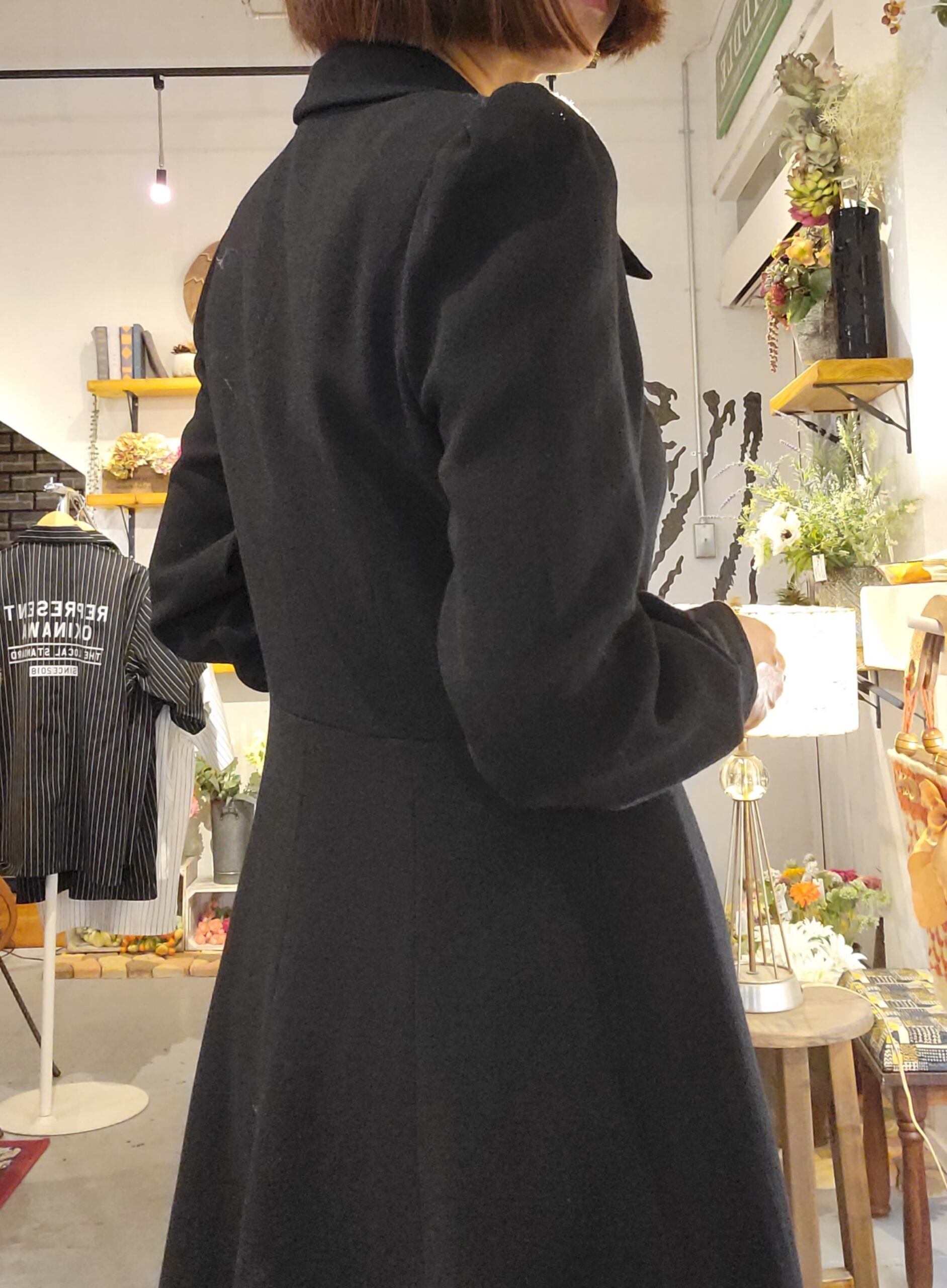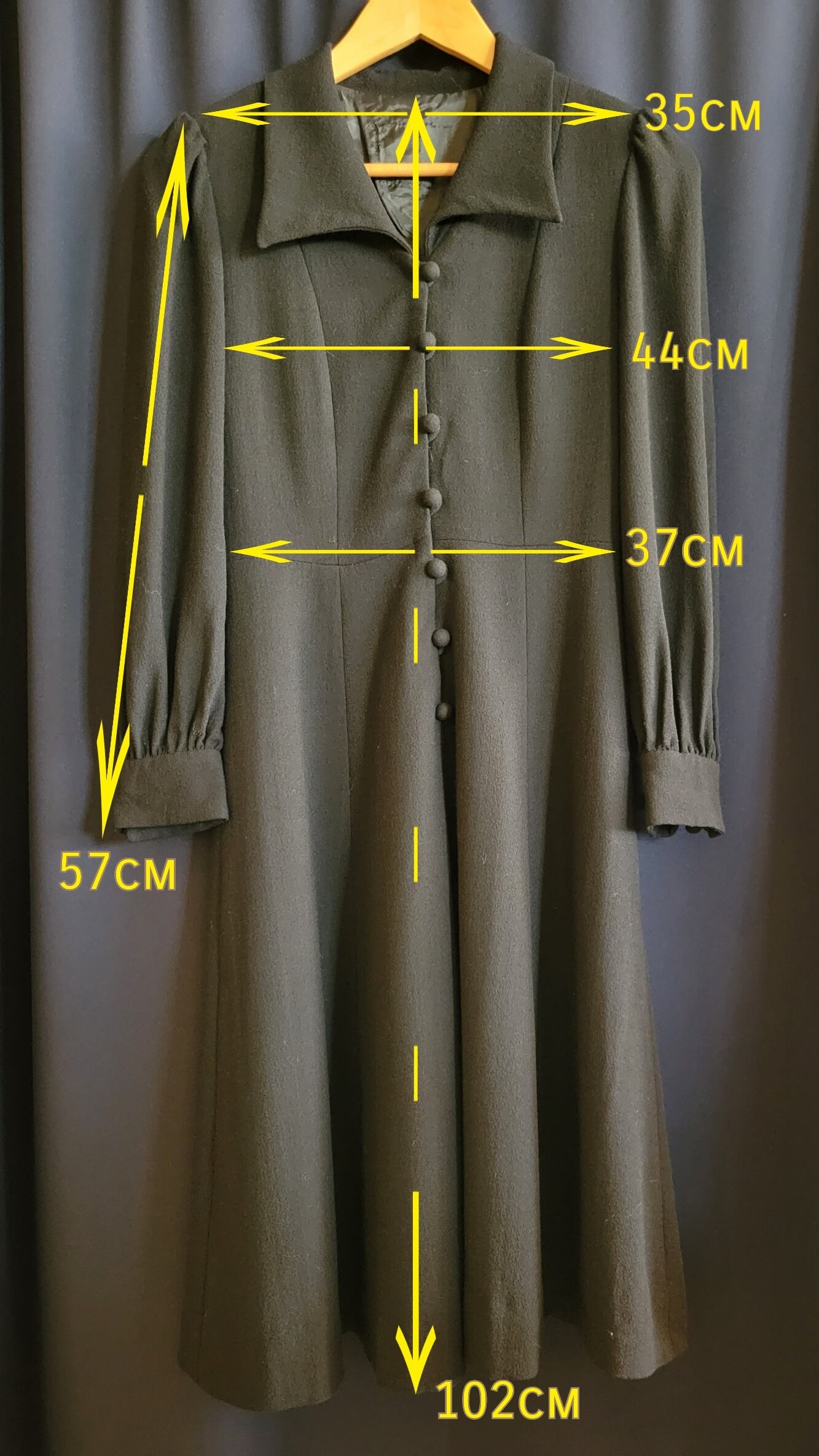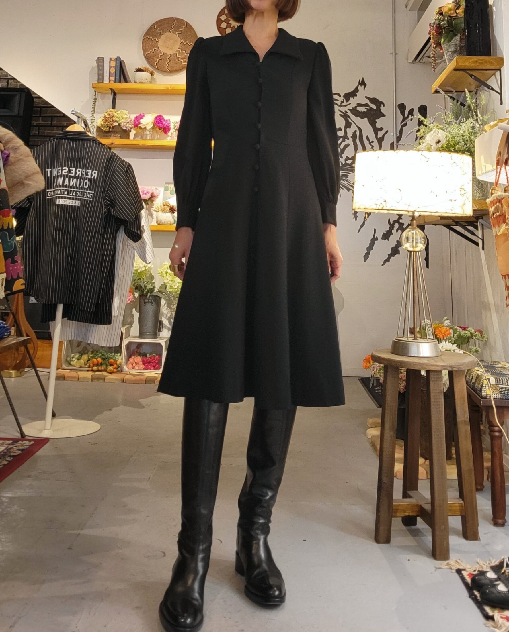 Made in Italy のヴィンテージブラックドレス。素材表記はありませんが、ややざらつき感のあるしっかりした素材感です。大きな襟やしっかり立ち上がる袖山、フロントに連なるくるみボタンがクラシカルな印象。仕立ての良さが伝わるシルエットのとても綺麗なドレスです。