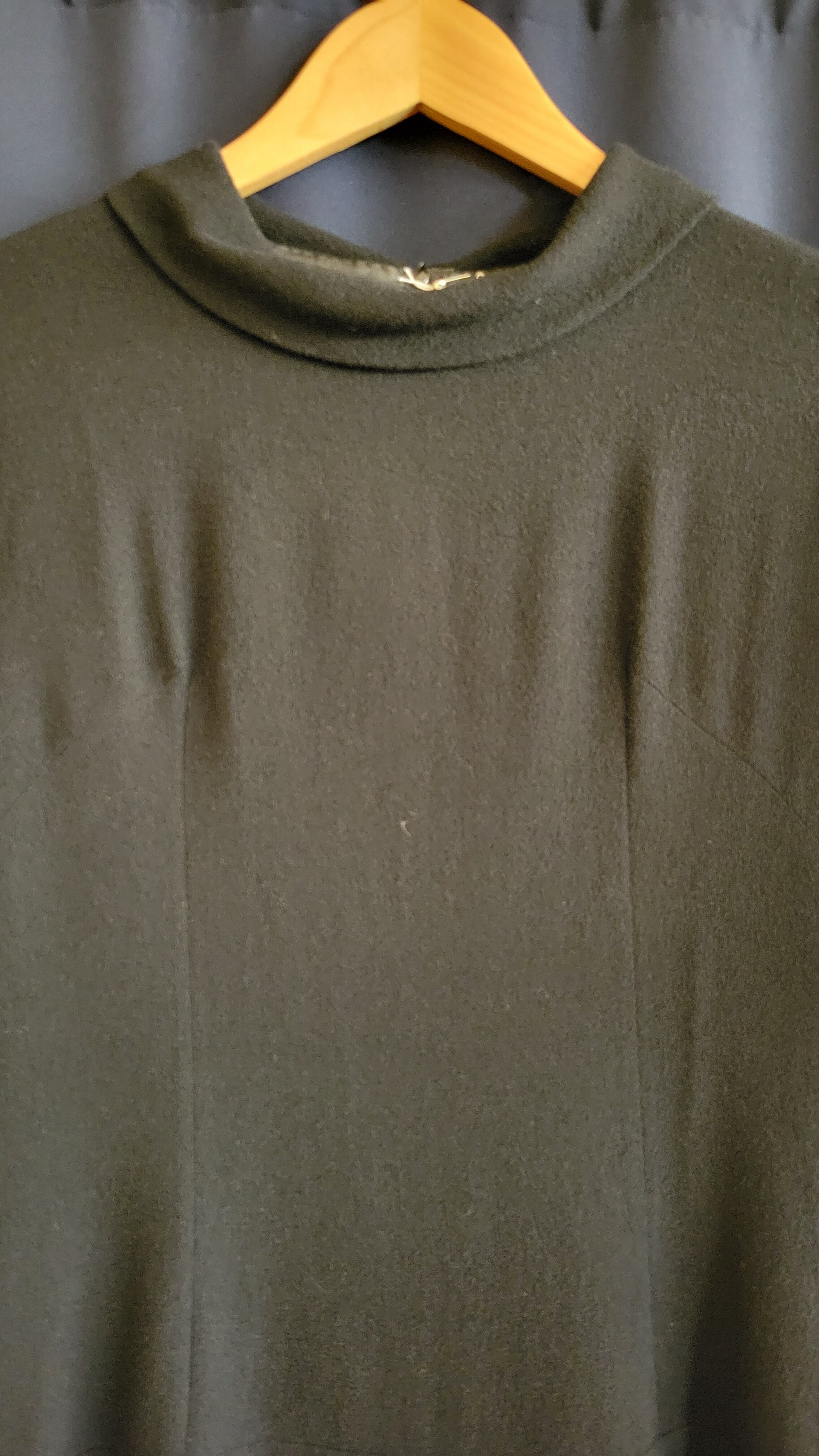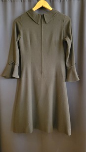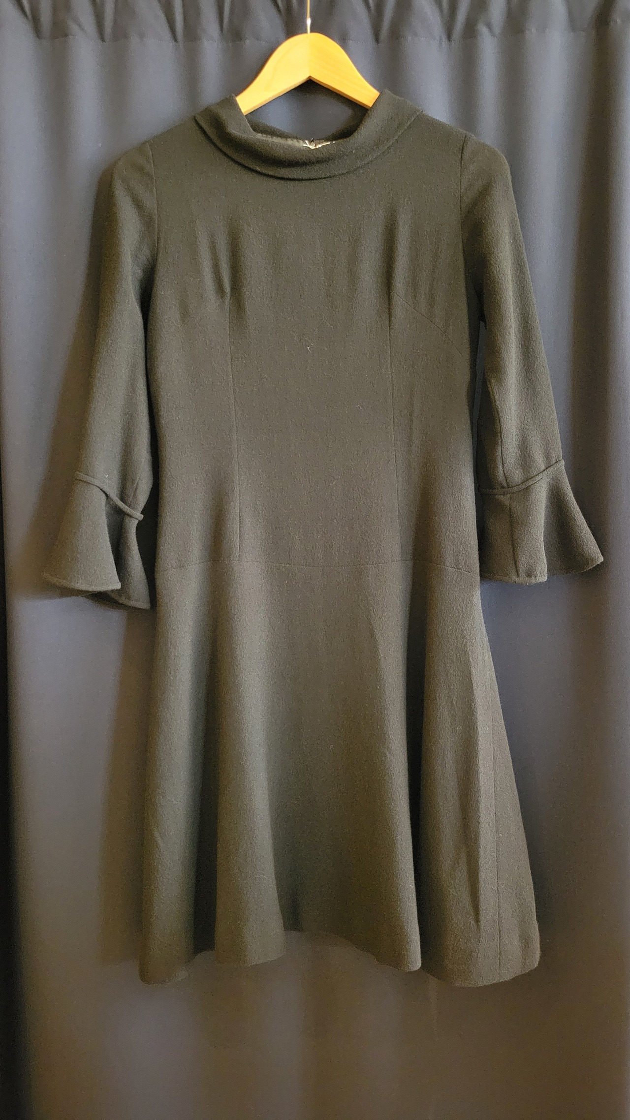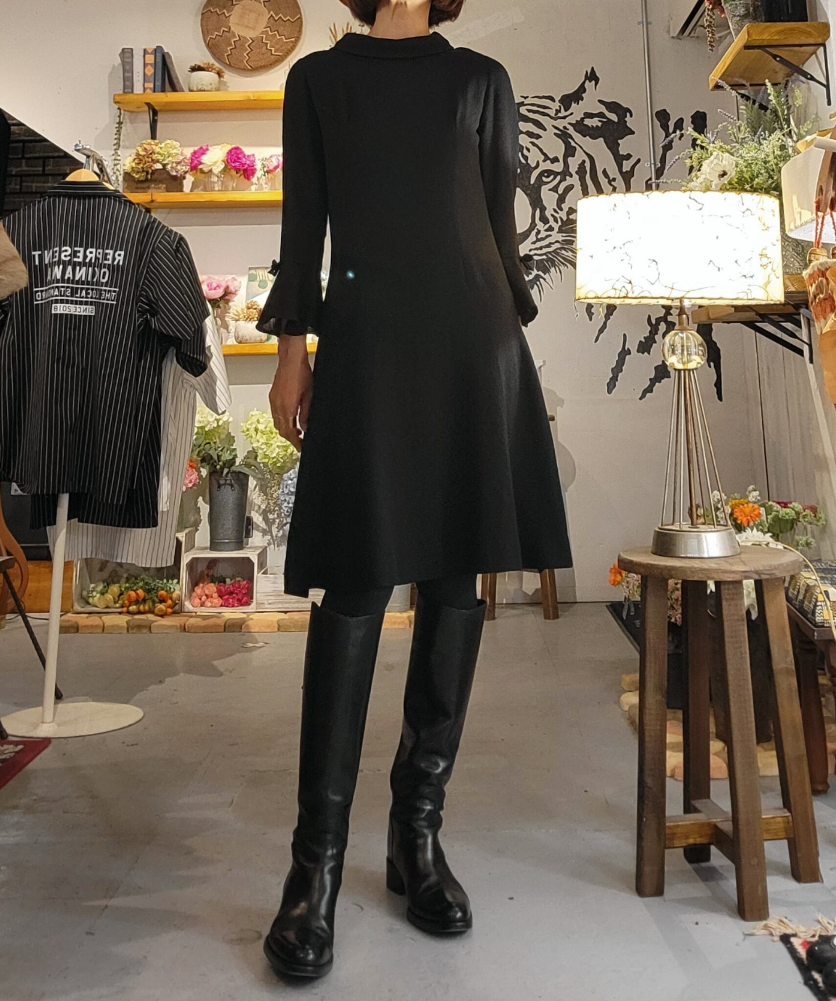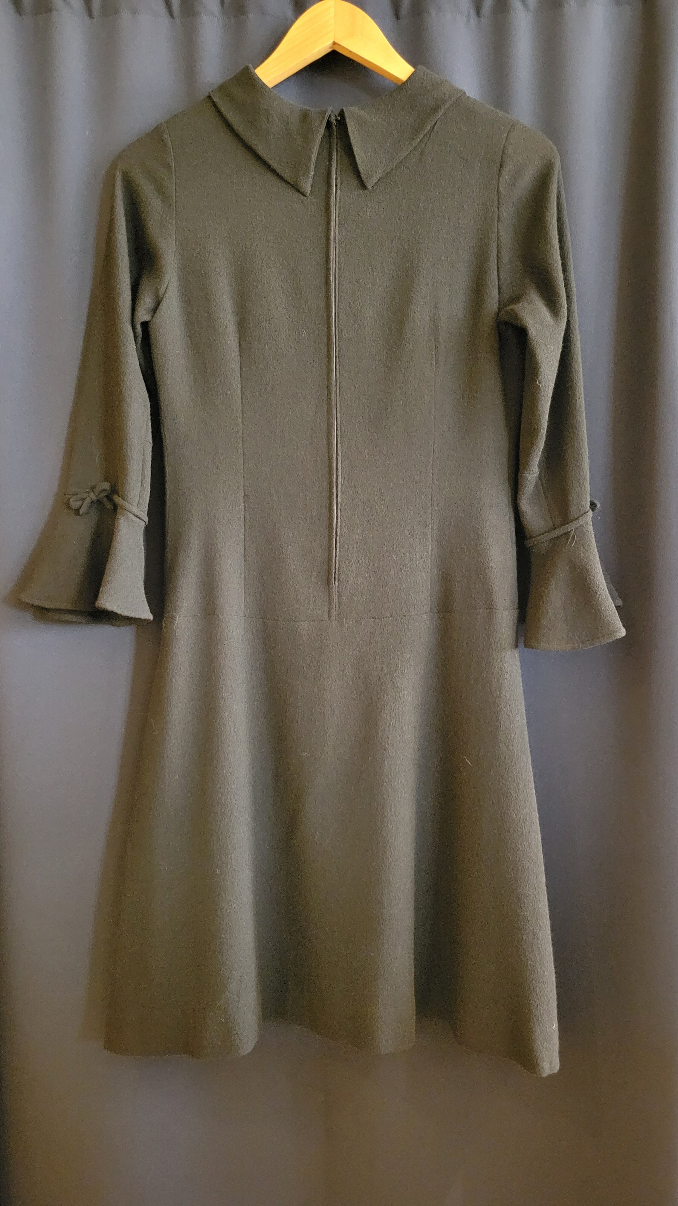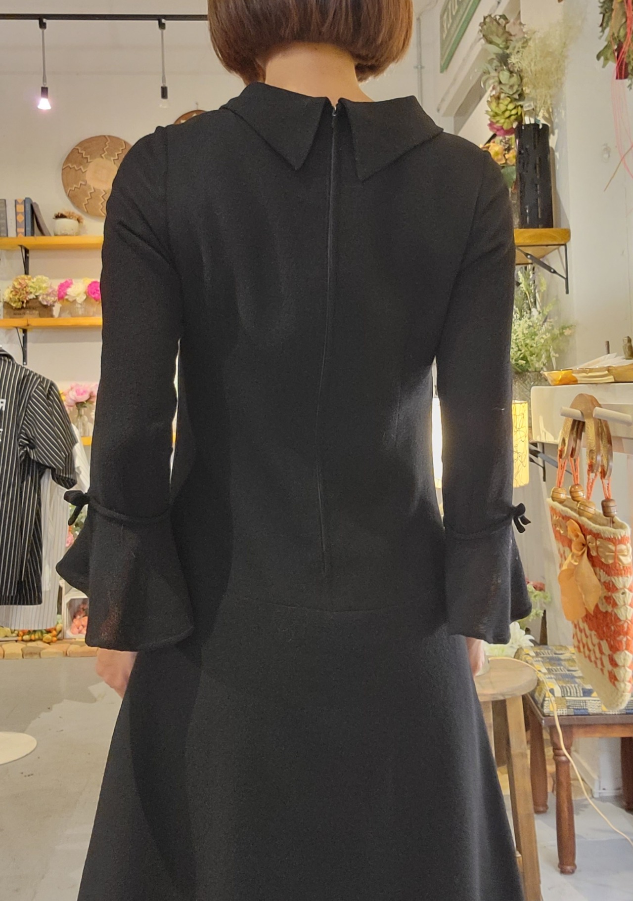 Made in Italy のヴィンテージブラックドレス。素材表記はありませんが、ややざらりとしていてウールの混紡素材のような素材のです。バックジッパー付き。シンプルなミニマルデザインの中、カフスのフレアとリボンがアクセントに。シンプルだけにシルエットの美しさが際立つ1枚です。