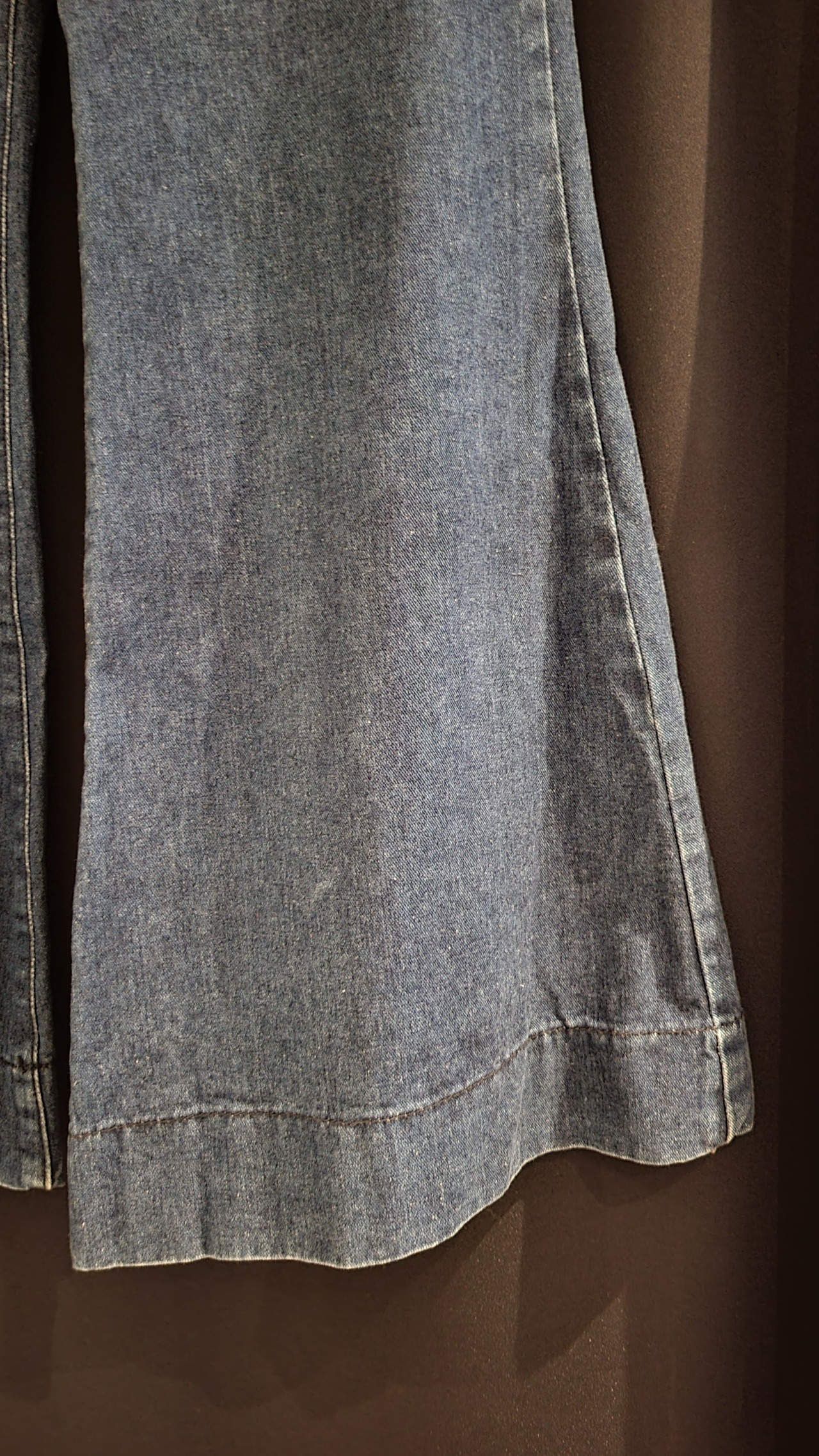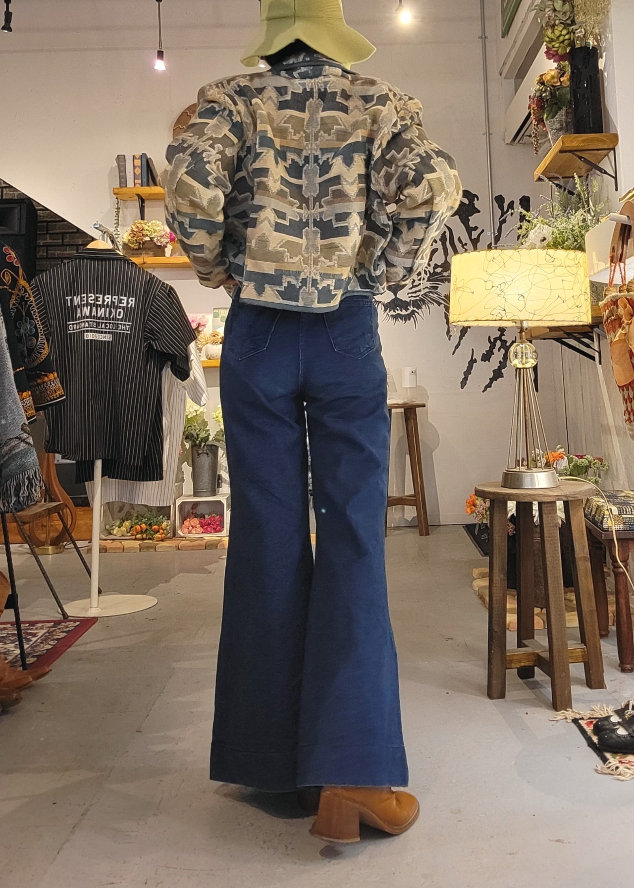 ヴィンテージのデニムフレアパンツ。ストレッチありです。ハイウエスト、フレアシルエット、クロシェ編みポケットで70sの雰囲気を楽しめます。デニムは厚手過ぎず動きやすい素材感です。
