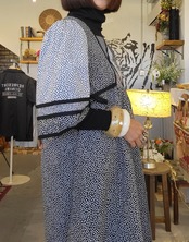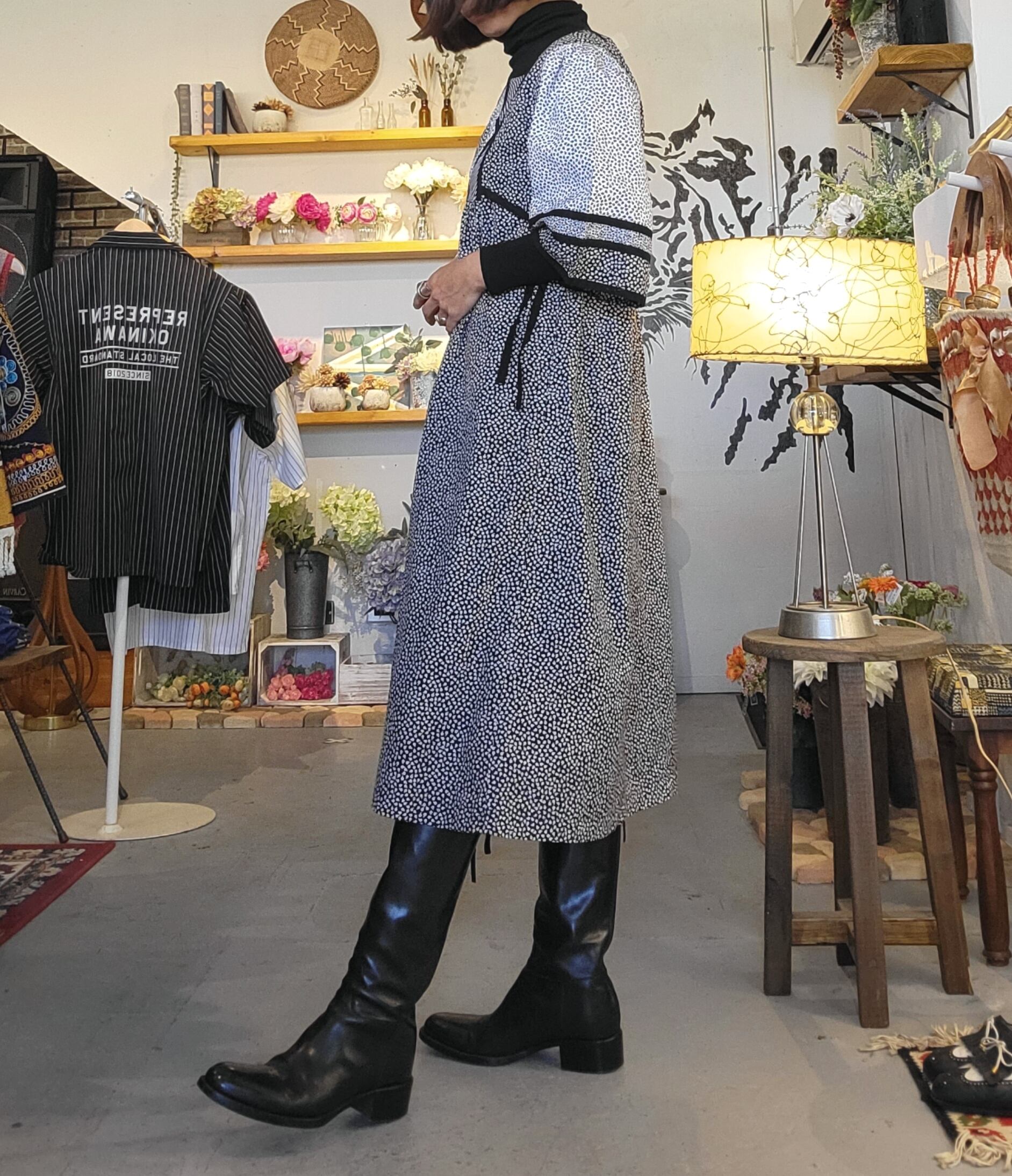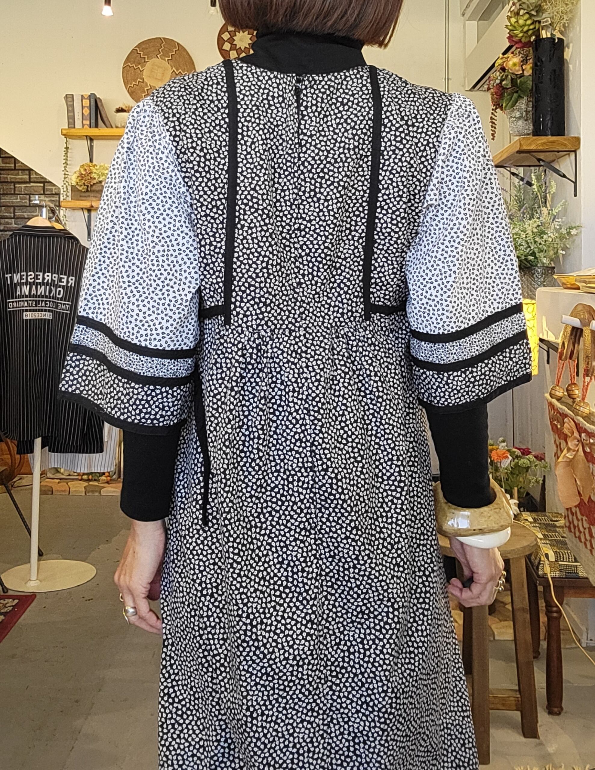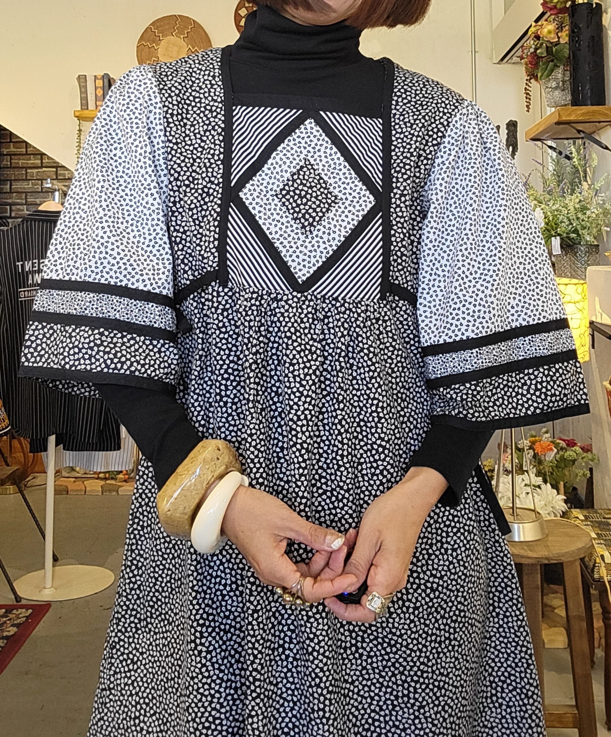 ヴィンテージのコットンドレス。胸元はパッチワークになっています。モノトーンで甘くなりすぎず、ブラックのラインが全体を引き締めています。ボトムにパンツを合わせてレイヤードスタイルもおすすめです。