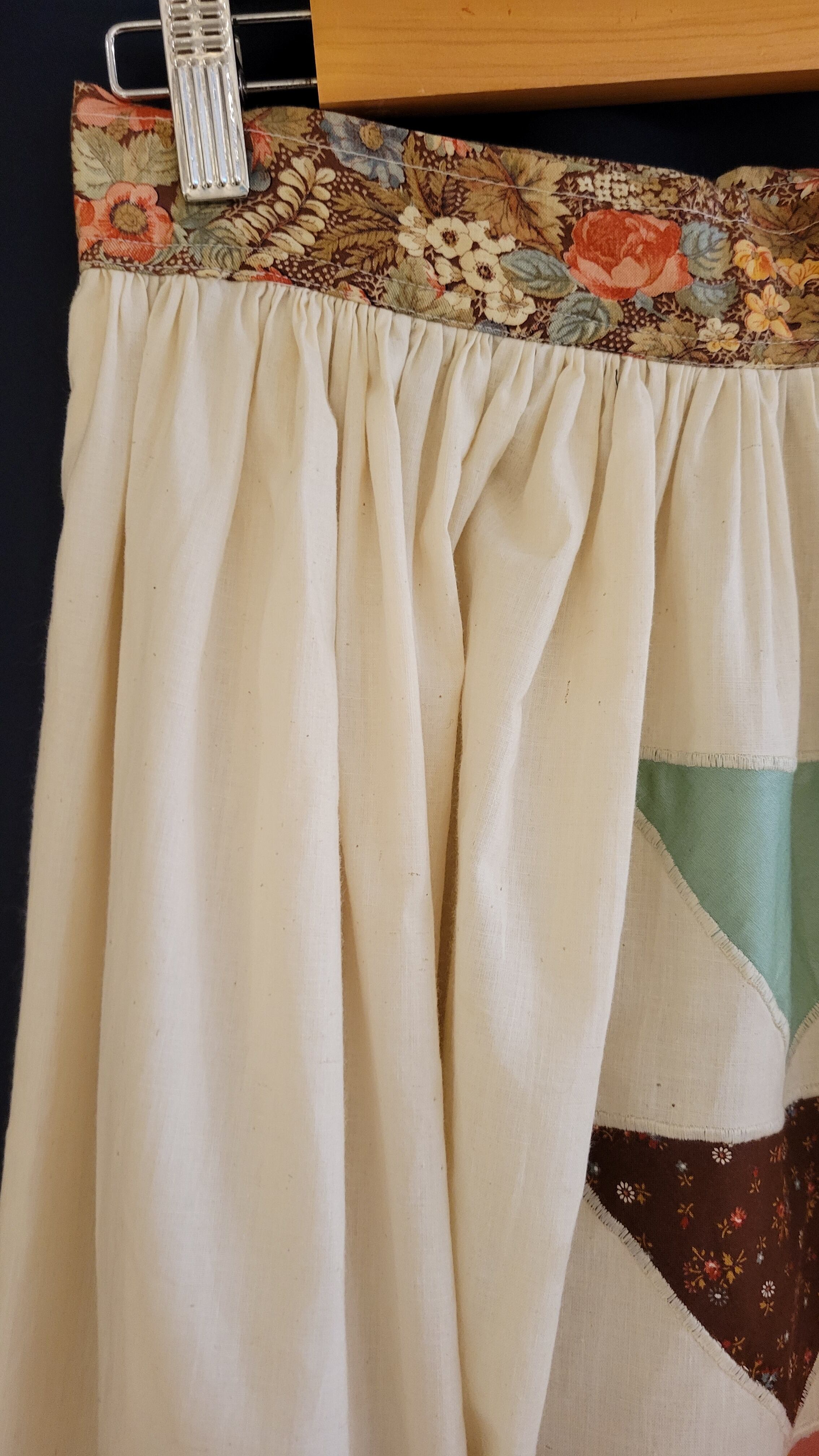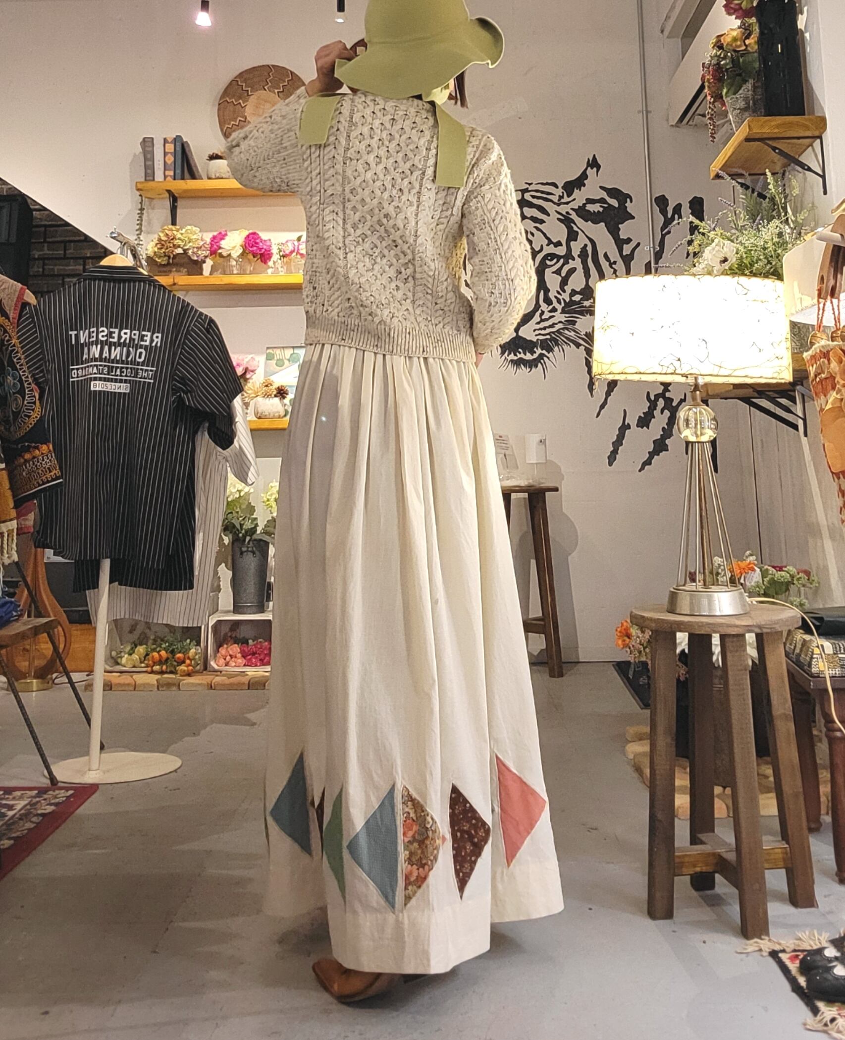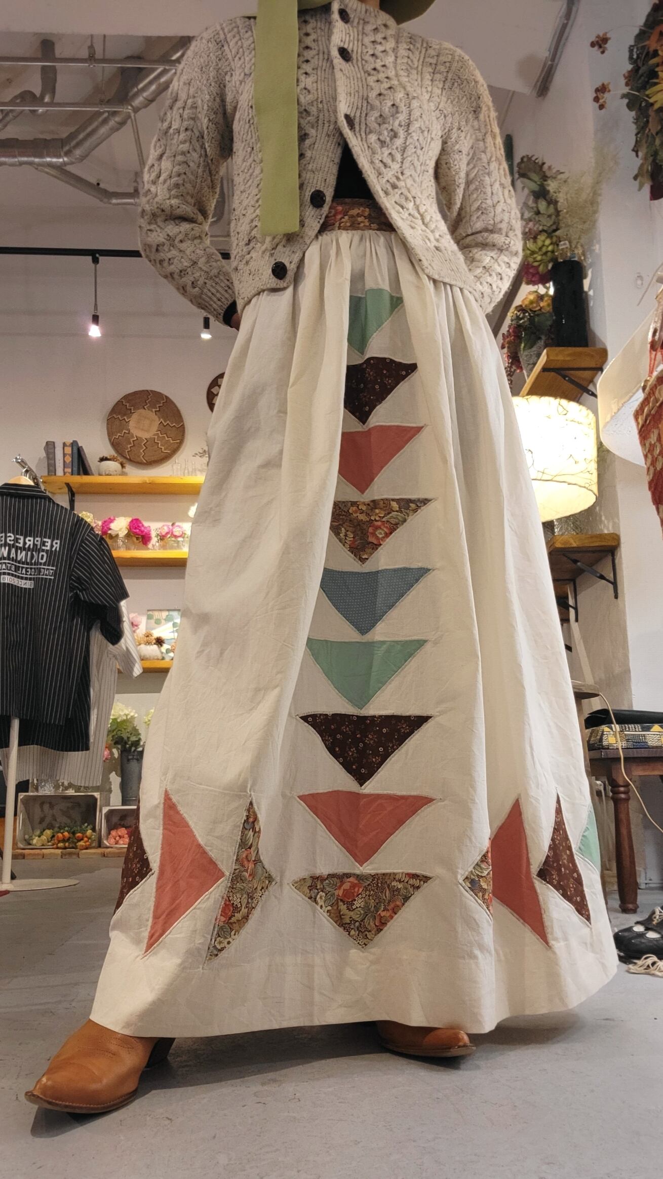 パッチワークが施されたヴィンテージマキシスカート。ハンドメイドのようです。素材はコットンです。白地に優しいカラーの三角パッチワークが連なる可愛らしいデザイン。ウエストはホックがひとつ付いています。ジッパーは無く、ホック下の布が合わさる形です。ホック位置を付け替えてウエストサイズの調整ができます。デザイン性は損なわれません。