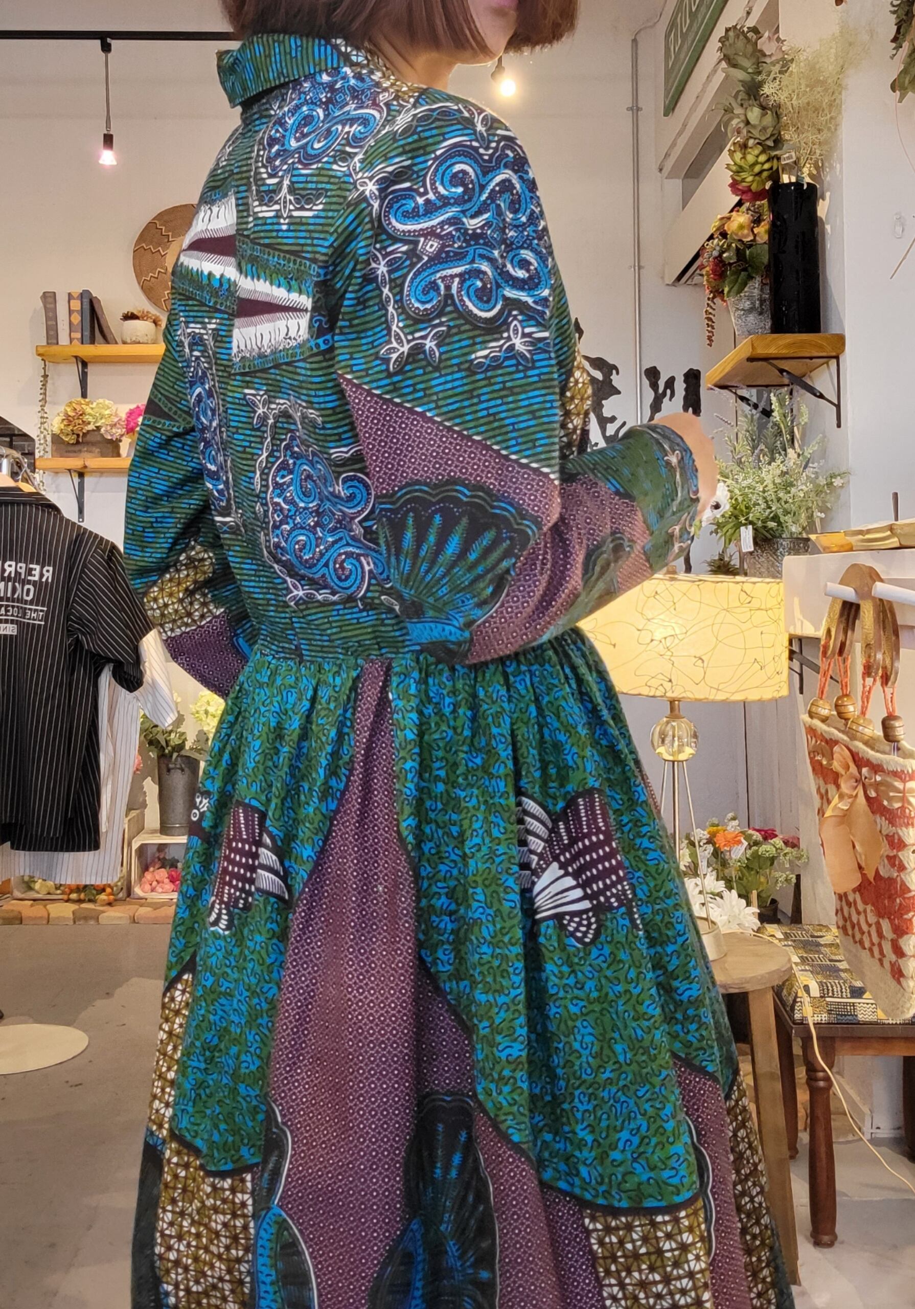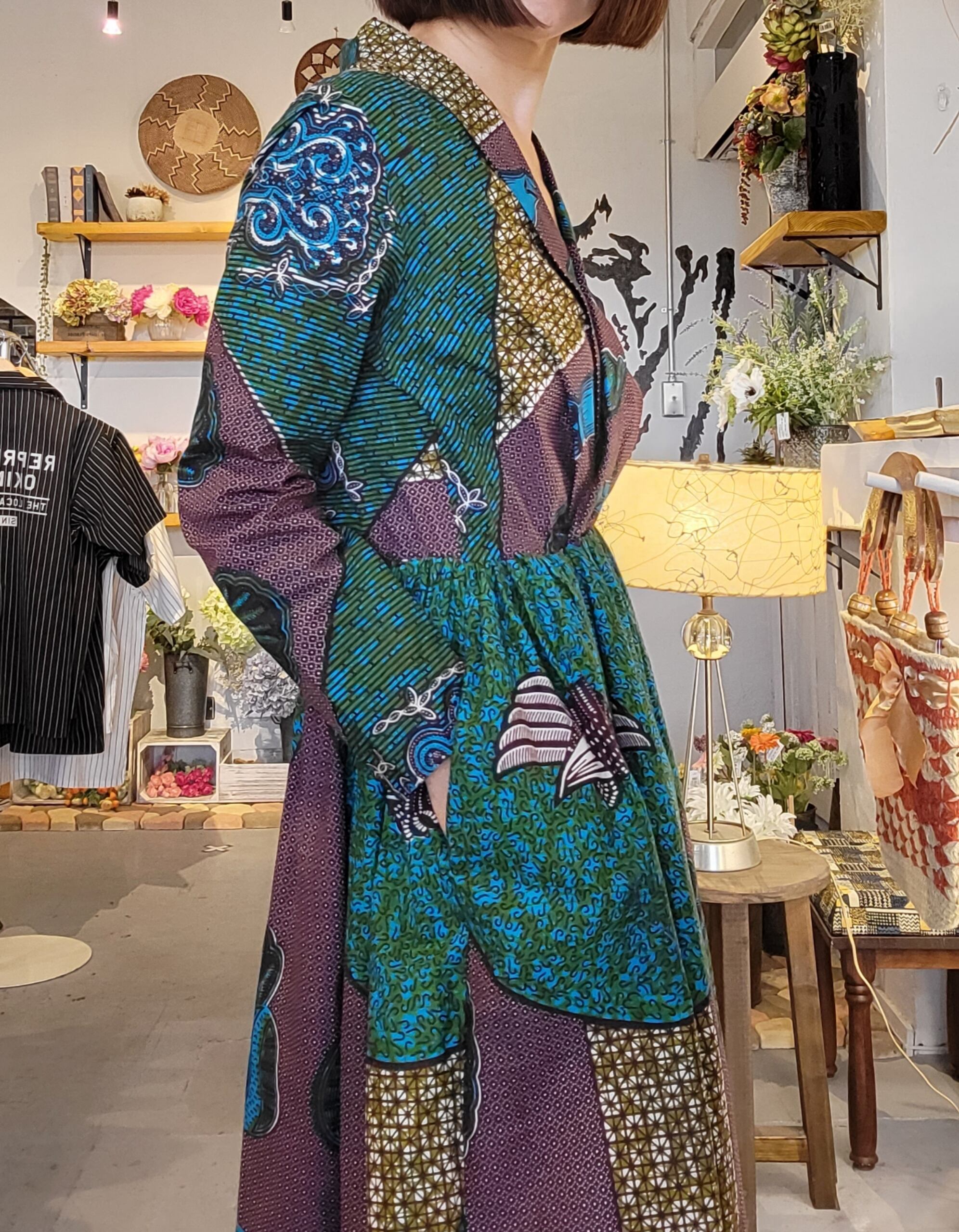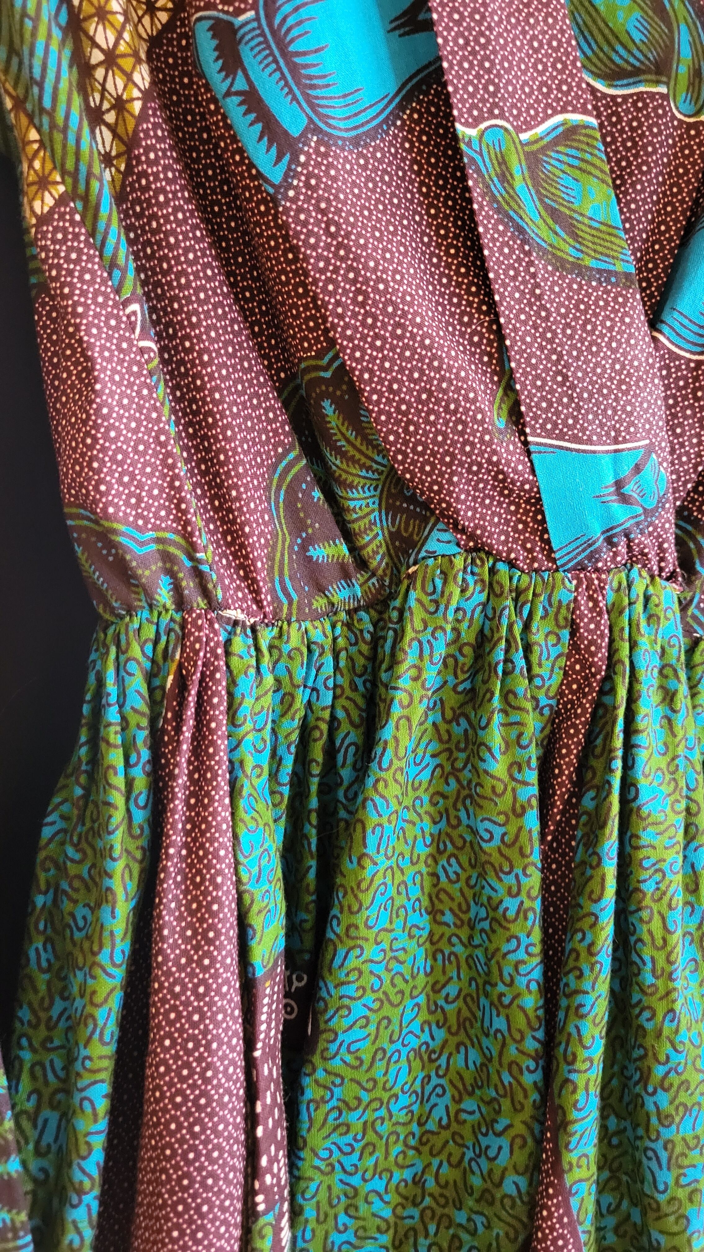 ヴィンテージのアフリカンバティックワンピース。素材はコットン、張り感があるためきれいなふんわりシルエットが叶います。ウエストゴム、バックファスナー付き。カシュクール×渋めカラーで大人っぽく着られます。ボトムにマキシスカートを合わせてレイヤードにもおすすめです。