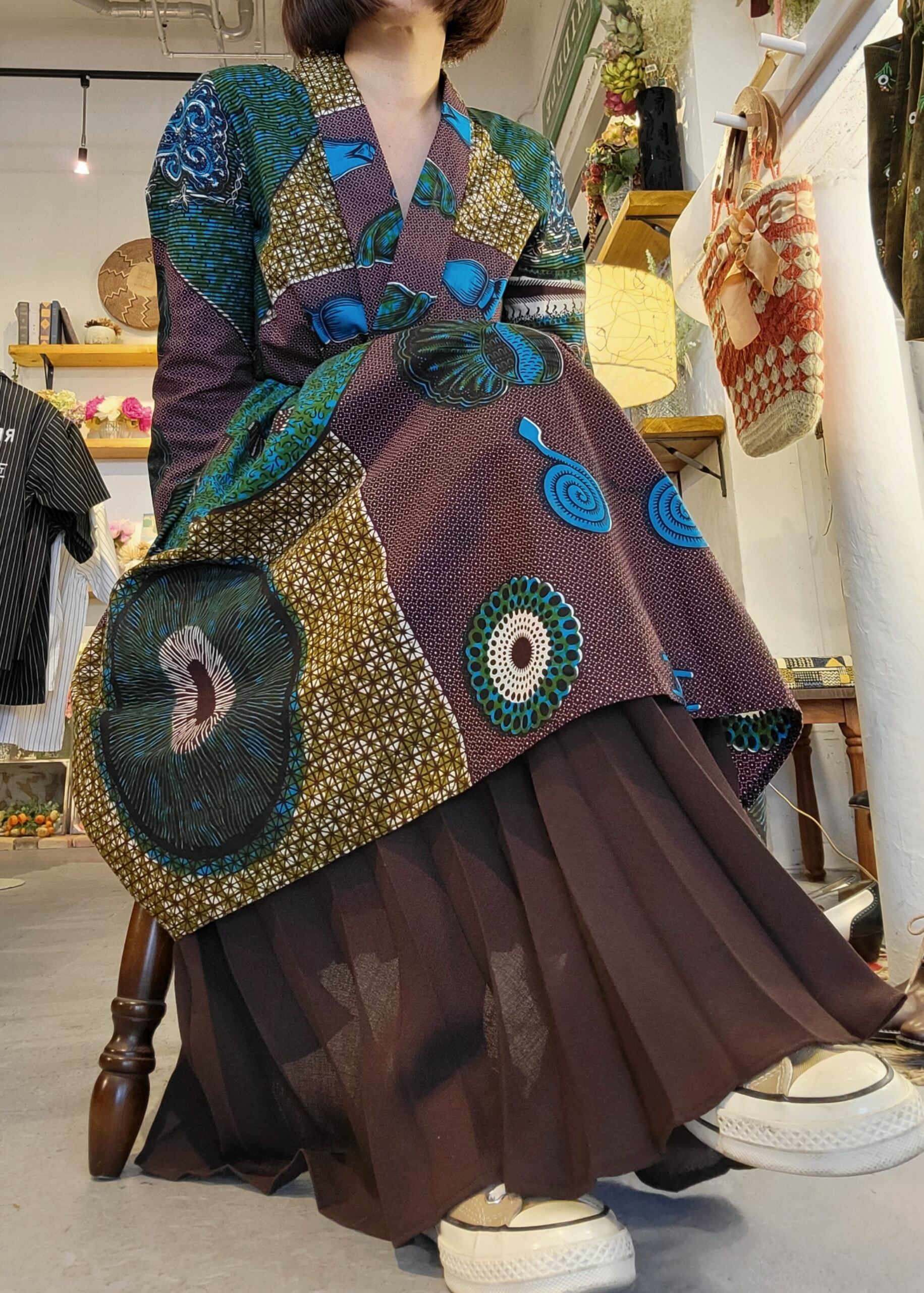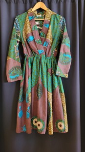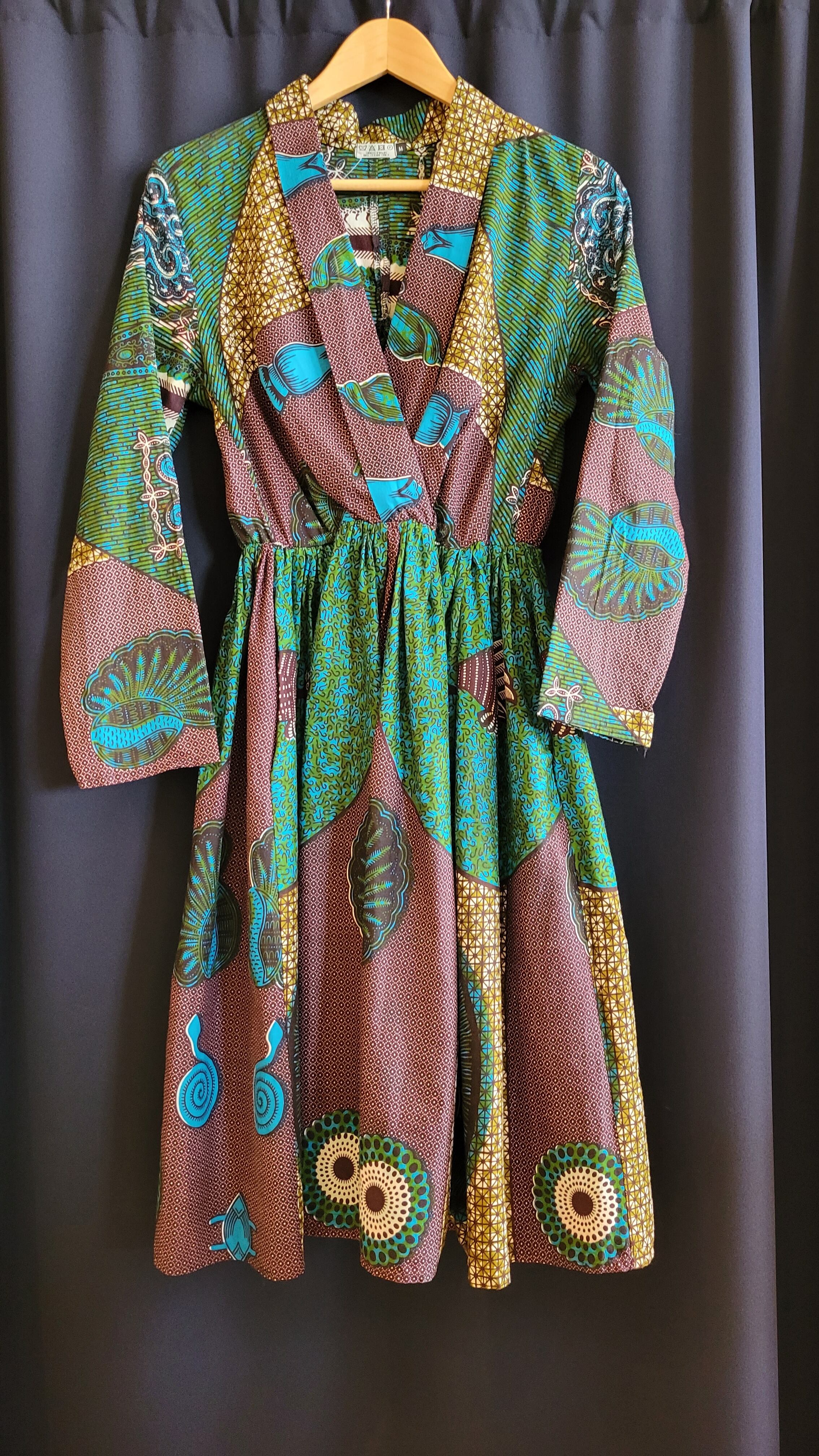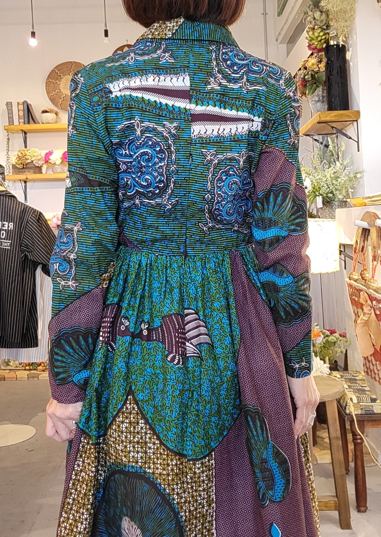 ヴィンテージのアフリカンバティックワンピース。素材はコットン、張り感があるためきれいなふんわりシルエットが叶います。ウエストゴム、バックファスナー付き。カシュクール×渋めカラーで大人っぽく着られます。ボトムにマキシスカートを合わせてレイヤードにもおすすめです。
