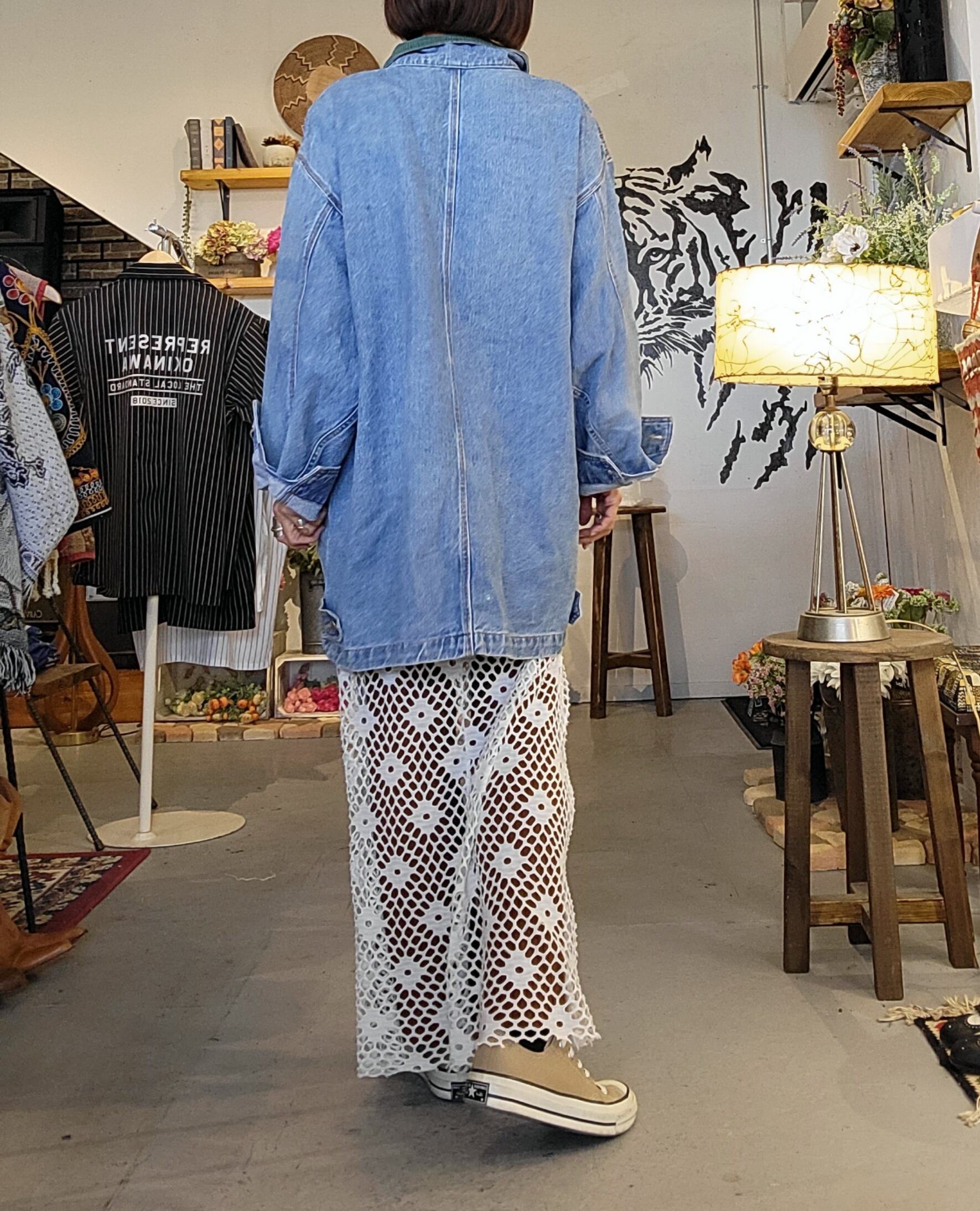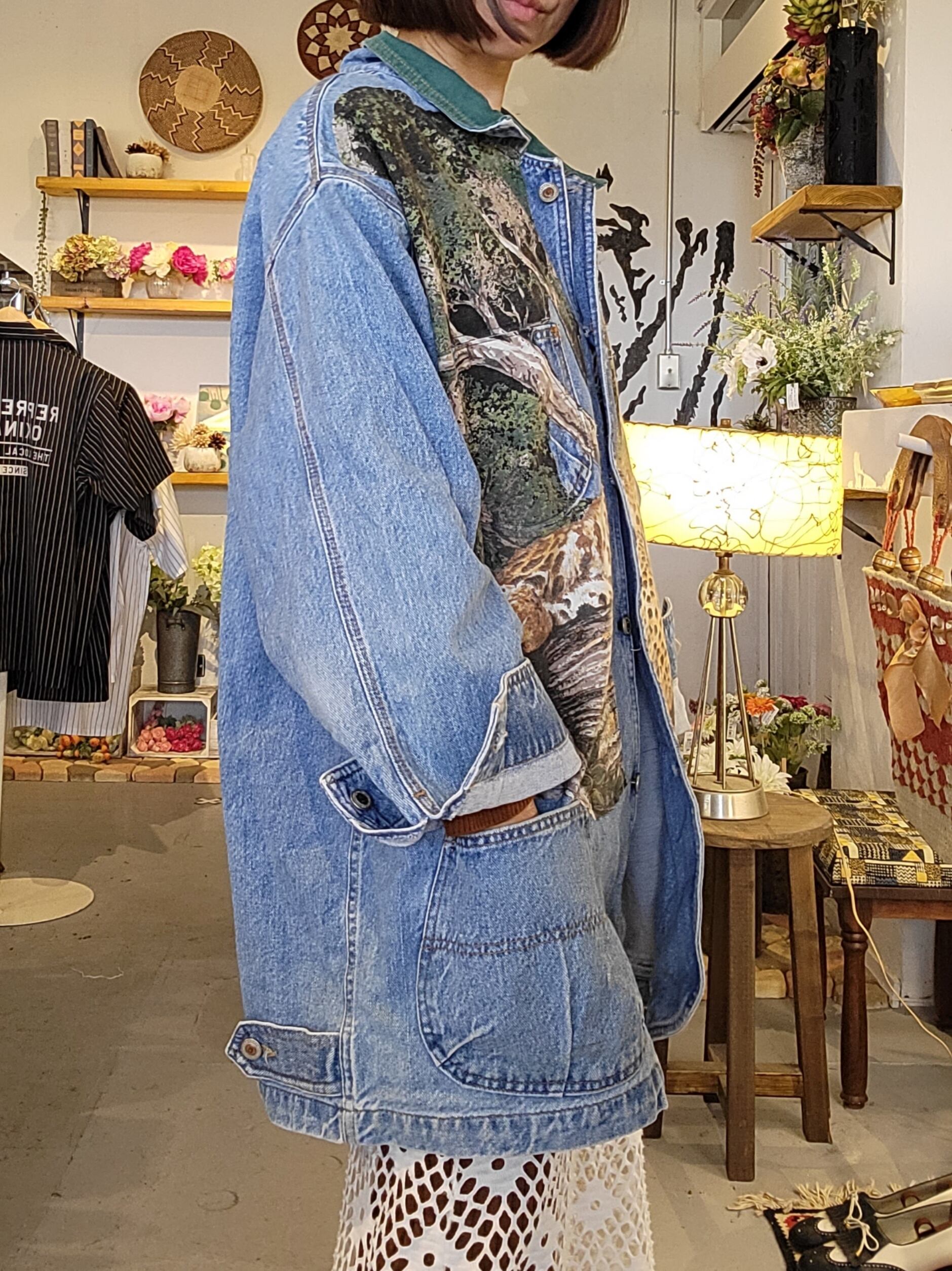 Made in USA のヴィンテージデニムジャケット。インパクトのある柄はプリントではなく別布を縫い付けたパッチワークになっています。女性がビッグシルエットで着てかっこいいデザイン。