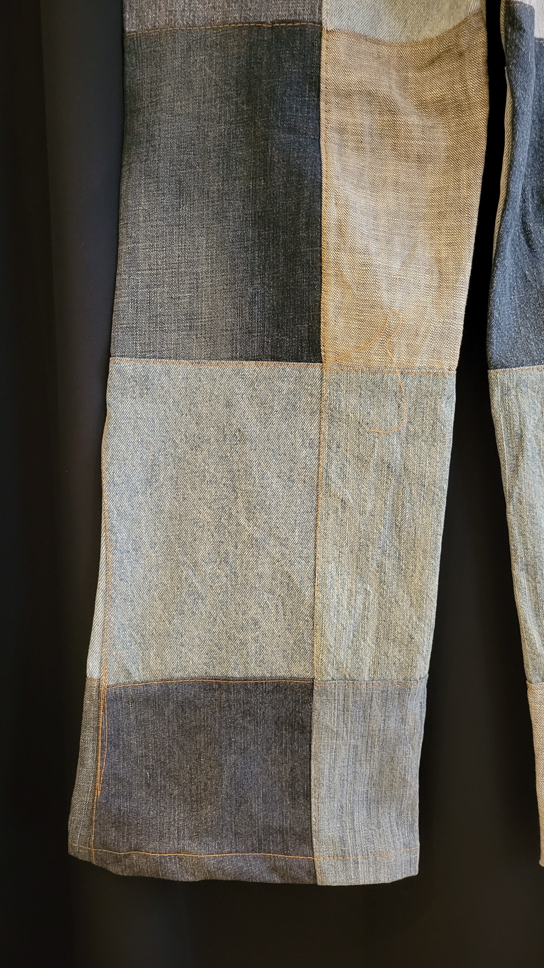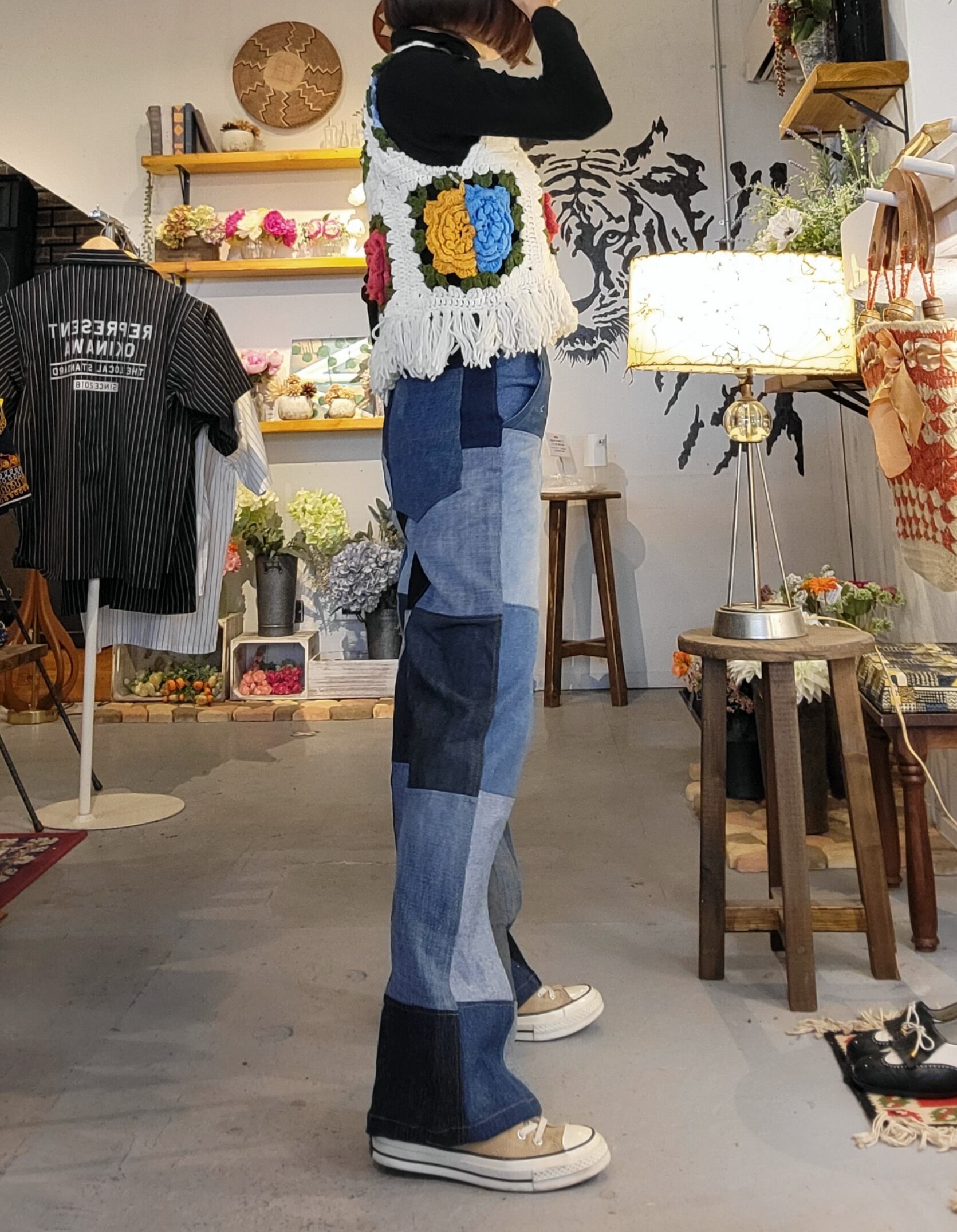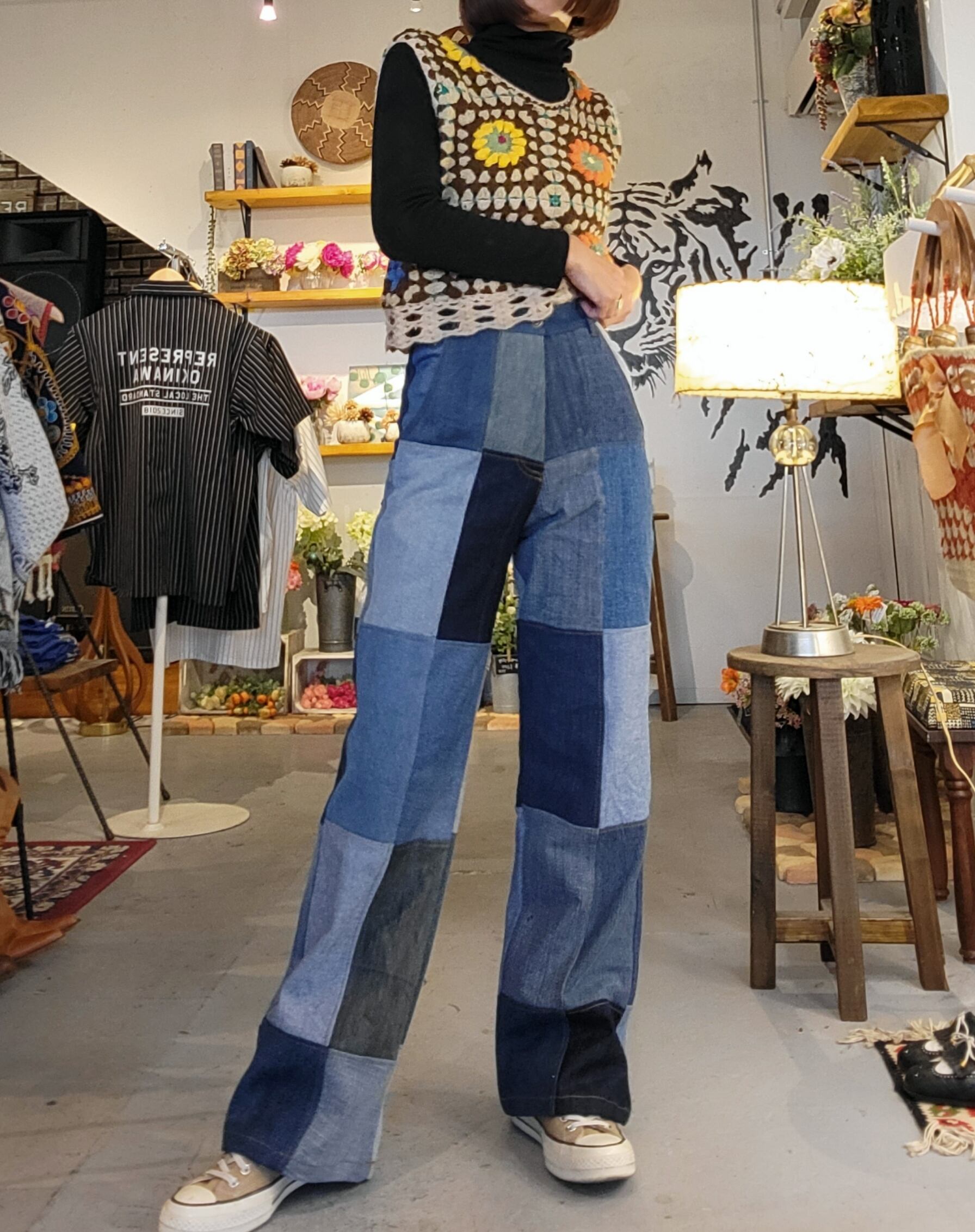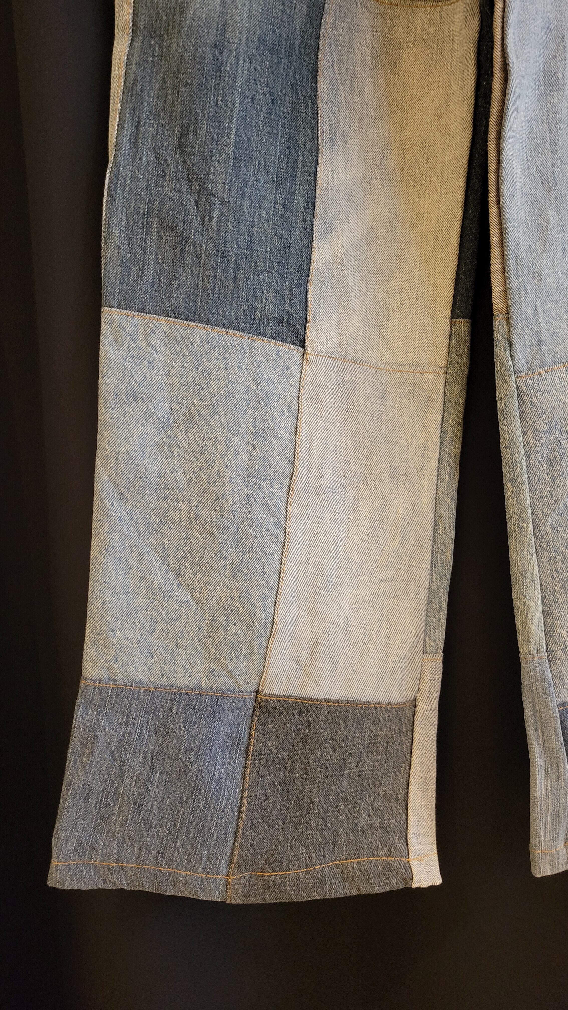古着のデニムの布片をパッチワークで縫い合わせて製作したリメイクパンツです。太過ぎずほどよいわたりと裾幅のストレートシルエット。ハイウエストの安定感が履き心地の良さのポイントです。*着用画像は参考用です。実際のお品は商品画像になり、1本ずつ濃淡の配置や使用している生地の異なる一点ものです。