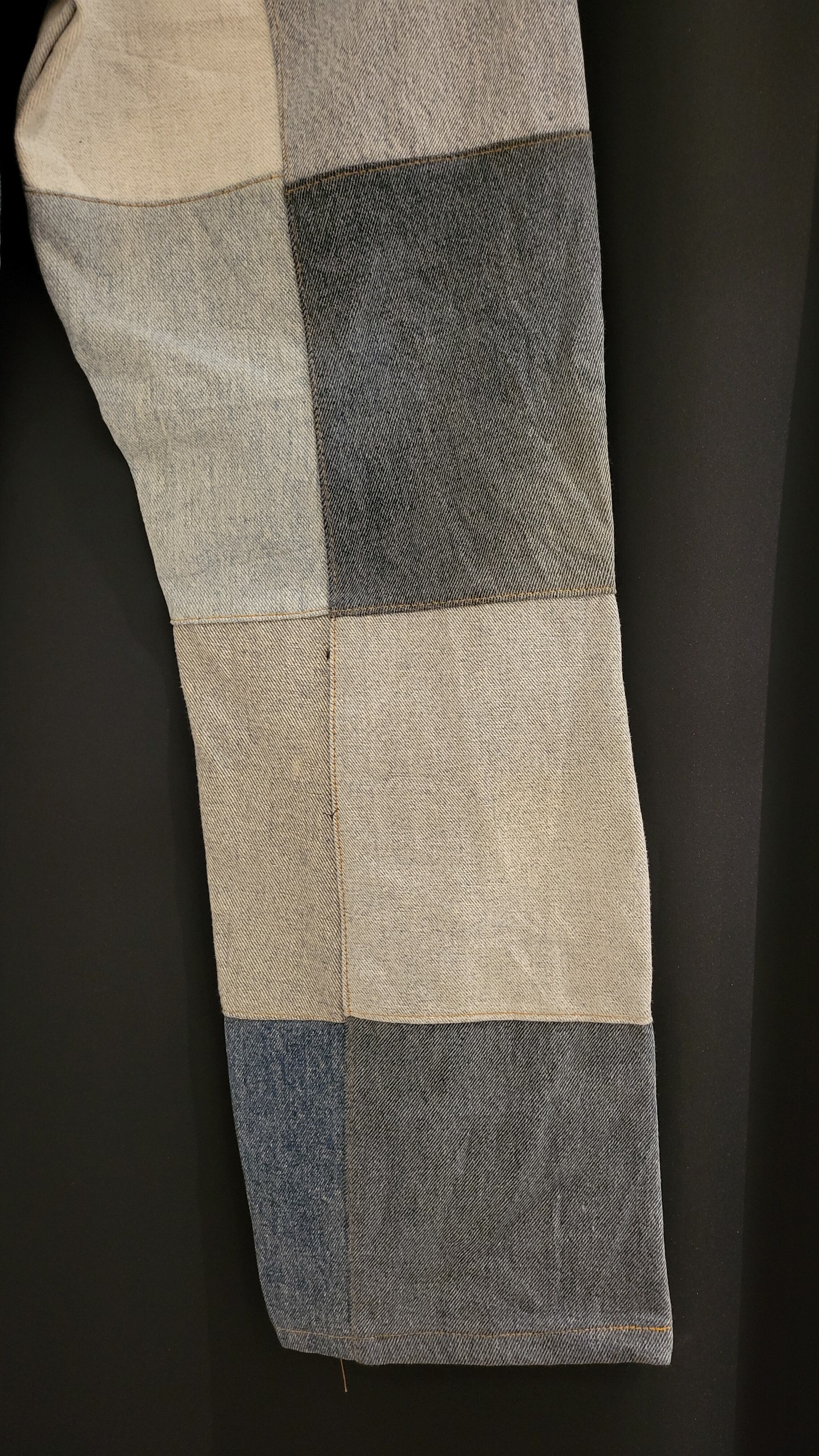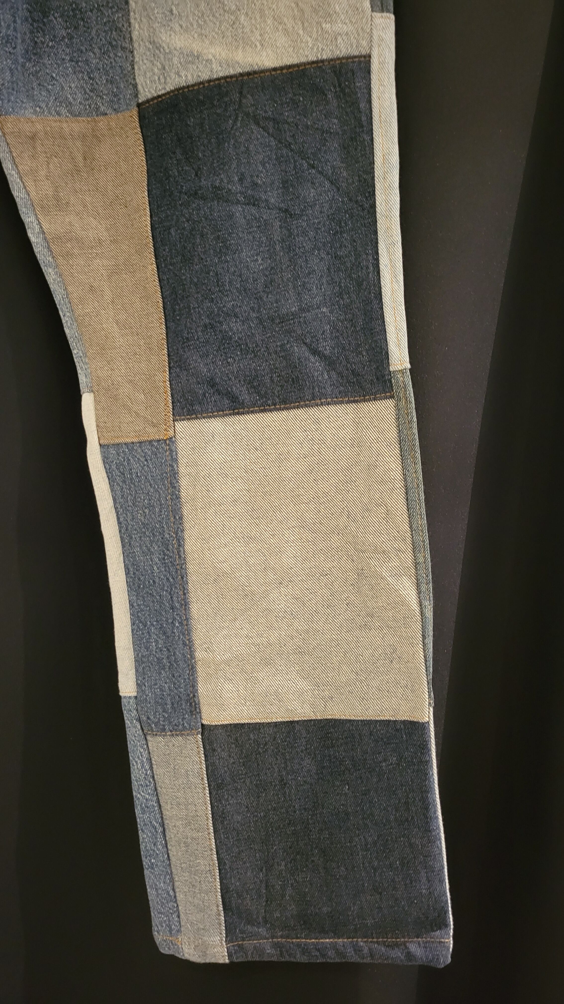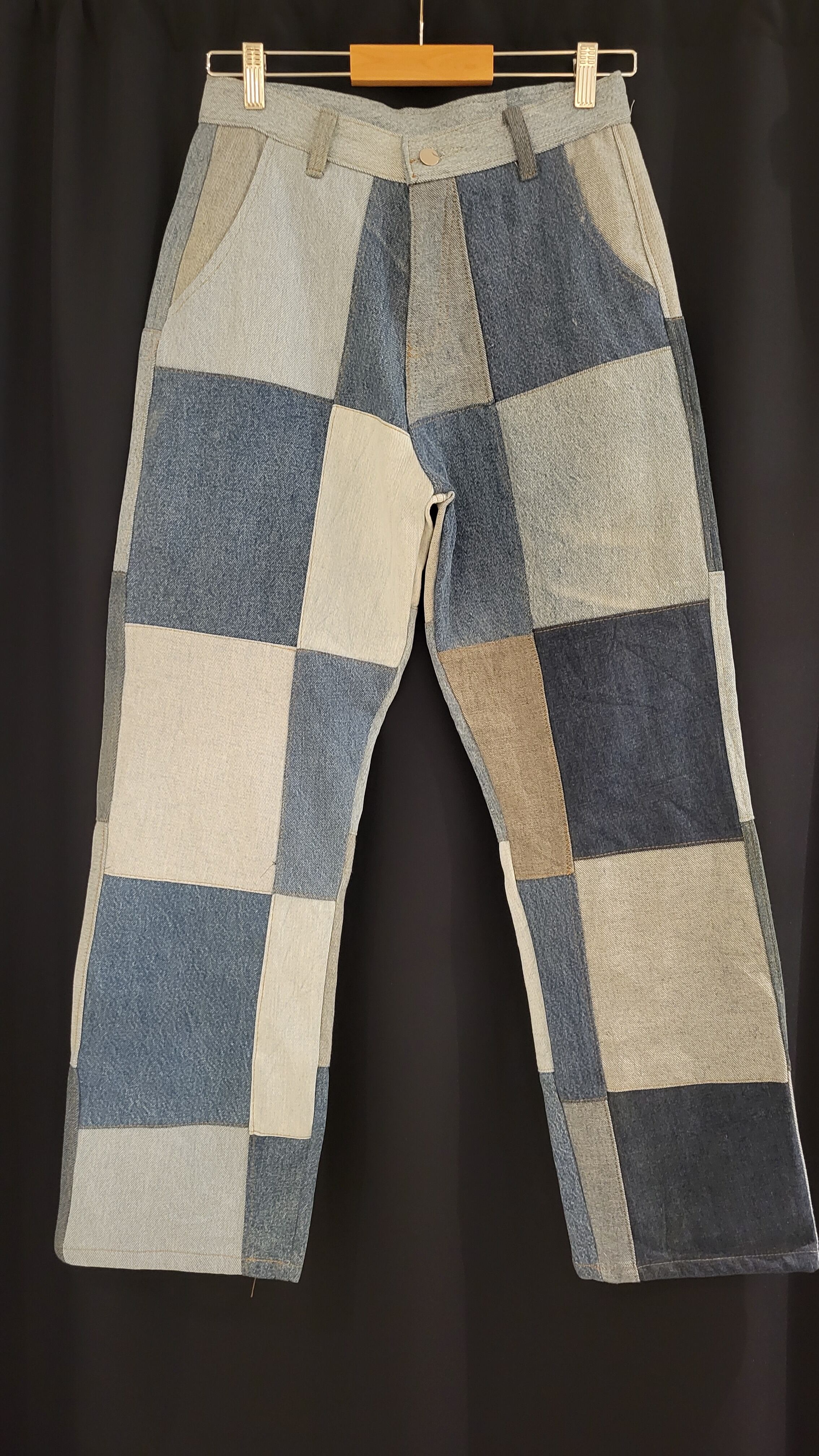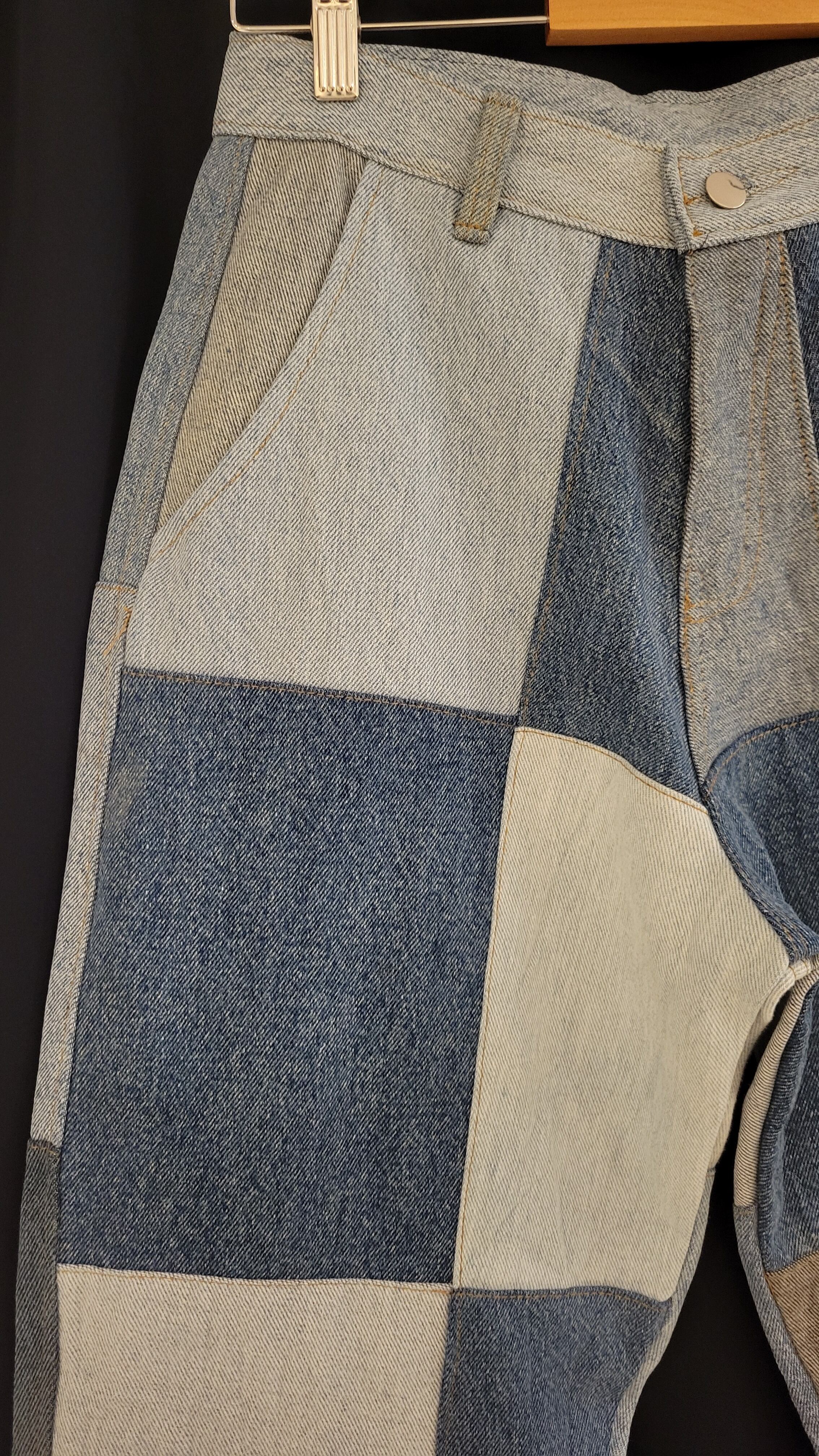古着のデニムの布片をパッチワークで縫い合わせて製作したリメイクパンツです。太過ぎずほどよいわたりと裾幅のストレートシルエット。ハイウエストの安定感が履き心地の良さのポイントです。*着用画像は参考用です。実際のお品は商品画像になり、1本ずつ濃淡の配置や使用している生地の異なる一点ものです。