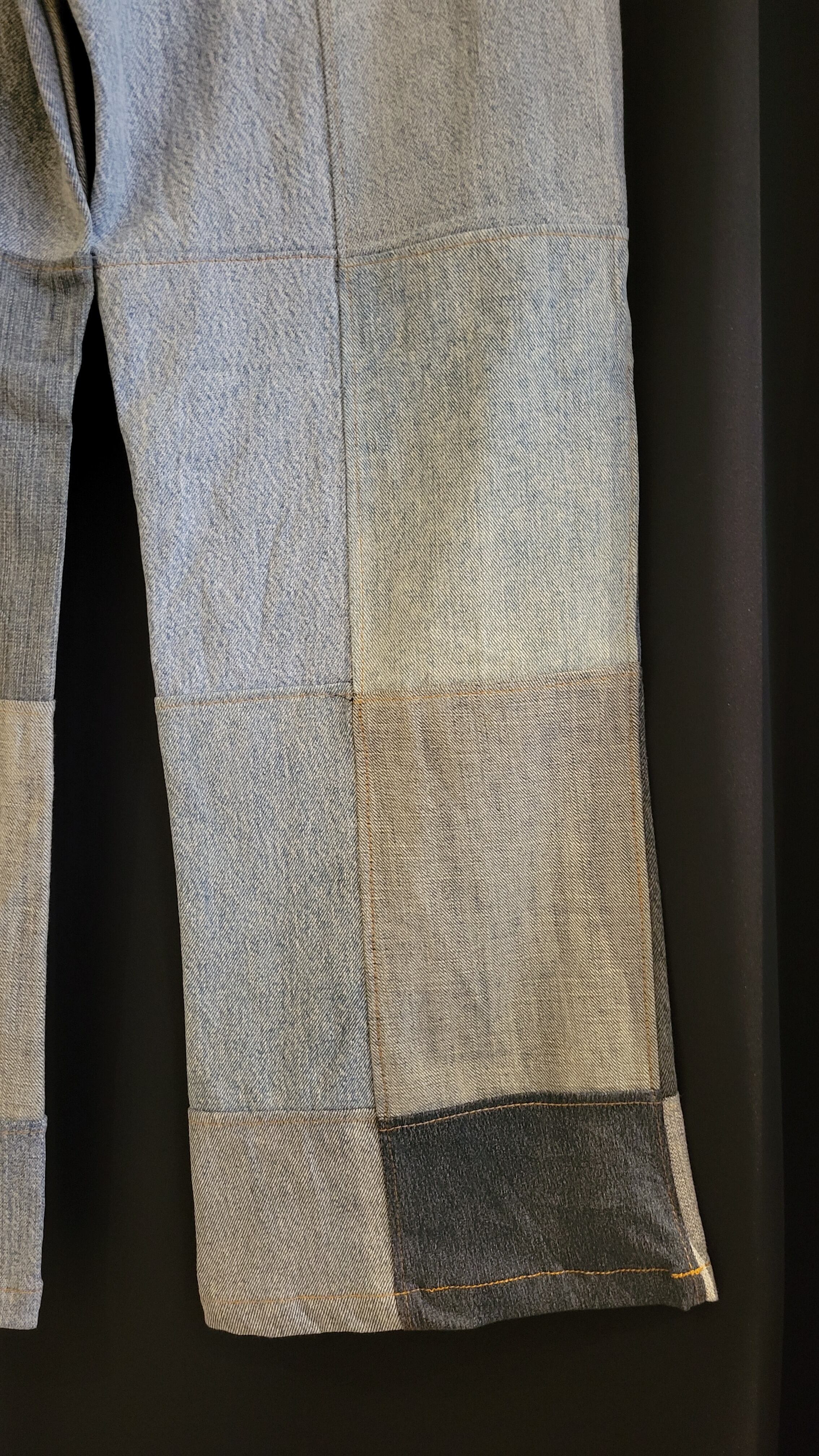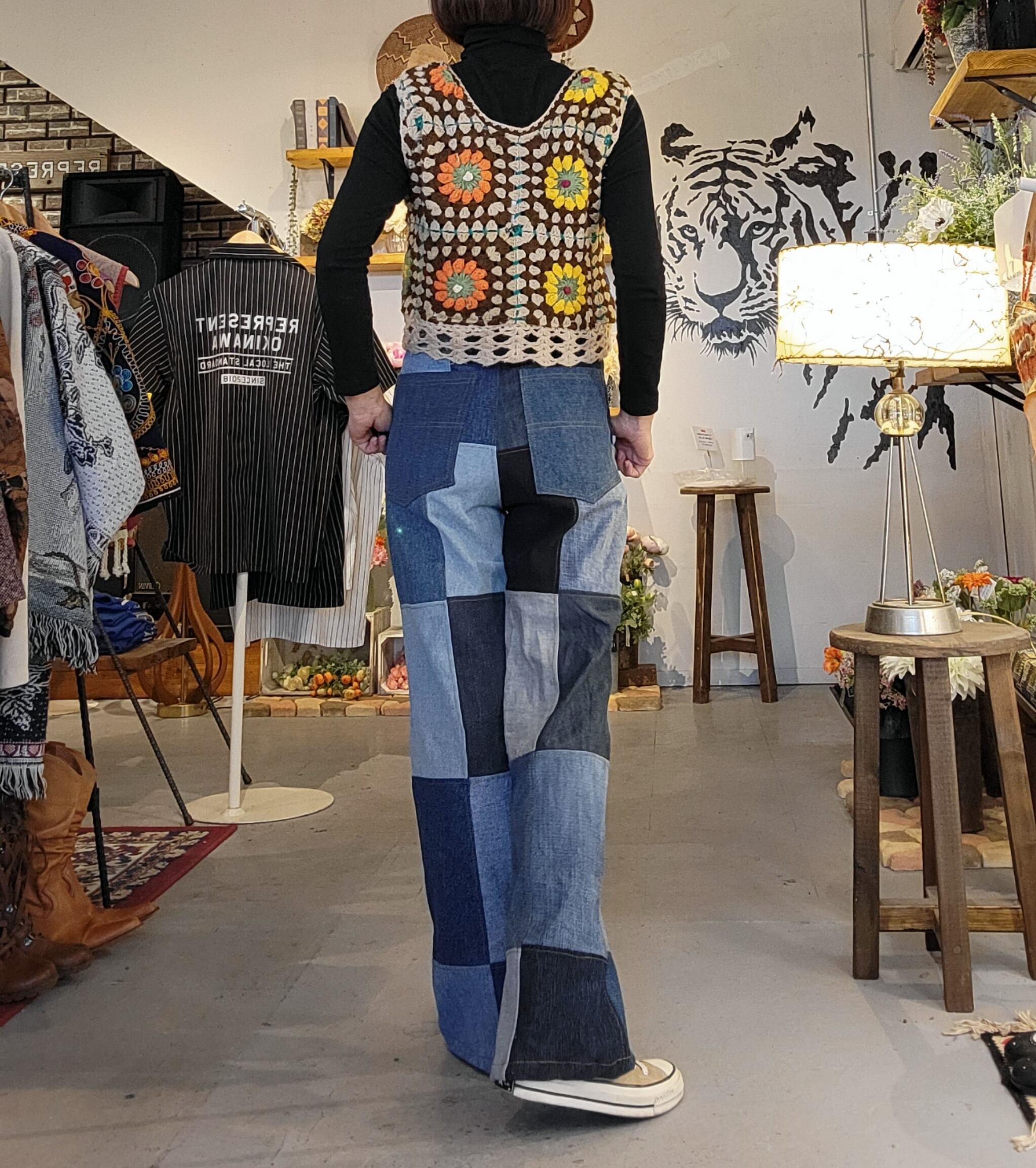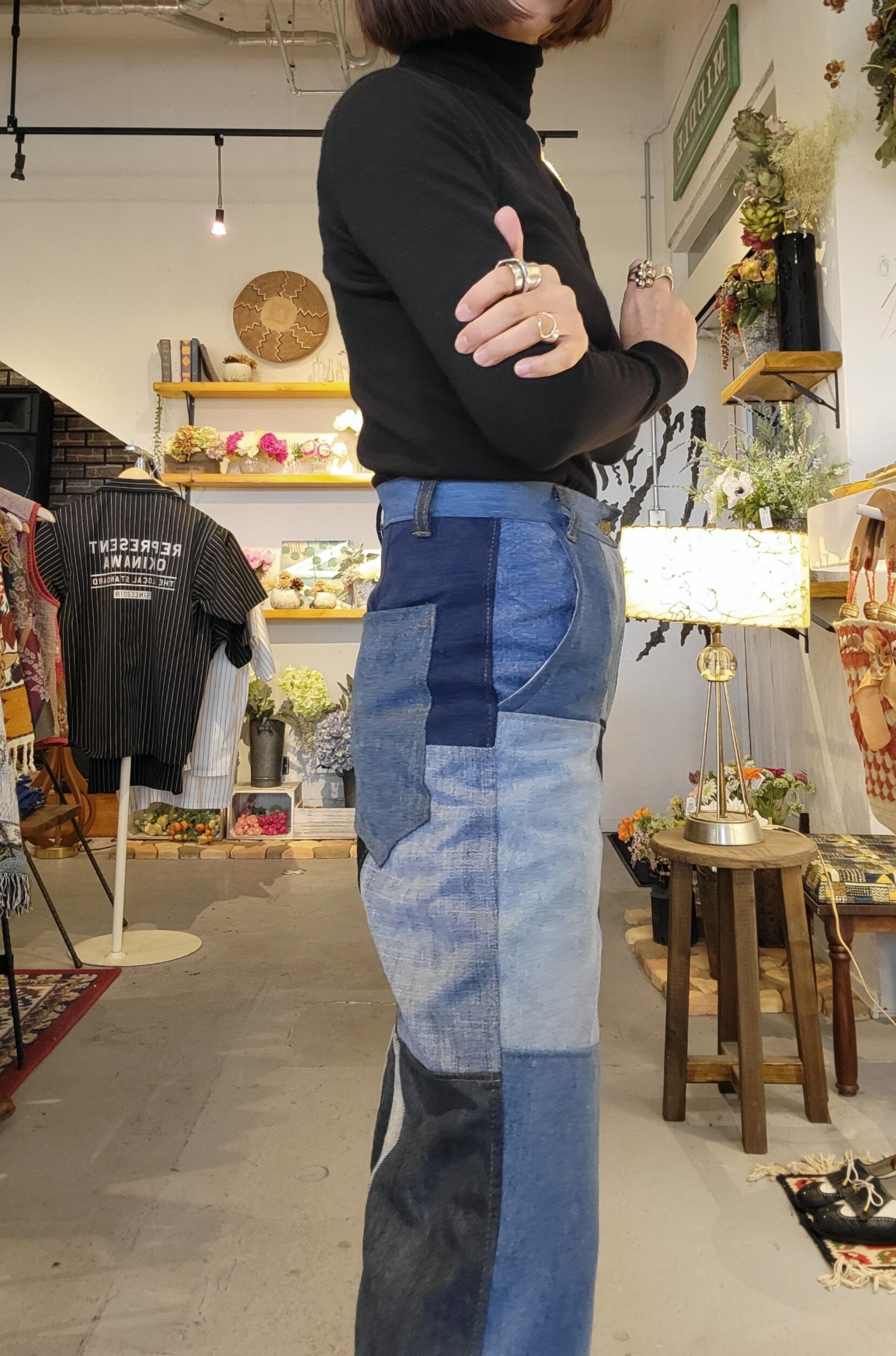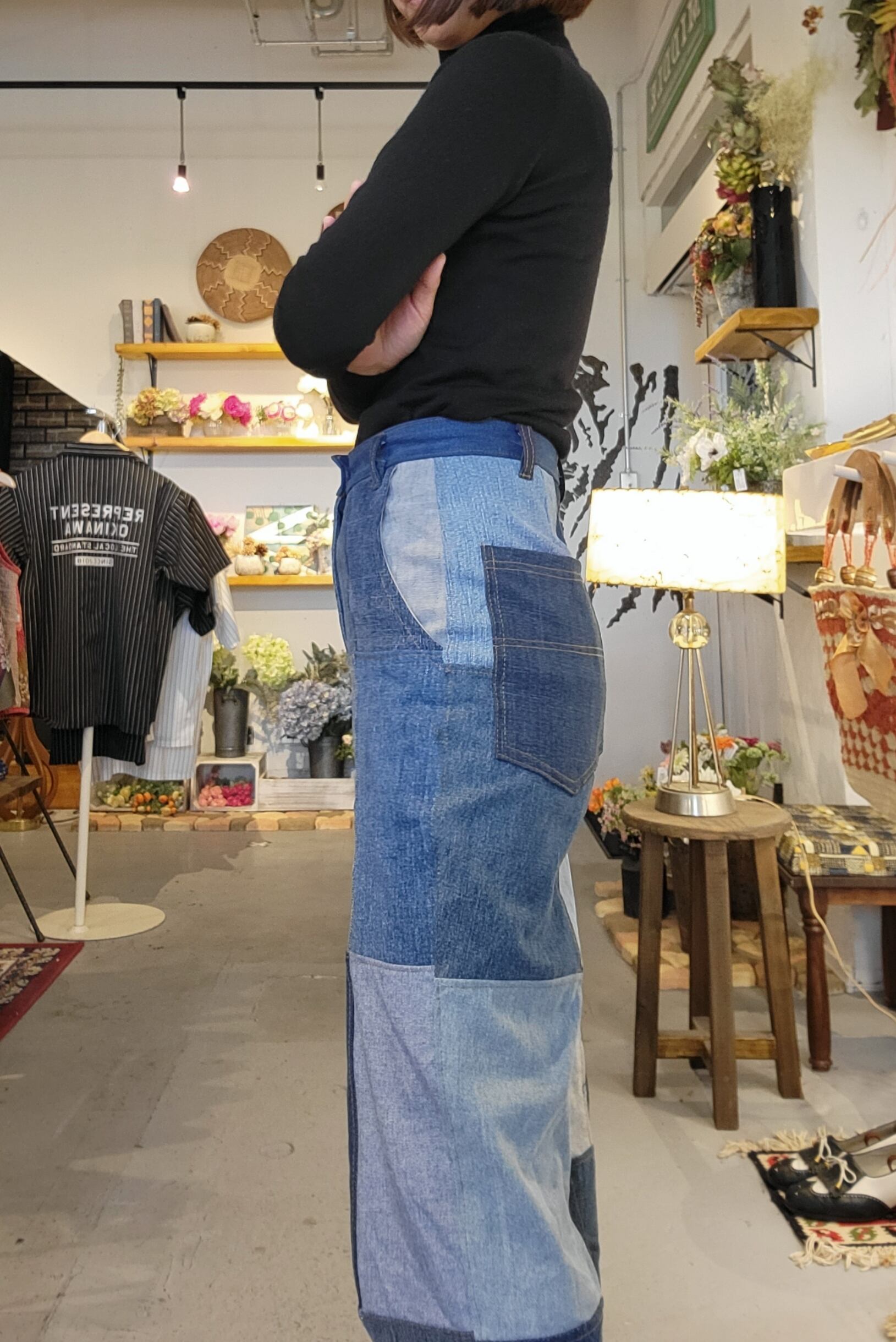 古着のデニムの布片をパッチワークで縫い合わせて製作したリメイクパンツです。太過ぎずほどよいわたりと裾幅のストレートシルエット。ハイウエストの安定感が履き心地の良さのポイントです。*着用画像は参考用です。実際のお品は商品画像になり、1本ずつ濃淡の配置や使用している生地の異なる一点ものです。