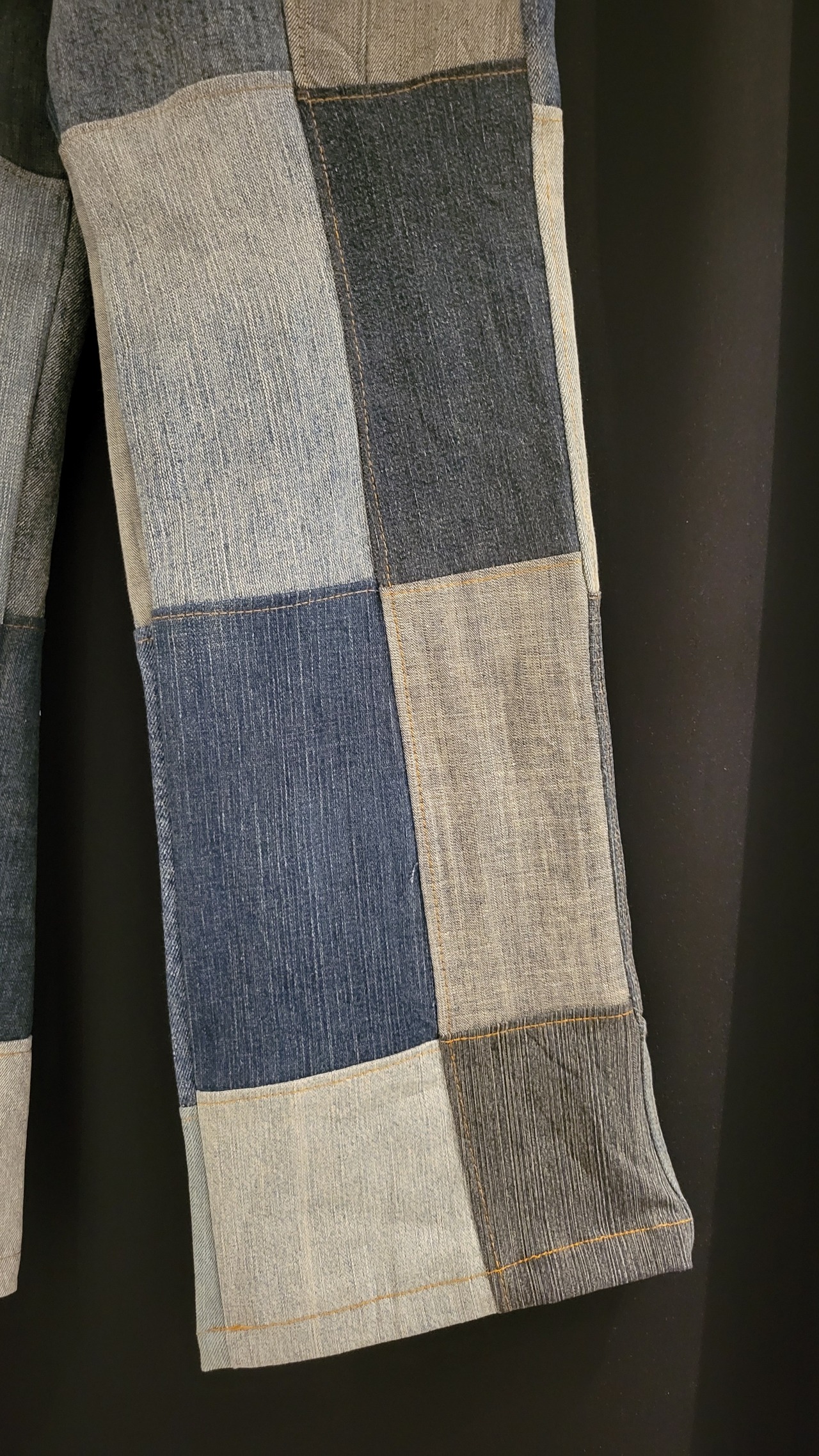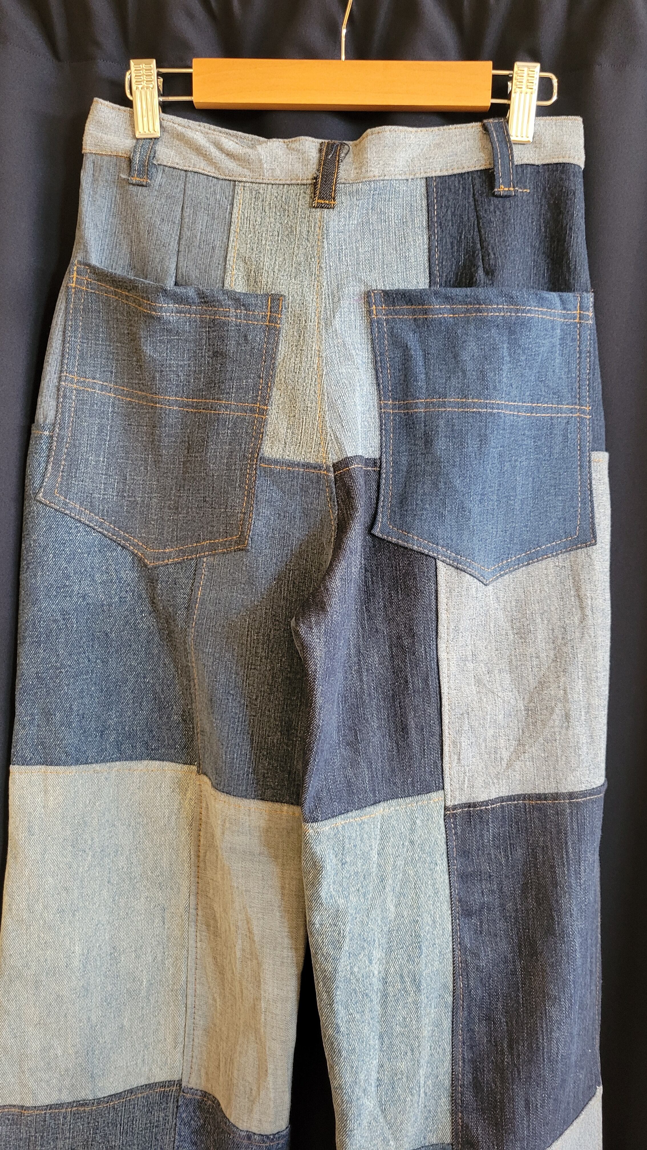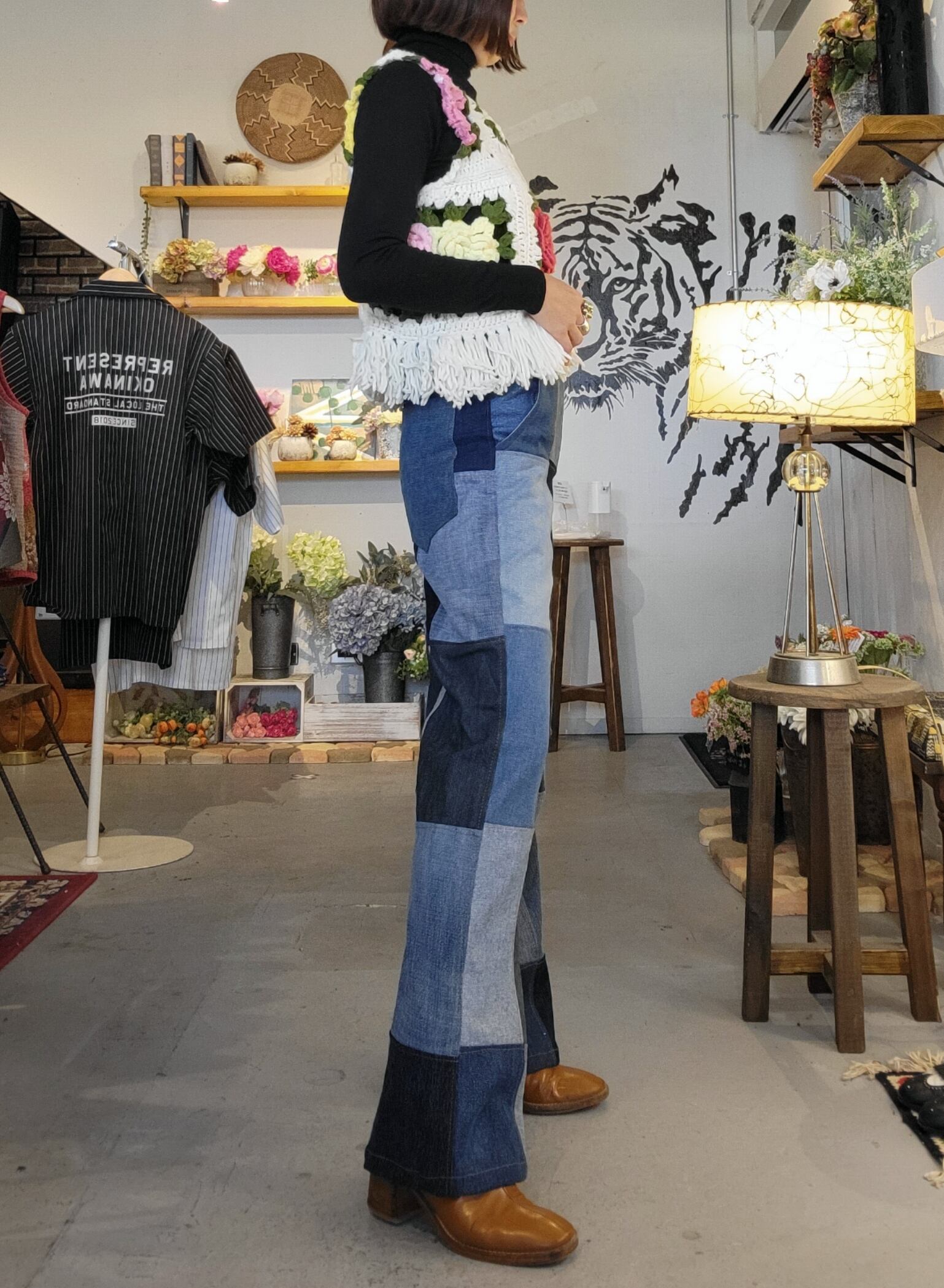 古着のデニムの布片をパッチワークで縫い合わせて製作したリメイクパンツです。太過ぎずほどよいわたりと裾幅のストレートシルエット。ハイウエストの安定感が履き心地の良さのポイントです。*着用画像は参考用です。実際のお品は商品画像になり、1本ずつ濃淡の配置や使用している生地の異なる一点ものです。