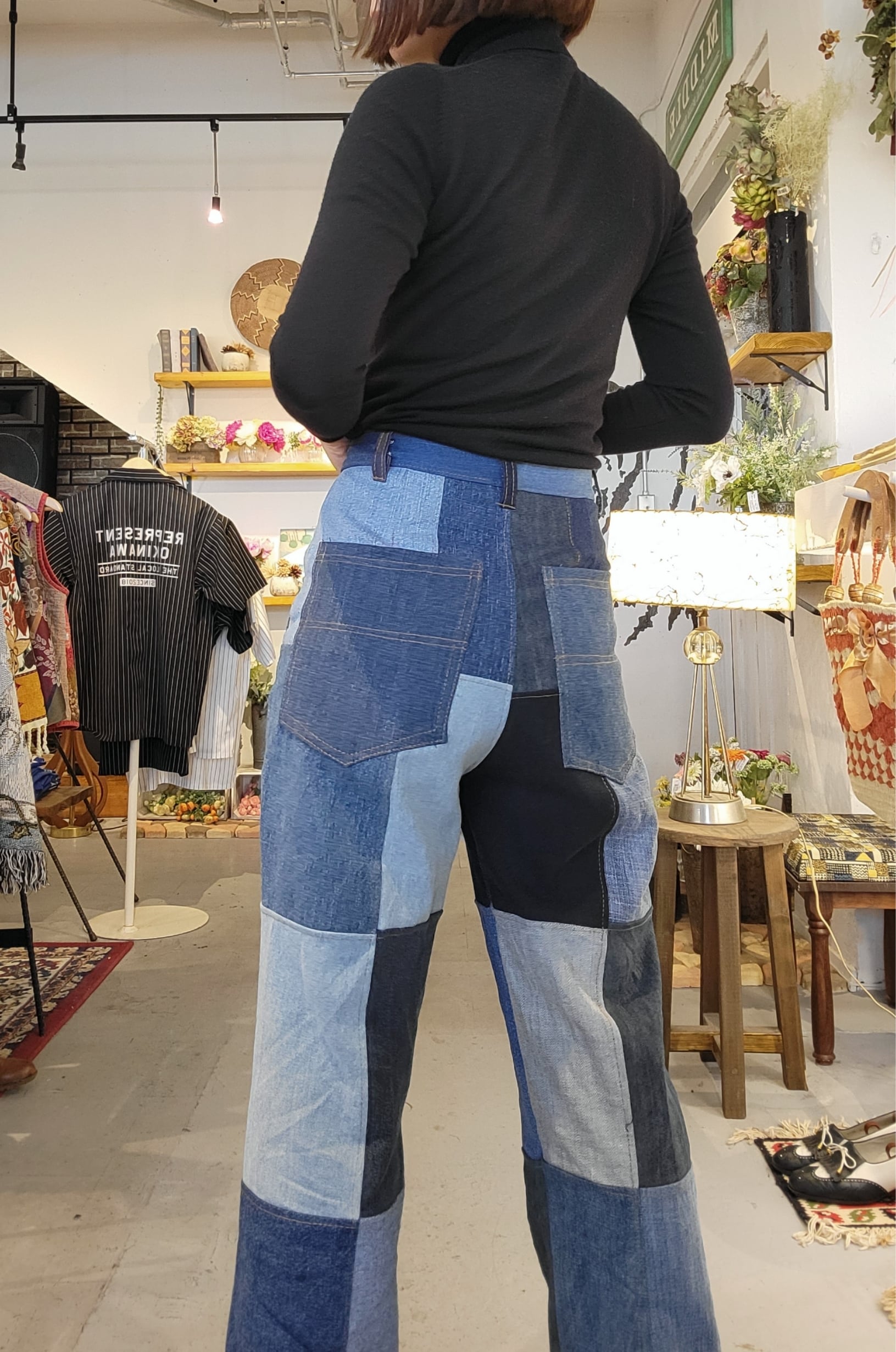 古着のデニムの布片をパッチワークで縫い合わせて製作したリメイクパンツです。太過ぎずほどよいわたりと裾幅のストレートシルエット。ハイウエストの安定感が履き心地の良さのポイントです。*着用画像は参考用です。実際のお品は商品画像になり、1本ずつ濃淡の配置や使用している生地の異なる一点ものです。