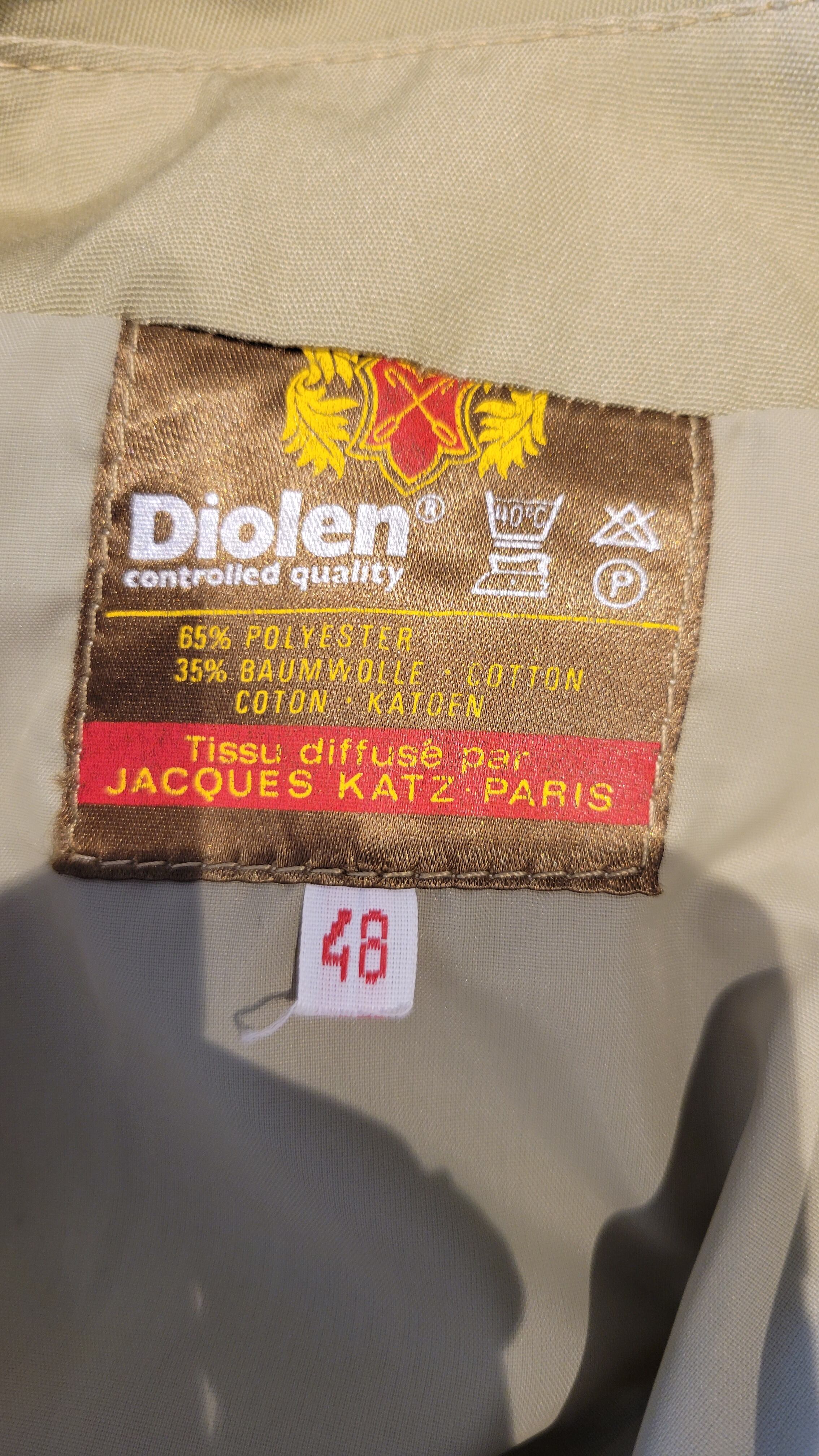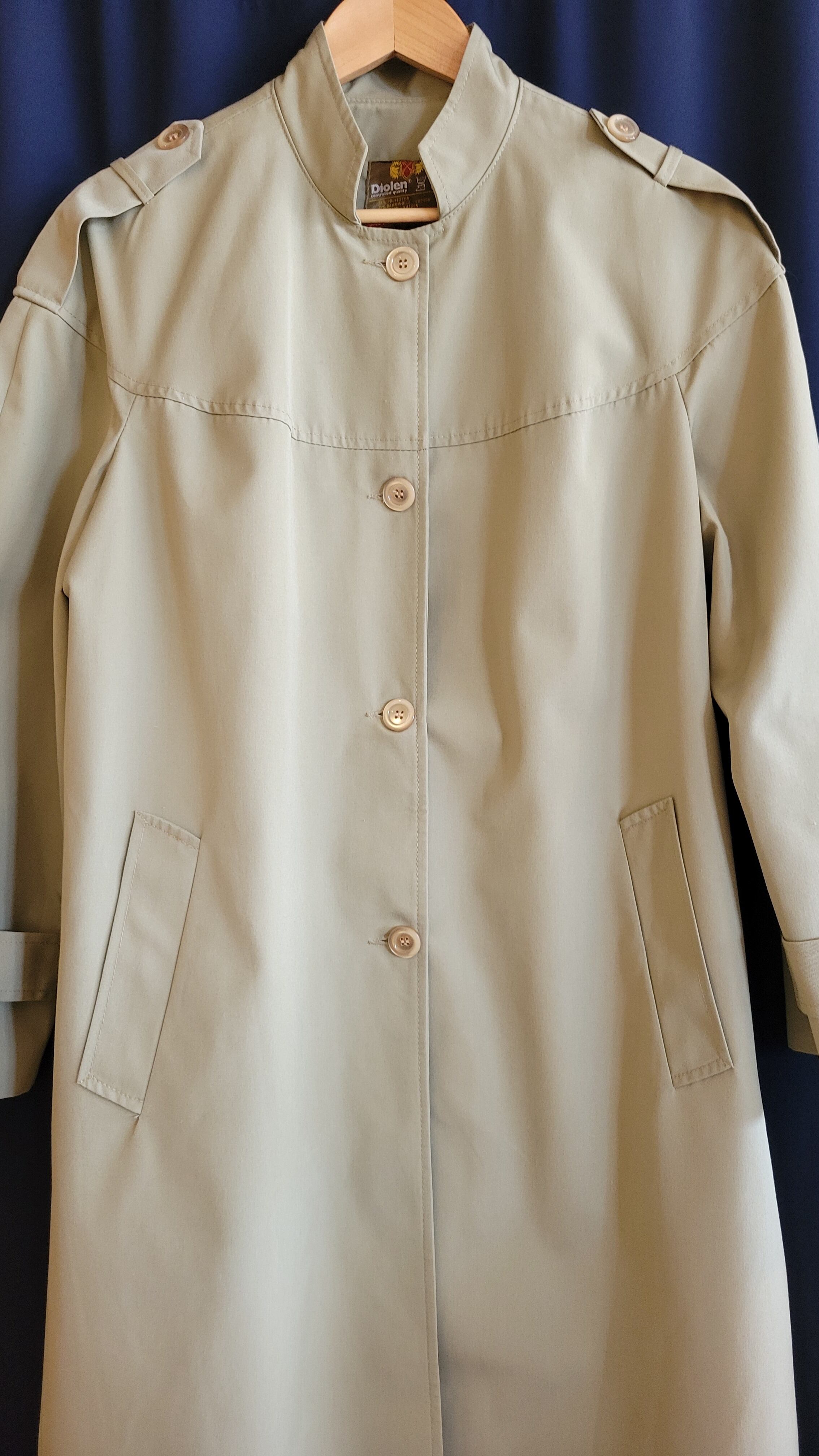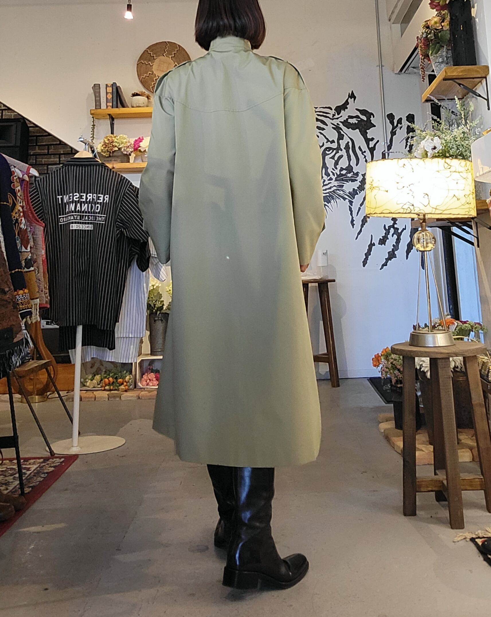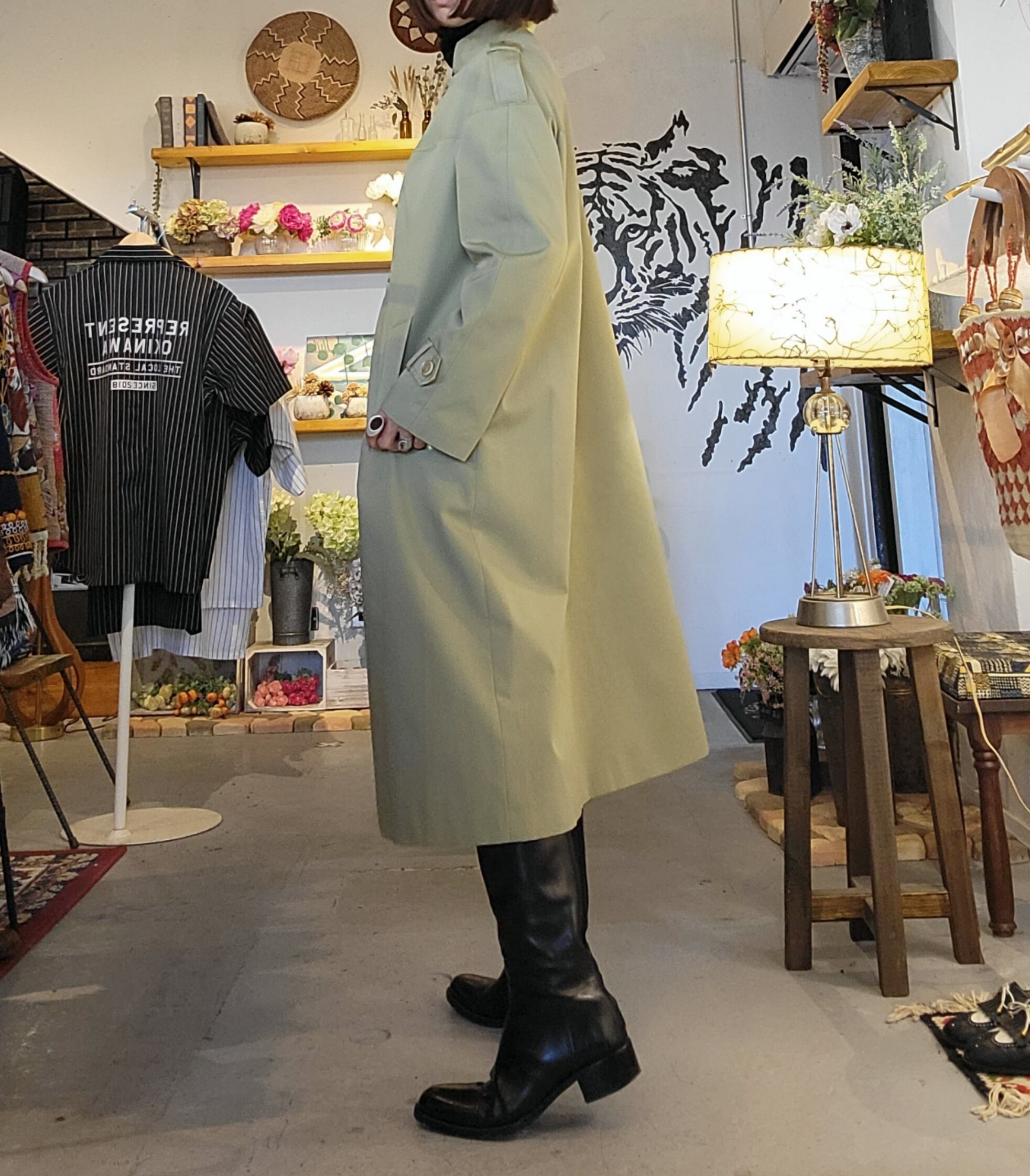 ヴィンテージのスタンドカラーコート。素材はポリエステル65%/ コットン35%、やや張り感のある素材感です。裏地付きでスムーズな着脱が可能。ウィメンズ仕様ですがサイズが合えば男女問わず着用できるシンプルなデザインとカラー。厚手のニットの上にも羽織れるサイズ感です。