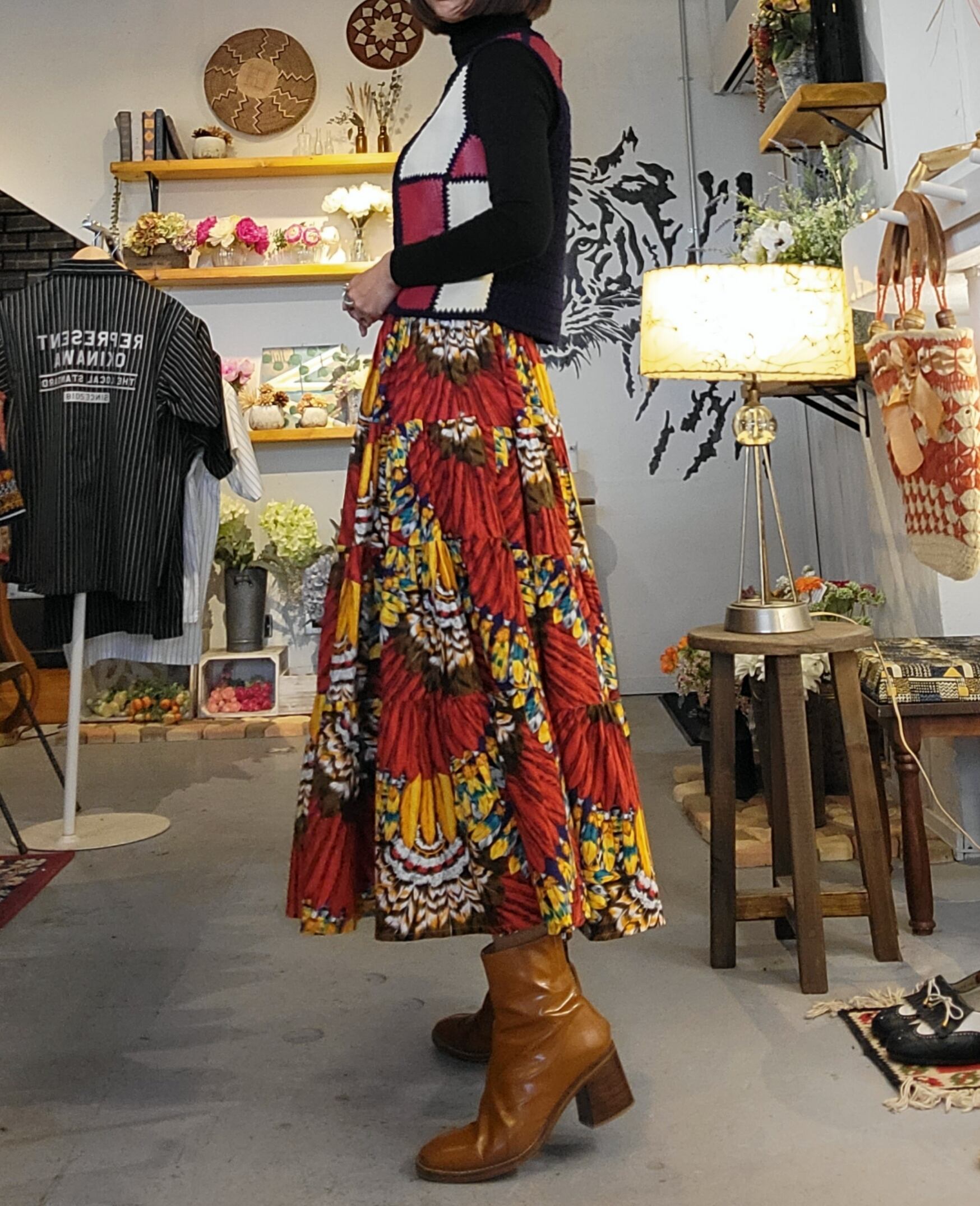 ヴィンテージのサーキュラースカート。素材はコットンです。ネイティブインディアン風のダイナミックなプリント。生地を贅沢に使用したボリューミーなギャザー&ティアードデザイン。存在感のあるスカートです。