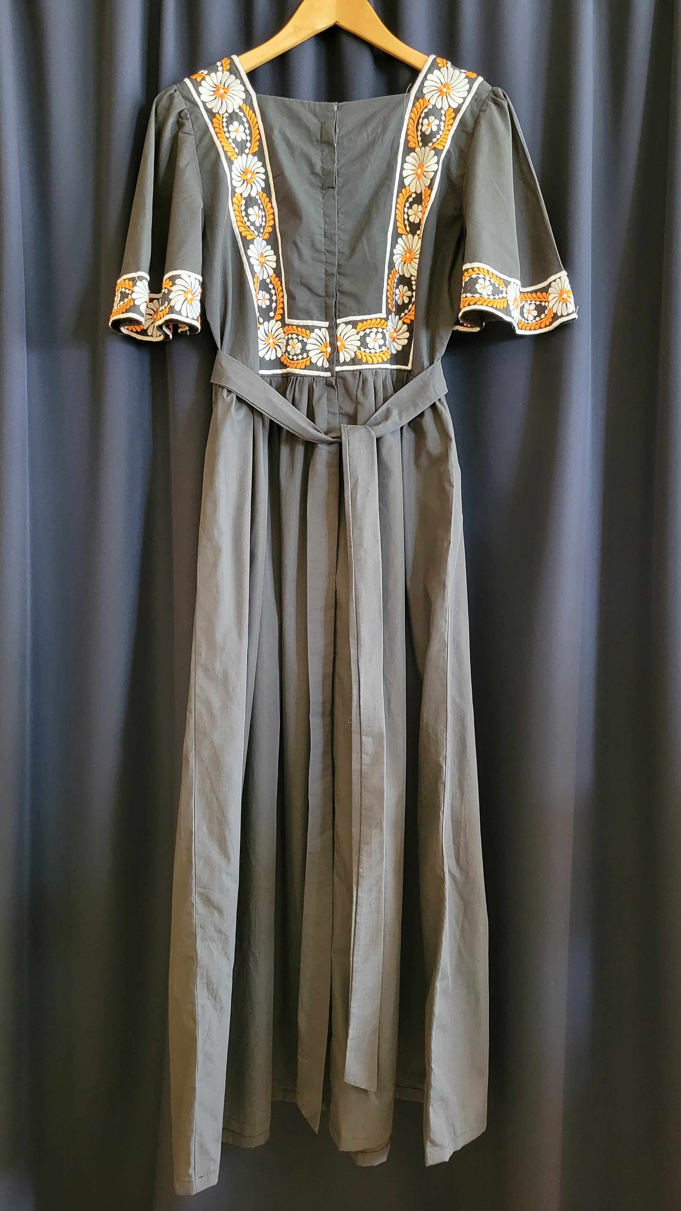 ヴィンテージのマキシドレス。素材表記はありませんがコットンとポリエステルの混紡のようでさらりとした肌触りです。伸縮性、透け感はありません。シックな色合いで着やすく、春夏は一枚で、秋冬はニットをインナーに着用して通年で着られます。バックファスナー、バックリボン付きでめりはりのあるシルエットです。